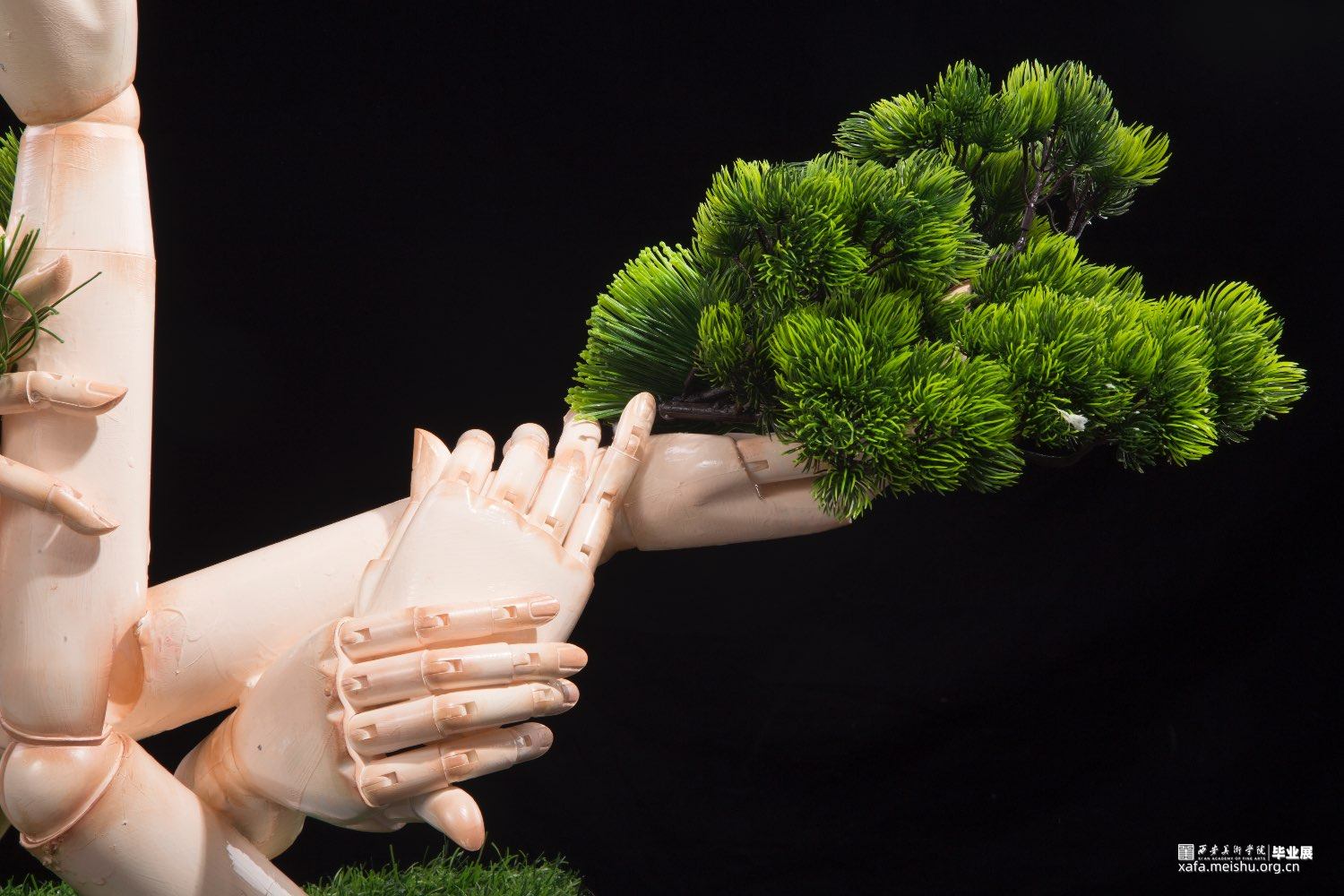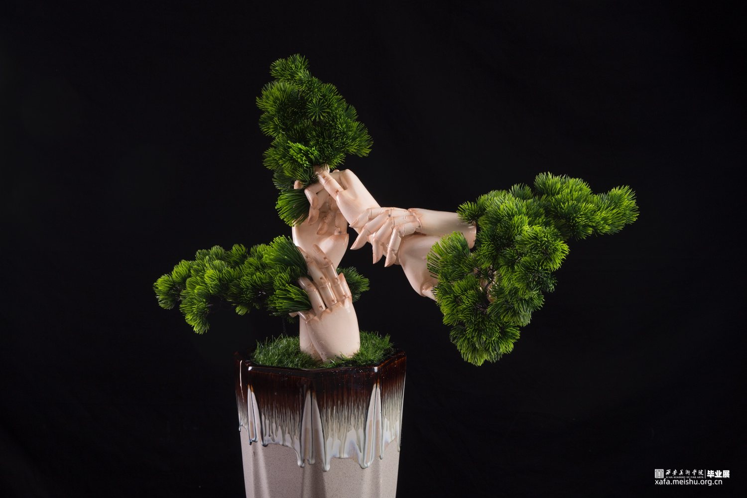 在这个作品中,我试图成为一个强烈的意见表达者,模特关节手和塑料感的松枝和雕塑感的凝固形态意在深入探讨女性自我感知和社会语境的定义双重性,借此更深一步讨论存在主义女性主义的哲学体系。