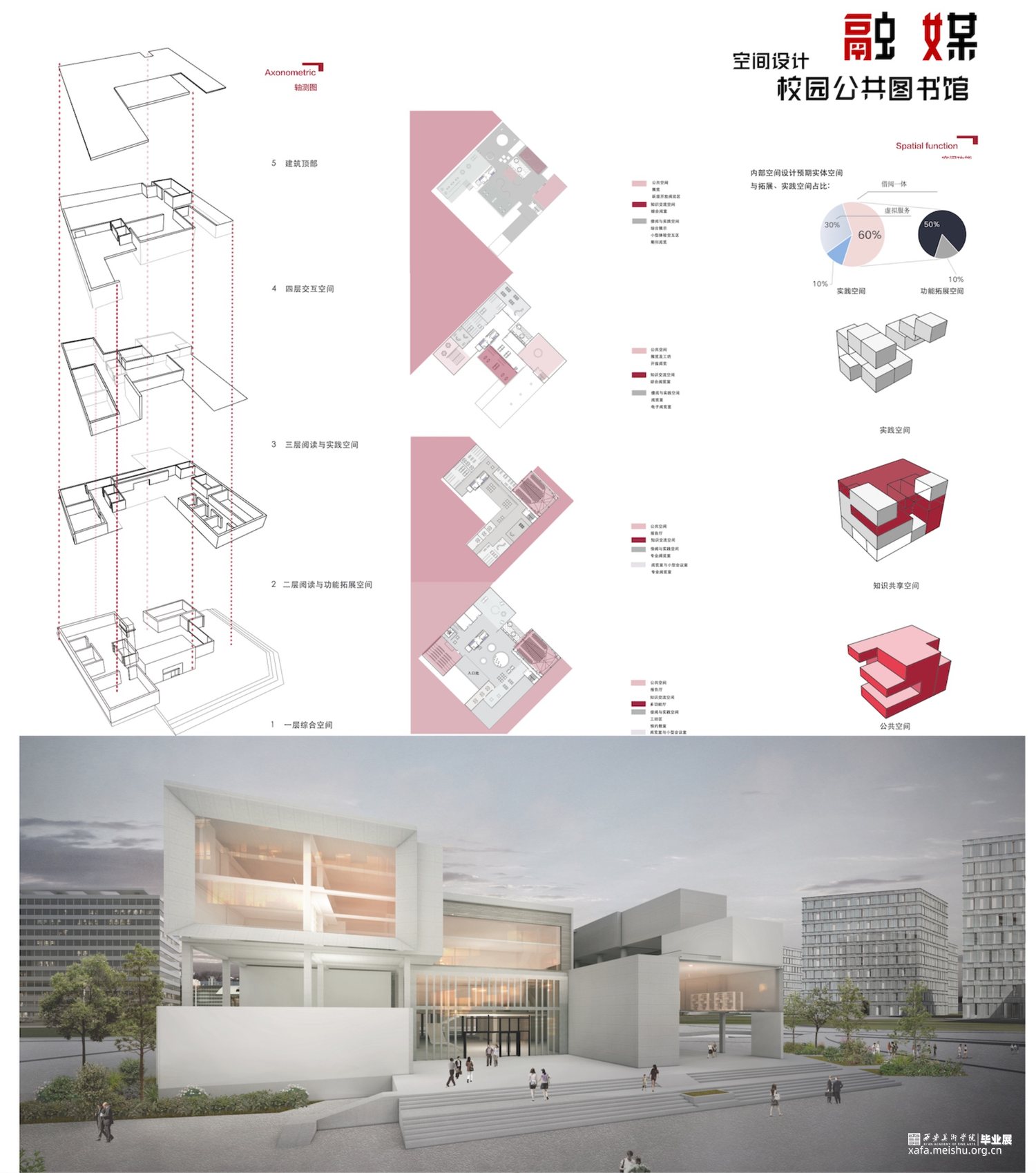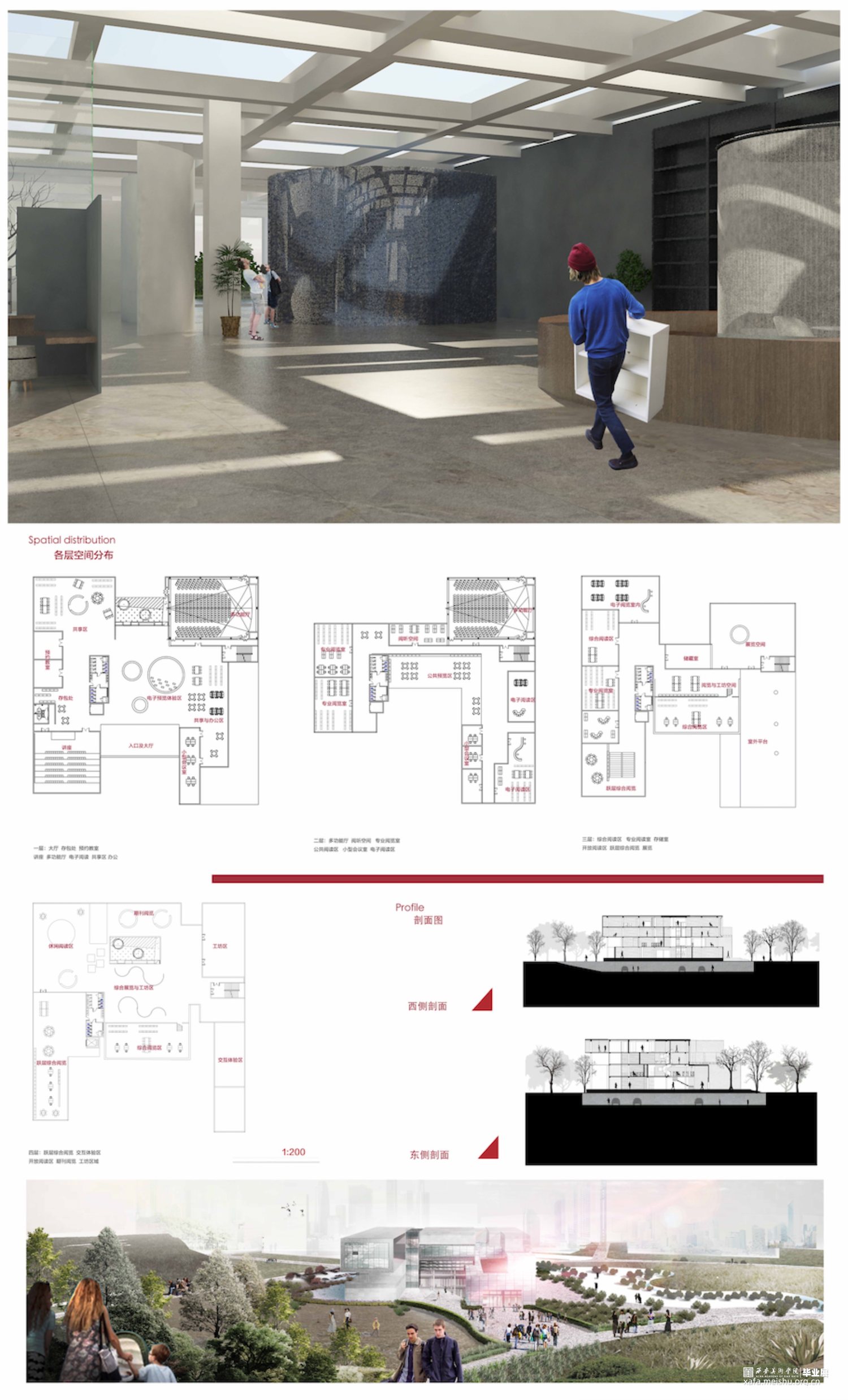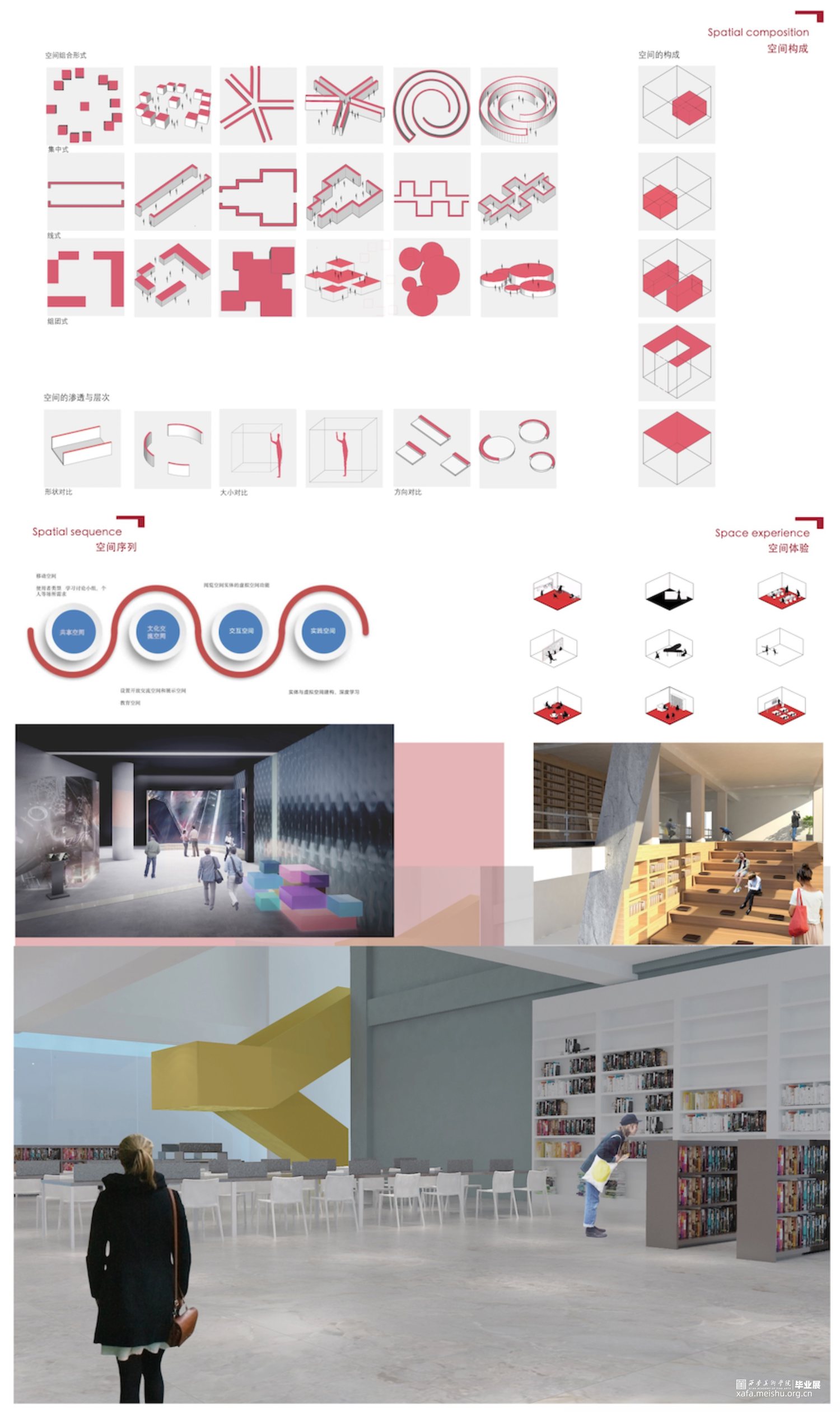 此次创作基于校园公共图书馆空间在媒介技术发展的背景下,人们接收信息和存储信息的方式更加多元。随着数字技术等新技术的出现,探索媒介介入空间中对空间设计和人的影响,和对实体空间和虚拟空间如何相互作用,并通过设计不同类型空间实现设计构想。