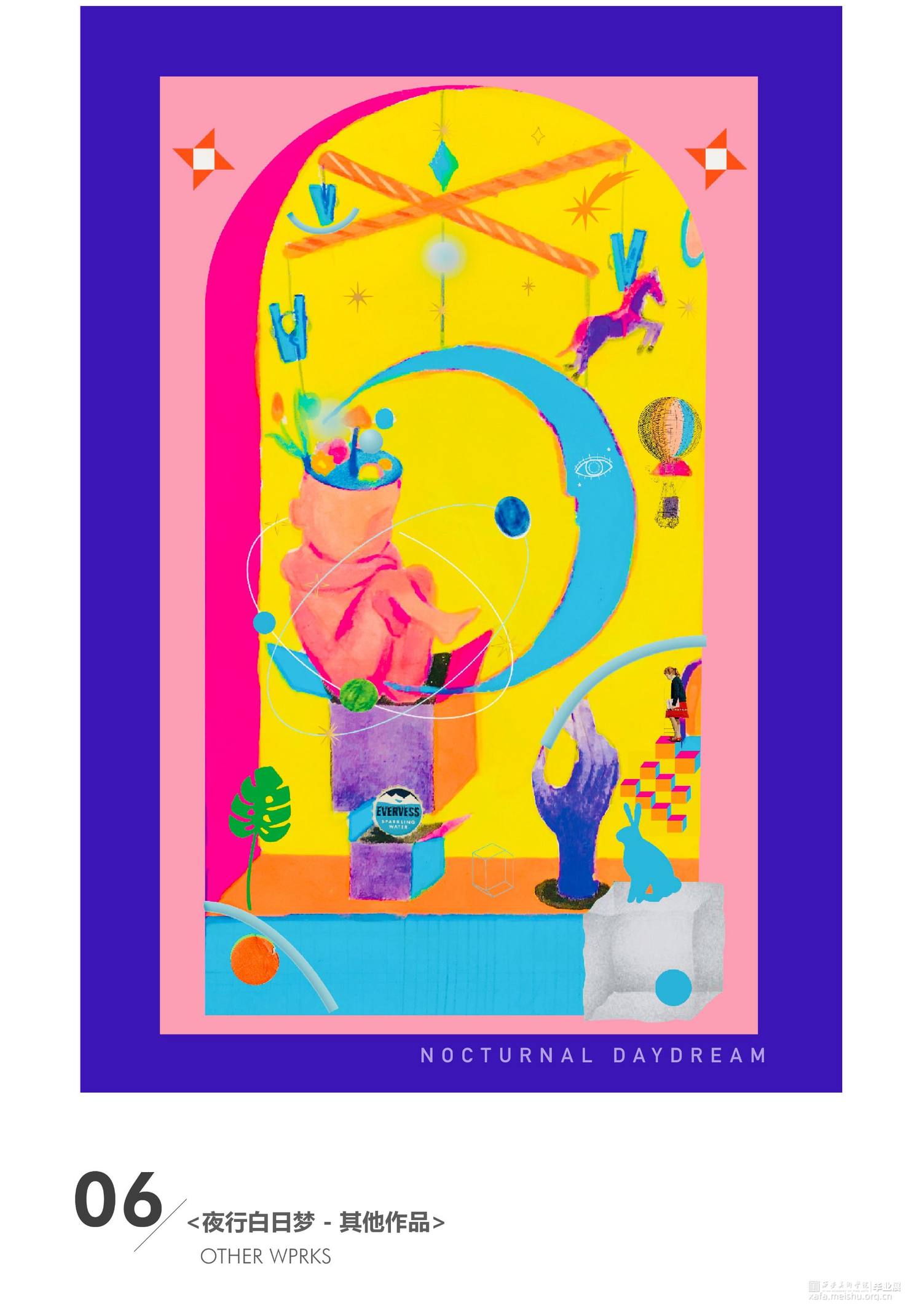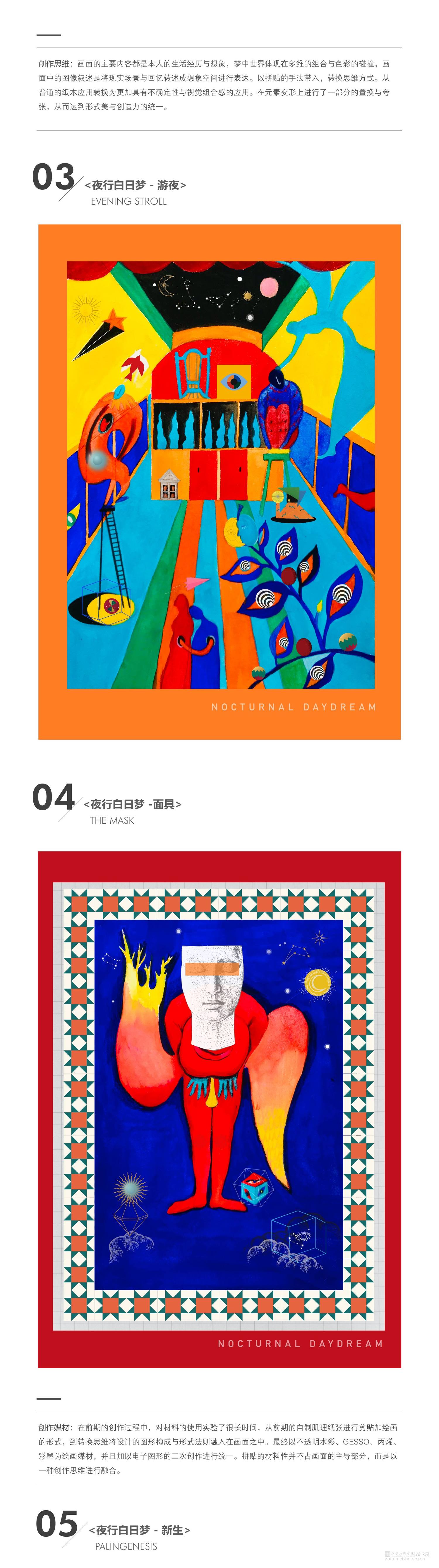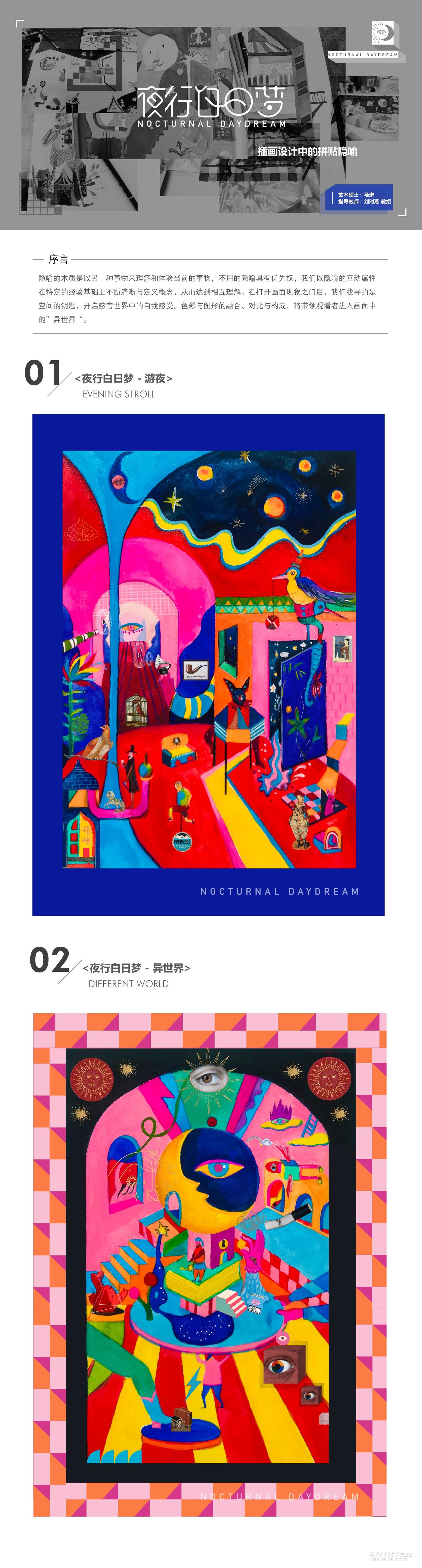 夜行白日梦其实是在“异世界”的梦境中,将幻想与幻像通过戏剧、角色扮演、舞台、寓言来进行内在空间的隐喻性表现。画面中大量出现的拼贴元素是被运用为一种思维方式进行链接。隐喻的领域是庞大且深刻的,希望可以通过自己的画面将观看者带入到这个“异世界”,我所构建的“世界”不能代表其他人,只是根据自己的感受找寻不同事物之间的相似性,将自己的认知重新链接与组合,呈现出图形图像的隐喻代码,如同一个能够穿透意识的搜索器,带领观看者触及潜意识的内心获得感触,我们每个人都会有从新生到重塑自我的过程,所饱含对这个世界的希望与救赎自我都是值得我们去思考的,想象的世界就是我们内心的乌托邦。