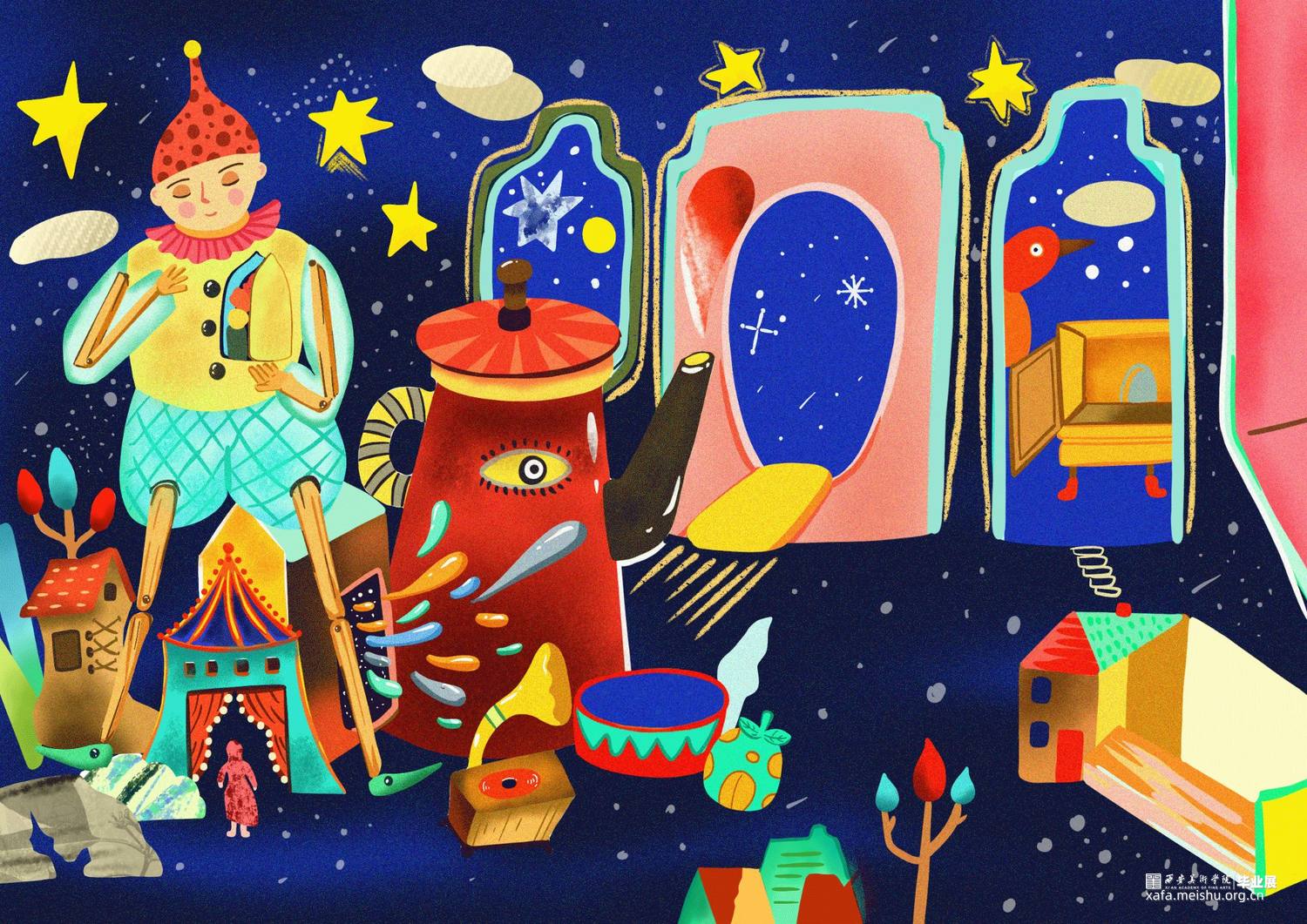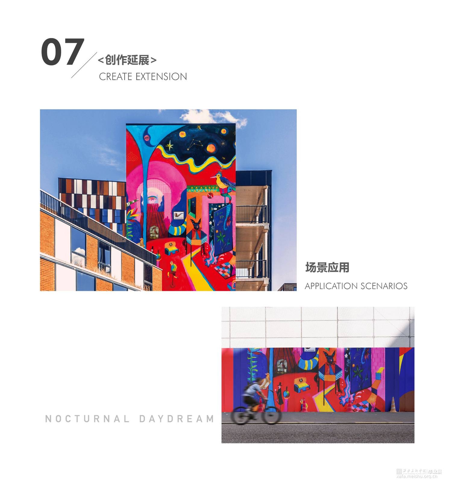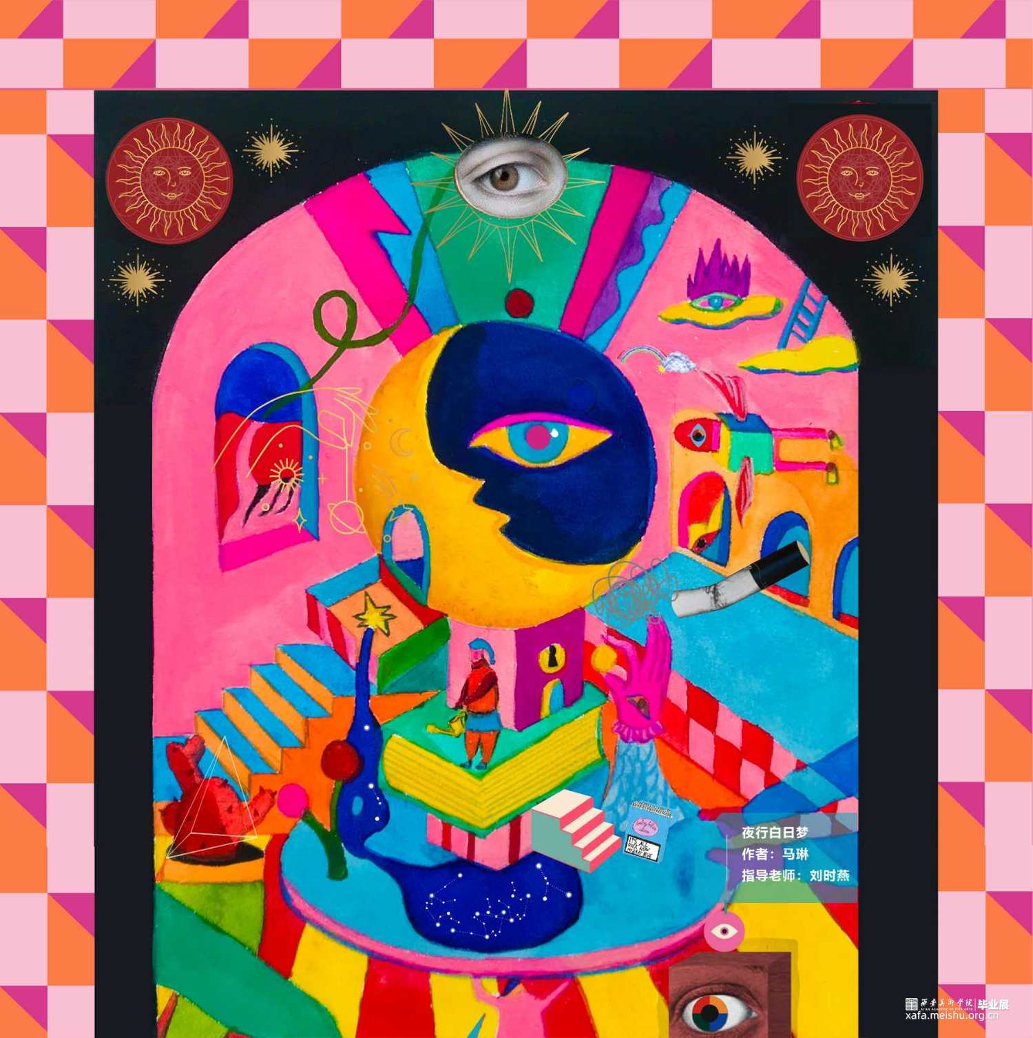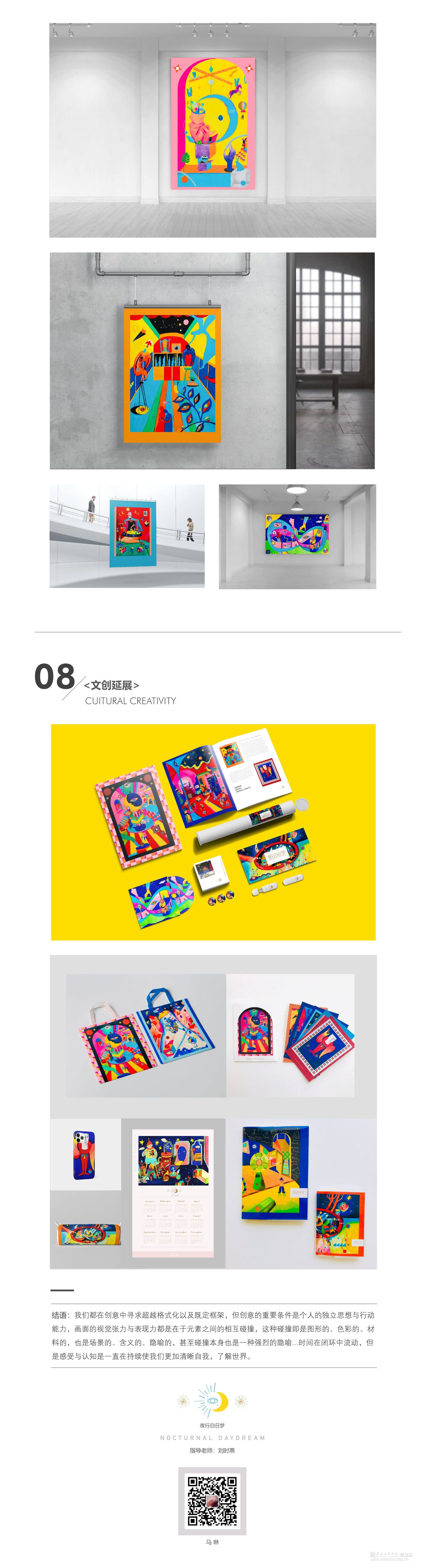 夜行白日梦其实是在“异世界”的梦境中,将幻想与幻像通过戏剧、角色扮演、舞台、寓言来进行内在空间的隐喻性表现。画面中大量出现的拼贴元素是被运用为一种思维方式进行链接。隐喻的领域是庞大且深刻的,希望可以通过自己的画面将观看者带入到这个“异世界”,我所构建的“世界”不能代表其他人,只是根据自己的感受找寻不同事物之间的相似性,将自己的认知重新链接与组合,呈现出图形图像的隐喻代码,如同一个能够穿透意识的搜索器,带领观看者触及潜意识的内心获得感触,我们每个人都会有从新生到重塑自我的过程,所饱含对这个世界的希望与救赎自我都是值得我们去思考的,想象的世界就是我们内心的乌托邦。