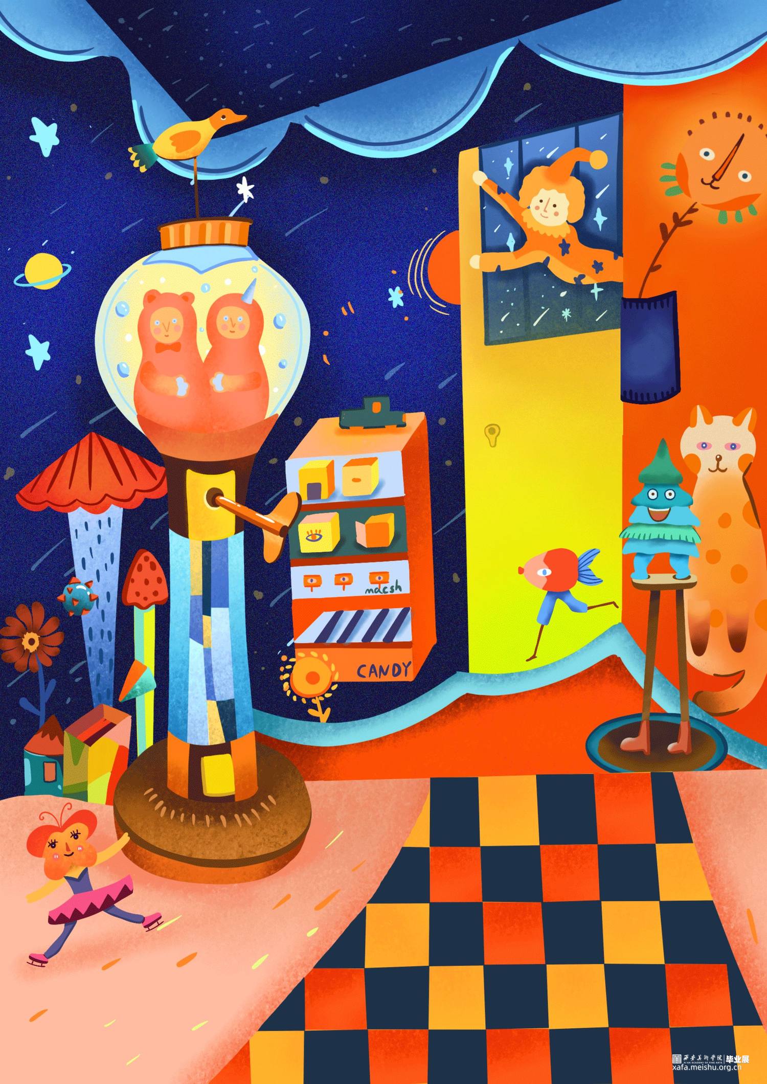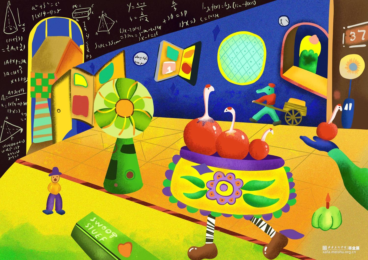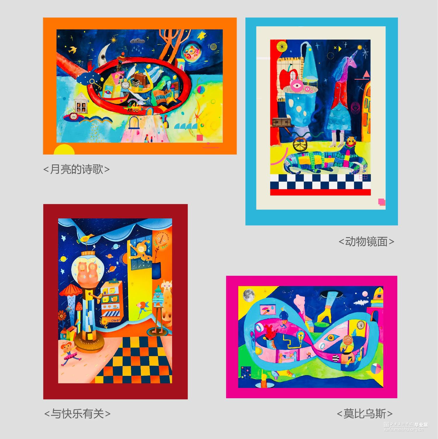 寻求在画面中进入到另一个世界,将自己的成长经历与思维感受通过视觉化隐喻呈现来寻找表达的窗口,画面中的“异世界”的构成是对于“自己”的认知与梦的重构。人们发现自己已经从美学进入了隐喻的沉思。那些似乎最远离日常现实的东西却反而真实,趣味冲突的图像、物象、符号等并置组合在一起。试图引发观看者的联想,从而表现真实的情感。