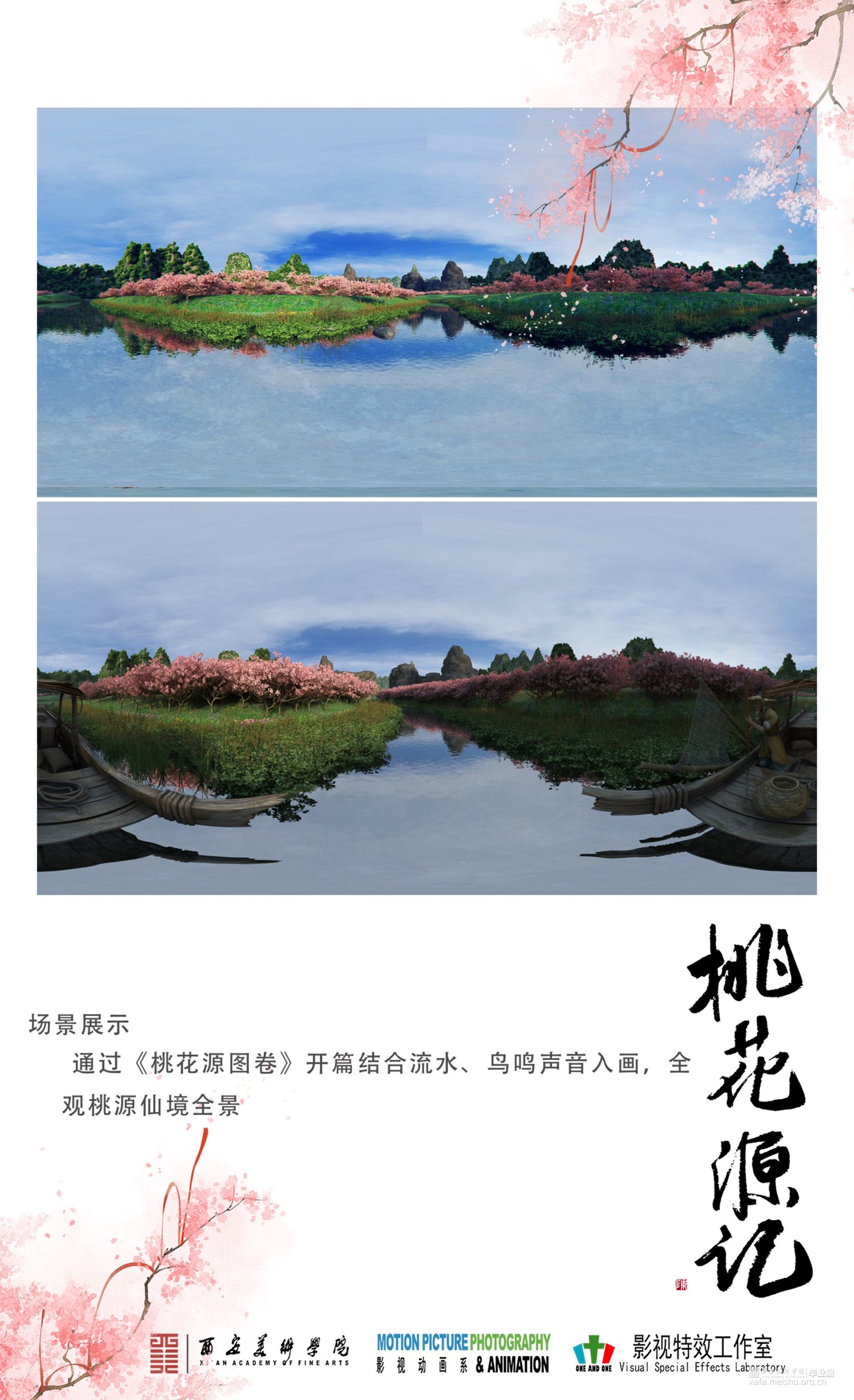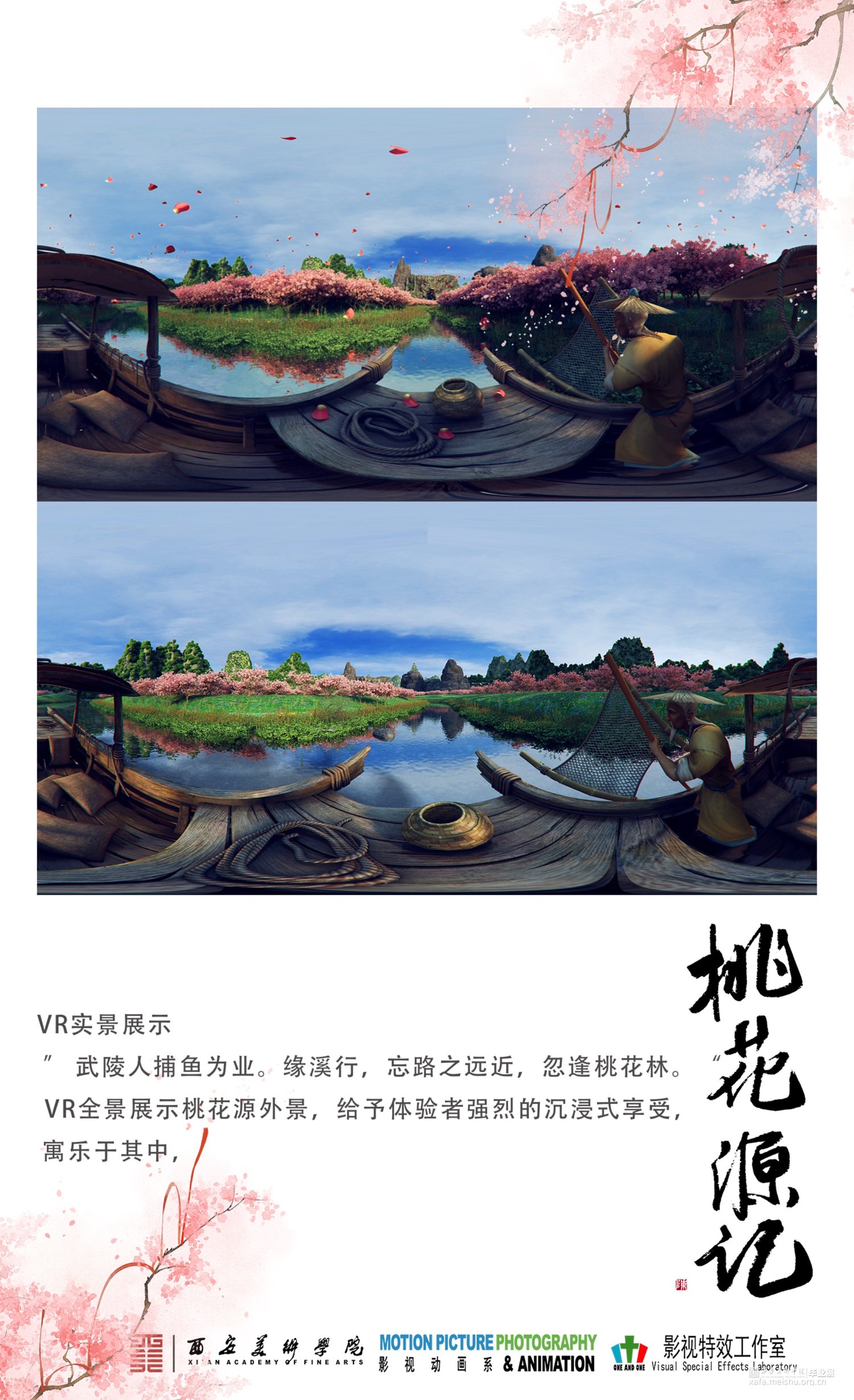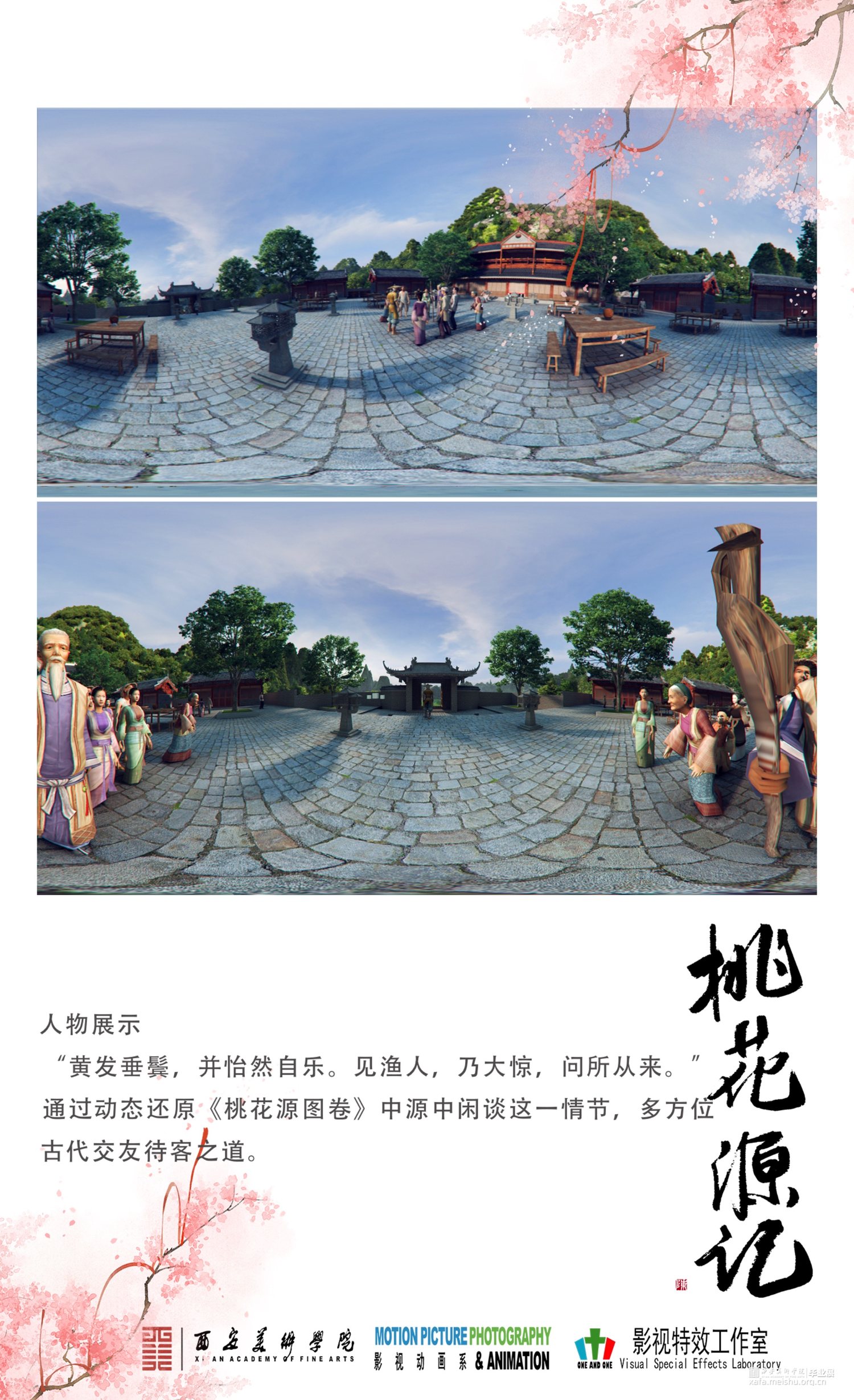 全景,发现桃花源。并利用3D技术建模,搭建桃花源画面场景。然后跟随