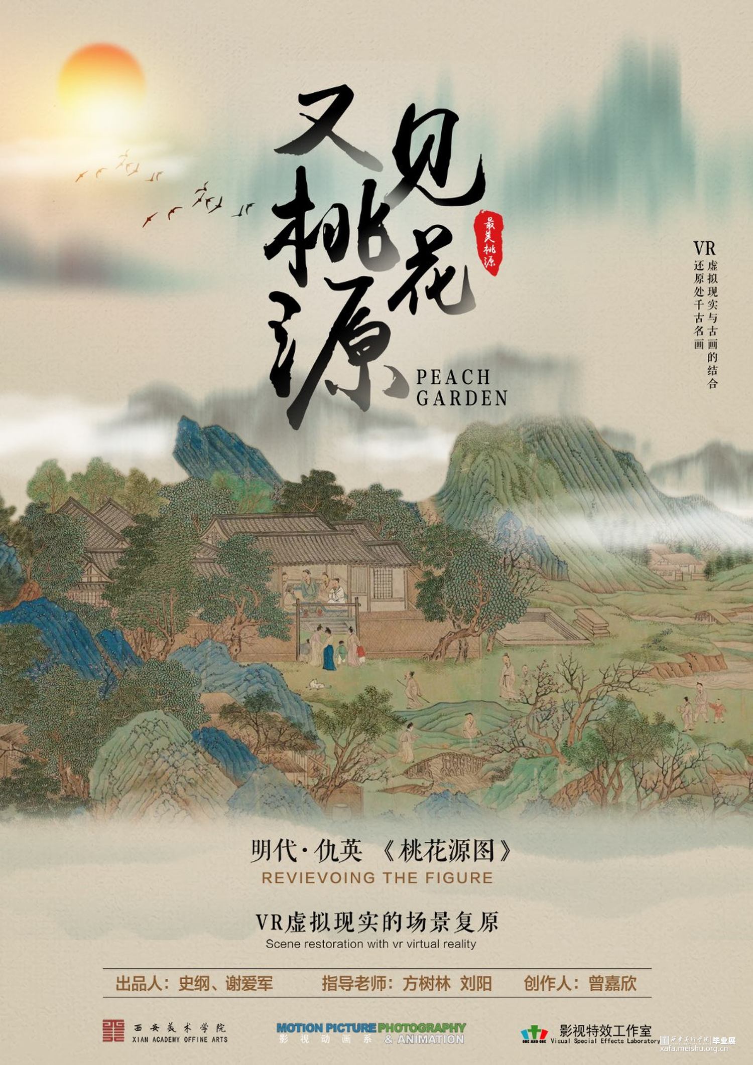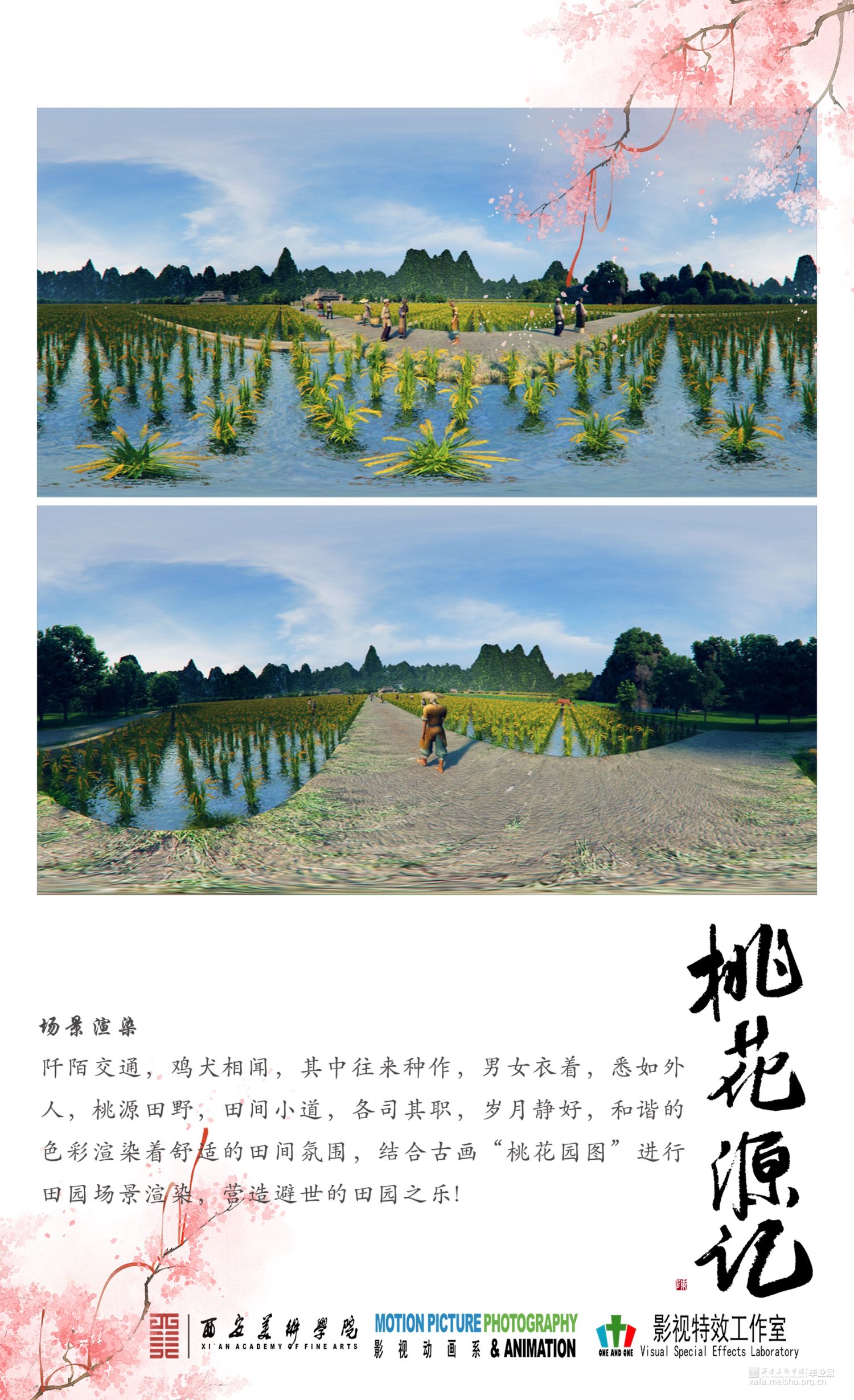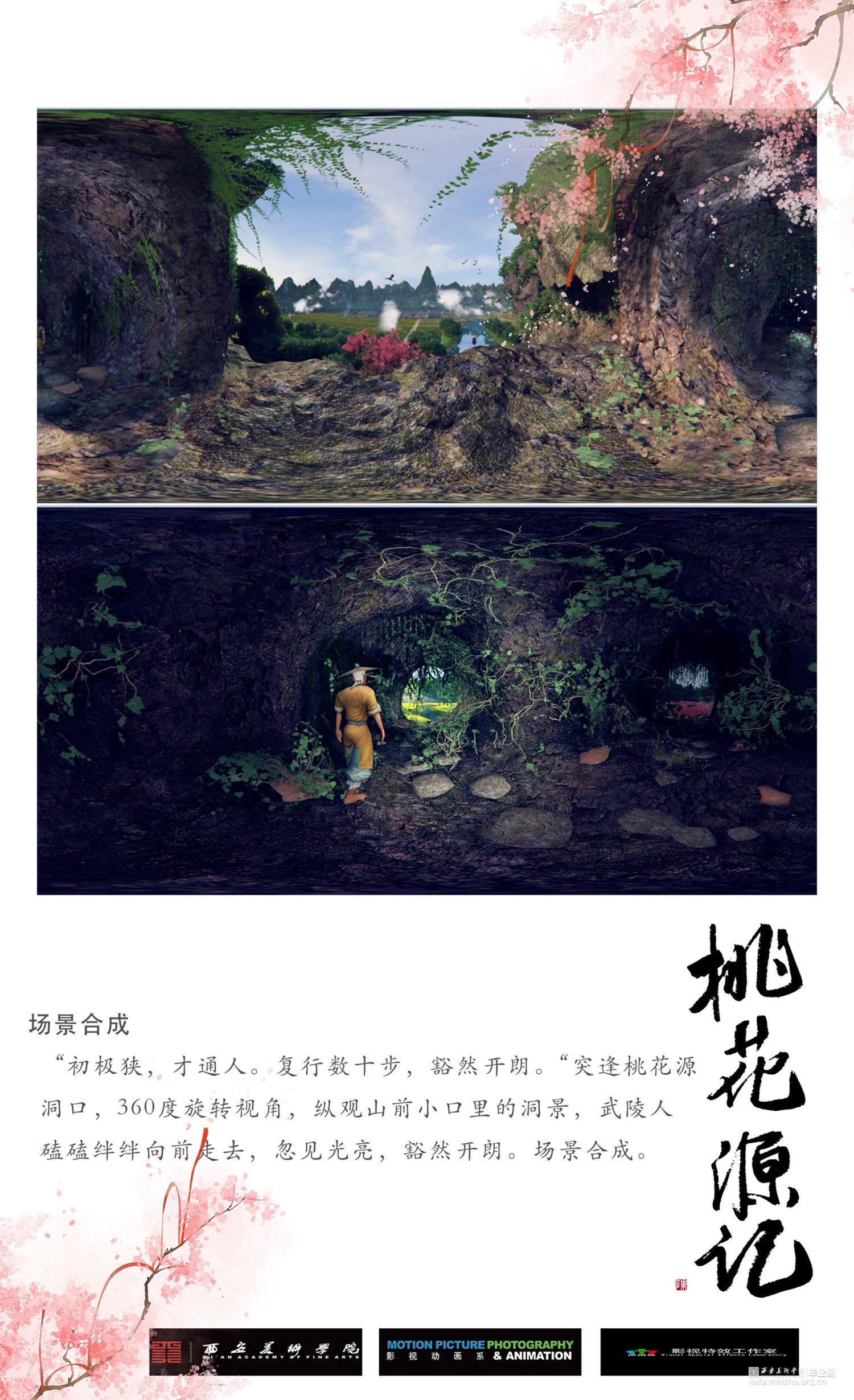 全景,发现桃花源。并利用3D技术建模,搭建桃花源画面场景。然后跟随