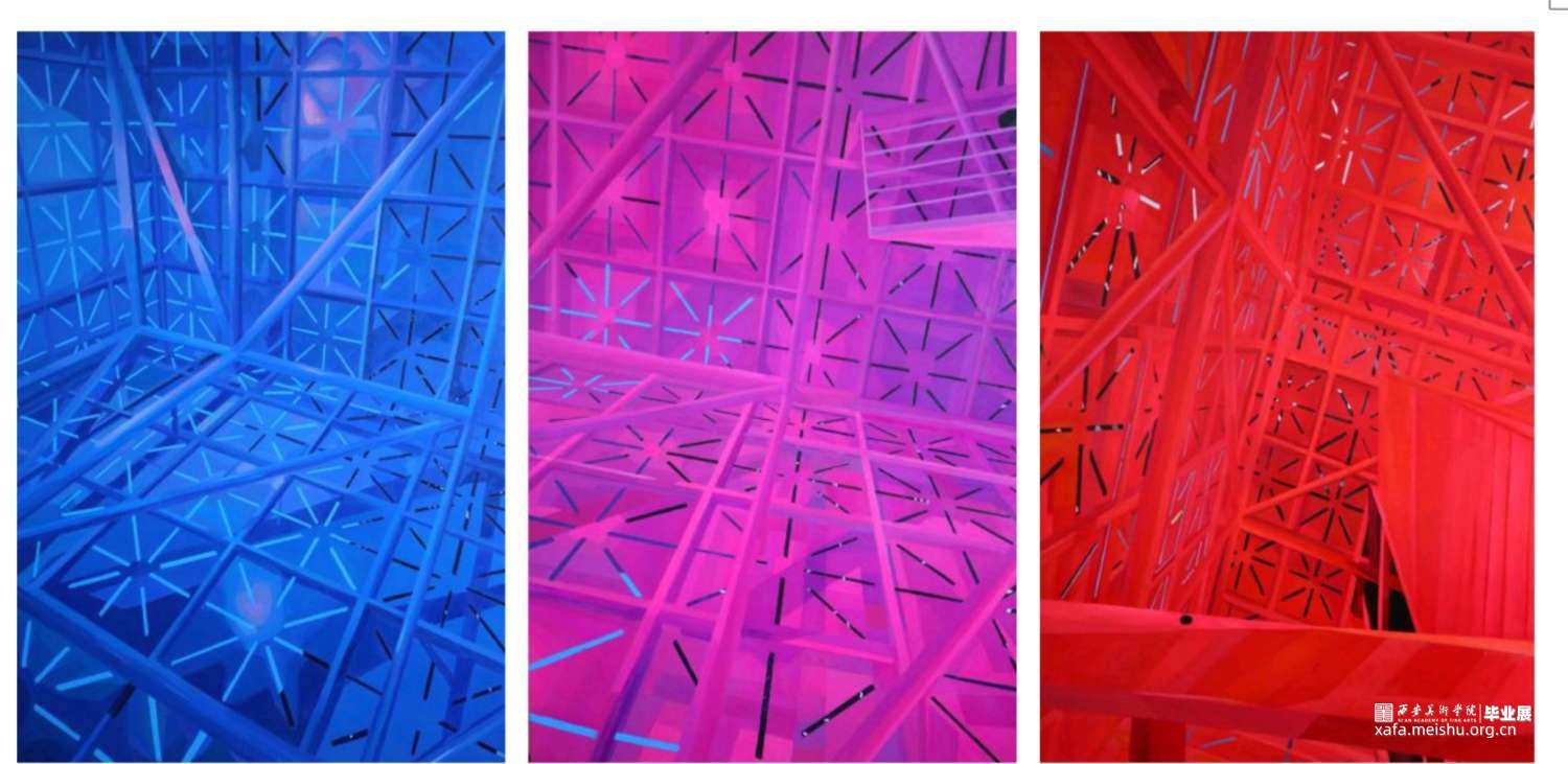 这幅作品以蓝色、紫色、红色三幅画基调,让画面表面显示出一种色彩的碰撞,实质则表现强烈的视觉冲击下的色彩关系,凸显出同类色之间的高级感。不仅表现出蓝色、红色、紫色之间的色彩碰撞,通过颜色的对比,大胆夸张的色彩,以强烈的姿态突出画面的调性,不仅传递出个性的设计,还有强烈的色彩冲击。整体画面全部呈现出颜色强对比的独特视觉效果。三幅作品相互搭配,交叉的空间感和纵深感为画面增加了空间感。横竖交错,·传递一种无所畏惧的态度,并且利用颜色之间的色块处理和透视的变化,画面呈现了一个独特的形式,从远处看是抽象写实,从近处看是色块的变形,将写实的画面变为抽象立体风格,体现了全新的视觉体验。在当代都市环境下,建筑物的繁华用颜色来表达,充斥出整个画面,以饱满的色彩,搭配大小不一的色块丰富了画面的形式。搭配画面的亮点元素,丰富画面的整体元素,展示了一个建筑物的繁华和强烈的色彩冲击表达城市的喧嚣和城市的一种嘈杂和灯火明亮的城市。