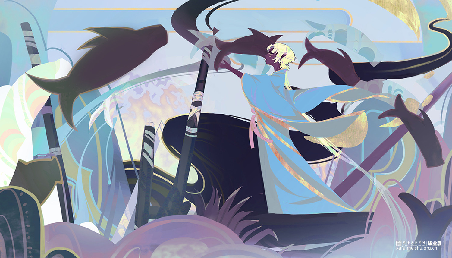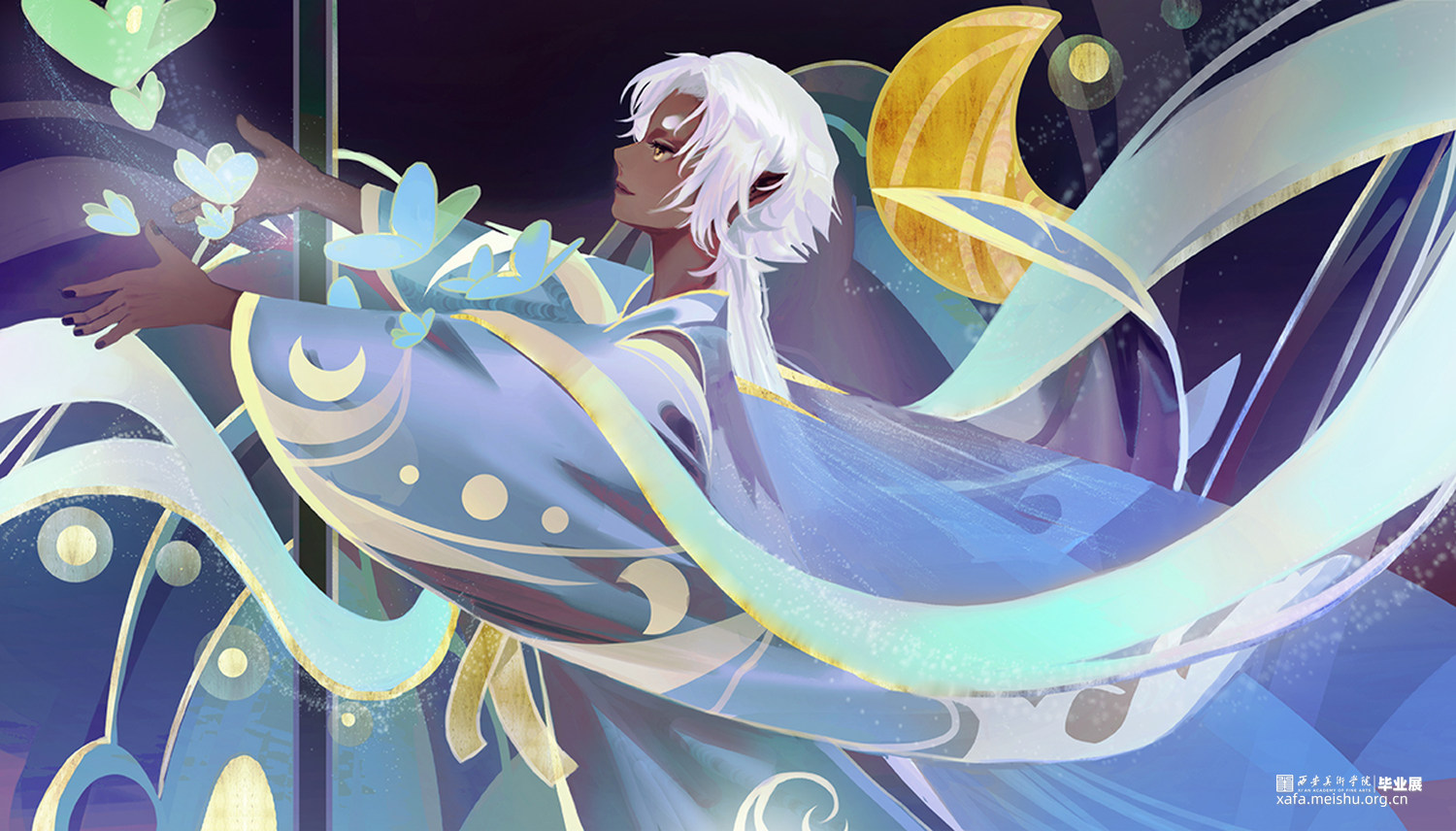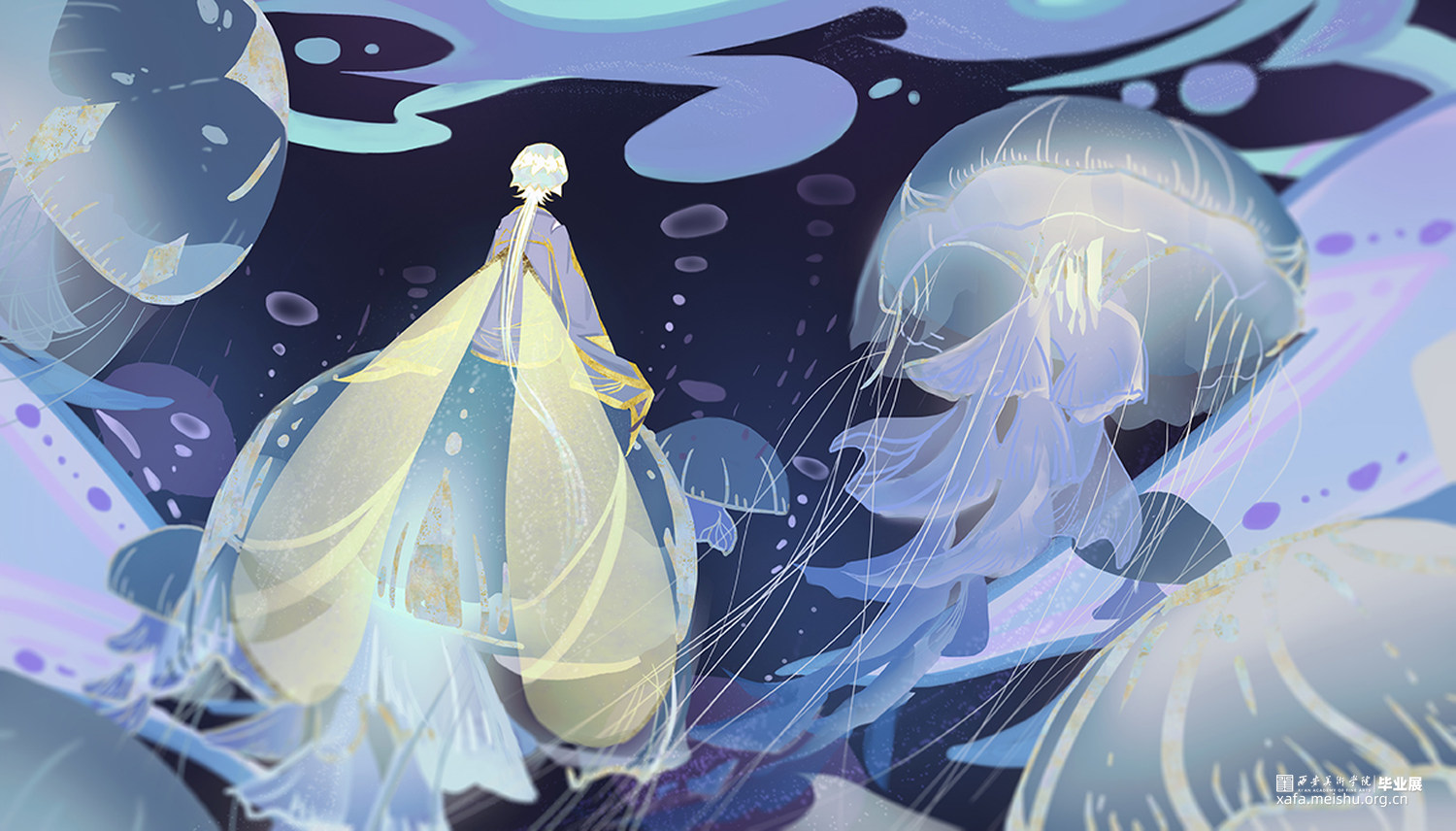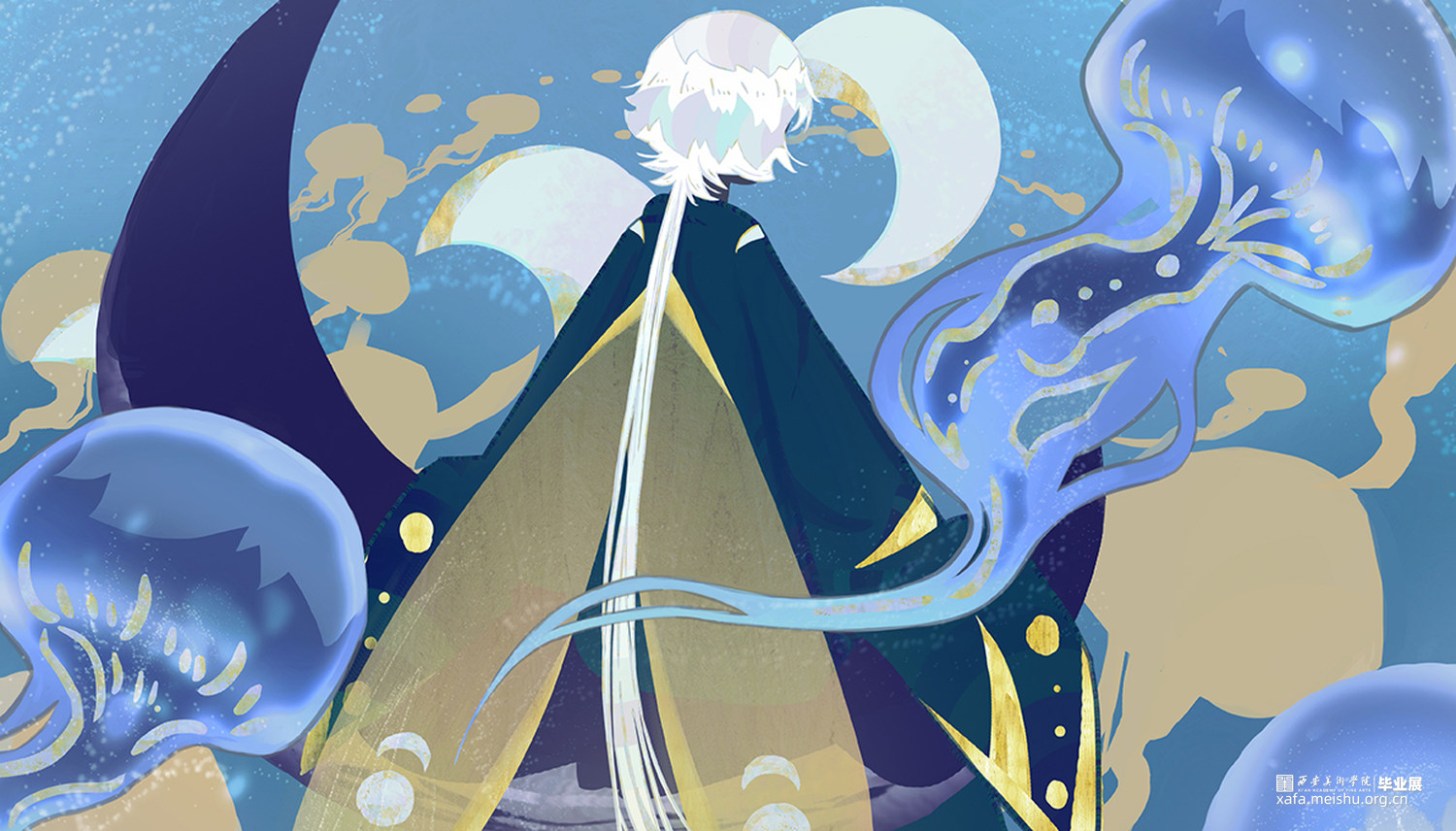 蜉蝣总是用来形容渺小短暂的生命,然而短暂的生命也能绽放出绚烂的色彩,哪怕只有一瞬。而这份作品想要用蜉蝣形象的拟人表达出再微小的存在也是有意义的,再短暂的时间也能被捕捉到美。