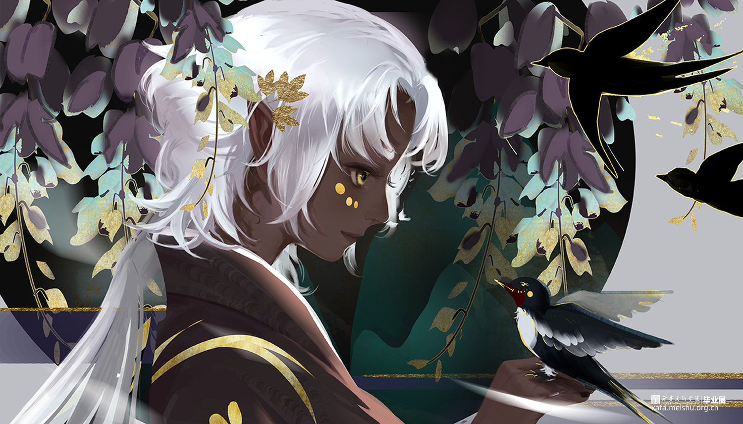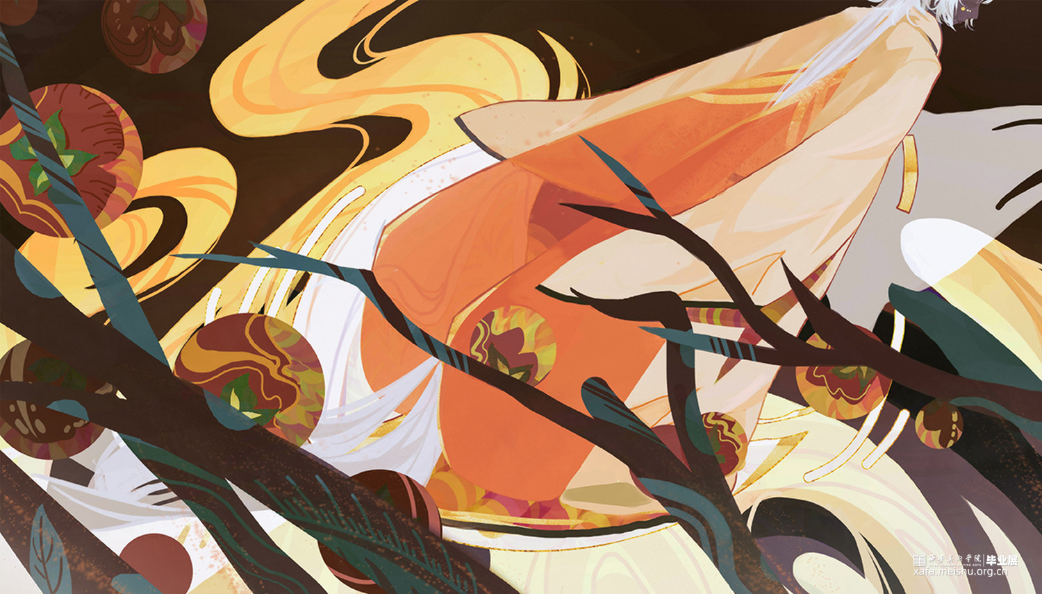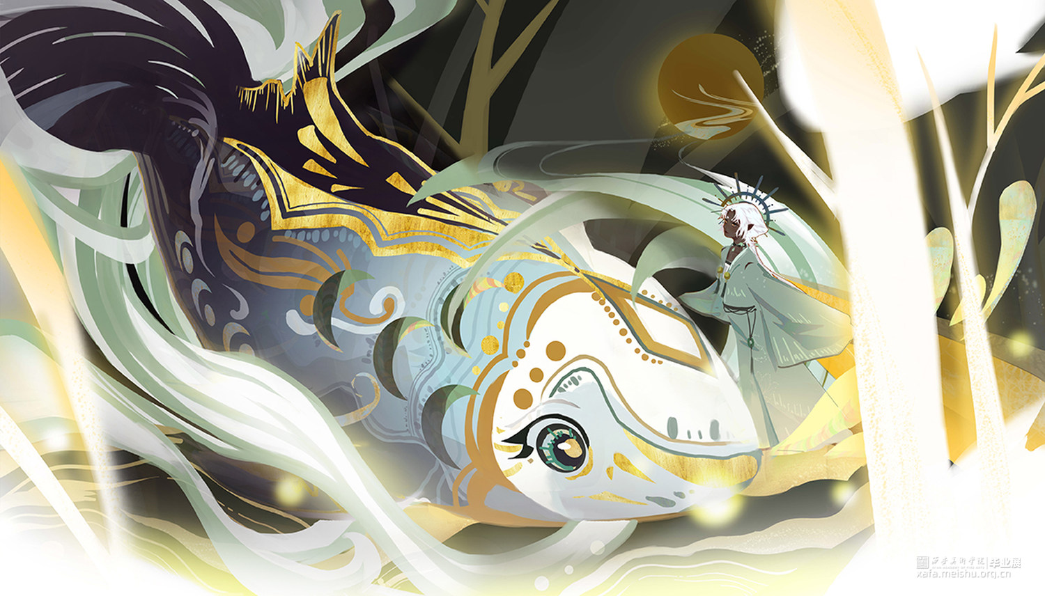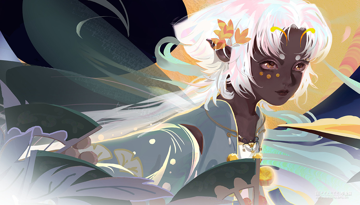 蜉蝣总是用来形容渺小短暂的生命,然而短暂的生命也能绽放出绚烂的色彩,哪怕只有一瞬。而这份作品想要用蜉蝣形象的拟人表达出再微小的存在也是有意义的,再短暂的时间也能被捕捉到美。