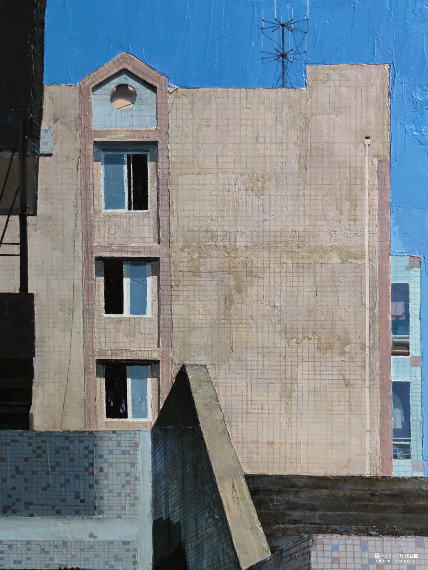 我的创作的意图是将自己肉眼可观的事物不在像以前先辈那样通过光影虚实将事物描绘出来,不再是仅限于将架上绘画那种仅限颜料的创作。在绘制的过程中将塑型膏、丙烯和油画颜料按不同的比例顺序一遍遍的描绘,使得画面具有一定的厚度,这种厚度不是说以前意义上的通过透视颜色变化等将平面二位的布面描绘成三维立体的图像,而是是的画面的整体厚度增加,但画面本身还是更加偏向于平面。这就产生了一种矛盾,作者为什么要将画面画的这么厚但又偏偏画面的感觉是平面化的处理方式呢?这样是不是多此一举,完全没有必要这样画啊,有甚着会直接提出这样画是错的。这就使得人们对于自己已有的概念产生疑问,自己的这种观念是通过谁来给自己传播灌输的,当下我们各种的信息来源是怎么产生的,这种带有意志性的概念到底是对的还是错的,这种固有的思维意识使得人们对于概念性的事物不在加以思考,只会通过自己已有的经验来判断它。通过不同的材质使得画面更加具有趣味性和可读性。