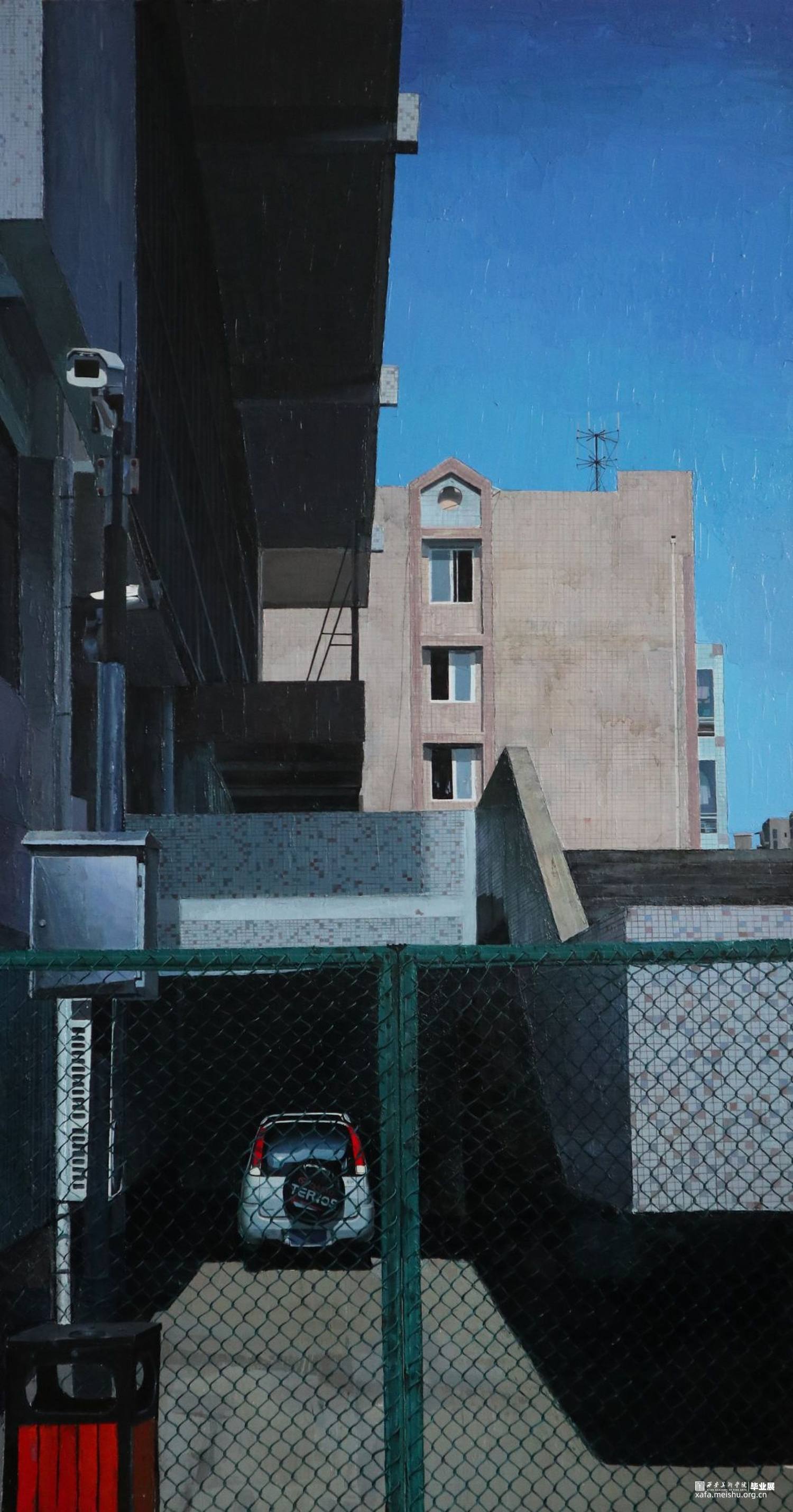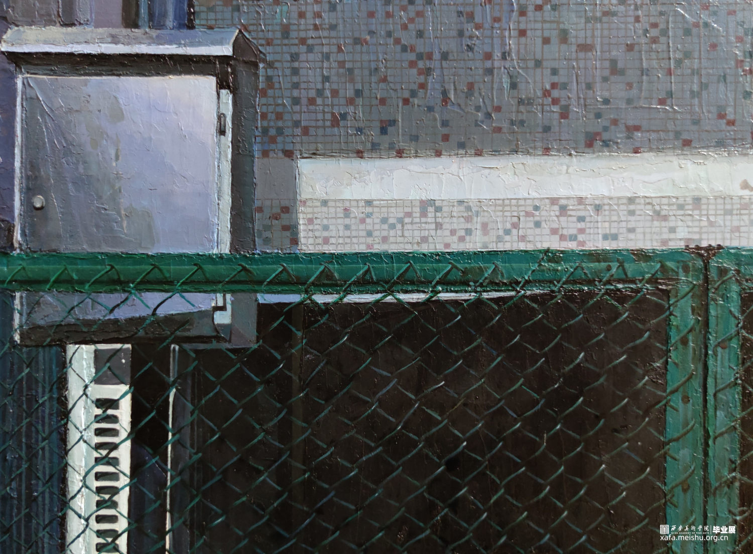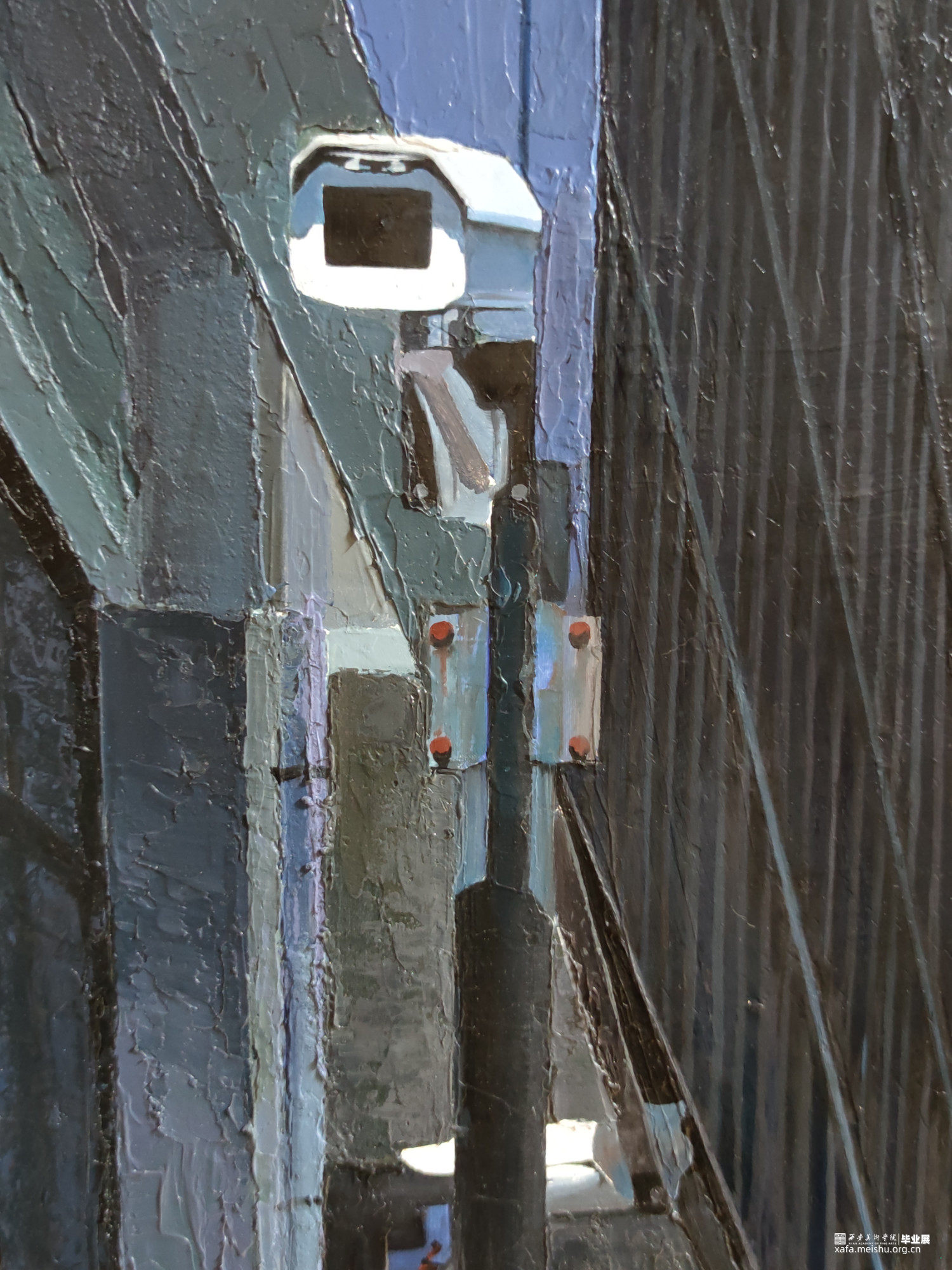 画面的描绘是更加偏向于制作的成分多一些,将自己的画面整理成一步步的步骤,将塑型膏平铺在画布最底层,将油画颜料与丙烯按照不同的比例使之产生哑光的效果。一遍一遍的平铺在画布上,让画面的厚度不断地增加。其工作方法是趁颜料还在湿的情况下,用刮刀或者木板在表面刮掉一层,或者用笔来回扫动,破坏掉形象的边线与细节,有点像羽化的效果。通过这种绘画语言给观众提供了别样的观看方式。在制作的时候更加的偏向于理性的成分多一些,将步骤条理化公式化,在绘制的时候将情绪的噪点将到最低,不带有个人的意识和情感。但画面的最终完成便是自己情