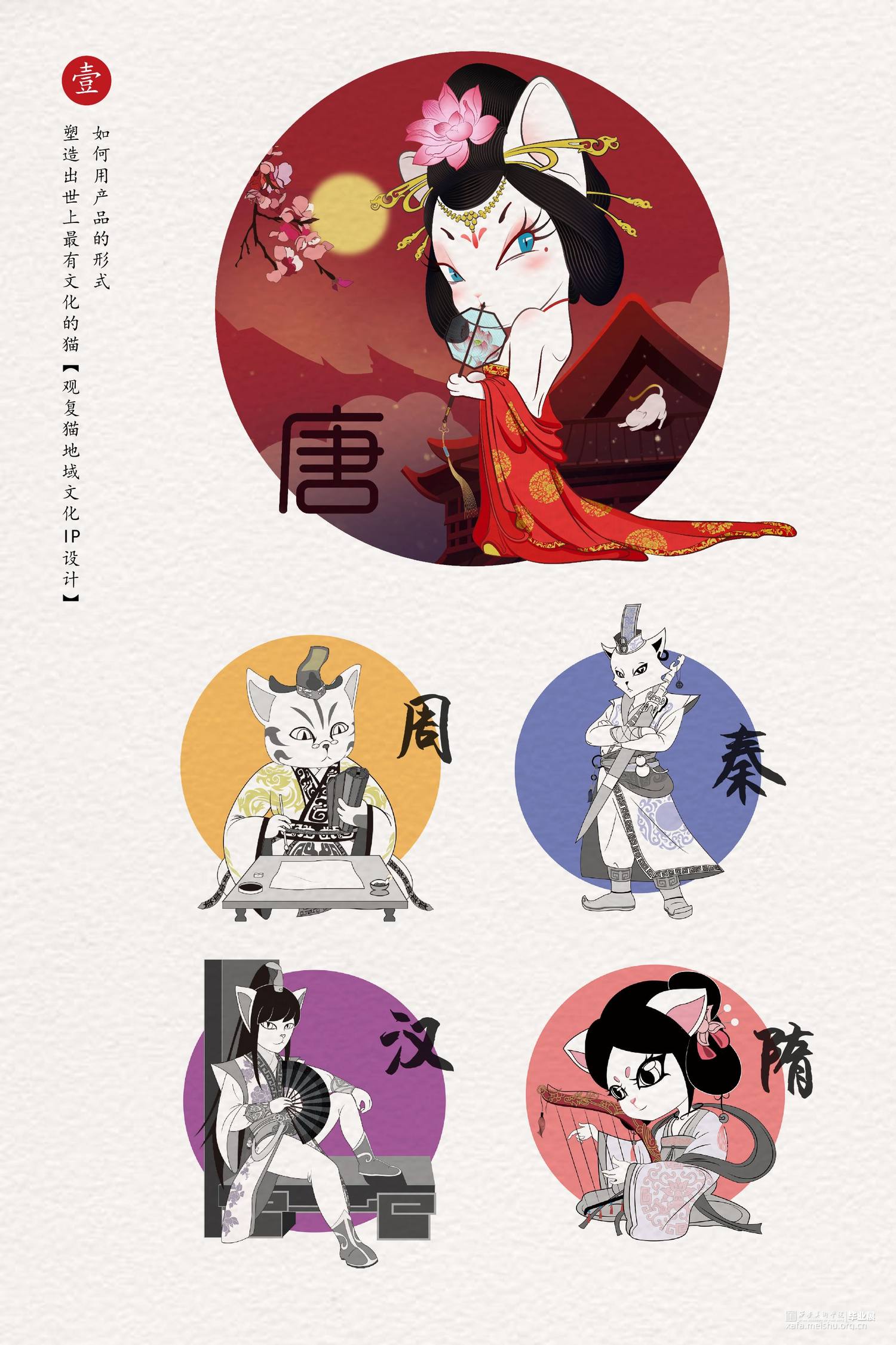 三、经过对观复猫文化及本身的调研,我们进行了地域性的文化附加,因为观复博物馆是具备全部历史文化包容性的博物馆,所以我们对博物馆的五只猫进行了历史背景和造型设计。经过与本地文化的结合,观复猫雏形与周、秦、汉、唐、隋等本地文化进行结合,通过数字绘画的方式进行设计实现,赋予观复猫不同的历史文化背景,通过不同历史背景的体现,让观复猫形象更加的丰满。结合每个朝代不同的特色,贴合每只猫不同的性别和性格进行不同人群喜好的探索。