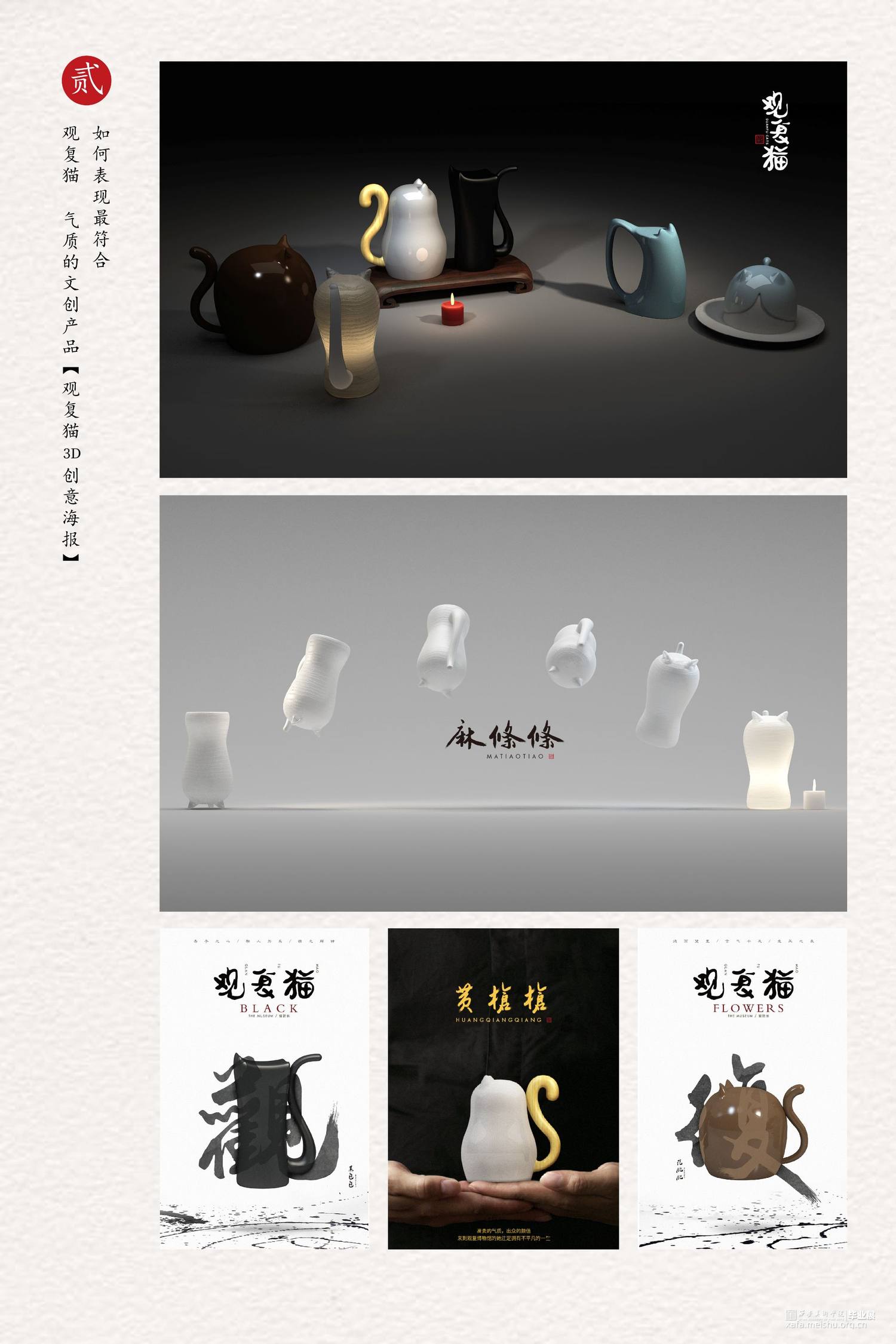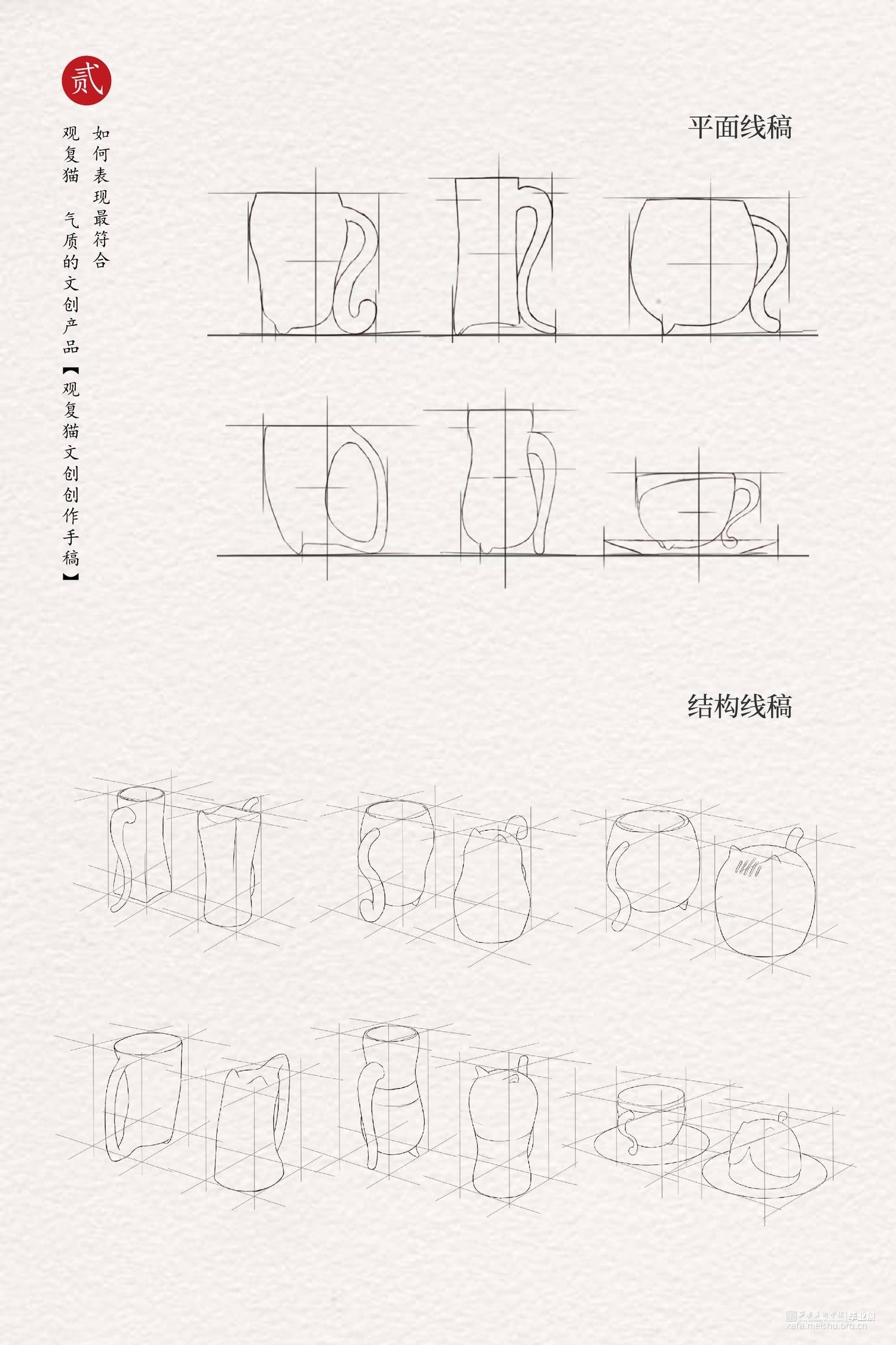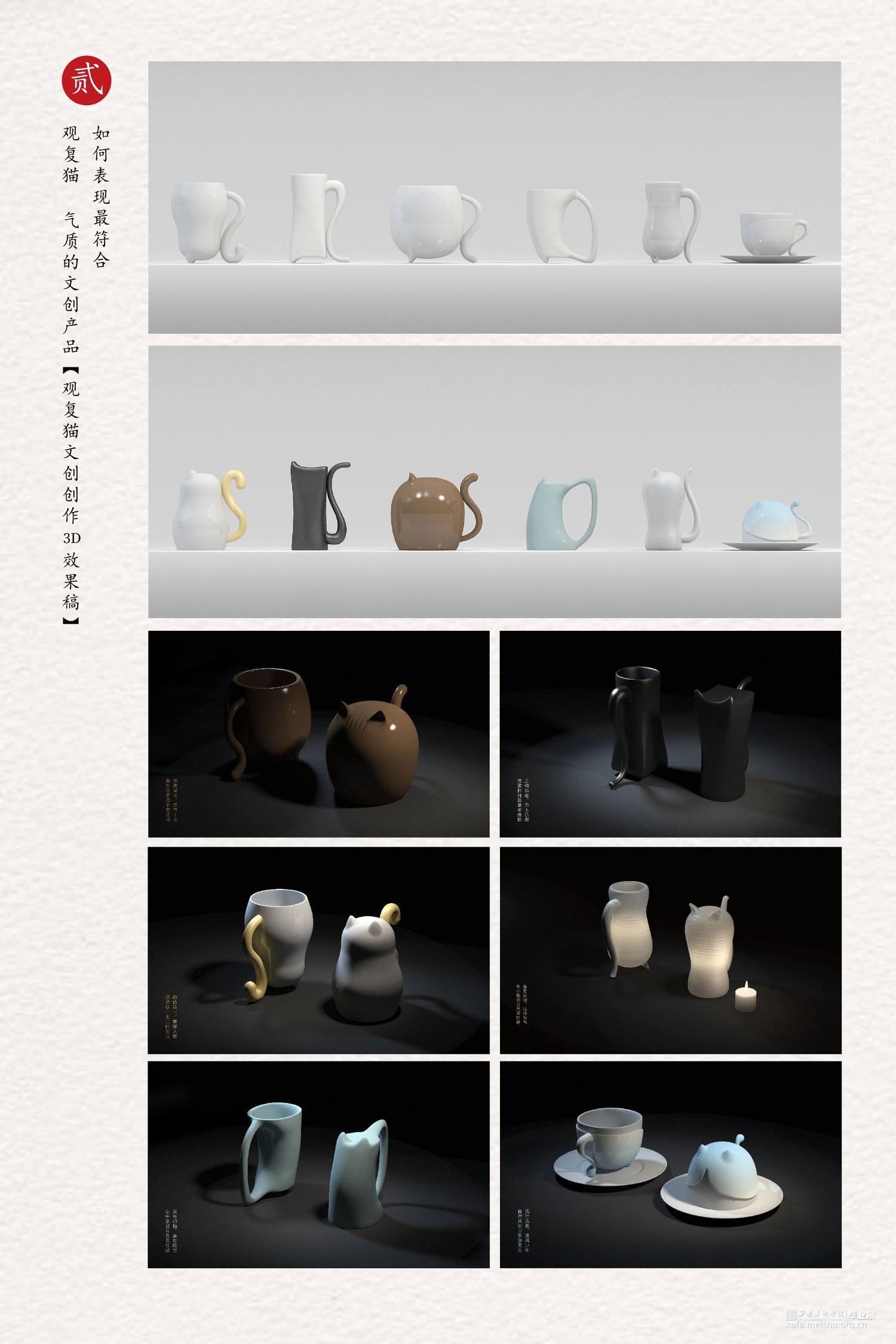 五、从观复猫本身特点进行入手,创意点来源于耳朵与尾巴的三点支撑。杯子本身使用功能的趣味性延续,在造型上更讲究节奏型,变化性,统一性的设计