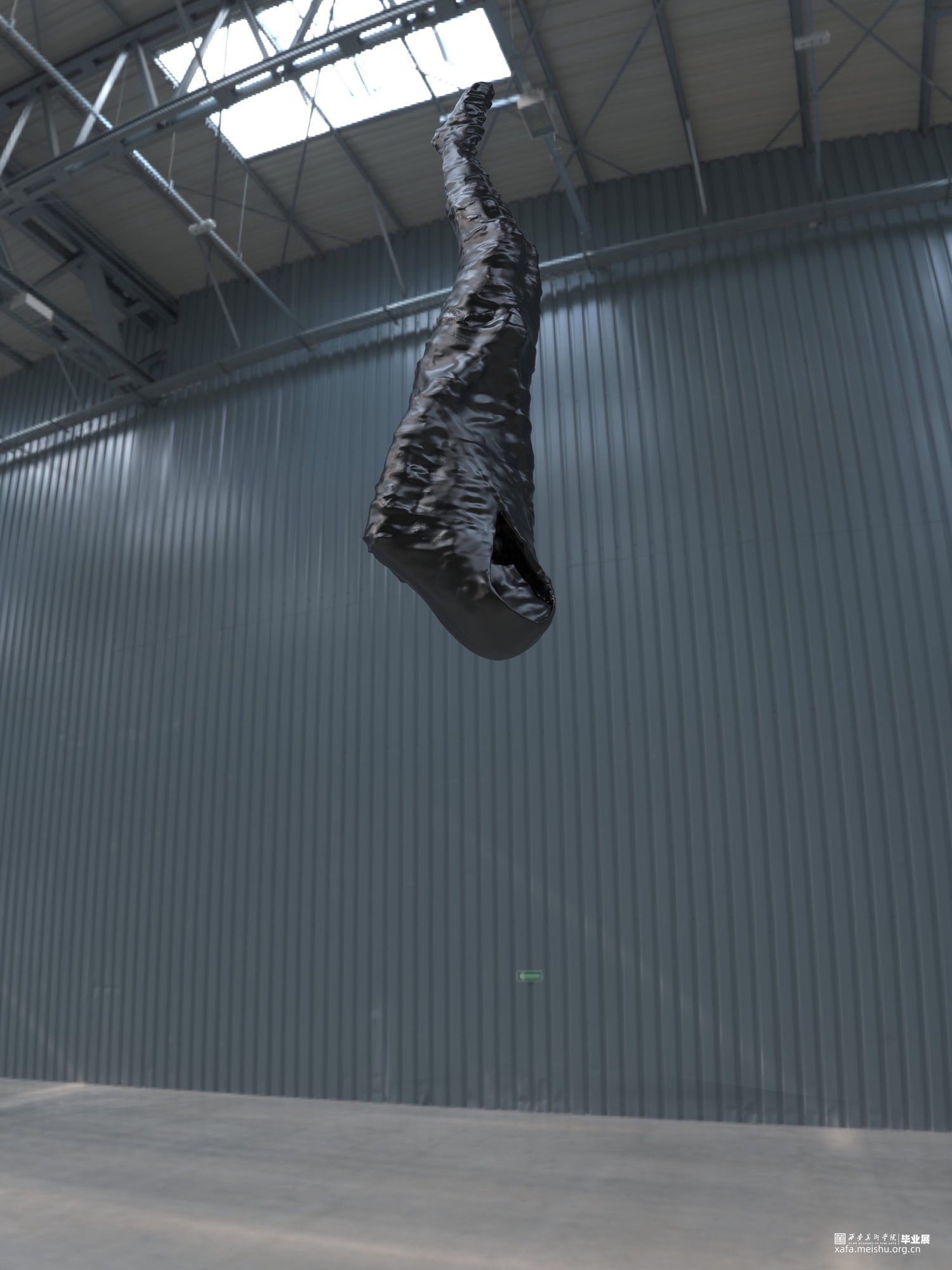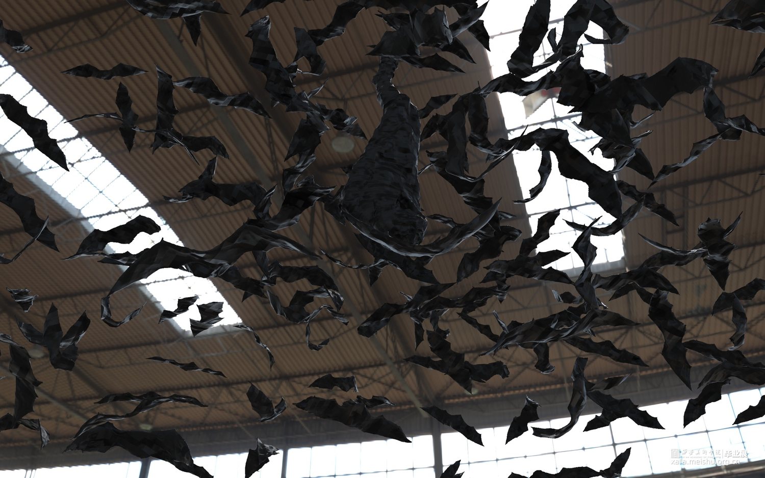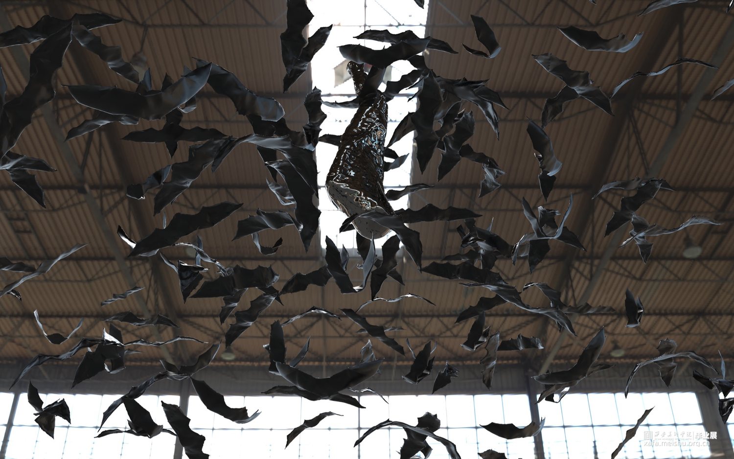 随着疫情的发展,蝙蝠在人心中从一种哺乳类动物,变成了冠状病毒所指的能指。这件作品从远处看,好似一只蝙蝠倒挂在空间中,不知是要起飞还是休眠。我在细节上进行了处理,使之与西方传统图示产生隐密的联系。