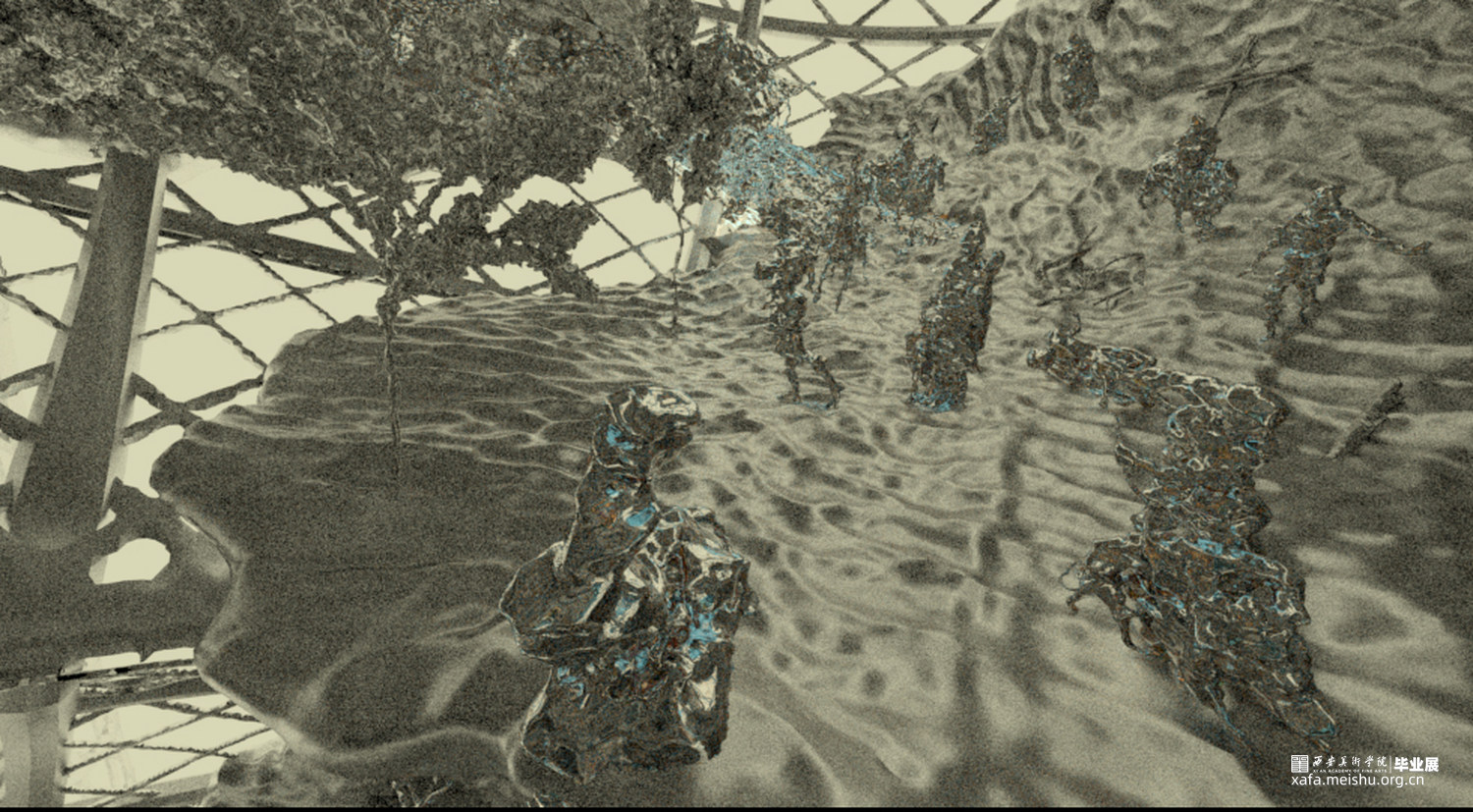 水波有一种操纵的隐喻,而观众无法看清水波中的具体物象。他们用自己对这个物体外形的大致形状进行以及大致动势进行脑补,他们是用自己的观念对物体进行完形。这就是利用观众的观念在做作品。每个观众都会产生不同的感受,观众的视觉感受不同,对物体的理解不同,就会导致对作品含义的不同解读。同时水波纹跟布褶有一种相似性,它是掩盖在具体物象上的一层薄纱。他并未完全将可见与不可见隔绝,他并不是像棺材一样,是一个完全隐去内部事物的密闭空间。他只是掩去了绝大部分可识读的特征。