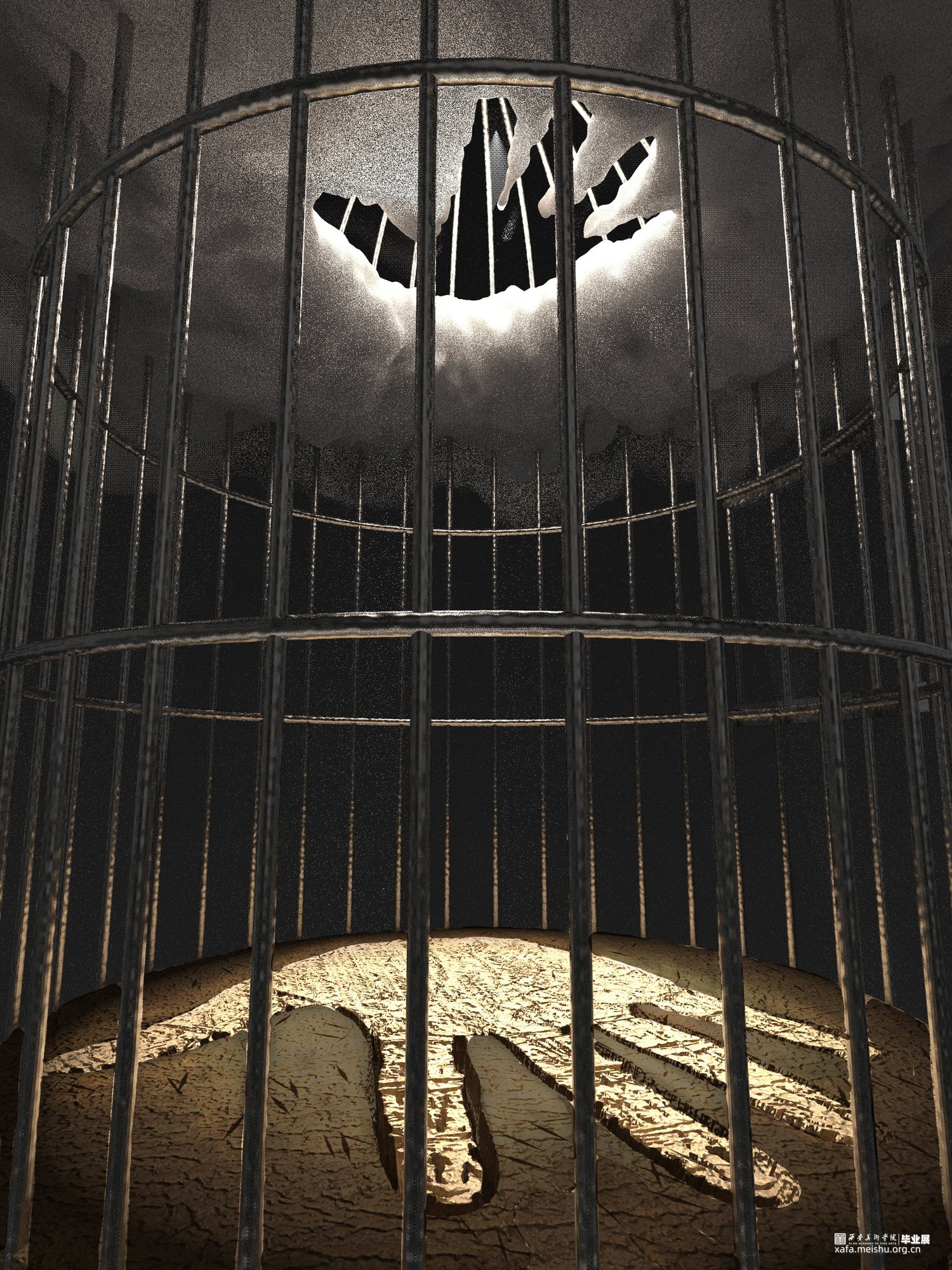 阴与阳、有形与无形、禁锢与自由是我在作品中想表达的冲突,二元对立充斥着每一件事情,什么是自由?是我在作品中思考的问题,拥有权力就可以带来自由吗?当拥有它时也会被更高的东西所捆绑。能困住人的往往都只是内心的枷锁。权力真的能被关住吗?真正迷人的永远都是动态的平衡。