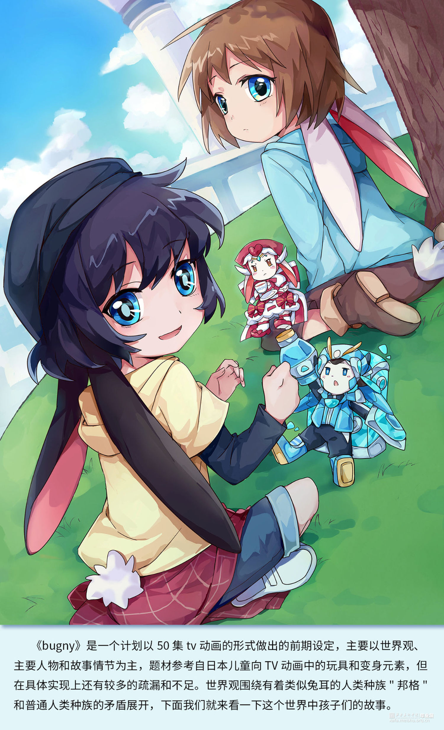 《Bugny》是一个计划以TV动画的形式做出的前期概念设定,主要以世界观,主要人物和故事情节为主,题材参考自日本儿童向TV动画中的玩具和变身元素,但在具体的实现上还有较多的疏漏和不足。设定围绕有着类似兔耳的人类种族"邦格"和普通人类种族的矛盾展开,下面我们就来看一下这个世界以及孩子们的故事。