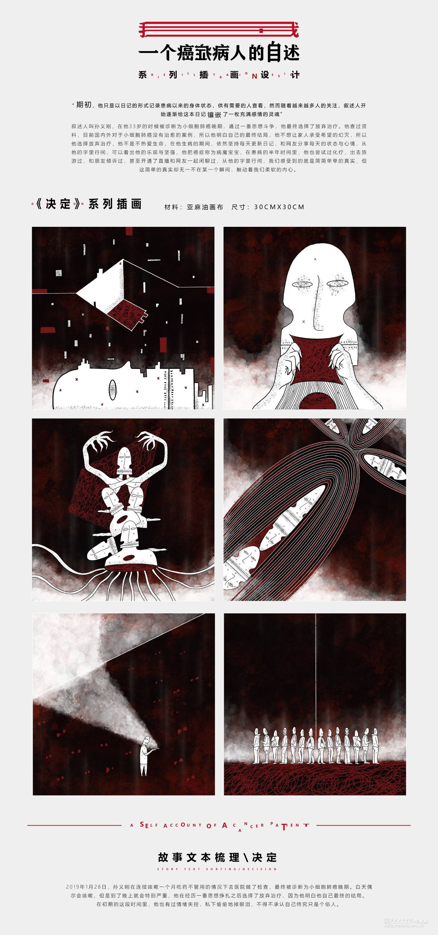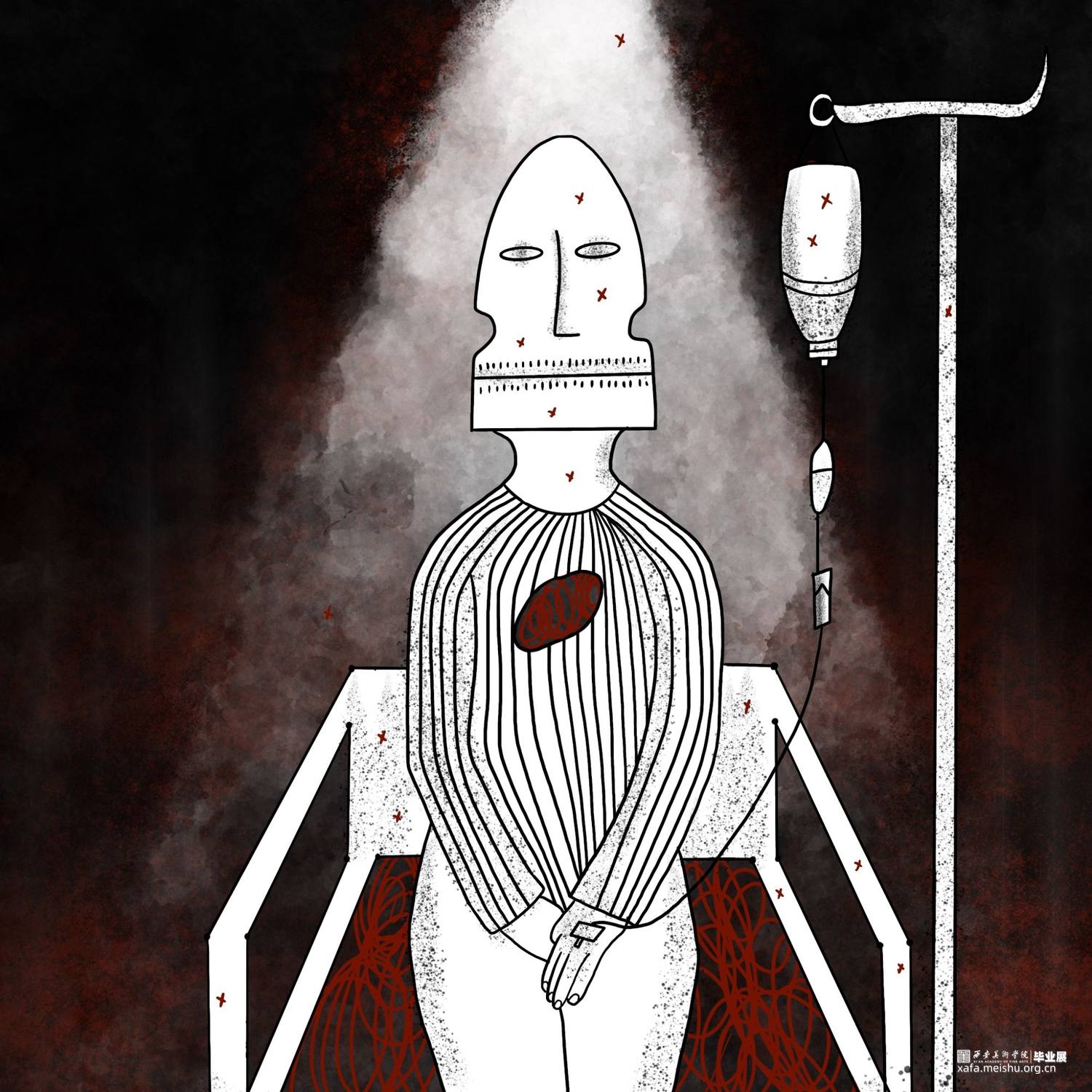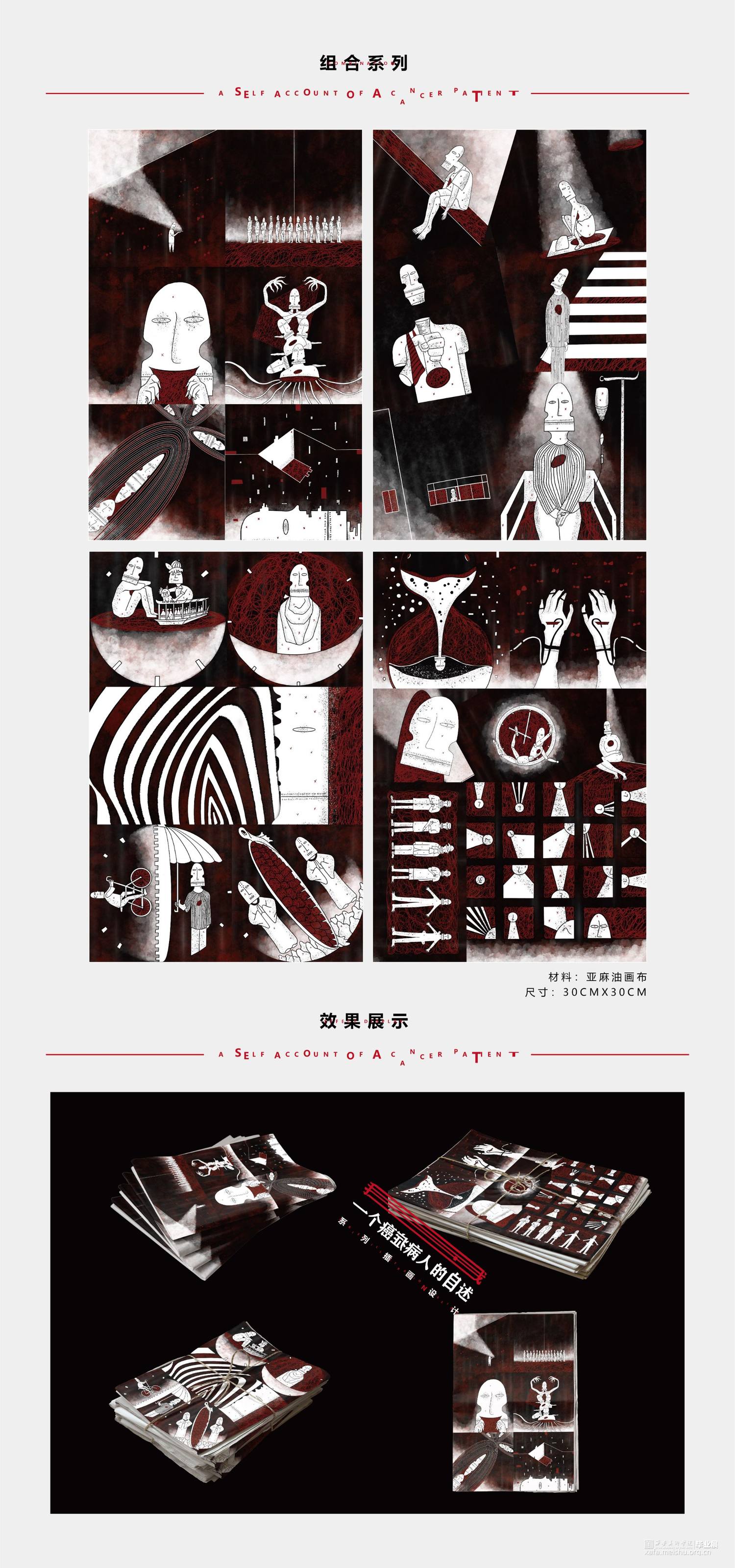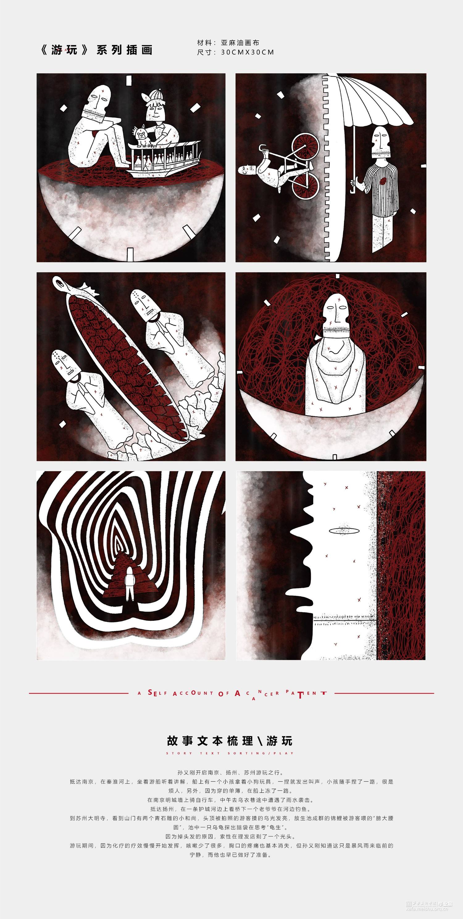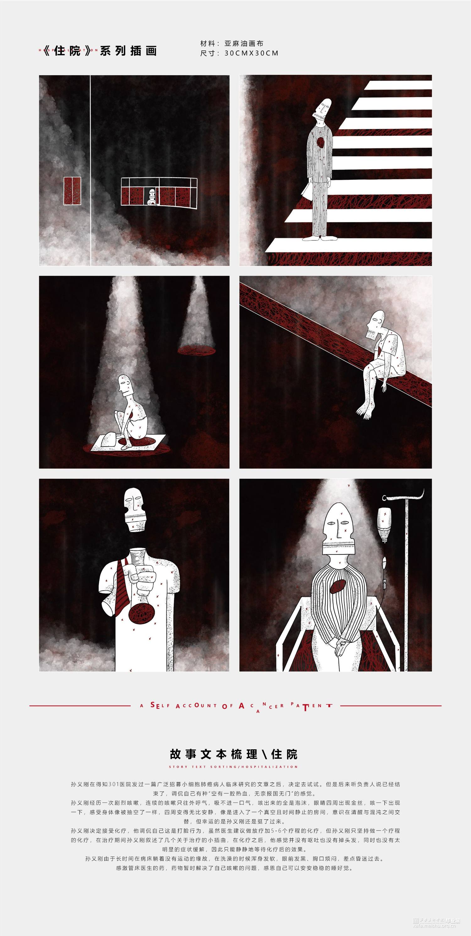 创作中描绘的人物是一个癌症病人,他的名字叫孙义刚,创作以孙义刚在知乎上上传的照片为原型,着重于他面部的塑造,脸型“上圆下方”,通过表现他化疗掉头发,呈现的光头形象来体现“上圆”,表现他作为一个退役军人,作为一个男人,面对病魔,积极乐观的热血男儿形象来体现“下方”。眼睛是心灵的窗户——两个空白的椭圆形状,一方面表现面对病魔的无奈和患病时期的一种状态,另一方面通过无神的眼睛让观者更好地进入孙义刚的心,去真正了解他,去解读他。嘴巴以一种缝合的表现形式,暗示孙义刚在患病以来,都是通过网络来完成日常的交流。面部两边的凹陷,表达出孙义刚被病痛折磨着的一个状态。他肺部中间巨大的空洞,在表明他患的是小细胞肺癌的同时,也表达了他的肺部正在一点点的被癌细胞所侵蚀。描绘的孙义刚时而穿着病服,时而全身赤裸,体现出他作为一个病人的状态。整体描绘的人物形象不是很消瘦,而是一种正常成年人的状态,这是因为在孙义刚的叙述中,他在患病期间并没有掉太多的体重,依然还是保持着一个相对健康的体重。主体人物形象设计,体现出一个患病状态下内心刚强乐观,虽然只能无奈面对现实,却又被无数网友温暖着的病人形象。整个画面的色调以黑红为主,背景的处理是黑底中透露着血腥的红色,营造出一种患病时期周边环境压抑的氛围感,而在这背景的基础上又有一束亮光,一方面象征知乎网友带来的温暖与光明,另一方面也象征着孙义刚内心的精神寄托。我,一个癌症病人系列插画记录了他患病的点点滴滴,希望通过对插画的创作表达,引发观者的思考。
