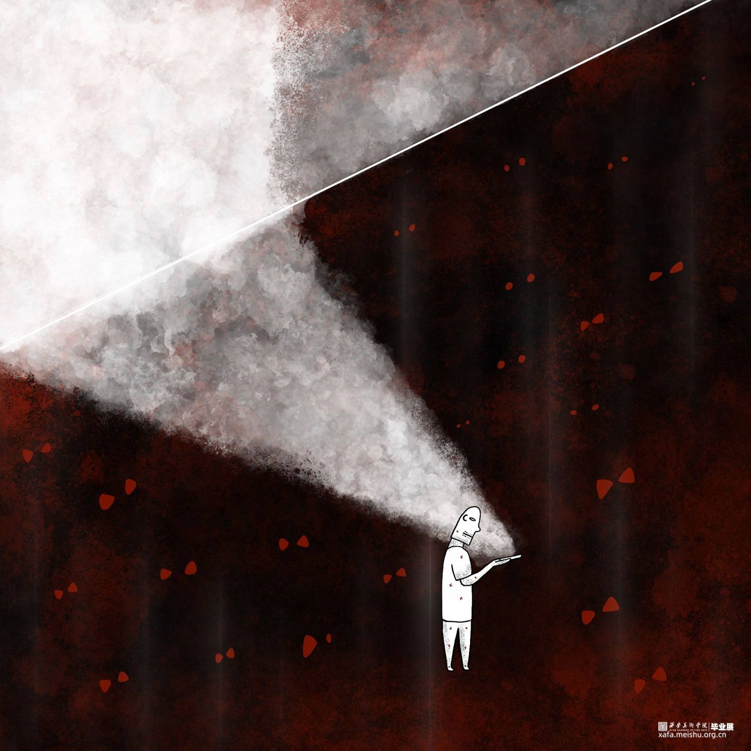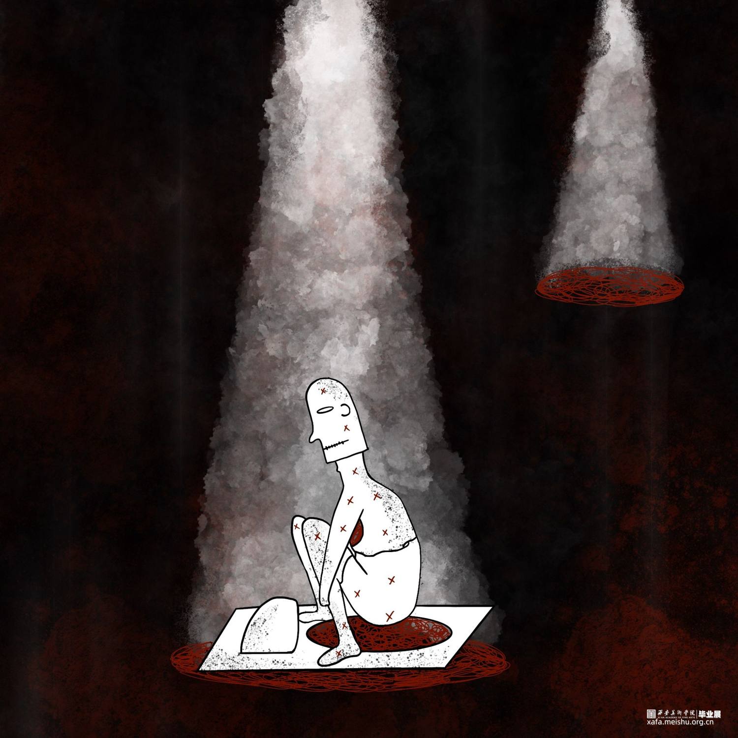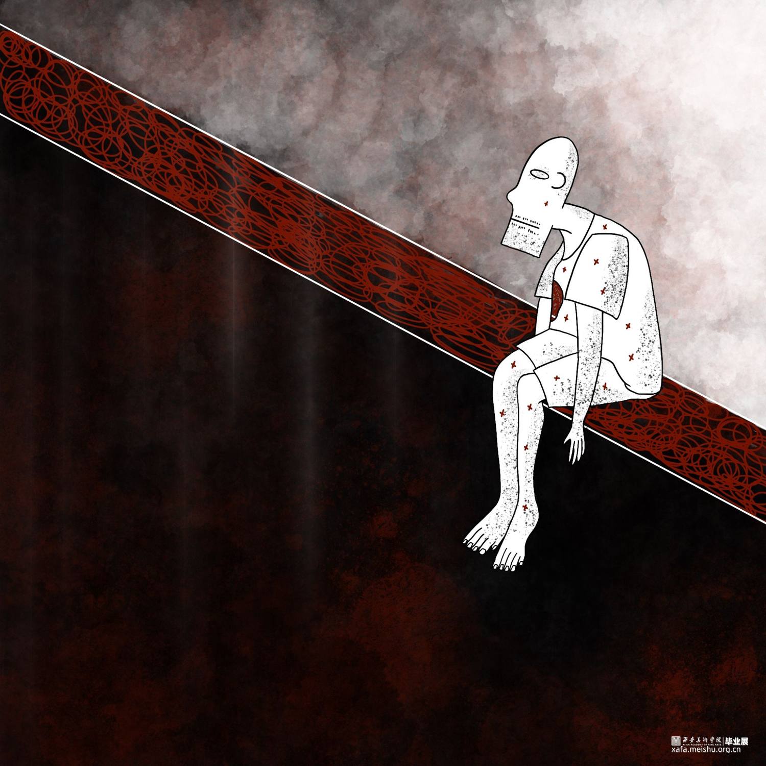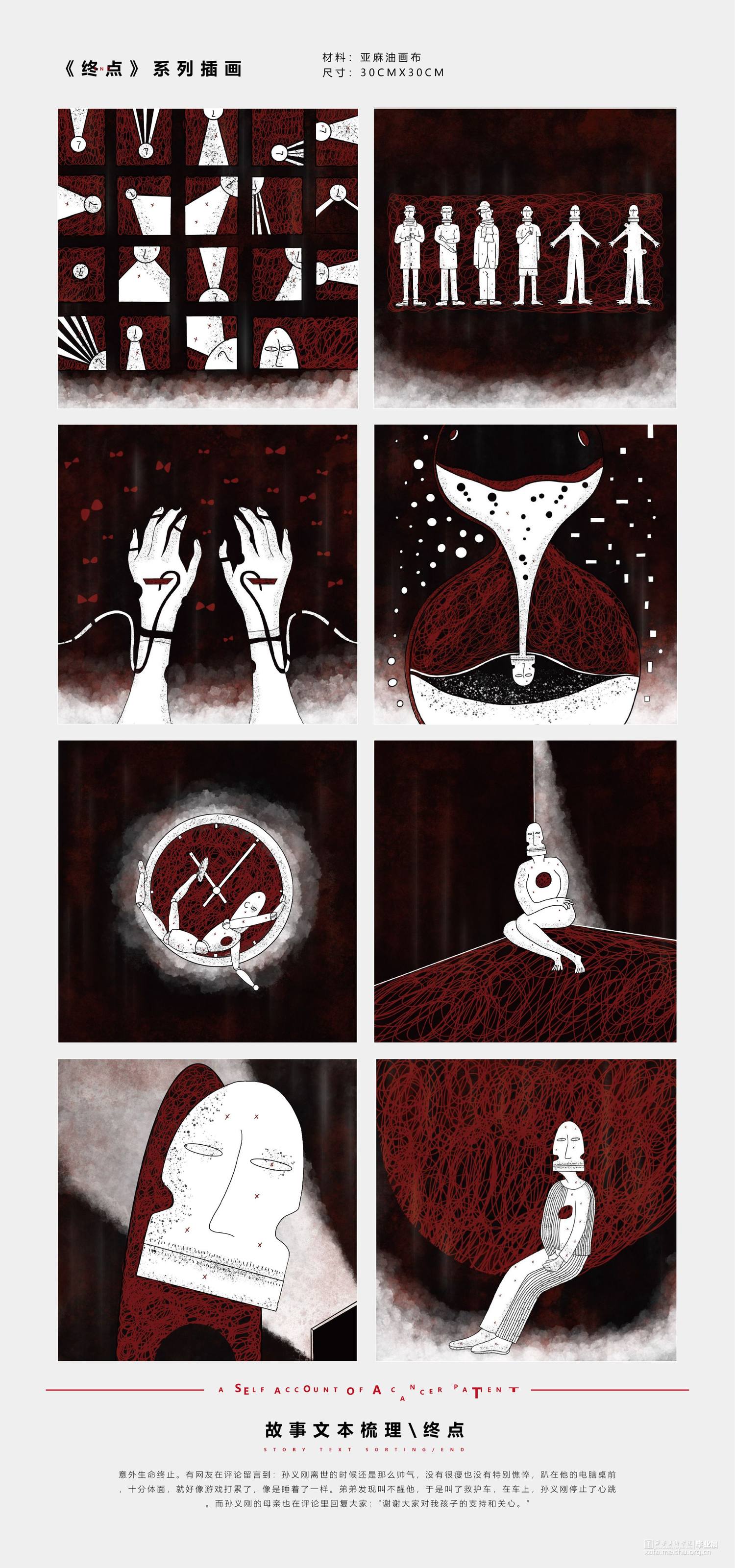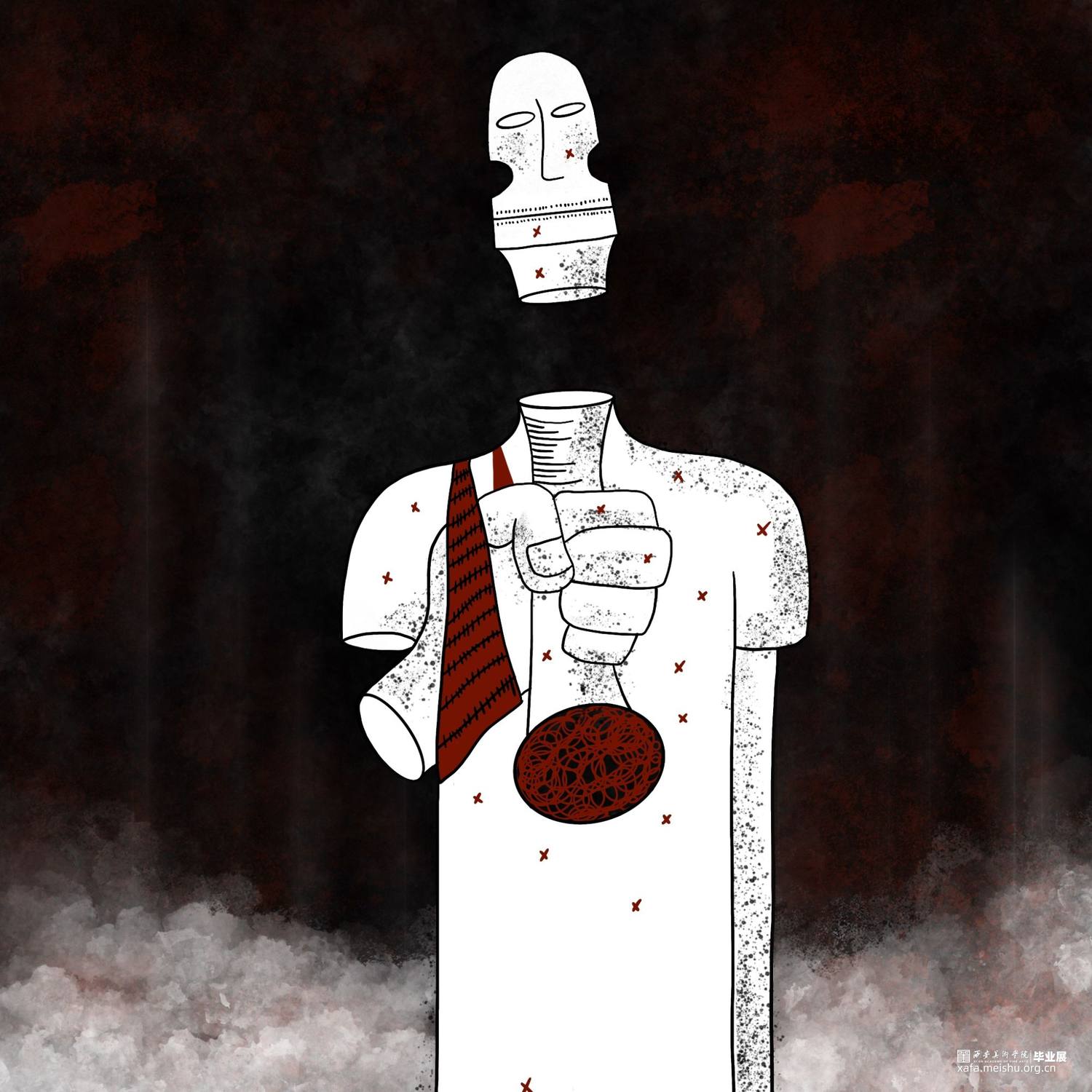 创作中描绘的人物是一个癌症病人,他的名字叫孙义刚,创作以孙义刚在知乎上上传的照片为原型,着重于他面部的塑造,脸型“上圆下方”,通过表现他化疗掉头发,呈现的光头形象来体现“上圆”,表现他作为一个退役军人,作为一个男人,面对病魔,积极乐观的热血男儿形象来体现“下方”。眼睛是心灵的窗户——两个空白的椭圆形状,一方面表现面对病魔的无奈和患病时期的一种状态,另一方面通过无神的眼睛让观者更好地进入孙义刚的心,去真正了解他,去解读他。嘴巴以一种缝合的表现形式,暗示孙义刚在患病以来,都是通过网络来完成日常的交流。面部两边的凹陷,表达出孙义刚被病痛折磨着的一个状态。他肺部中间巨大的空洞,在表明他患的是小细胞肺癌的同时,也表达了他的肺部正在一点点的被癌细胞所侵蚀。描绘的孙义刚时而穿着病服,时而全身赤裸,体现出他作为一个病人的状态。整体描绘的人物形象不是很消瘦,而是一种正常成年人的状态,这是因为在孙义刚的叙述中,他在患病期间并没有掉太多的体重,依然还是保持着一个相对健康的体重。主体人物形象设计,体现出一个患病状态下内心刚强乐观,虽然只能无奈面对现实,却又被无数网友温暖着的病人形象。整个画面的色调以黑红为主,背景的处理是黑底中透露着血腥的红色,营造出一种患病时期周边环境压抑的氛围感,而在这背景的基础上又有一束亮光,一方面象征知乎网友带来的温暖与光明,另一方面也象征着孙义刚内心的精神寄托。我,一个癌症病人系列插画记录了他患病的点点滴滴,希望通过对插画的创作表达,引发观者的思考。