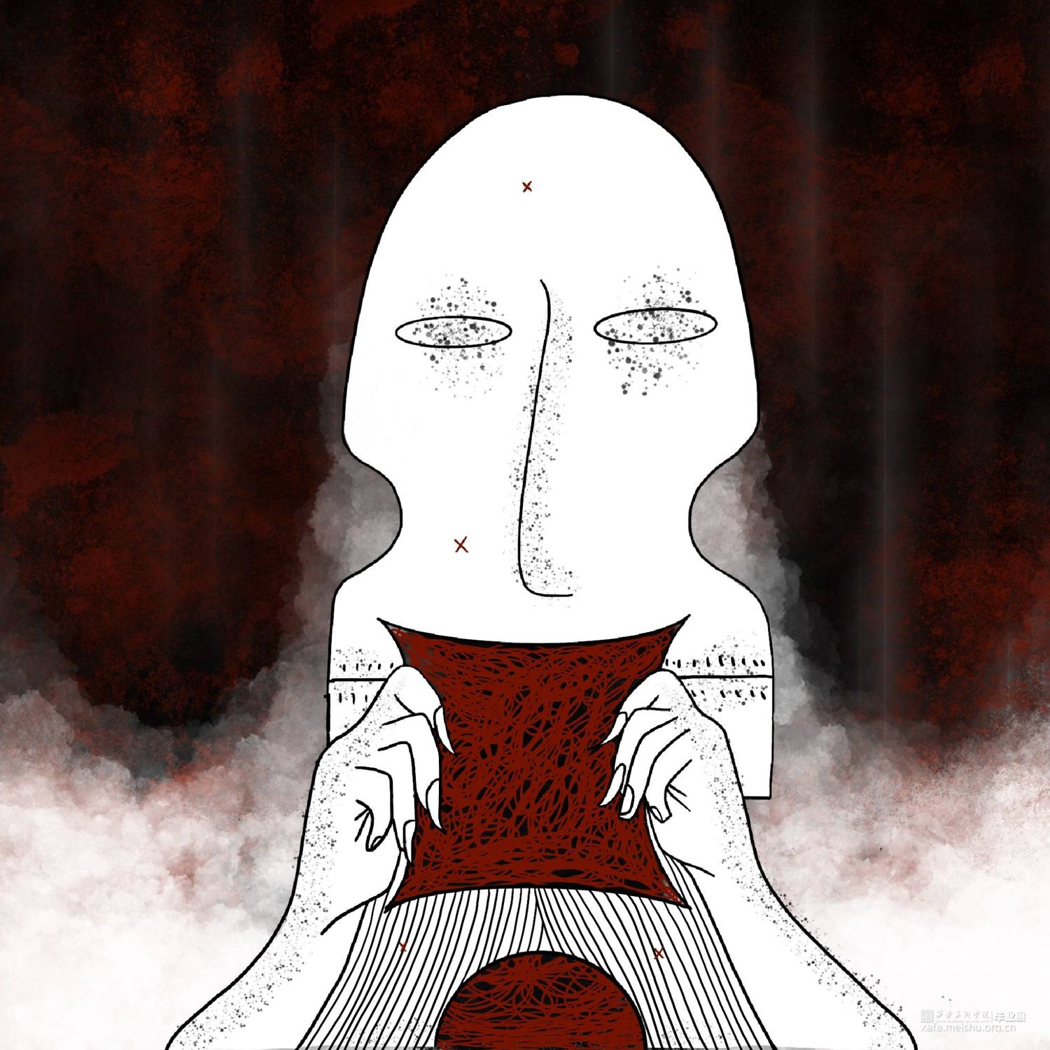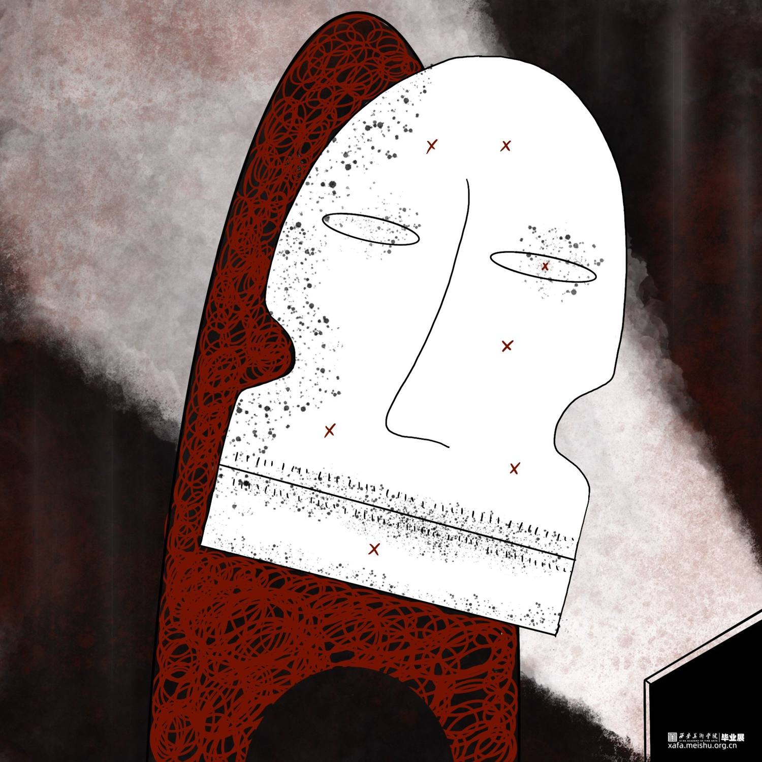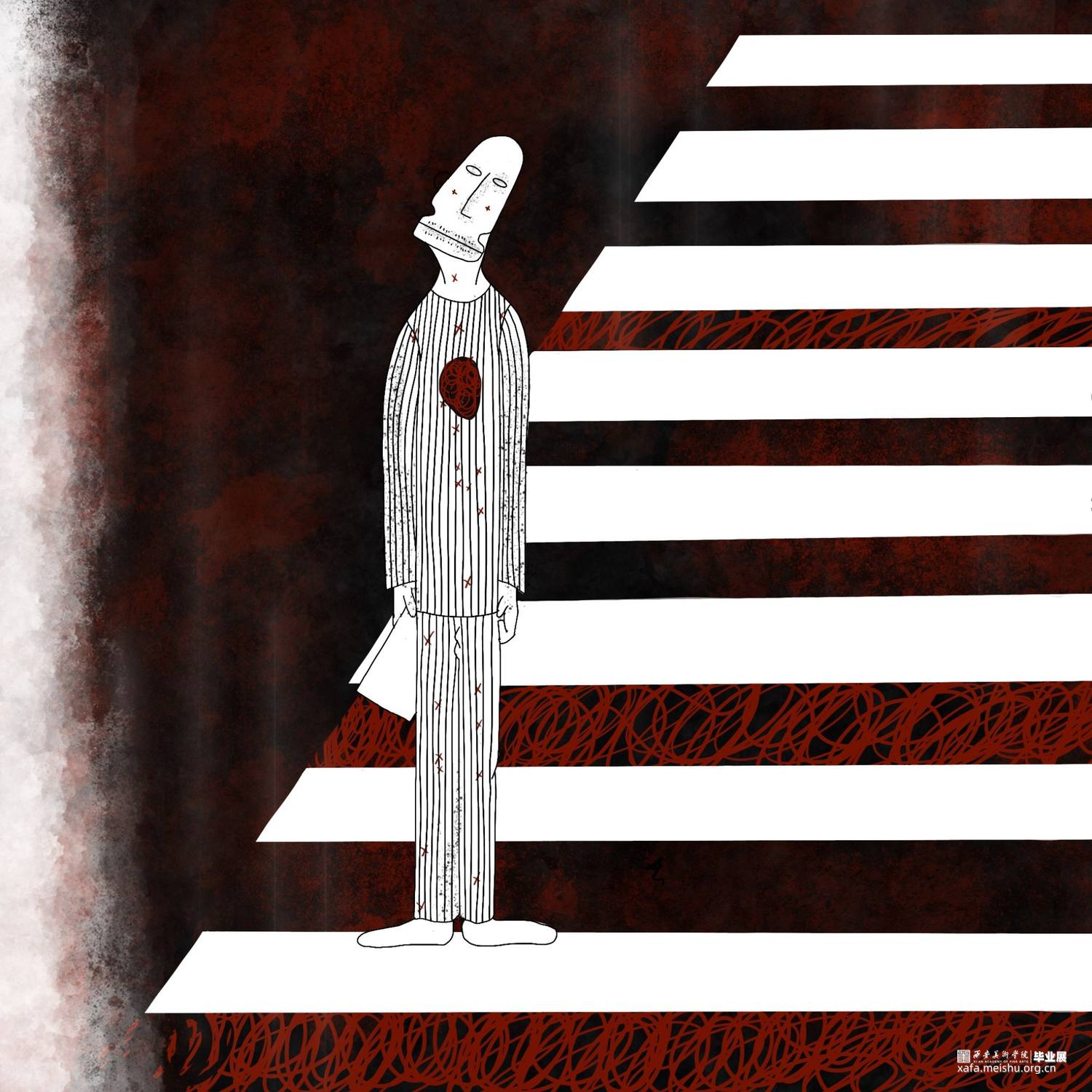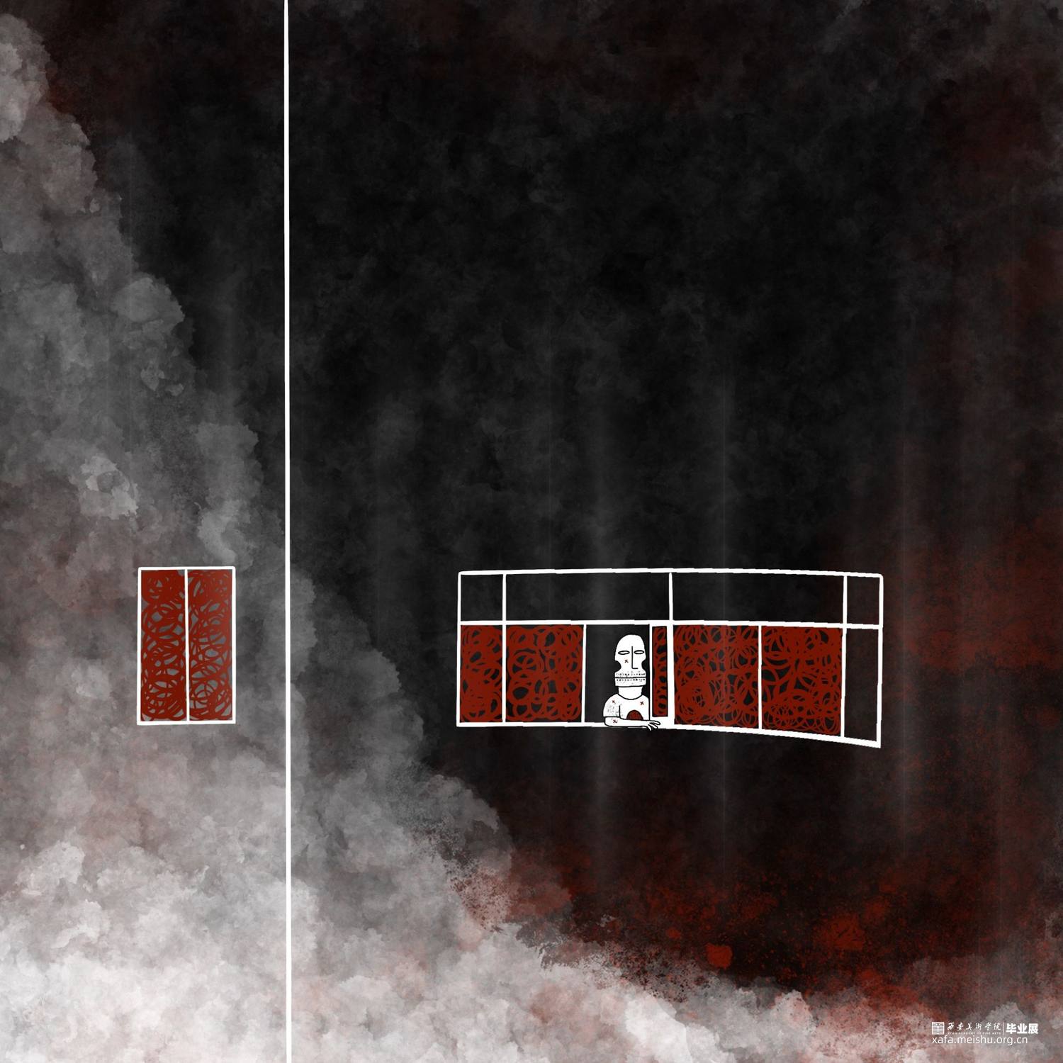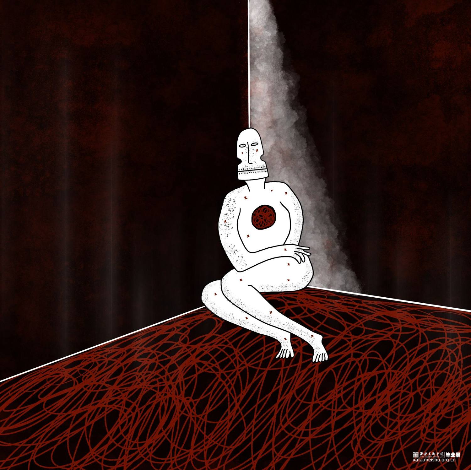 创作中描绘的人物是一个癌症病人,他的名字叫孙义刚,创作以孙义刚在知乎上上传的照片为原型,着重于他面部的塑造,脸型“上圆下方”,通过表现他化疗掉头发,呈现的光头形象来体现“上圆”,表现他作为一个退役军人,作为一个男人,面对病魔,积极乐观的热血男儿形象来体现“下方”。眼睛是心灵的窗户——两个空白的椭圆形状,一方面表现面对病魔的无奈和患病时期的一种状态,另一方面通过无神的眼睛让观者更好地进入孙义刚的心,去真正了解他,去解读他。嘴巴以一种缝合的表现形式,暗示孙义刚在患病以来,都是通过网络来完成日常的交流。面部两边的凹陷,表达出孙义刚被病痛折磨着的一个状态。他肺部中间巨大的空洞,在表明他患的是小细胞肺癌的同时,也表达了他的肺部正在一点点的被癌细胞所侵蚀。描绘的孙义刚时而穿着病服,时而全身赤裸,体现出他作为一个病人的状态。整体描绘的人物形象不是很消瘦,而是一种正常成年人的状态,这是因为在孙义刚的叙述中,他在患病期间并没有掉太多的体重,依然还是保持着一个相对健康的体重。主体人物形象设计,体现出一个患病状态下内心刚强乐观,虽然只能无奈面对现实,却又被无数网友温暖着的病人形象。整个画面的色调以黑红为主,背景的处理是黑底中透露着血腥的红色,营造出一种患病时期周边环境压抑的氛围感,而在这背景的基础上又有一束亮光,一方面象征知乎网友带来的温暖与光明,另一方面也象征着孙义刚内心的精神寄托。我,一个癌症病人系列插画记录了他患病的点点滴滴,希望通过对插画的创作表达,引发观者的思考。