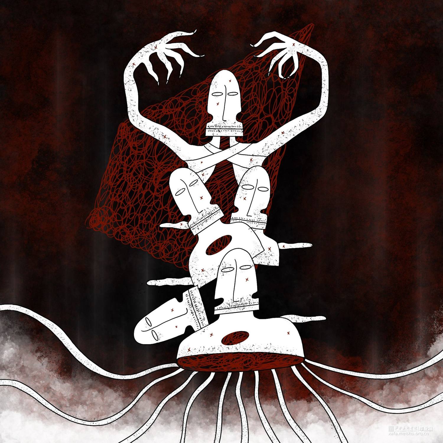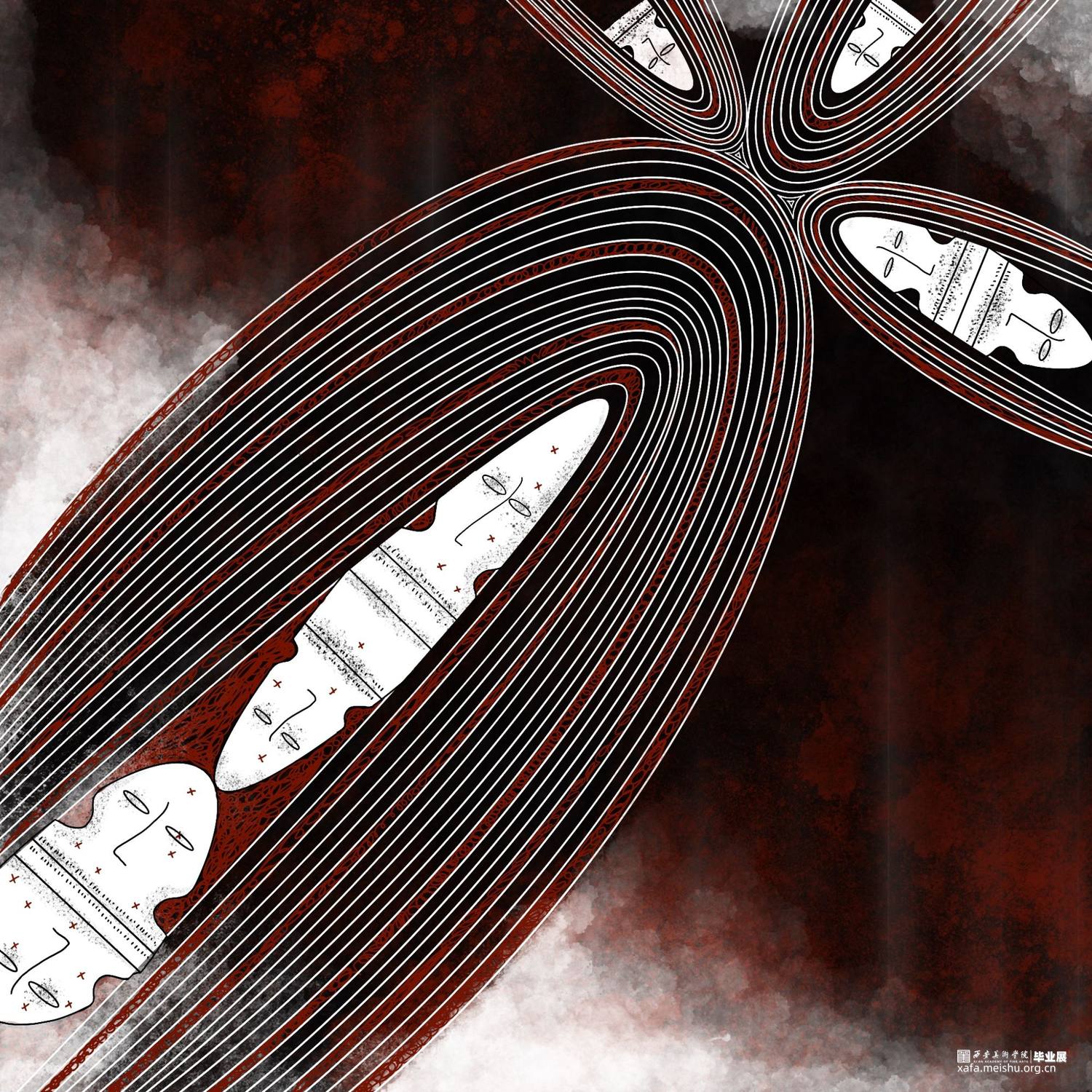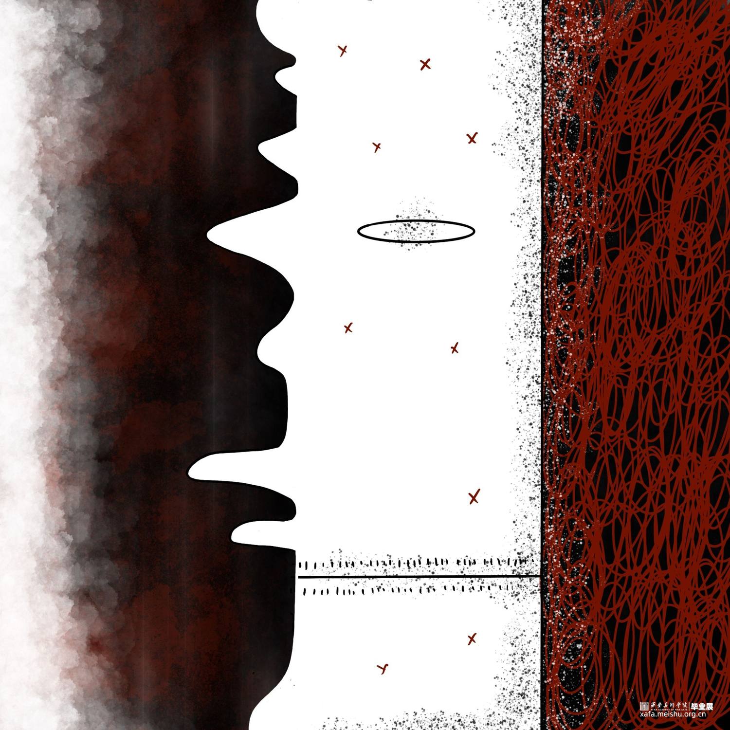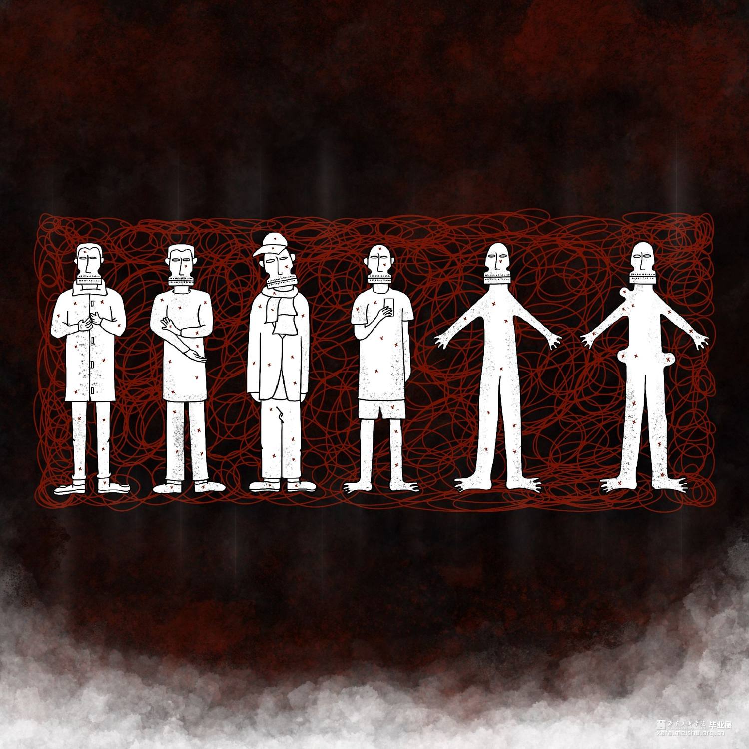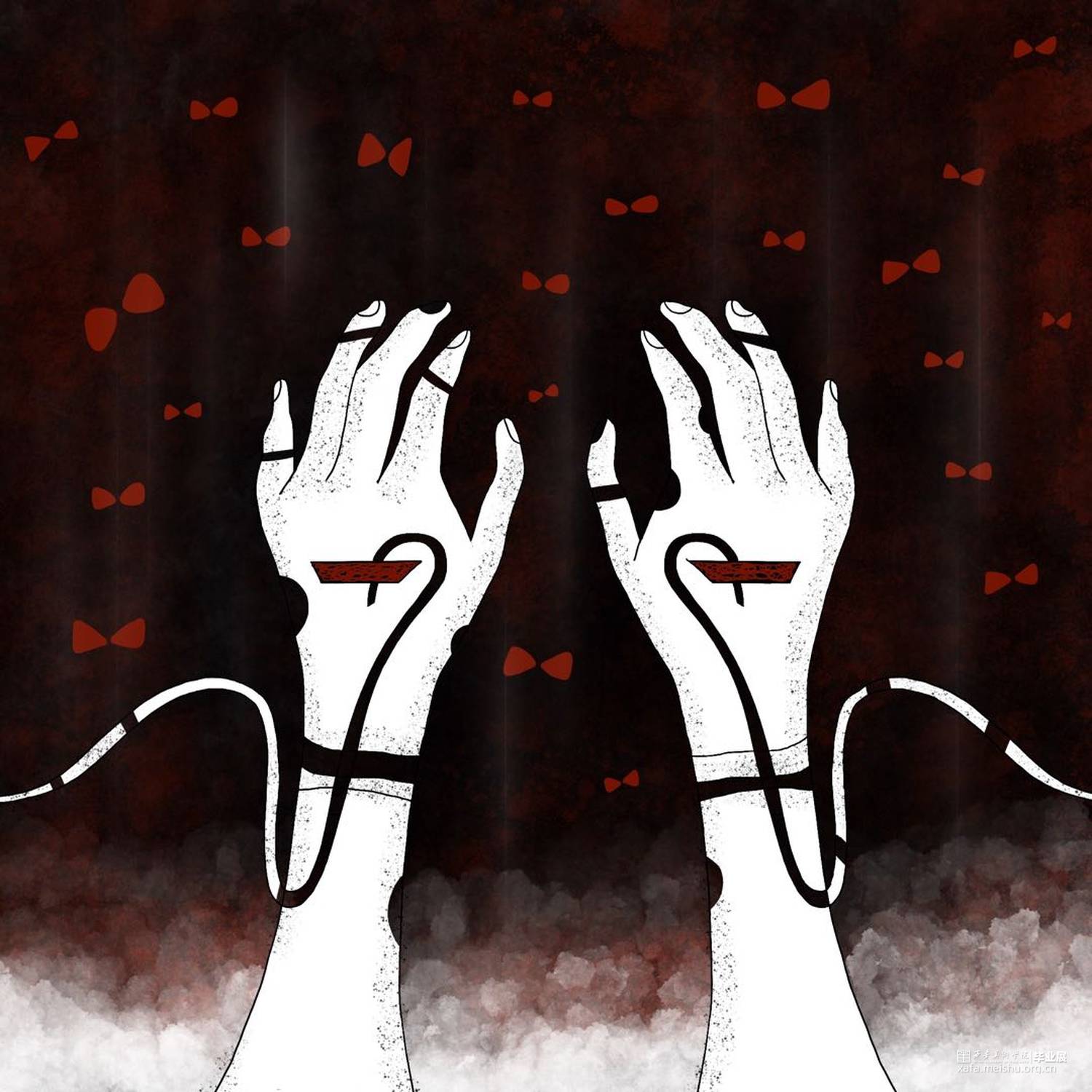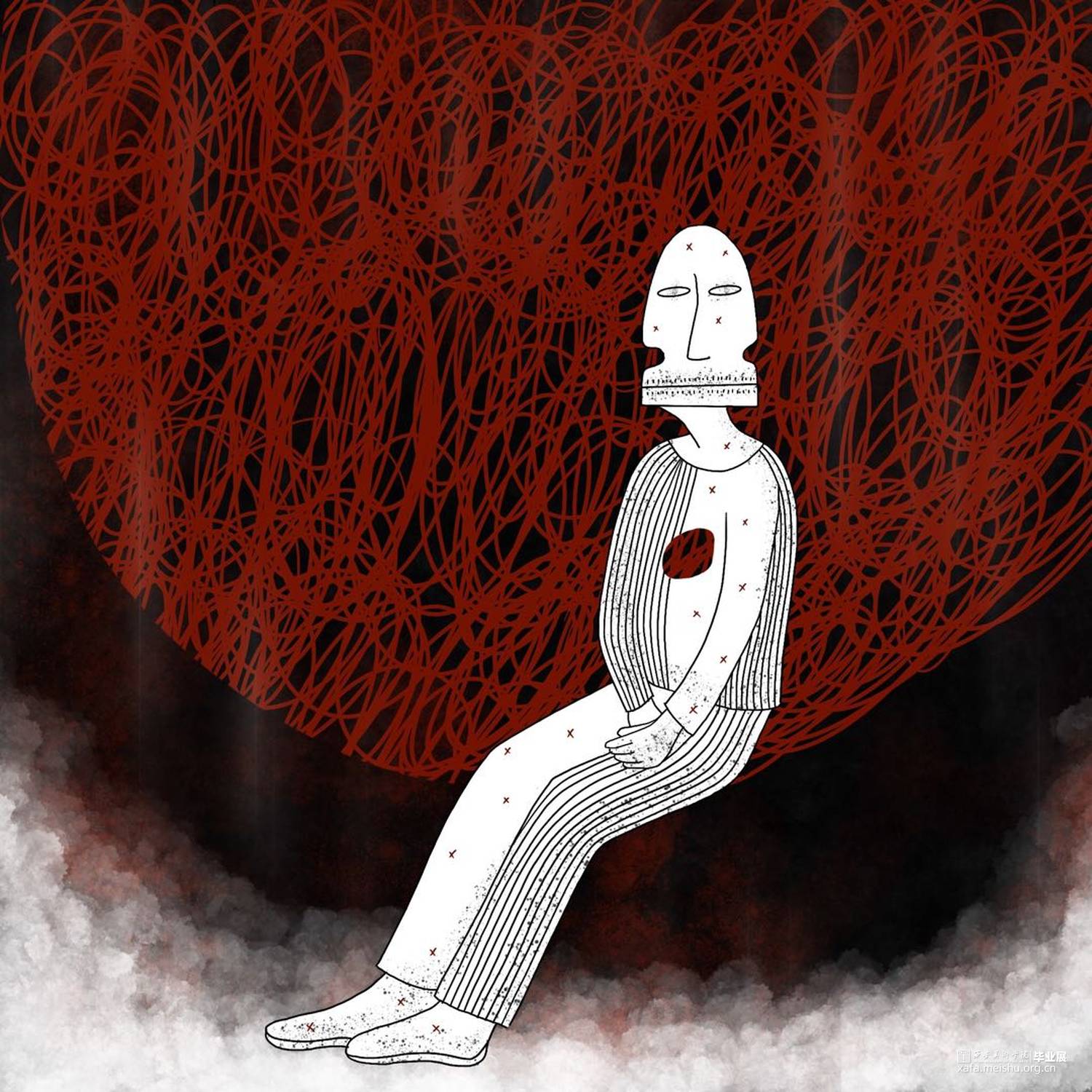 创作中描绘的人物是一个癌症病人,他的名字叫孙义刚,创作以孙义刚在知乎上上传的照片为原型,着重于他面部的塑造,脸型“上圆下方”,通过表现他化疗掉头发,呈现的光头形象来体现“上圆”,表现他作为一个退役军人,作为一个男人,面对病魔,积极乐观的热血男儿形象来体现“下方”。眼睛是心灵的窗户——两个空白的椭圆形状,一方面表现面对病魔的无奈和患病时期的一种状态,另一方面通过无神的眼睛让观者更好地进入孙义刚的心,去真正了解他,去解读他。嘴巴以一种缝合的表现形式,暗示孙义刚在患病以来,都是通过网络来完成日常的交流。面部两边的凹陷,表达出孙义刚被病痛折磨着的一个状态。他肺部中间巨大的空洞,在表明他患的是小细胞肺癌的同时,也表达了他的肺部正在一点点的被癌细胞所侵蚀。描绘的孙义刚时而穿着病服,时而全身赤裸,体现出他作为一个病人的状态。整体描绘的人物形象不是很消瘦,而是一种正常成年人的状态,这是因为在孙义刚的叙述中,他在患病期间并没有掉太多的体重,依然还是保持着一个相对健康的体重。主体人物形象设计,体现出一个患病状态下内心刚强乐观,虽然只能无奈面对现实,却又被无数网友温暖着的病人形象。整个画面的色调以黑红为主,背景的处理是黑底中透露着血腥的红色,营造出一种患病时期周边环境压抑的氛围感,而在这背景的基础上又有一束亮光,一方面象征知乎网友带来的温暖与光明,另一方面也象征着孙义刚内心的精神寄托。我,一个癌症病人系列插画记录了他患病的点点滴滴,希望通过对插画的创作表达,引发观者的思考。