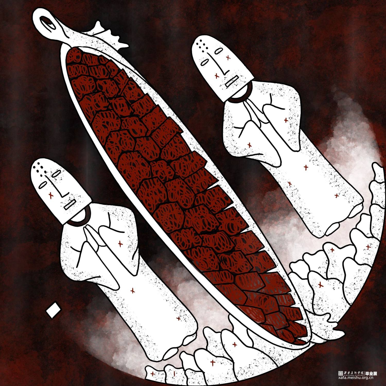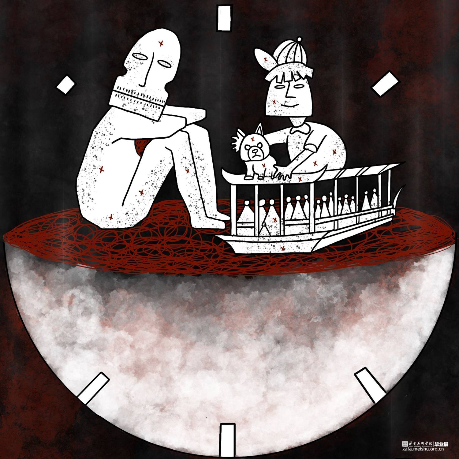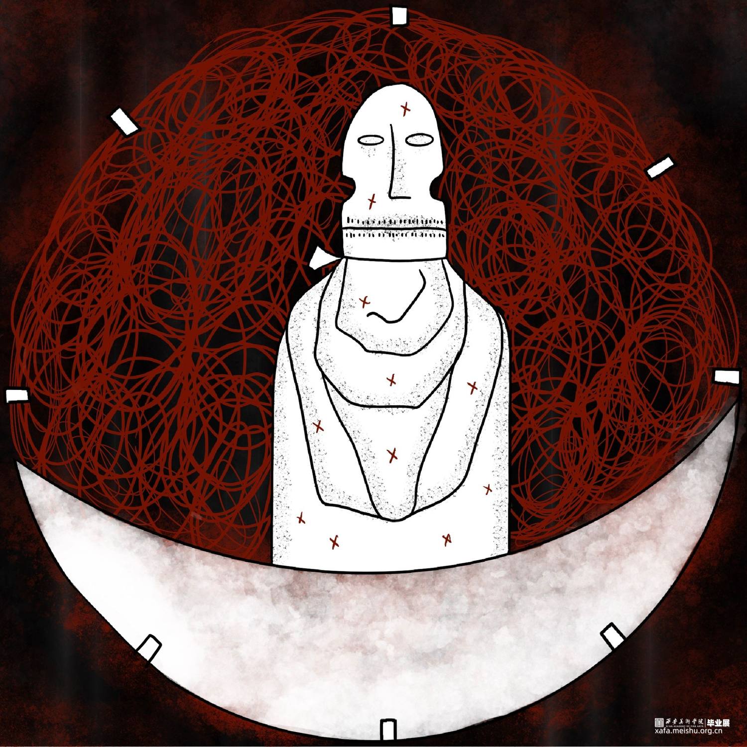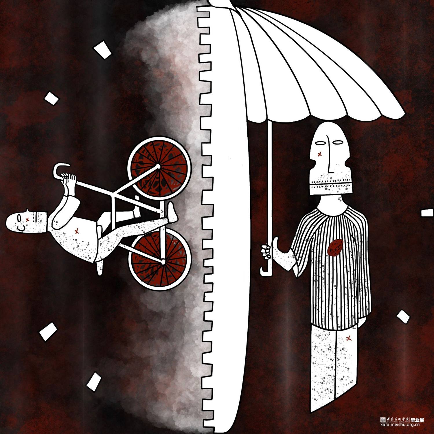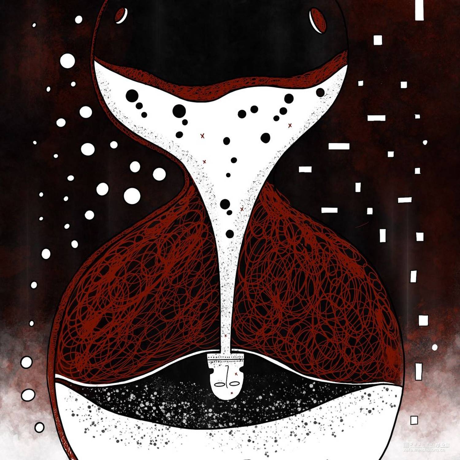 创作中描绘的人物是一个癌症病人,他的名字叫孙义刚,创作以孙义刚在知乎上上传的照片为原型,着重于他面部的塑造,脸型“上圆下方”,通过表现他化疗掉头发,呈现的光头形象来体现“上圆”,表现他作为一个退役军人,作为一个男人,面对病魔,积极乐观的热血男儿形象来体现“下方”。眼睛是心灵的窗户——两个空白的椭圆形状,一方面表现面对病魔的无奈和患病时期的一种状态,另一方面通过无神的眼睛让观者更好地进入孙义刚的心,去真正了解他,去解读他。嘴巴以一种缝合的表现形式,暗示孙义刚在患病以来,都是通过网络来完成日常的交流。面部两边的凹陷,表达出孙义刚被病痛折磨着的一个状态。他肺部中间巨大的空洞,在表明他患的是小细胞肺癌的同时,也表达了他的肺部正在一点点的被癌细胞所侵蚀。描绘的孙义刚时而穿着病服,时而全身赤裸,体现出他作为一个病人的状态。整体描绘的人物形象不是很消瘦,而是一种正常成年人的状态,这是因为在孙义刚的叙述中,他在患病期间并没有掉太多的体重,依然还是保持着一个相对健康的体重。主体人物形象设计,体现出一个患病状态下内心刚强乐观,虽然只能无奈面对现实,却又被无数网友温暖着的病人形象。整个画面的色调以黑红为主,背景的处理是黑底中透露着血腥的红色,营造出一种患病时期周边环境压抑的氛围感,而在这背景的基础上又有一束亮光,一方面象征知乎网友带来的温暖与光明,另一方面也象征着孙义刚内心的精神寄托。我,一个癌症病人系列插画记录了他患病的点点滴滴,希望通过对插画的创作表达,引发观者的思考。