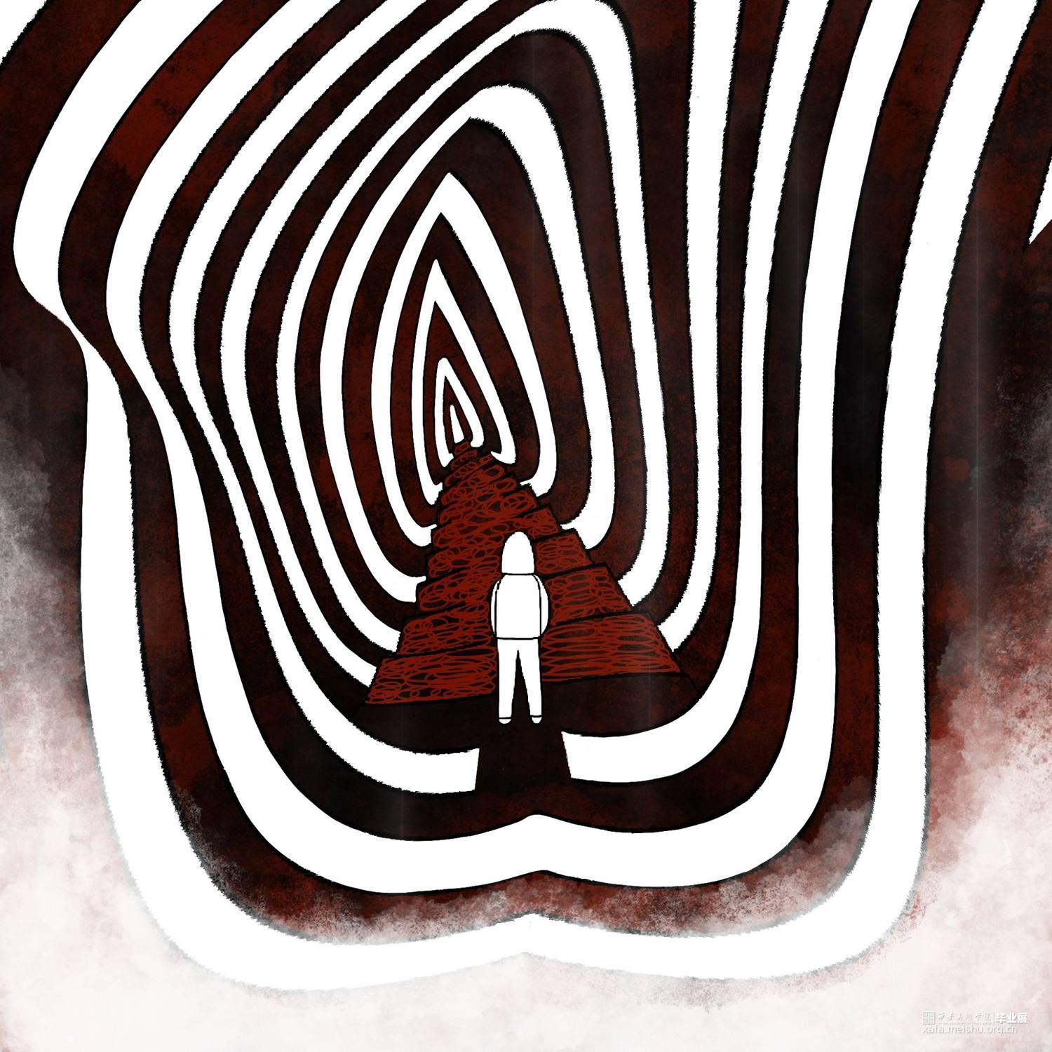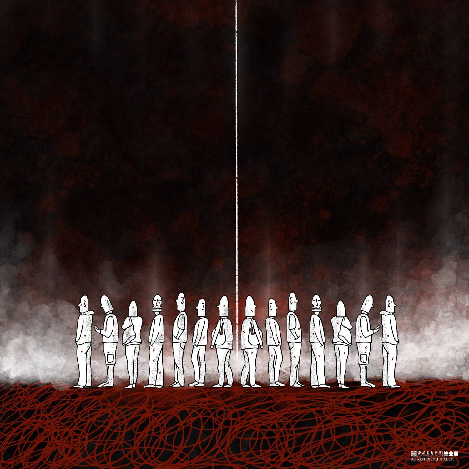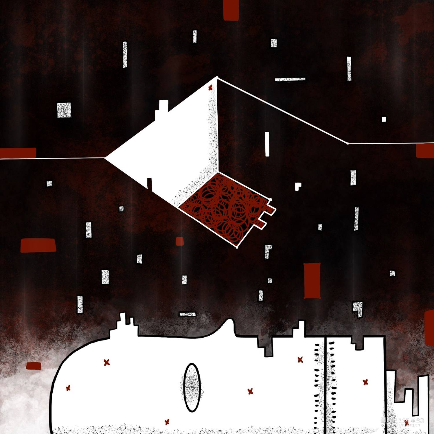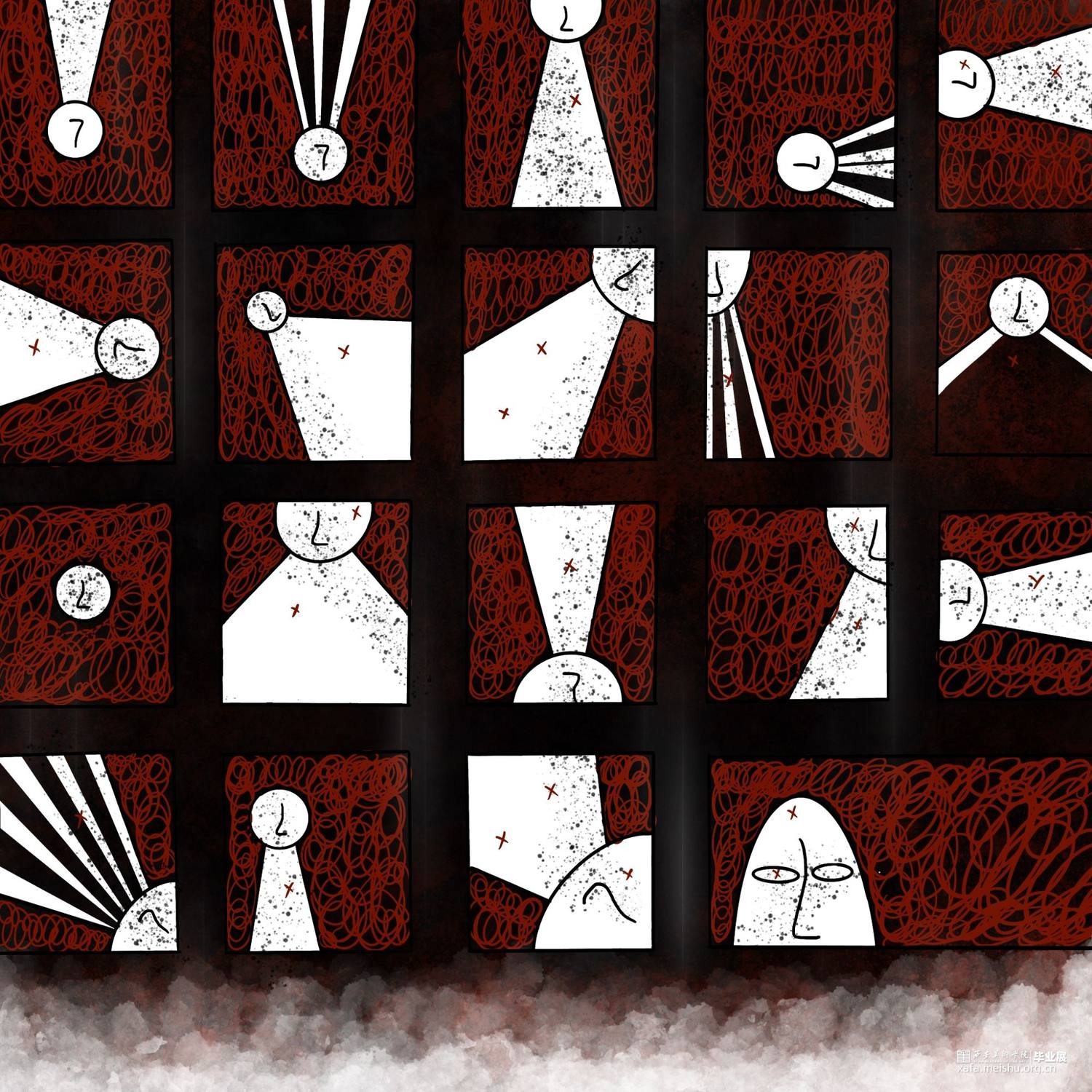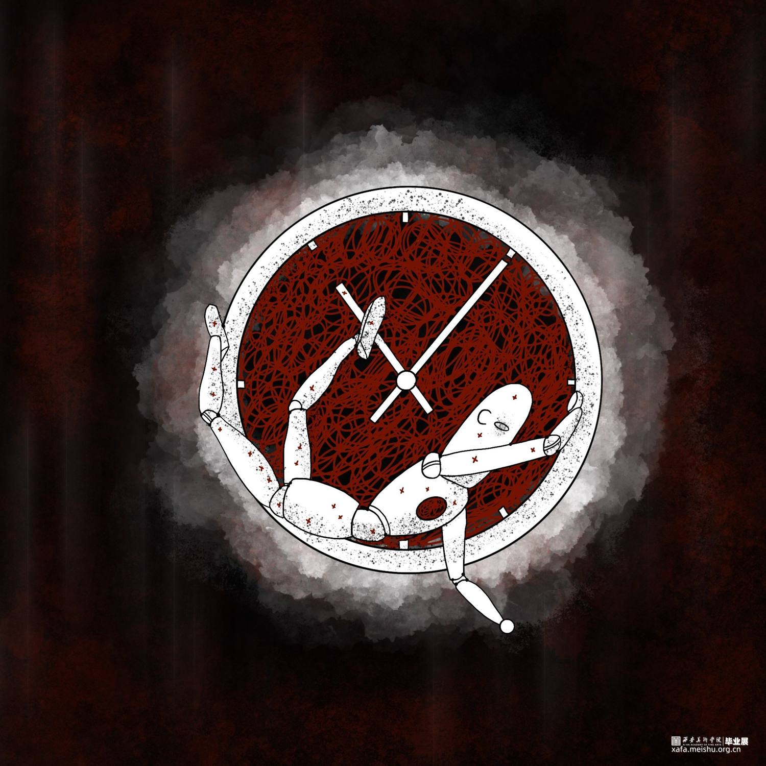 创作中描绘的人物是一个癌症病人,他的名字叫孙义刚,创作以孙义刚在知乎上上传的照片为原型,着重于他面部的塑造,脸型“上圆下方”,通过表现他化疗掉头发,呈现的光头形象来体现“上圆”,表现他作为一个退役军人,作为一个男人,面对病魔,积极乐观的热血男儿形象来体现“下方”。眼睛是心灵的窗户——两个空白的椭圆形状,一方面表现面对病魔的无奈和患病时期的一种状态,另一方面通过无神的眼睛让观者更好地进入孙义刚的心,去真正了解他,去解读他。嘴巴以一种缝合的表现形式,暗示孙义刚在患病以来,都是通过网络来完成日常的交流。面部两边的凹陷,表达出孙义刚被病痛折磨着的一个状态。他肺部中间巨大的空洞,在表明他患的是小细胞肺癌的同时,也表达了他的肺部正在一点点的被癌细胞所侵蚀。描绘的孙义刚时而穿着病服,时而全身赤裸,体现出他作为一个病人的状态。整体描绘的人物形象不是很消瘦,而是一种正常成年人的状态,这是因为在孙义刚的叙述中,他在患病期间并没有掉太多的体重,依然还是保持着一个相对健康的体重。主体人物形象设计,体现出一个患病状态下内心刚强乐观,虽然只能无奈面对现实,却又被无数网友温暖着的病人形象。整个画面的色调以黑红为主,背景的处理是黑底中透露着血腥的红色,营造出一种患病时期周边环境压抑的氛围感,而在这背景的基础上又有一束亮光,一方面象征知乎网友带来的温暖与光明,另一方面也象征着孙义刚内心的精神寄托。我,一个癌症病人系列插画记录了他患病的点点滴滴,希望通过对插画的创作表达,引发观者的思考。