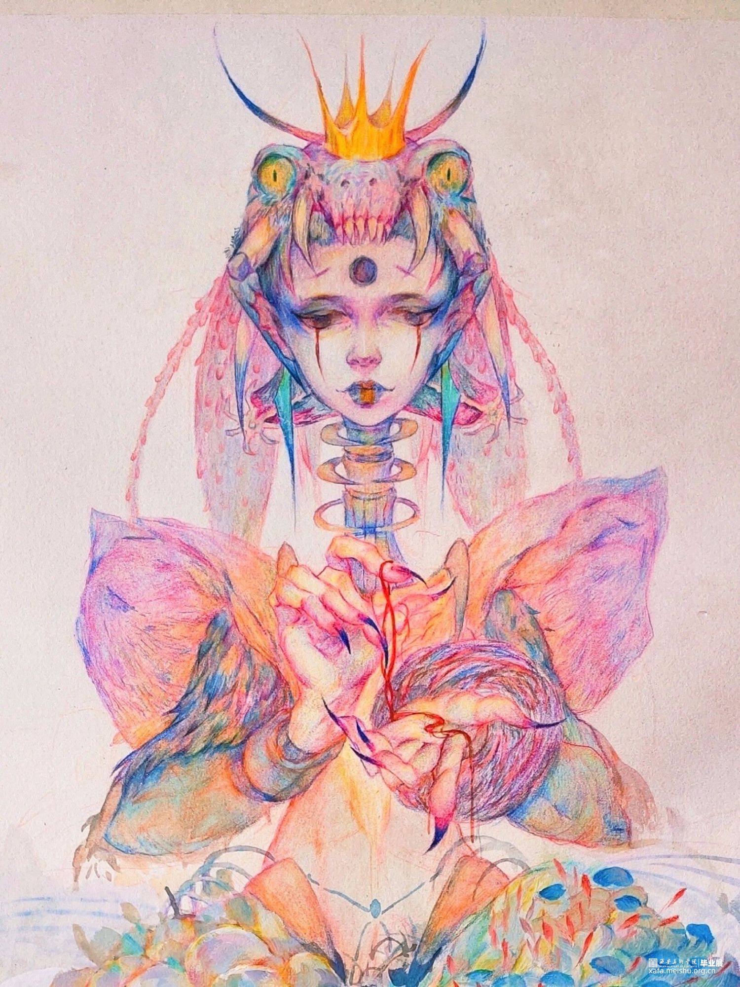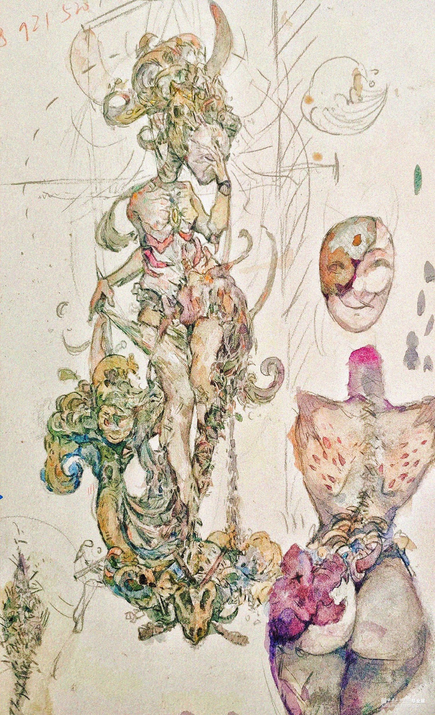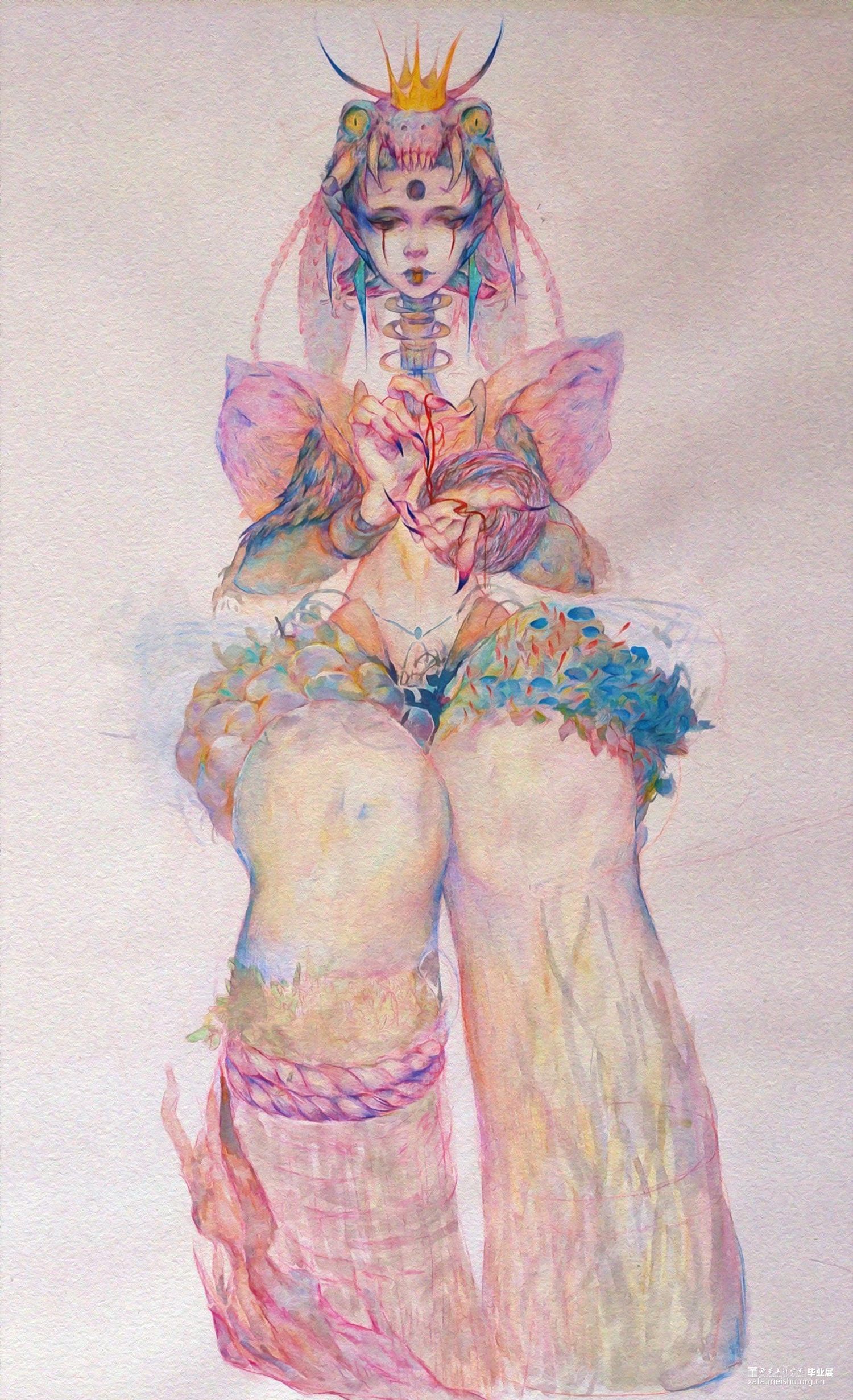 作品本身除了对一些生活材料的运用外,也在作品之中加入一些奇幻元素和一些动植物元素等。运用这些元素最根本的原因在于人们往往会将自己的精神寄托带入到这些动植物或者手工编织当中,以此来身体和精神上的的满足。在画面之中,不难看到这些奇思妙想和一些动植物元素的加入,加上自身对人物的一个变形的过程,其本身不仅仅满足了自己在精神感情上的抒发,也满足了不同时期个人情感的变化。