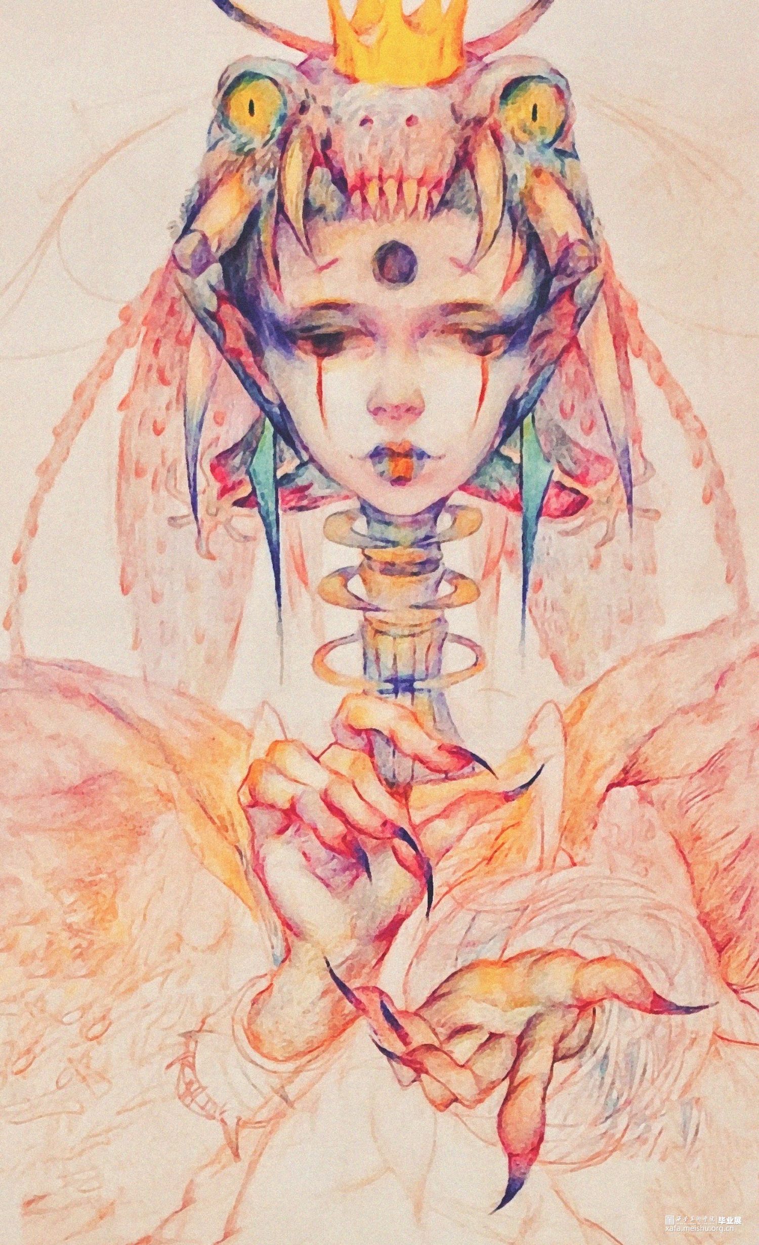 作品之中最显而易见的就是对人物不同特征的一些改变,例如,戴着王冠少女手中的红丝线,便是从左手中的杂线团之中抽离出来的,这红线可能寄托了少女对某种物品的思念,而腰间衍生出的新叶和红色的植被,便带出了少女对未来新生的向往。端坐着的人为何脑袋是个缝合的方体?踩在藤蔓头骨中的少女等不都代表了我们遇到的不同的境遇和困境?也是这些畸形奇异的个体组成了不同境遇中的我们。
