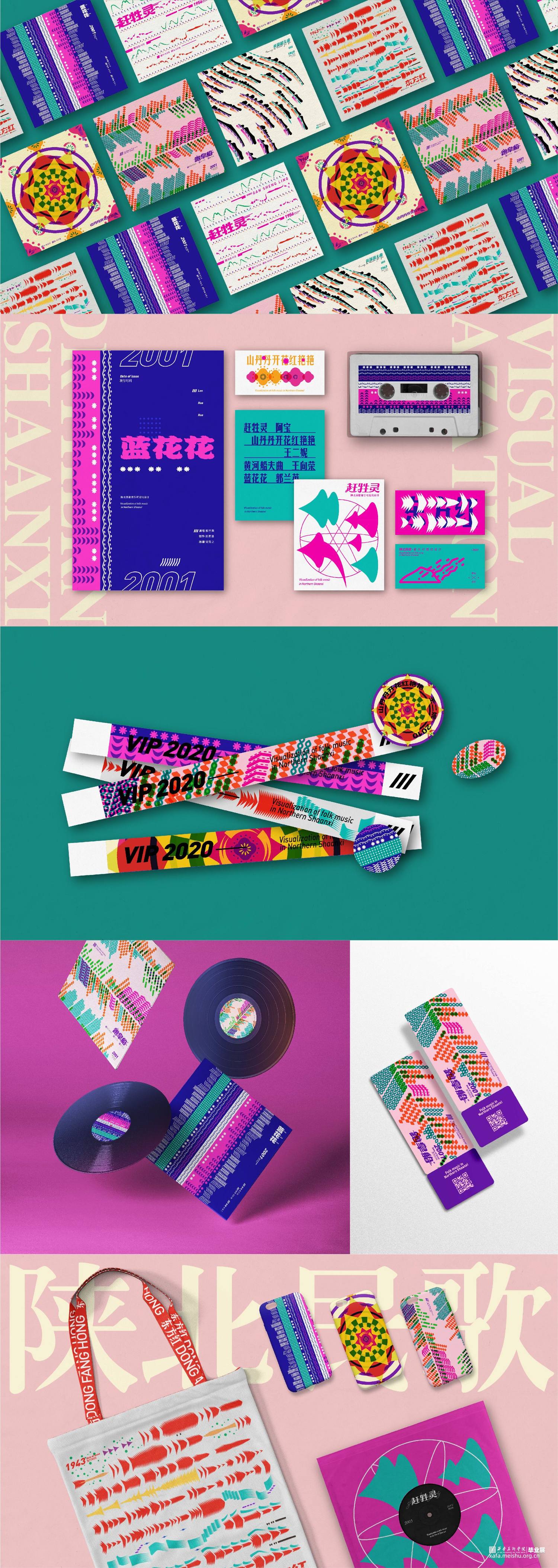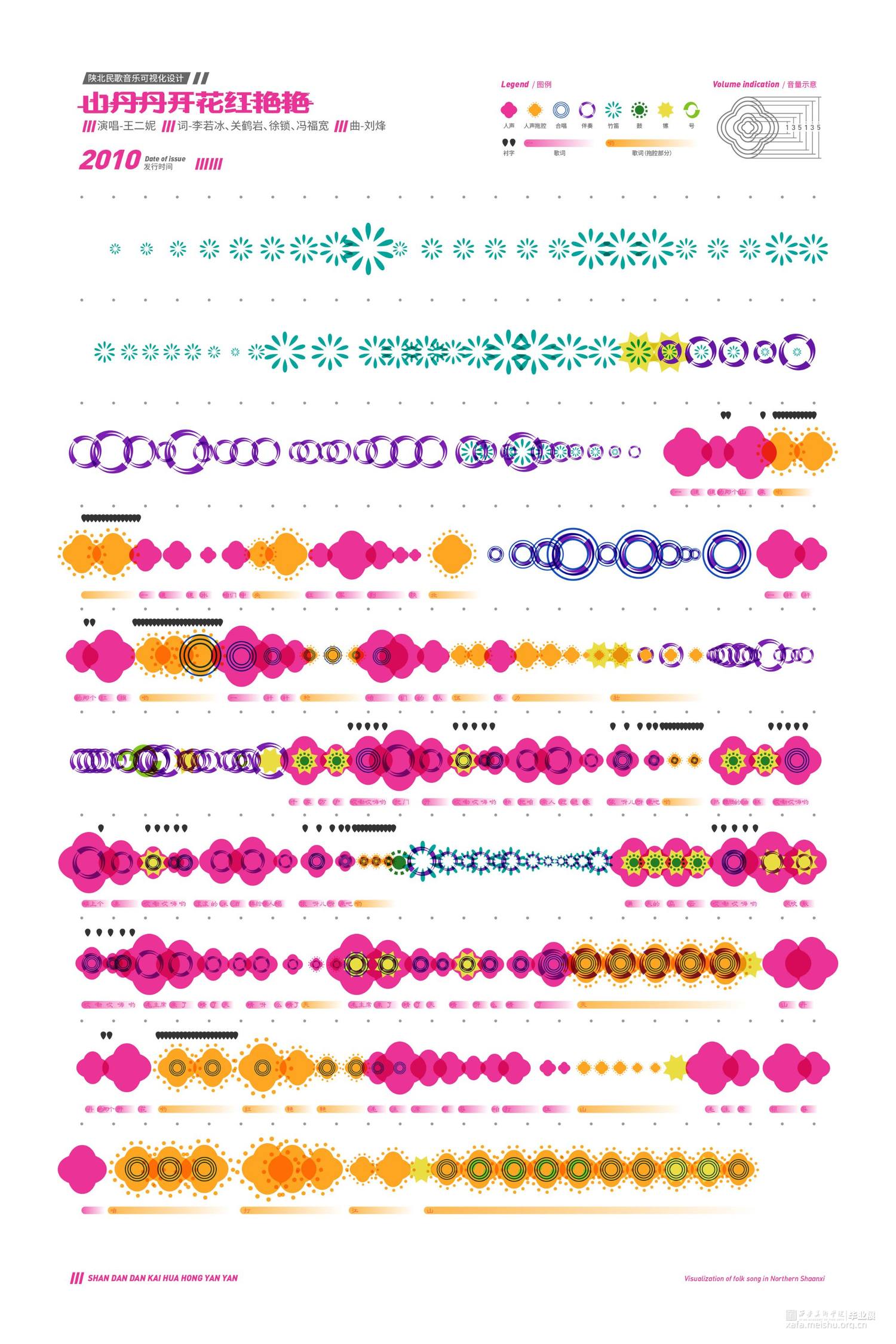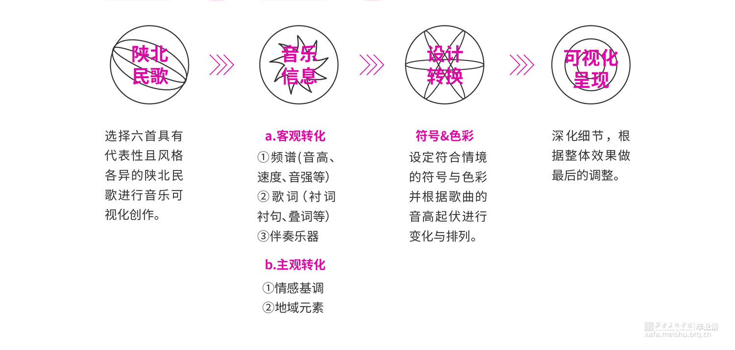 选择六首具有代表性且风格各异的陕北民歌对其进行可视化设计,侧重于基于歌曲本身的转化与图形符号的设计组合,通过设计转换音乐信息的同时兼顾陕北民歌的音乐性和地域特征,力求赋予陕北民歌视觉意义上新的形象,使观者对陕北民歌有耳目一新的视觉体验,从多角度多层面展现陕北民歌原生态的音乐形象。
