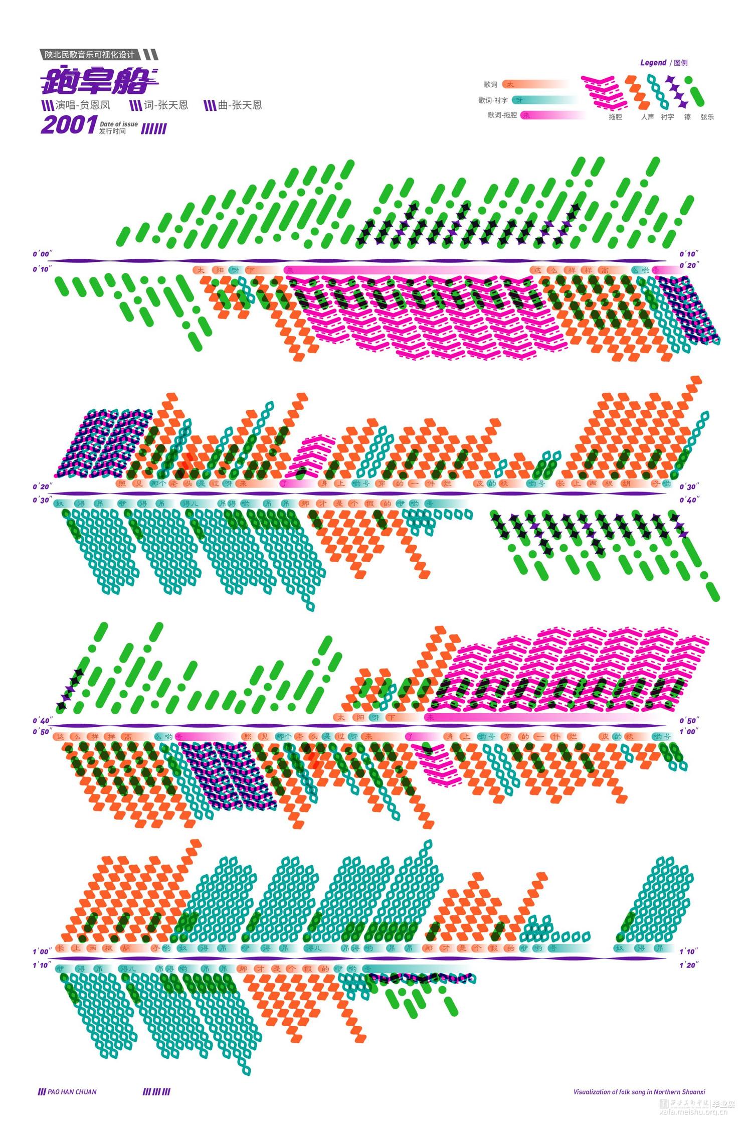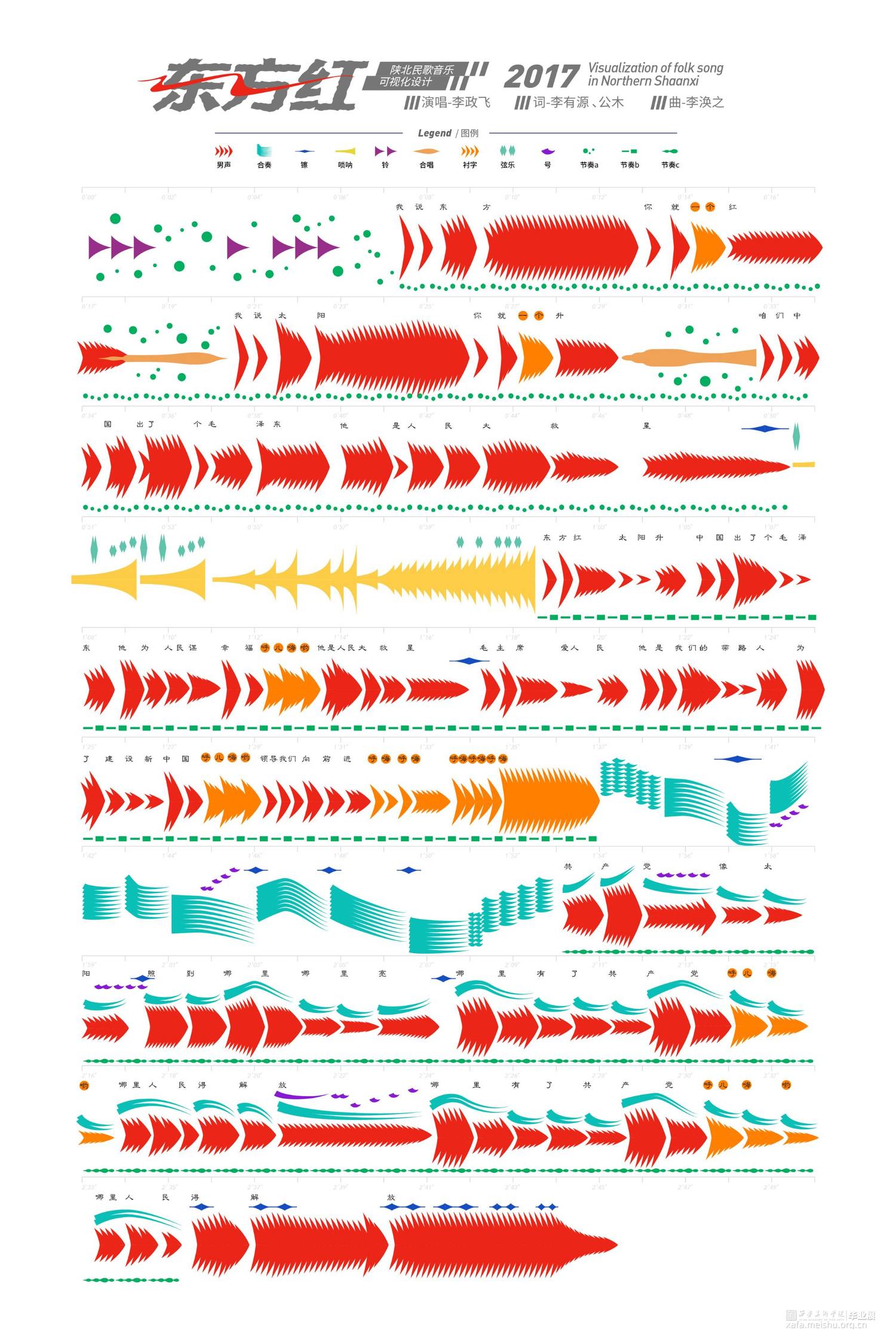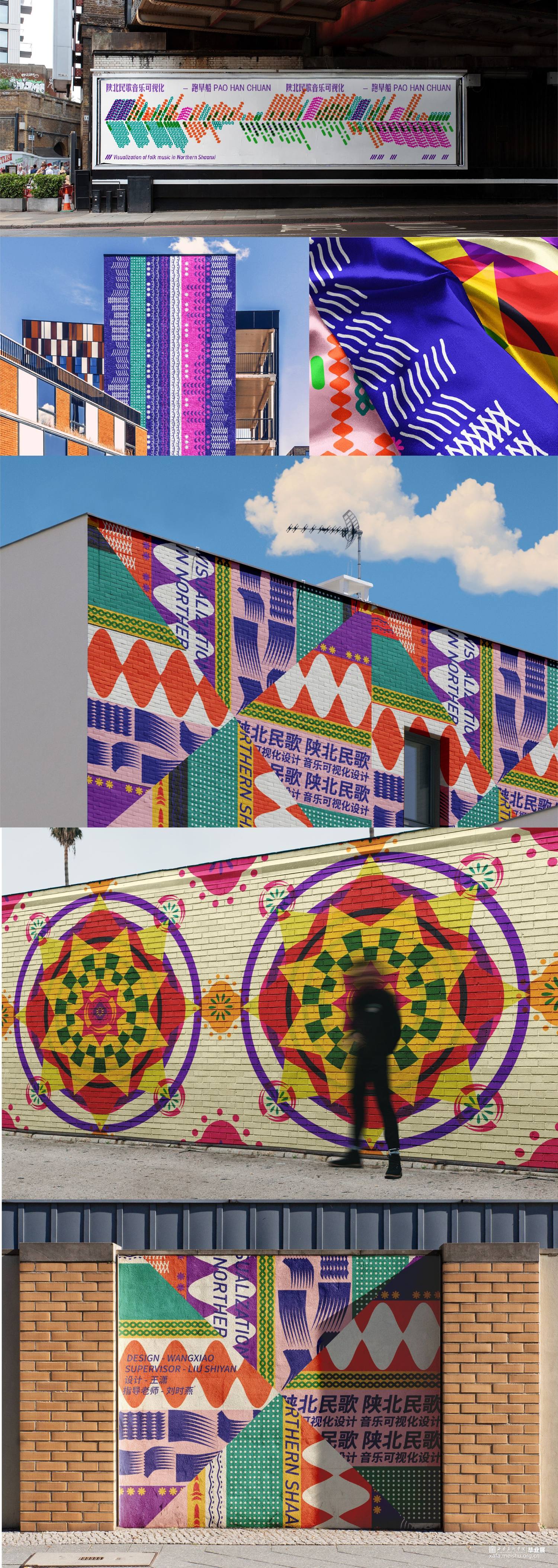 选择六首具有代表性且风格各异的陕北民歌对其进行可视化设计,侧重于基于歌曲本身的转化与图形符号的设计组合,通过设计转换音乐信息的同时兼顾陕北民歌的音乐性和地域特征,力求赋予陕北民歌视觉意义上新的形象,使观者对陕北民歌有耳目一新的视觉体验,从多角度多层面展现陕北民歌原生态的音乐形象。