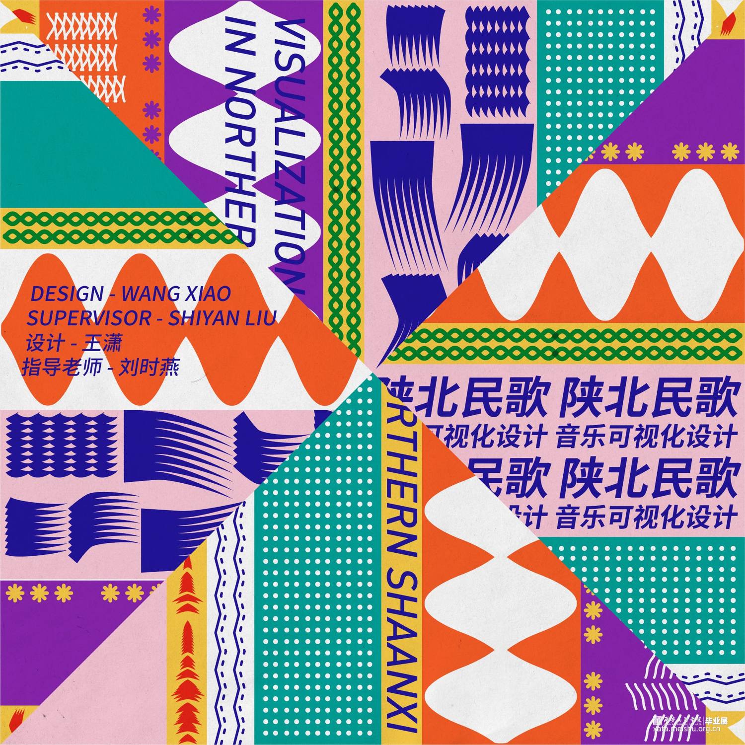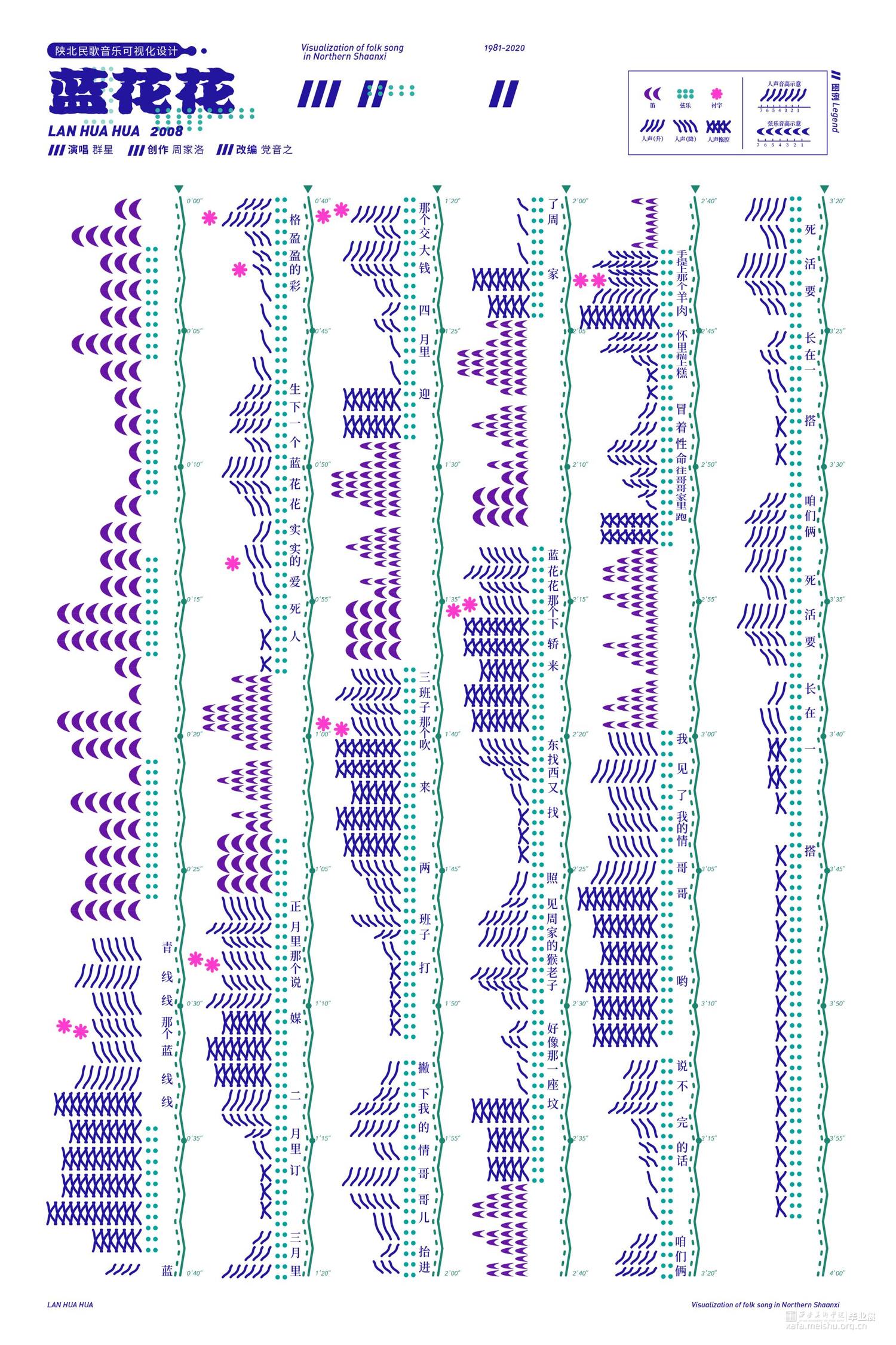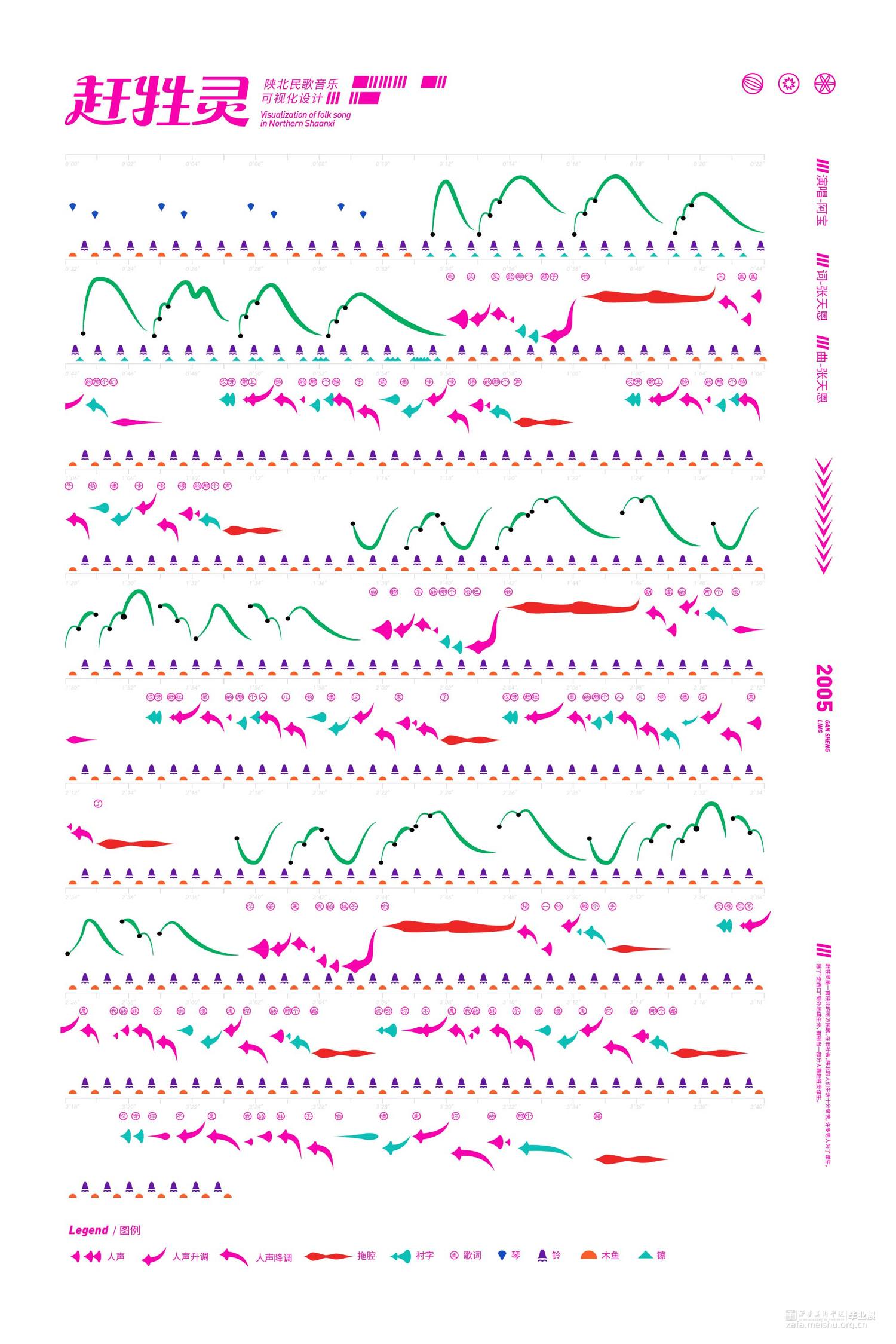 回顾这次实验性的创作,从开始的懵懵懂懂到后来思路逐渐清晰,多角度切入对陕北民歌进行可视化表达,期间尝试了很多方法,也推翻过无数次方案,每次的从头再来都令人感到沮丧,好在最后终于找到了适合的方向,也许在这次创作中重要的是学会如何深入研究自己的选题并内化的能力与过程,结果如何也显得不那么重要了。陕北民歌的文化博大精深源远流长,此次所进行的实验性创作不过是冰山一角,可视化设计方法也必然会有诸多不足,希望此次实践思考能引发更多人对于陕北民歌可视化的关注,从视觉层面认识陕北民歌独特的魅力。