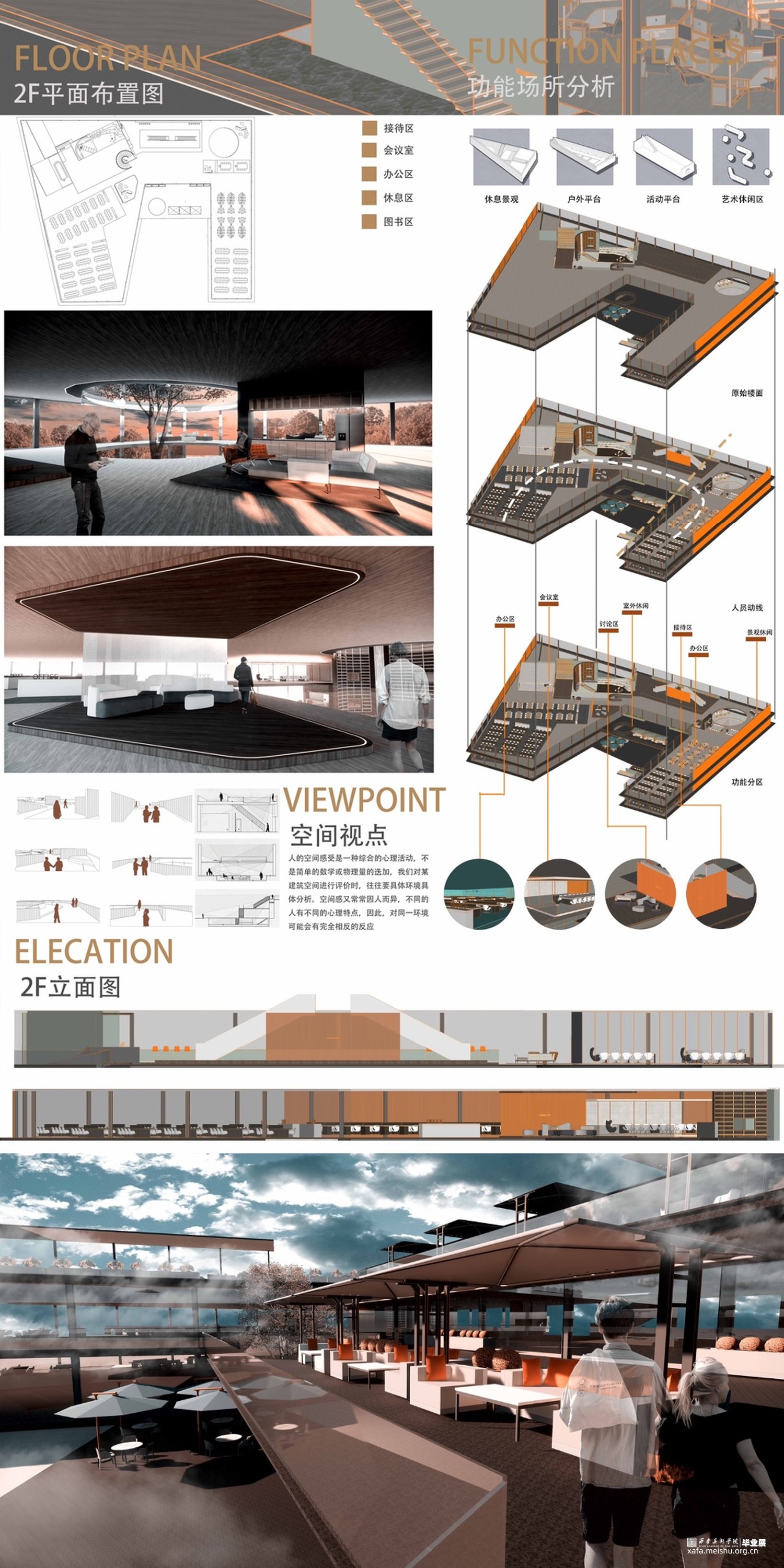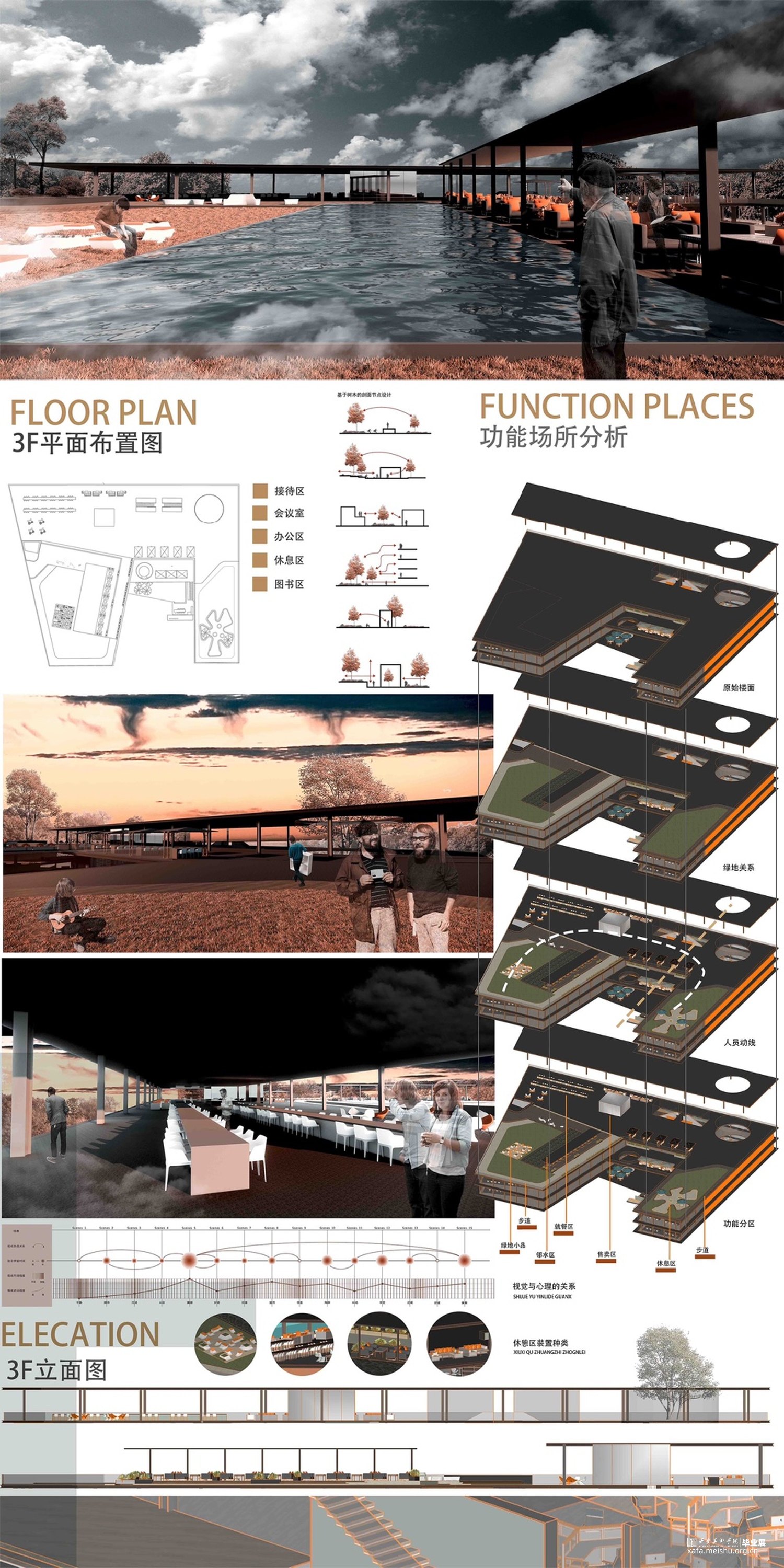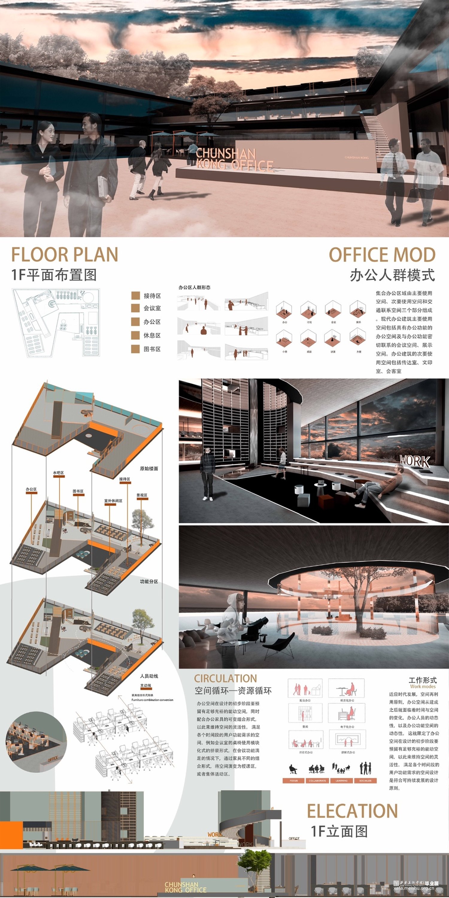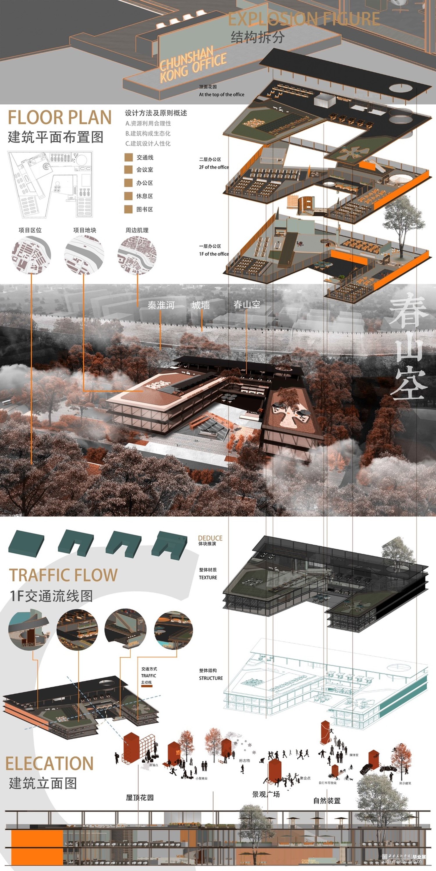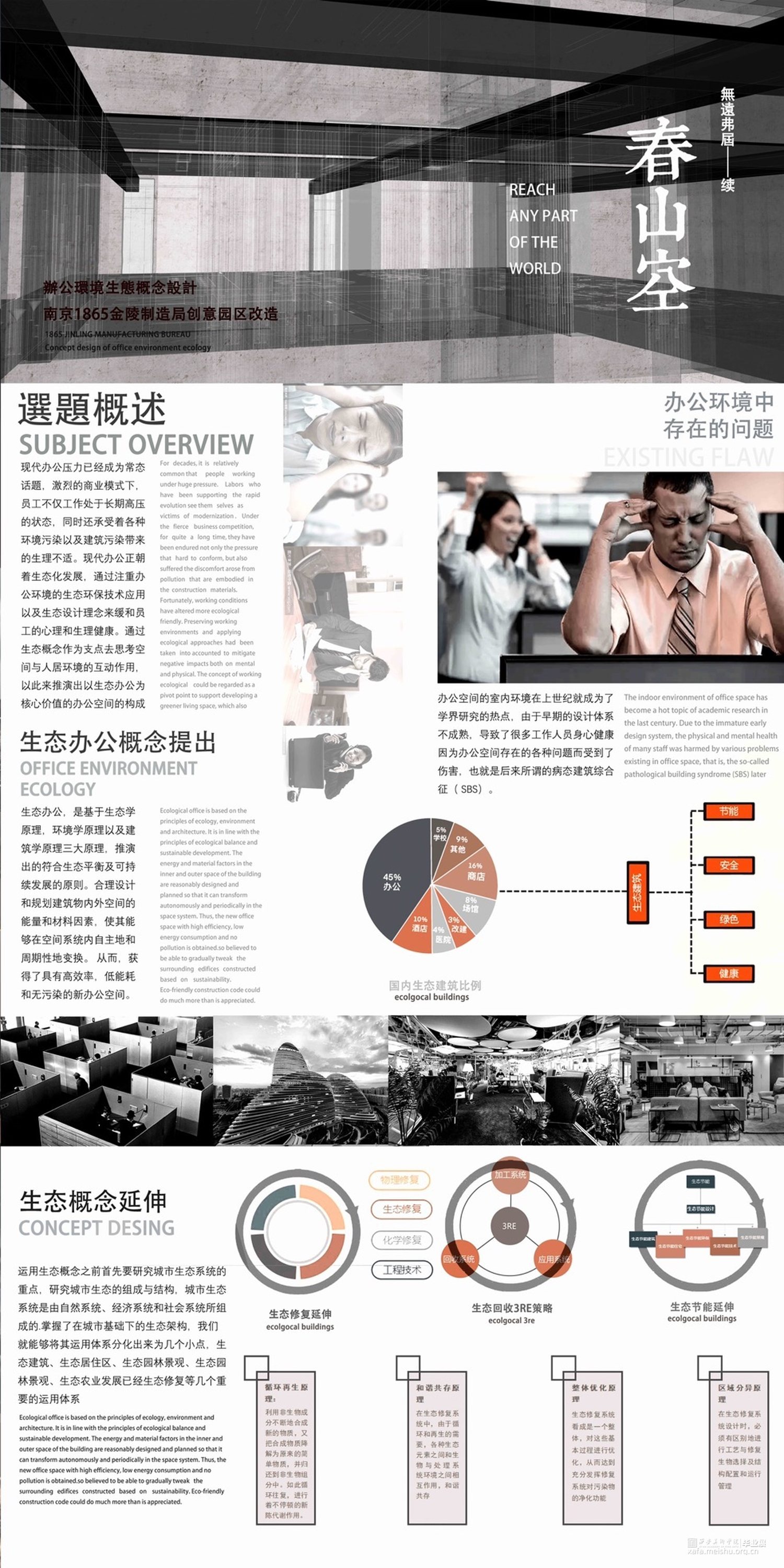 设计方法及原则到具体的生态建筑形态设计以及深入的空间环境设计均紧紧围绕着生态概念展开,将生态节能技术条件的应用贯穿其中,除了基本的设计体系以外,本文的重点及创新点即信息与智能化的设计也会在此章节具体论述。将办公空间通过生态概念作为支点去思考空间与人居环境的互动作用,以此来推演出以生态办公为核心价值的办公空间的构成形式