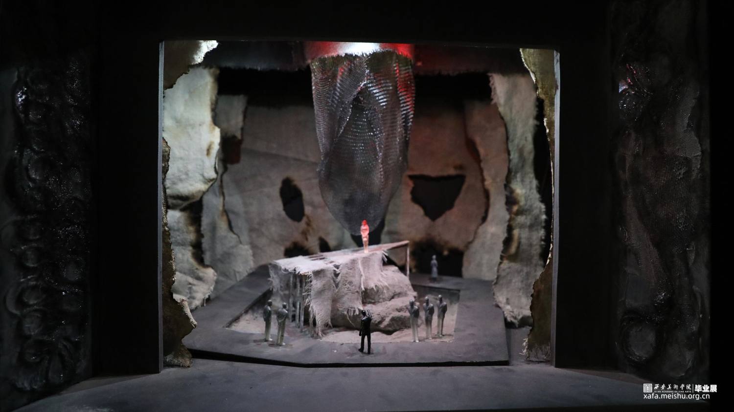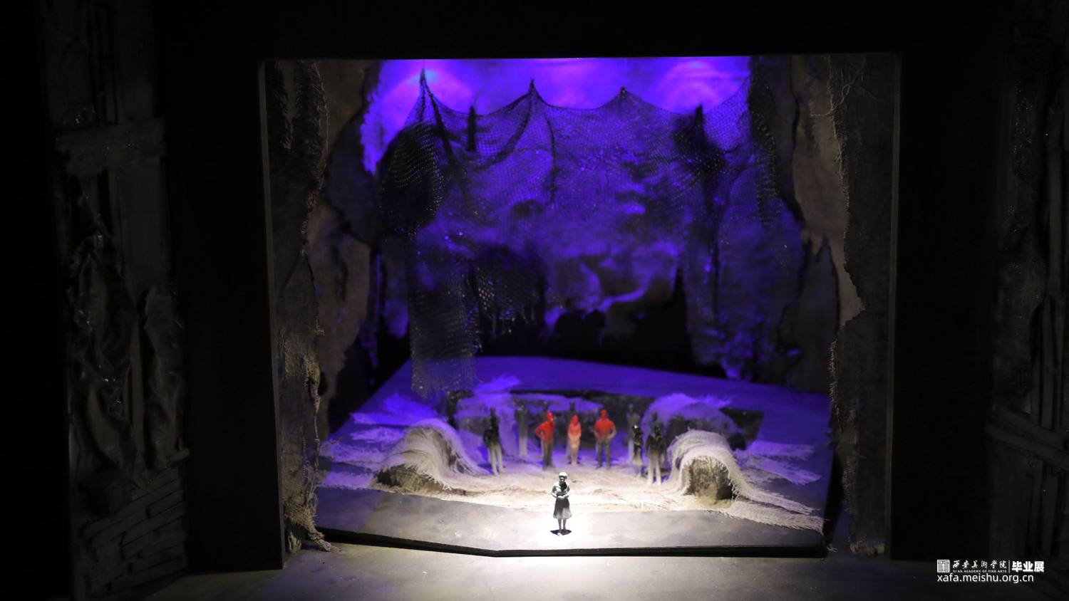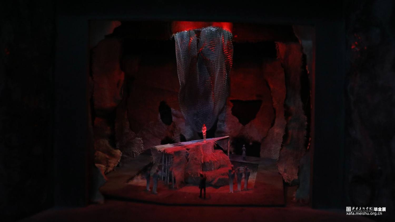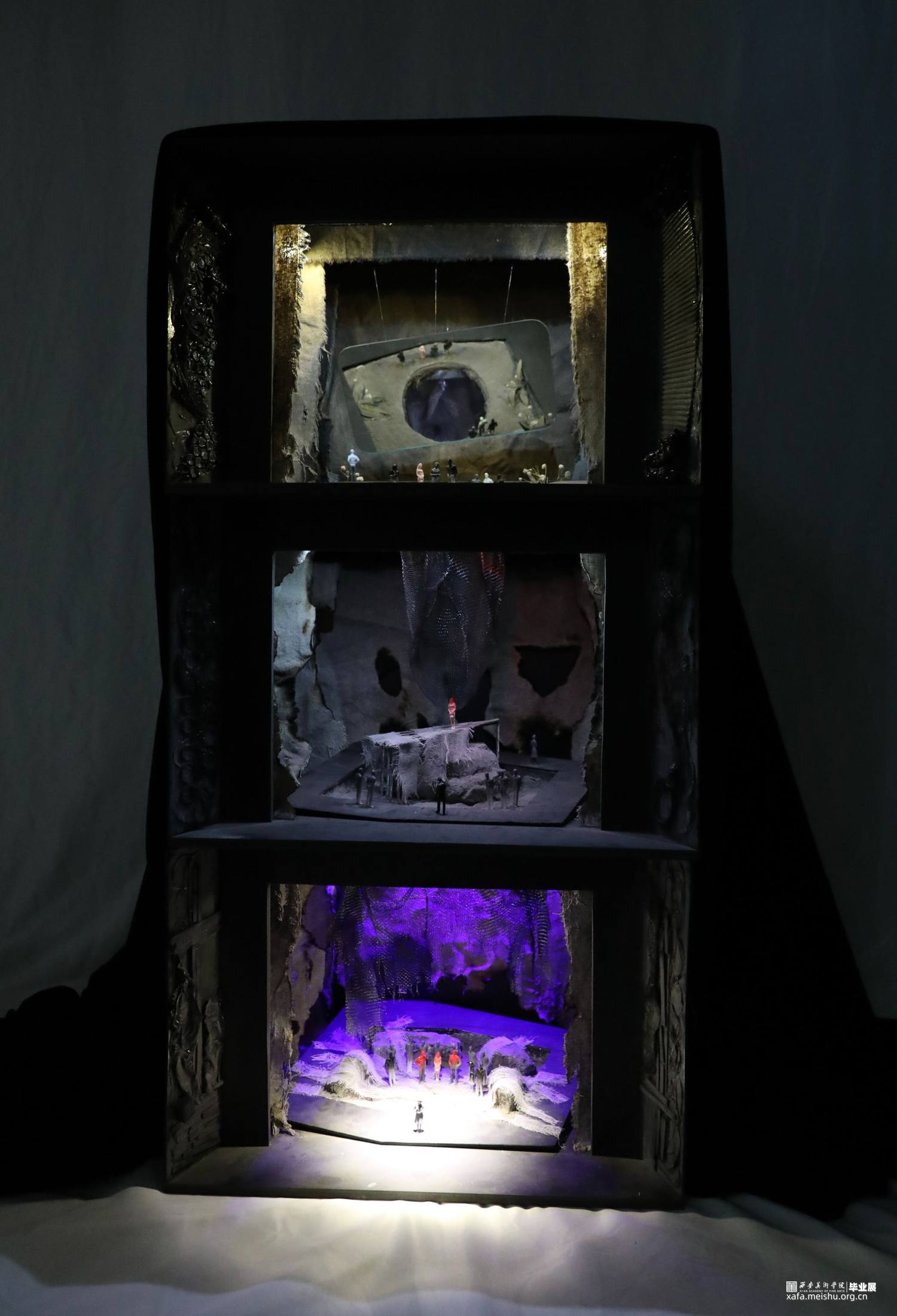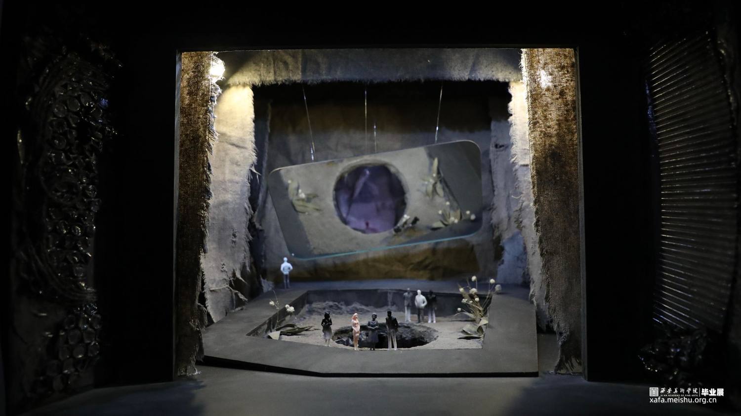 本人对《大胆妈妈和她的孩子们》这一剧本进行了舞台设计以及模型制作,尝试在现实主义舞台上结合非幻觉主义的方法进行设计创作。剧本描写的是一个在战争中拉着篷车随军叫卖的女人,号称“大胆妈妈”,带着一个哑巴女儿和两个儿子,视战争为谋求生路、赚取钱财的工具,把生活的希望完全寄托于战争的她,最终落得家破人亡的故事。首先我选择了镜框式舞台这一形式,在其中,我设计了一个按照1:50的比例抬起4厘米并向右旋转了大约30度的方形框架,框架的两个对角贴合墙壁和地面剪切掉,形成一个镶嵌其中的效果,这就是这个舞台的主体,象征一条没