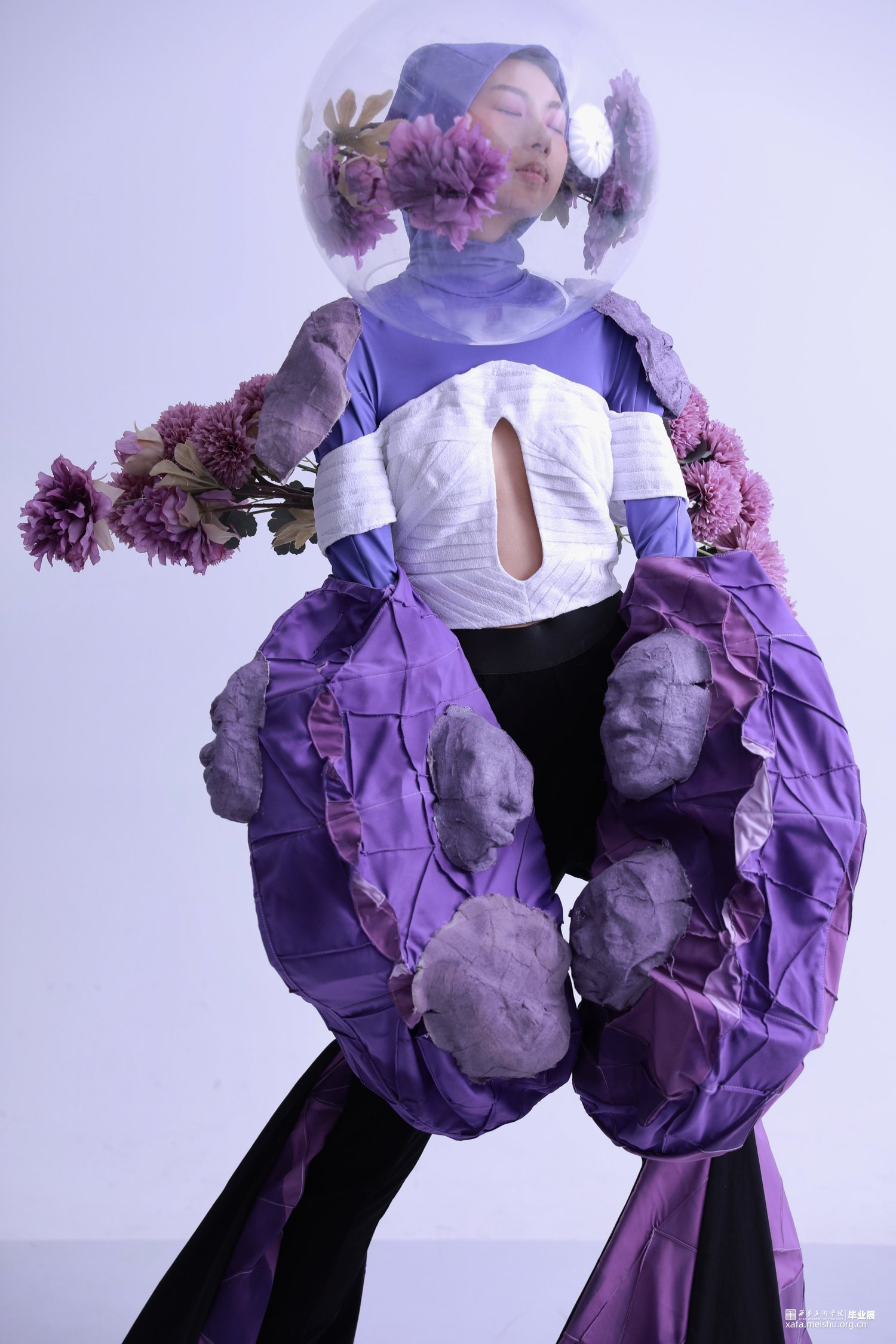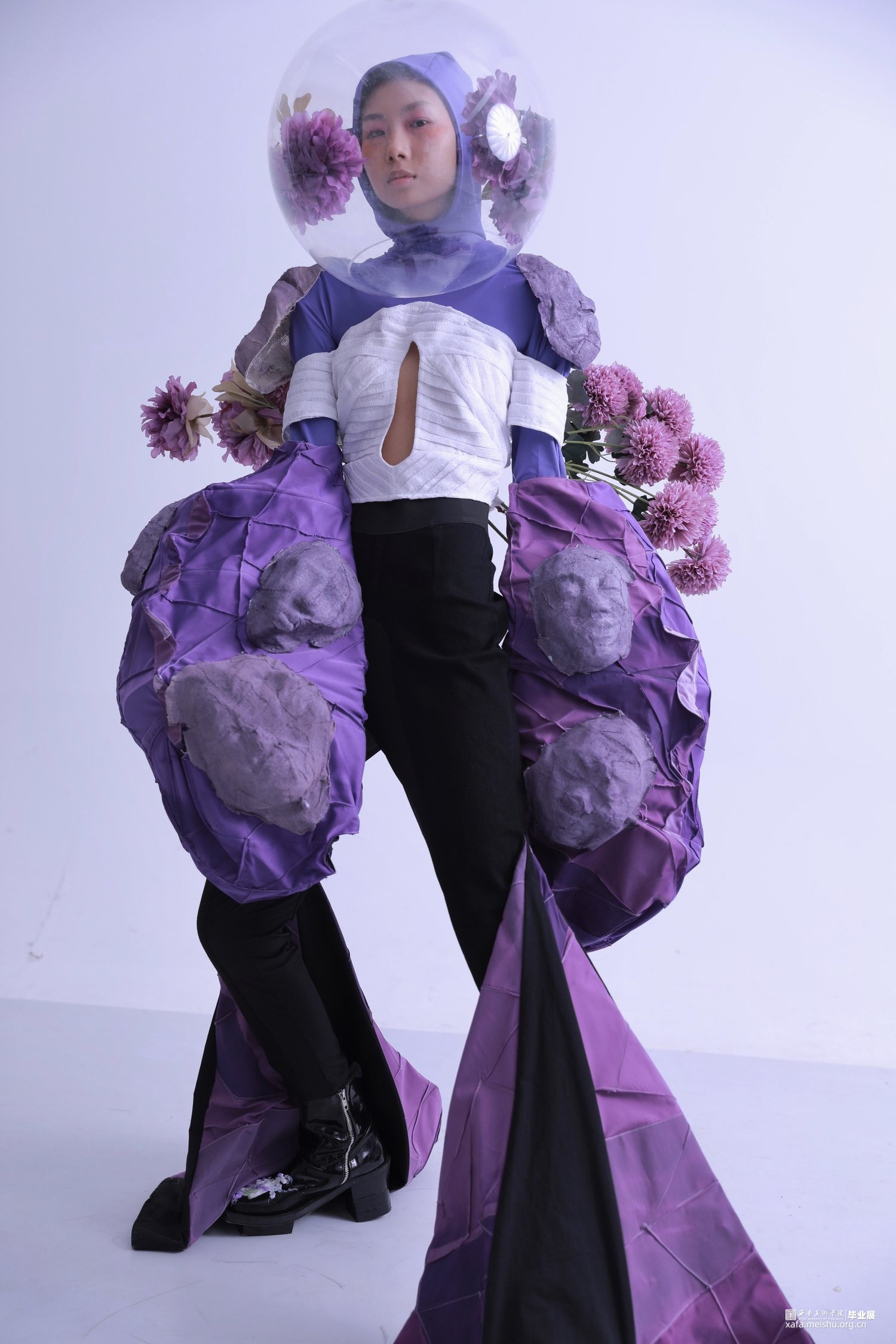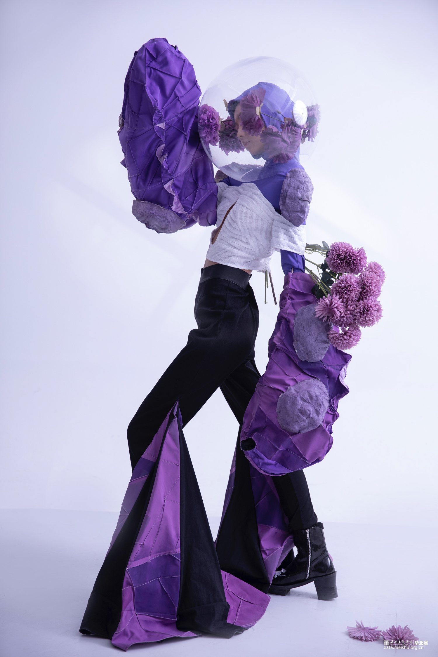 本人的创作灵感是在“唐风”主题中寻找着手点,从唐朝女着男装开始发散,对跨性别以及他(她)们的社会地位展开思考,联想到现在有许多同性恋、跨性别因不被大多数的社会认可,而处于社会舆论压迫下一种痛苦、不快乐的情绪表达;因此,本人用黑紫色的颜色、夸张的廓形和花的语言运用去表达在当下的灰暗心理下,心中所期望的这种梦幻感的虚拟浪漫,将这种情绪表达以及语言总结提炼出本人的毕设主题——“超脱”。