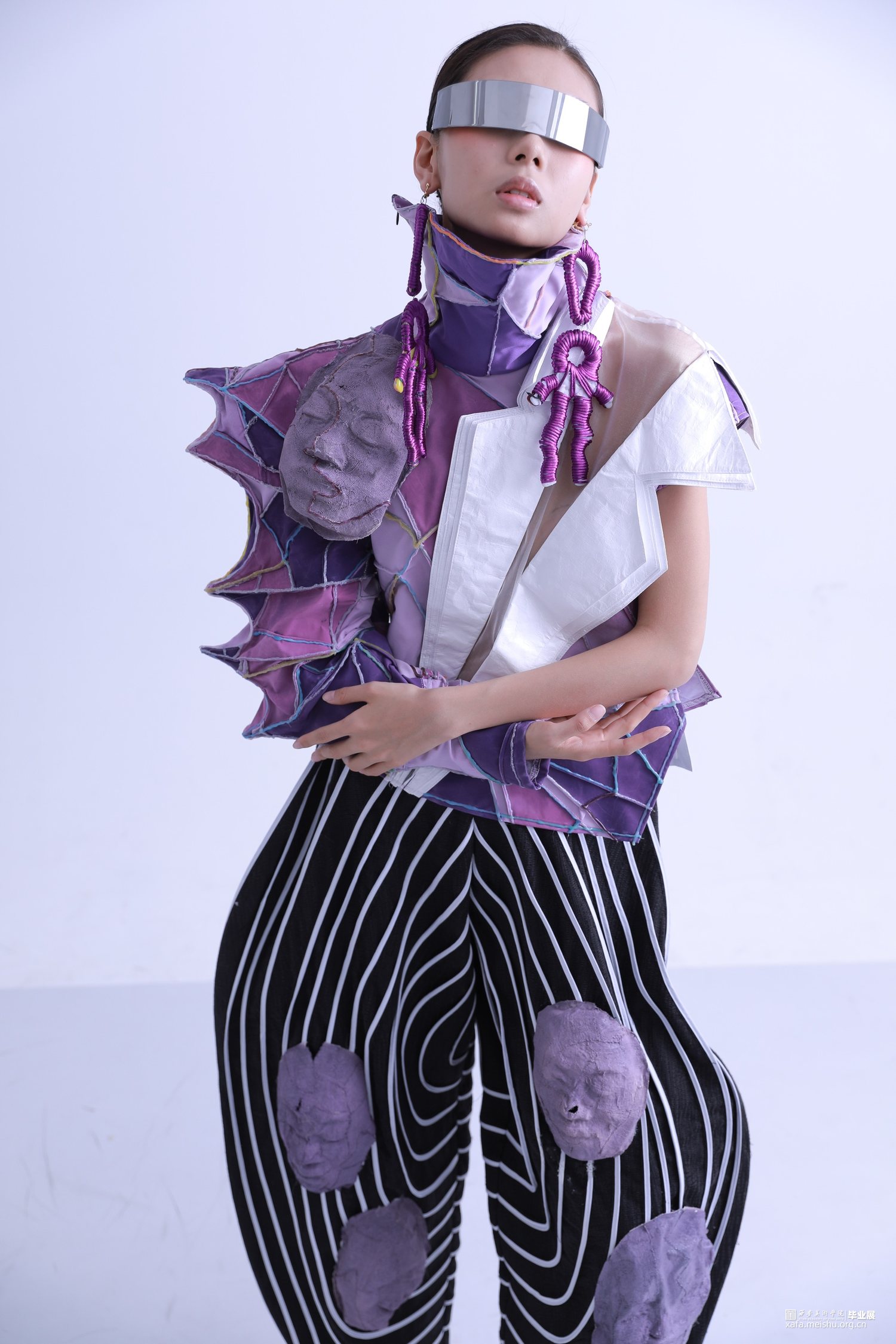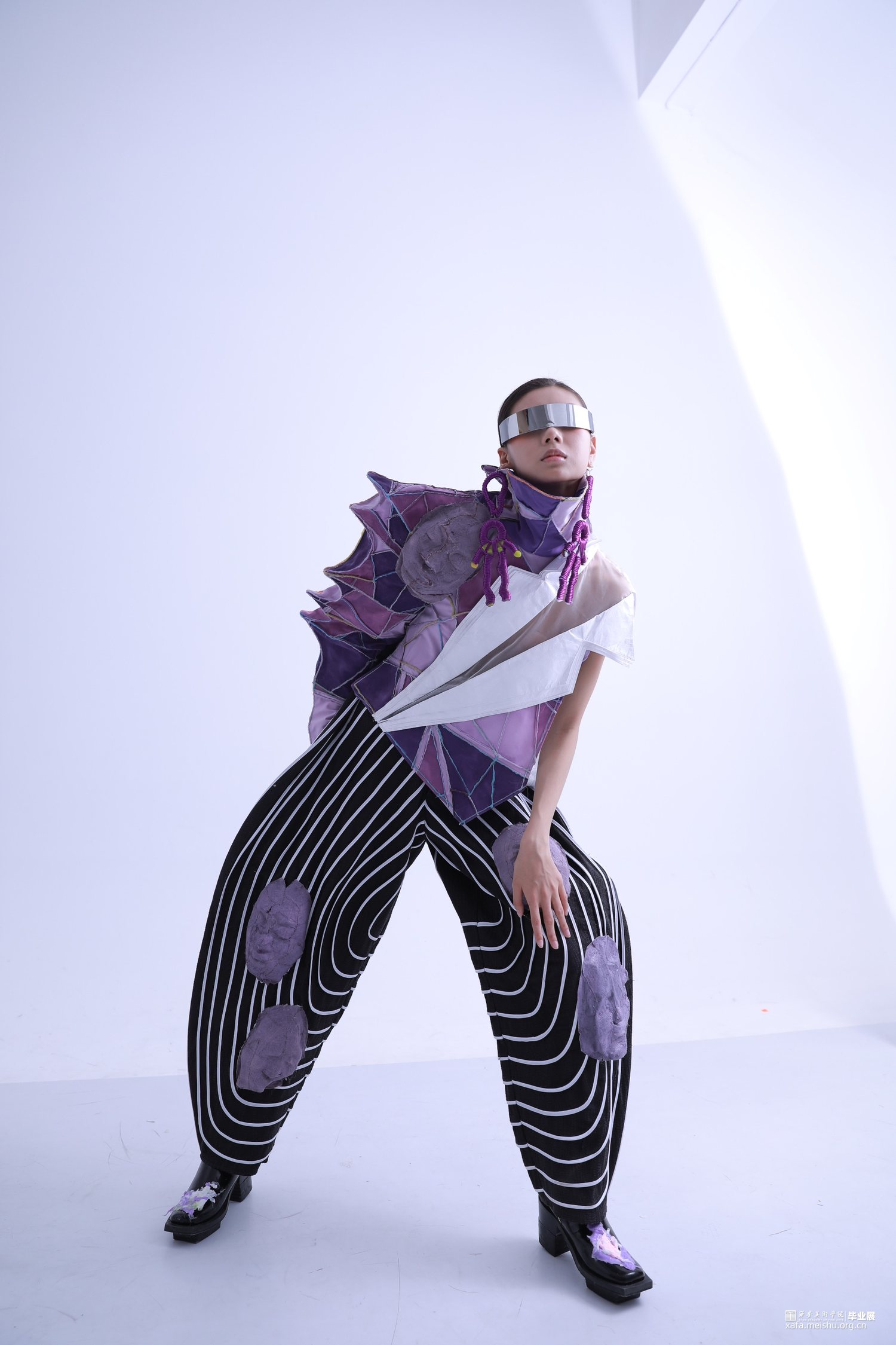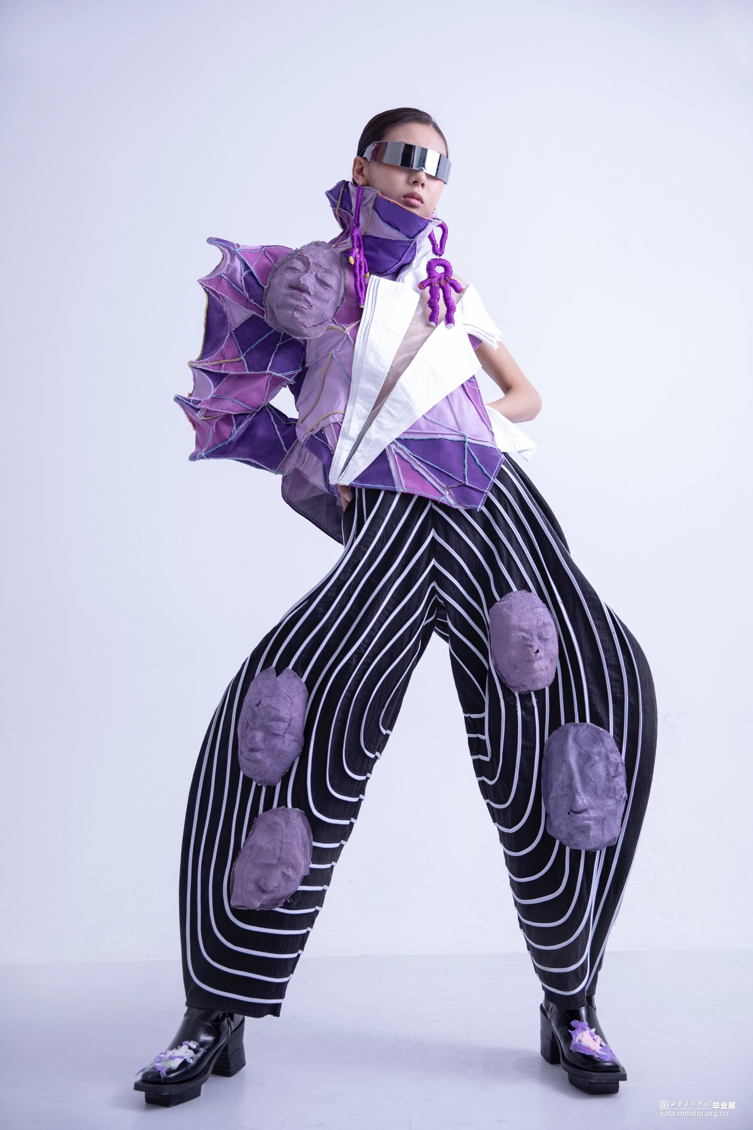 主面料的选择上将3D打印建模的效果通过对面料的拼接、缝合的方式呈现更多服装语言表达,换一种对服装的审美形态,本人选定了三种紫色的梭织面料作为主面料,将布料剪至不规则形状,用机缝的方式做出不平整的一整块面料,用喷漆、丙烯的方法再做层次,使整块面料拼接缝合后呈现出3D打印建模的展现形式,契合创意展示主题,使服装整体几何肌理更加丰富。