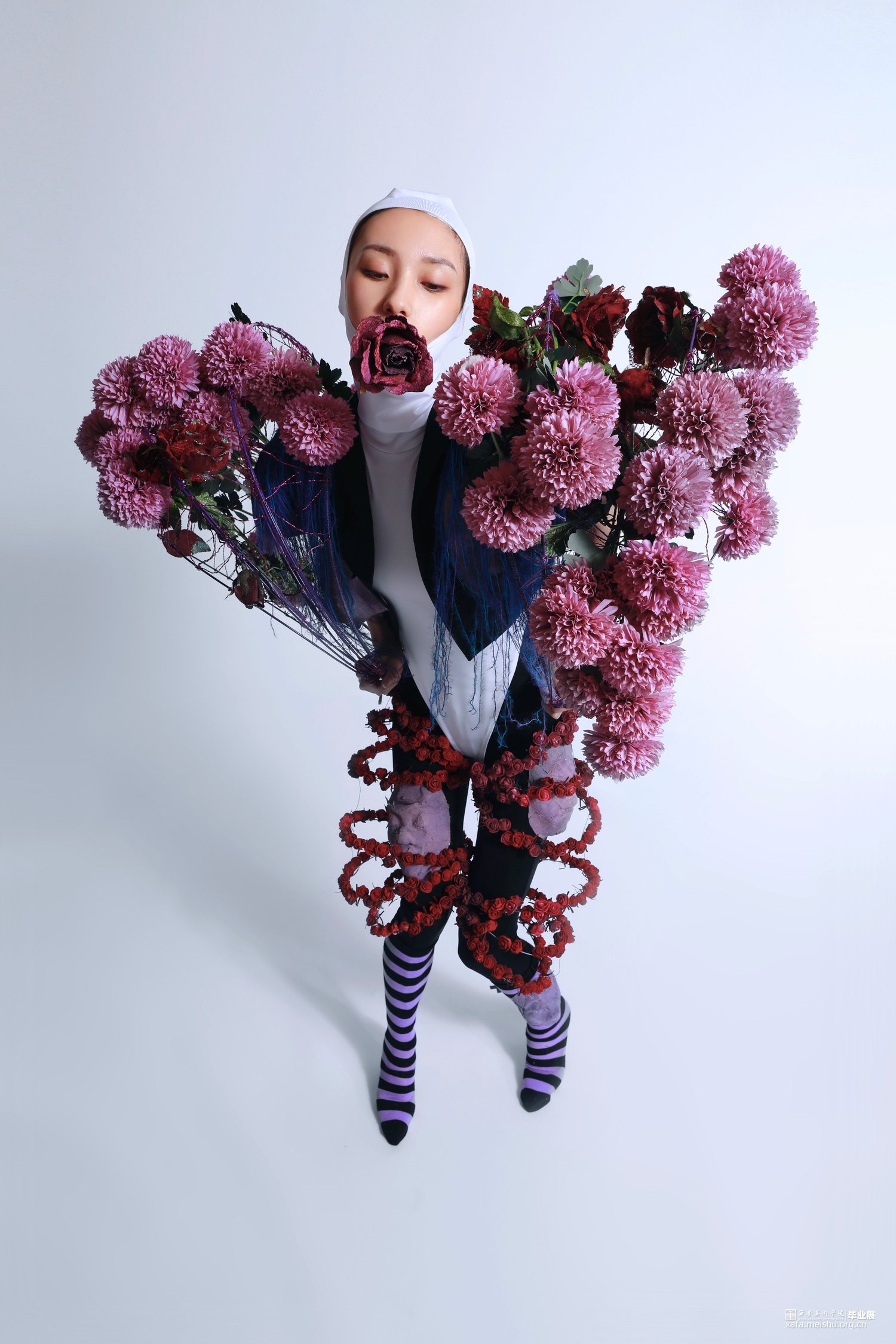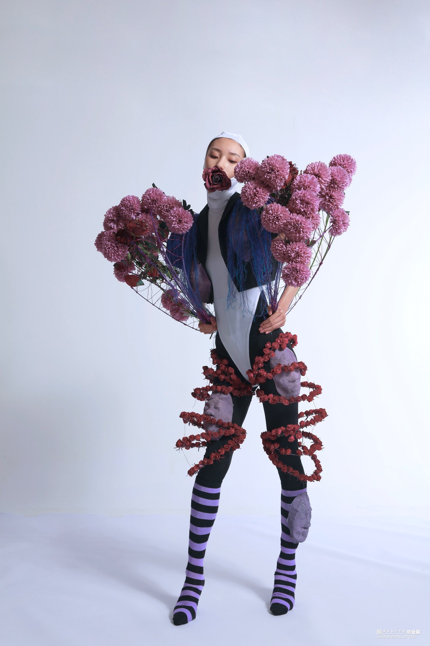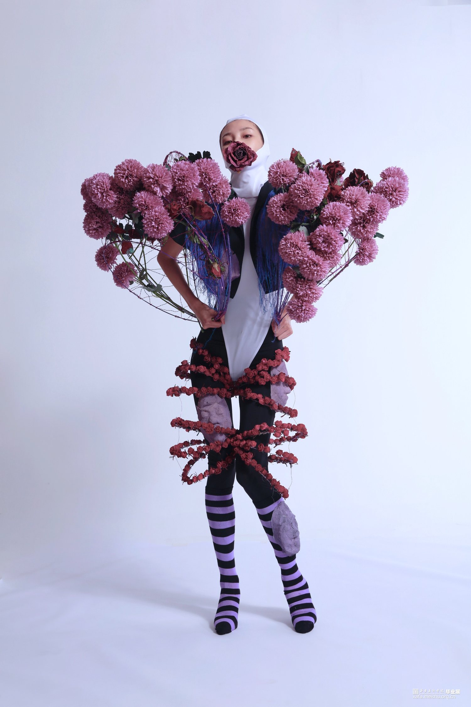 在制作袖子过程中,考虑到想更多抛开传统服装面料的表达,因此我用铁丝制作圈环,用铝丝将铁丝环之间缠绕链接,形成大体面上的“袖子”。更深层意义是想表达人在现当代社会的压力下,就像是在铁笼中生活,规矩就像圆圆圈圈束缚着我们。在铁圈袖子的外观造型下,本人用大量的花来装饰点缀整个袖子,意在表达铁圈束缚下的我们,心中依旧有对浪漫的理解和向往,紧扣主题。