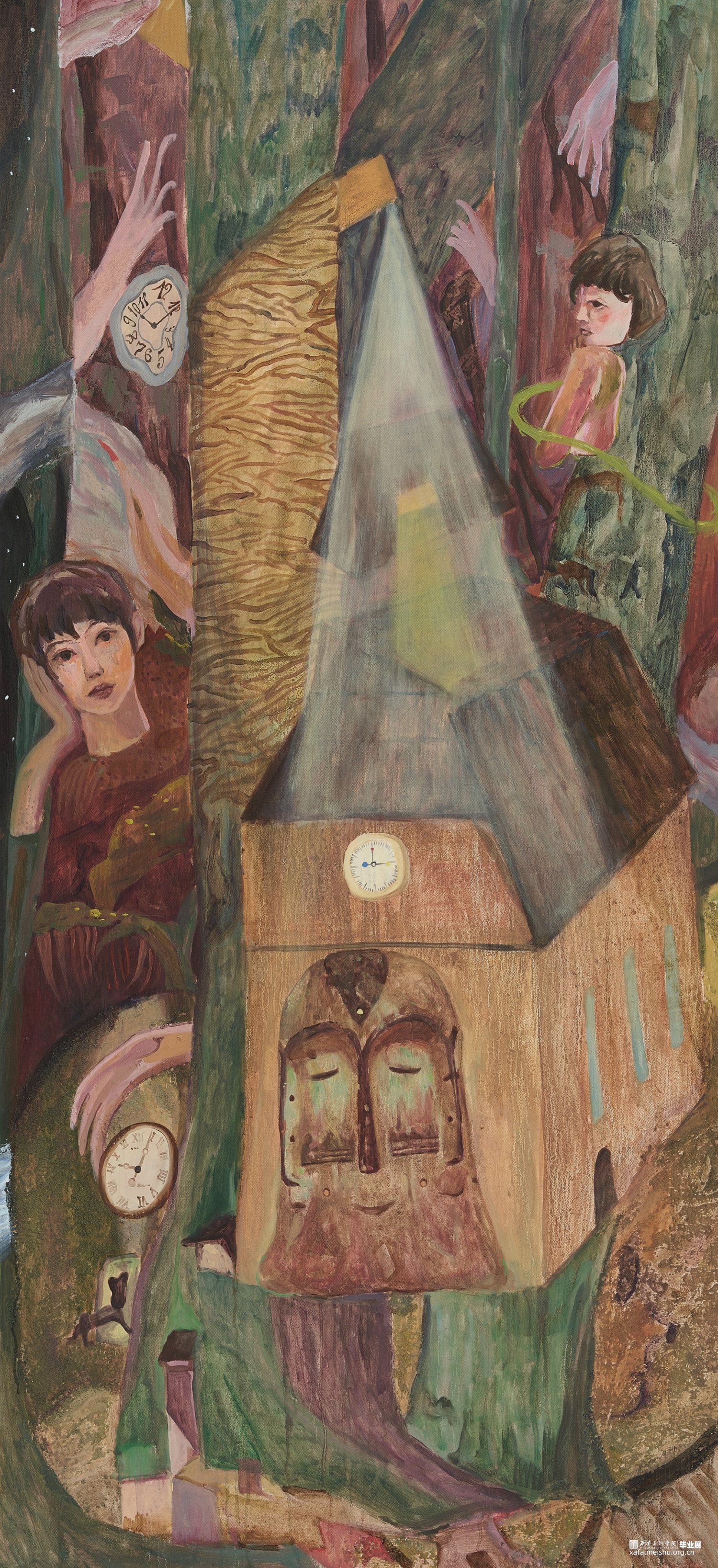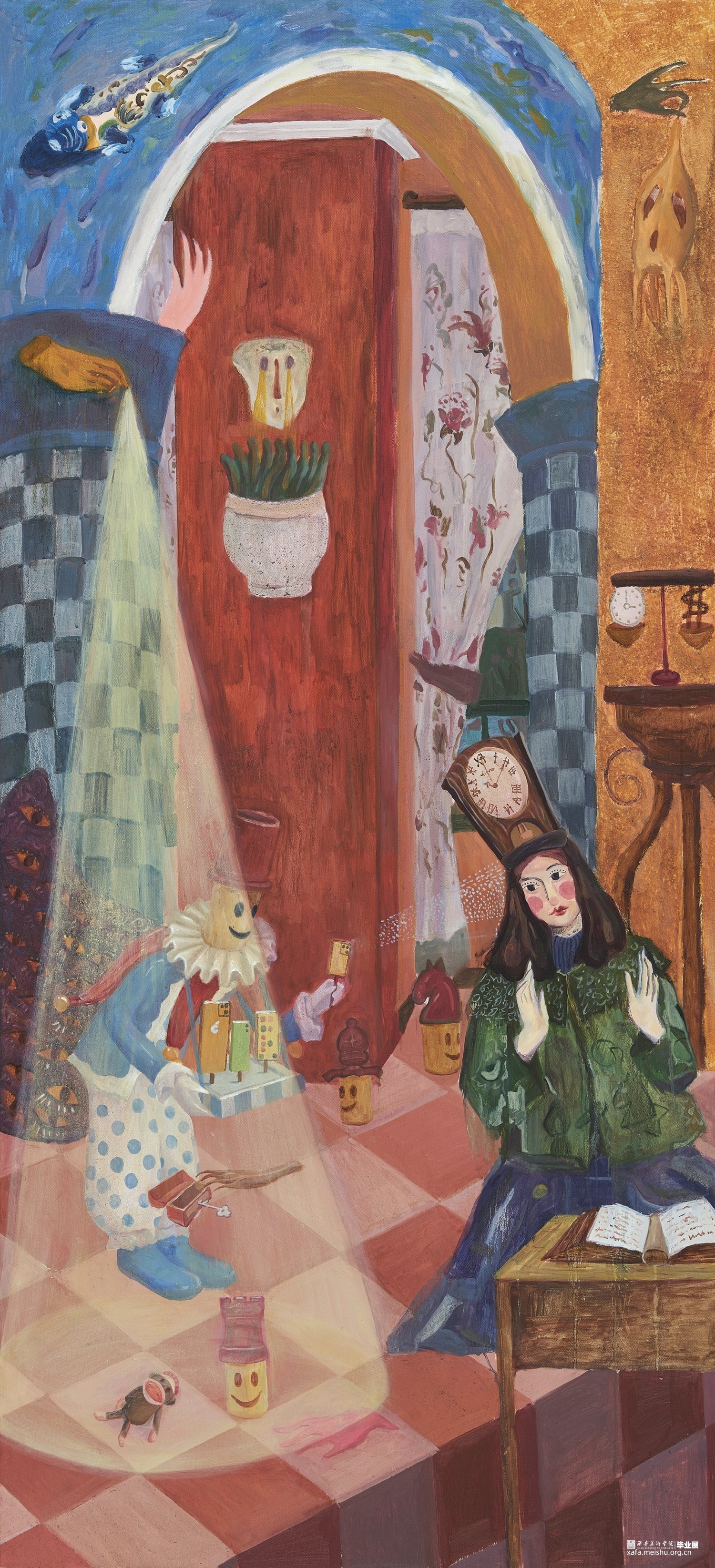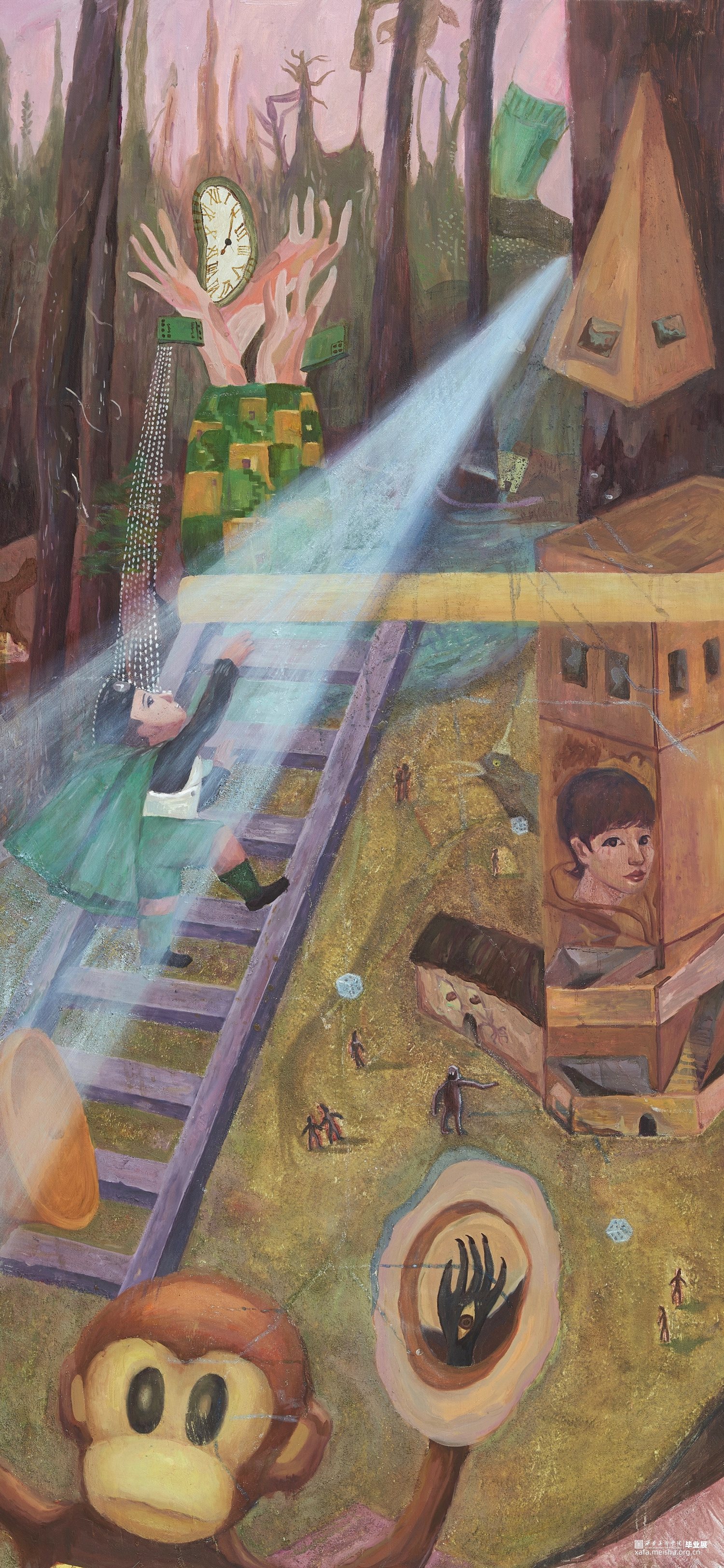 这些虚无混沌,看似毫无逻辑的画面,实际上都是我内心的小小愿望,我的许多在现实中不得满足的梦幻,以及想摆脱的焦虑都通过绘画表现了出来,混乱背后映照着我现实中的迷茫与困惑。它们像是我的梦呓,荒诞中满是真实,混沌中充沛真诚。