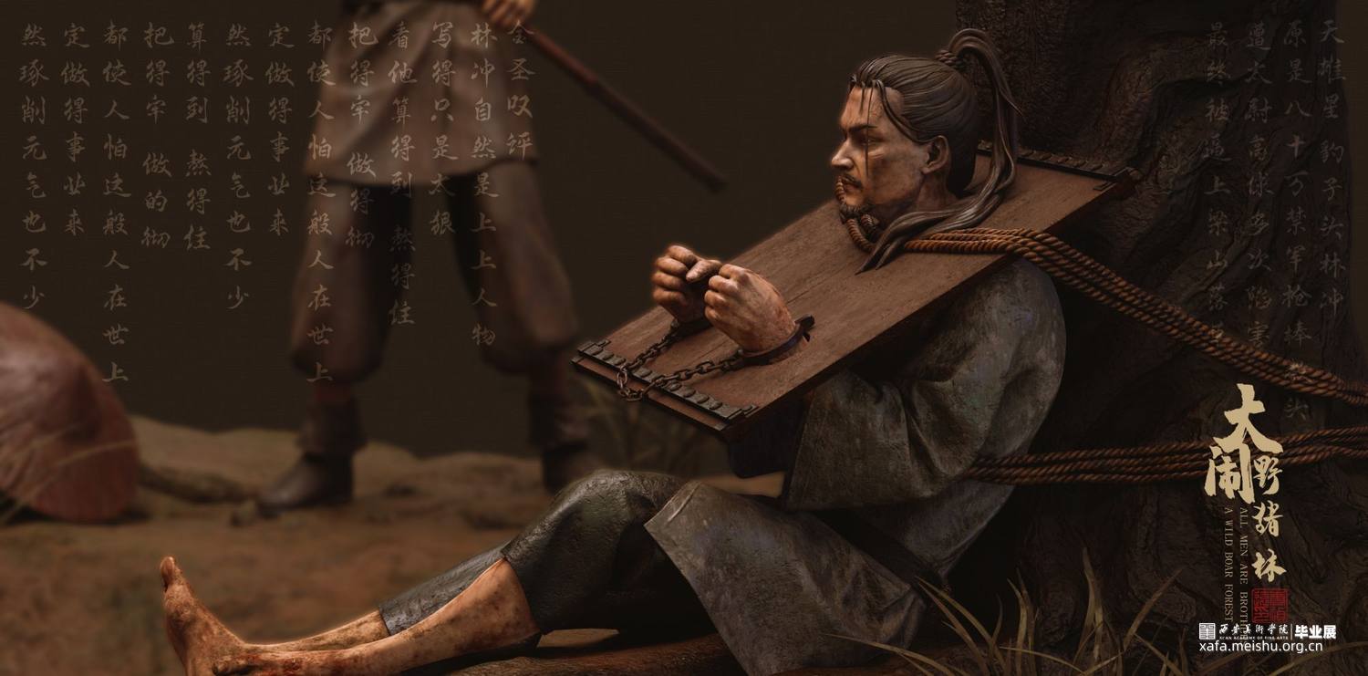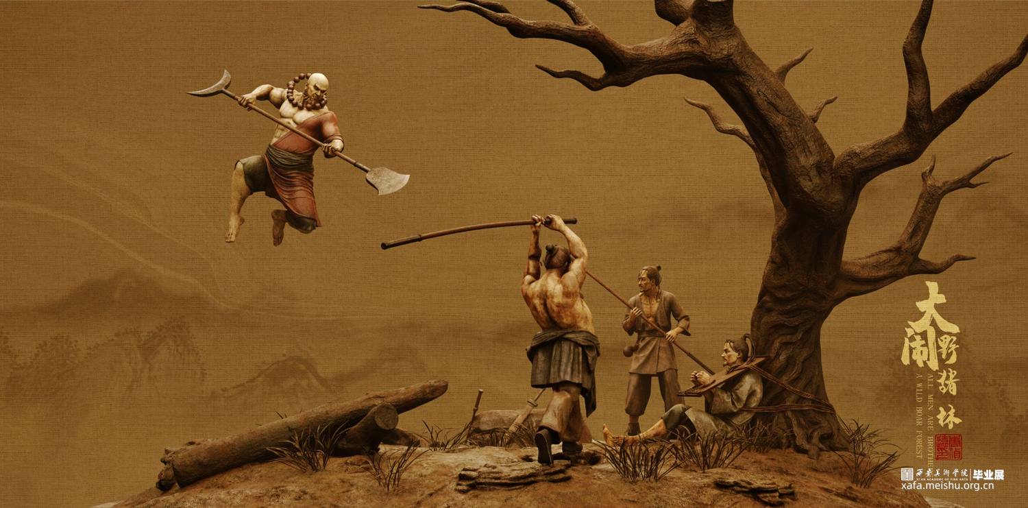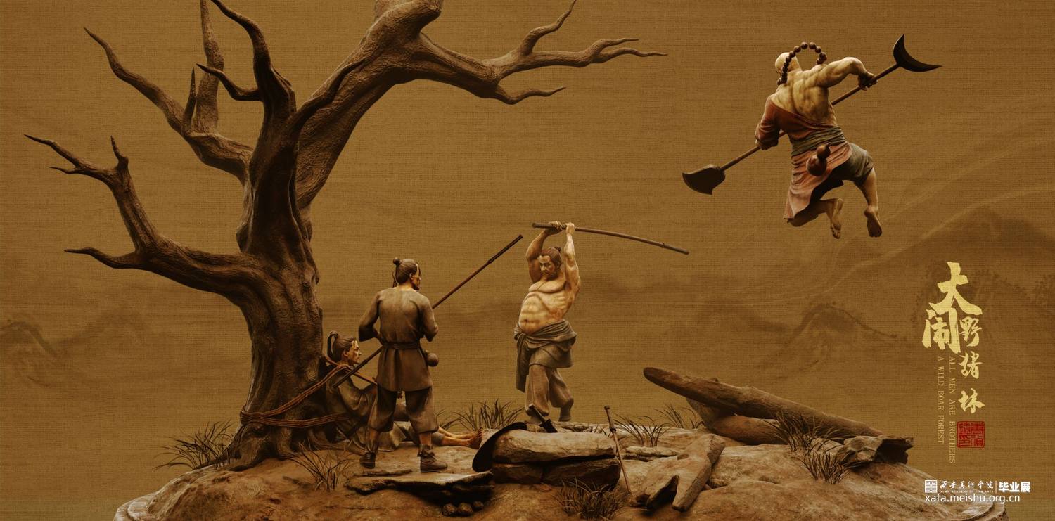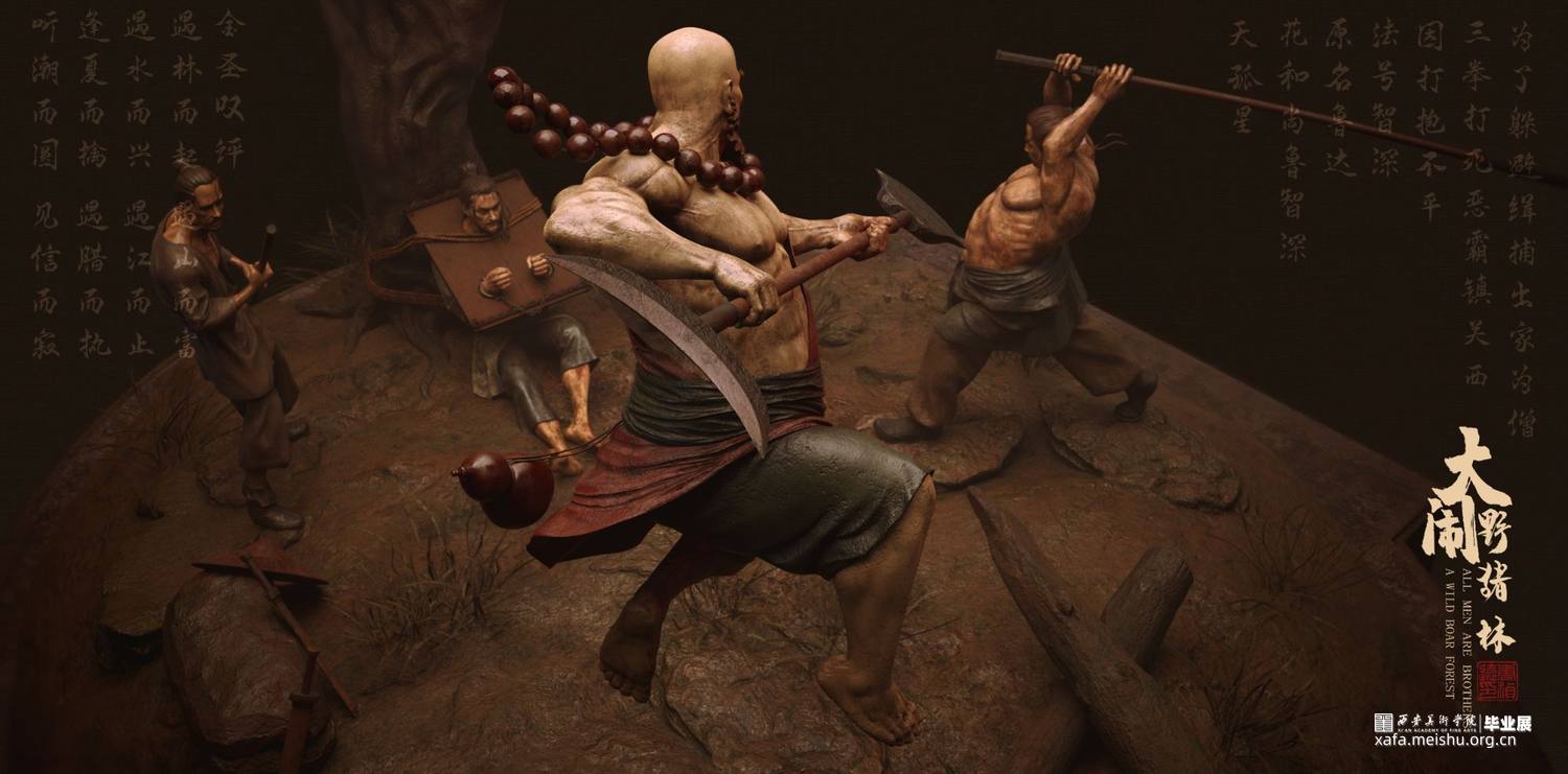 《大闹野猪林》故事取自施耐庵所著名著《水浒传》中一章节。本次创作展现了鲁智深于千钧一发之刻,怒破太尉高俅的奸计,在野猪林中从两个解差手中救下林冲的精彩场面。旨在表现鲁智深之势如奔雷,豪气冲天;体现其嫉恶如仇,古道热肠。