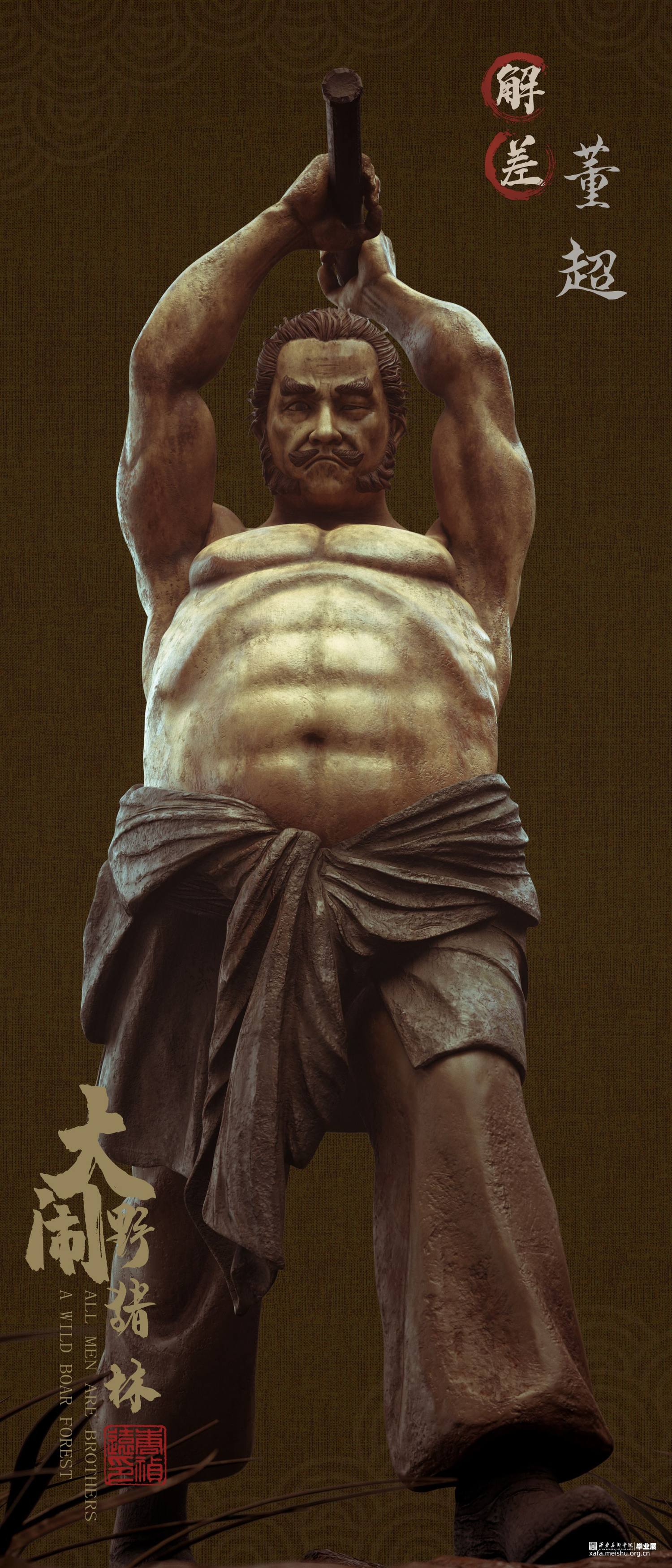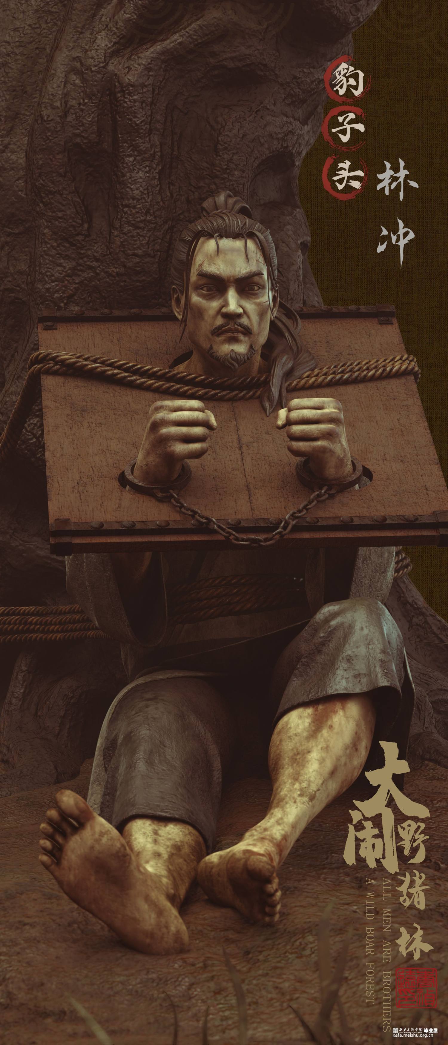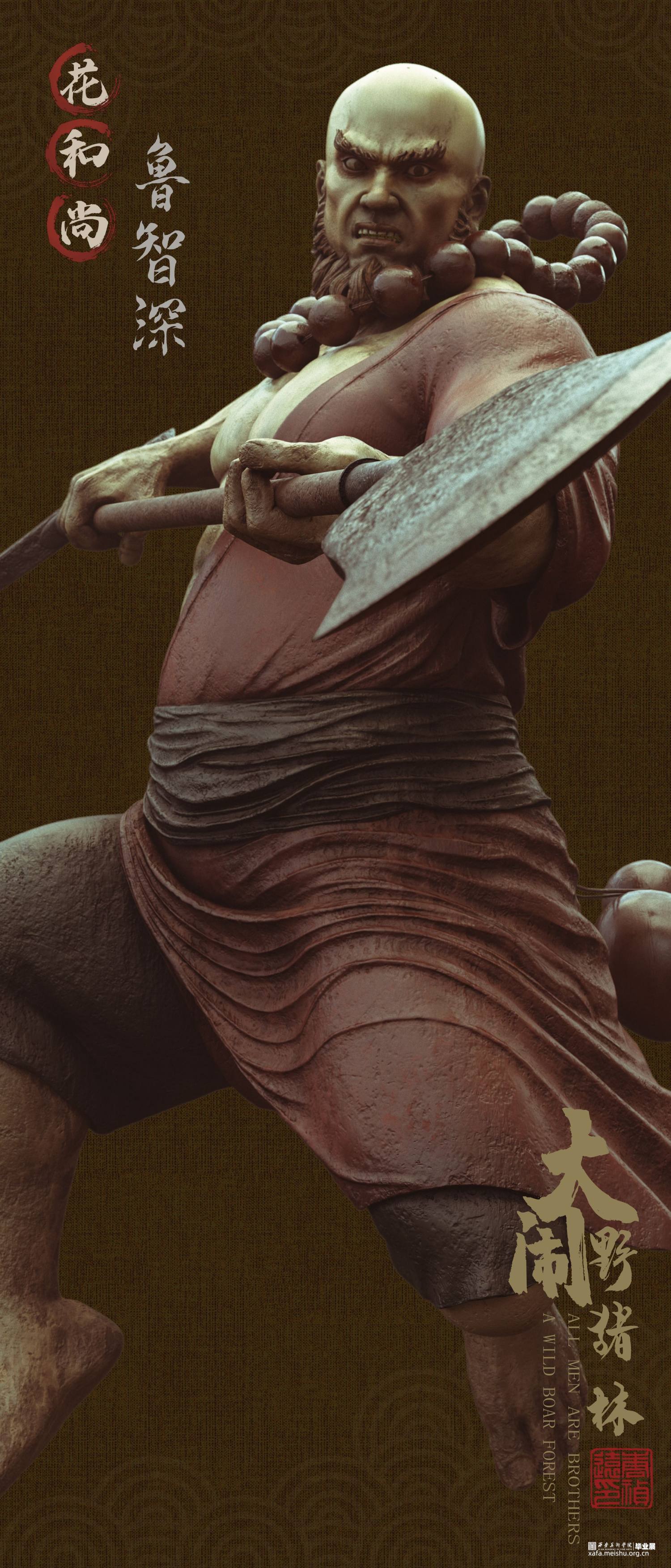 《大闹野猪林》故事取自施耐庵所著名著《水浒传》中一章节。本次创作展现了鲁智深于千钧一发之刻,怒破太尉高俅的奸计,在野猪林中从两个解差手中救下林冲的精彩场面。旨在表现鲁智深之势如奔雷,豪气冲天;体现其嫉恶如仇,古道热肠。