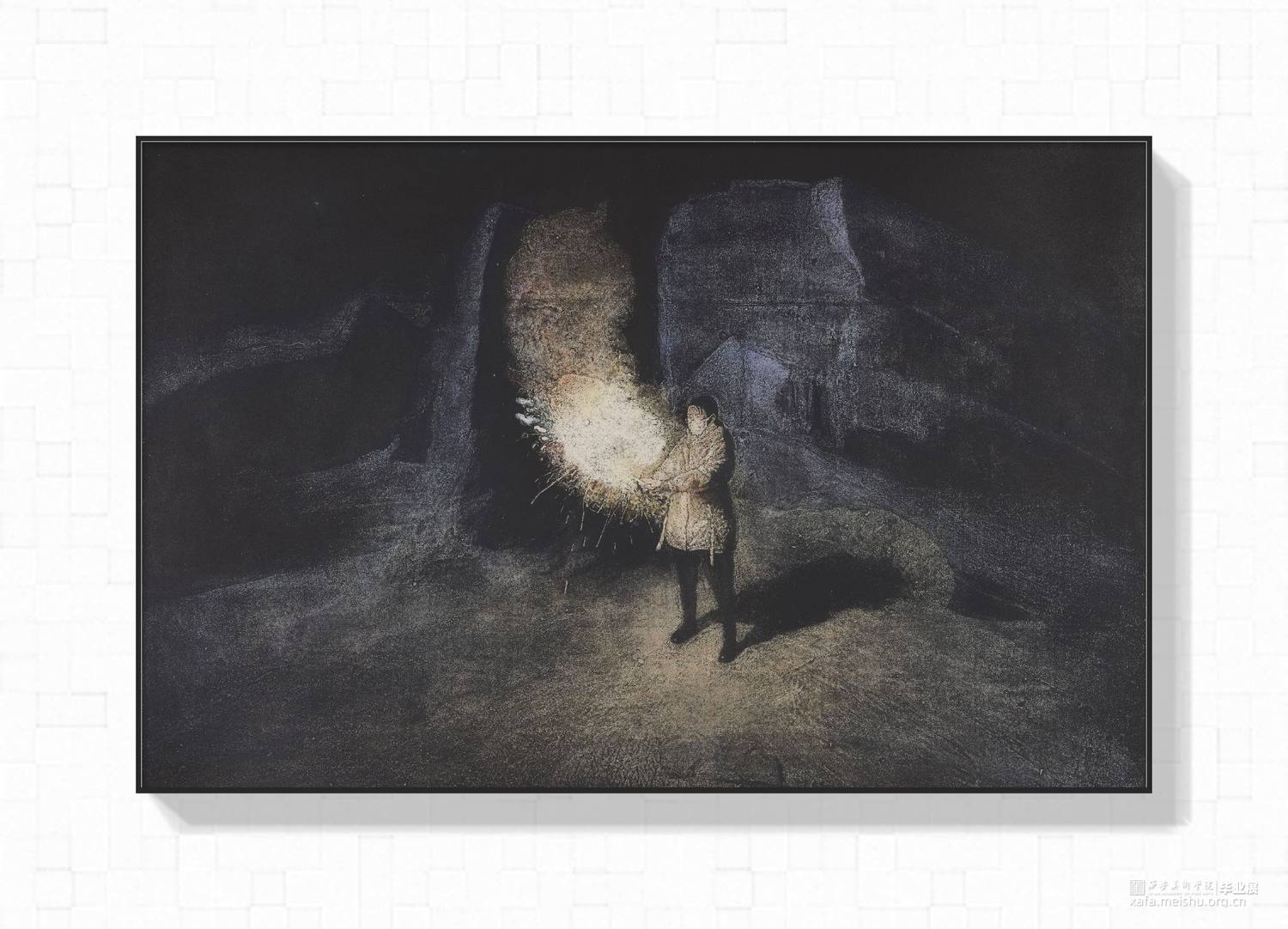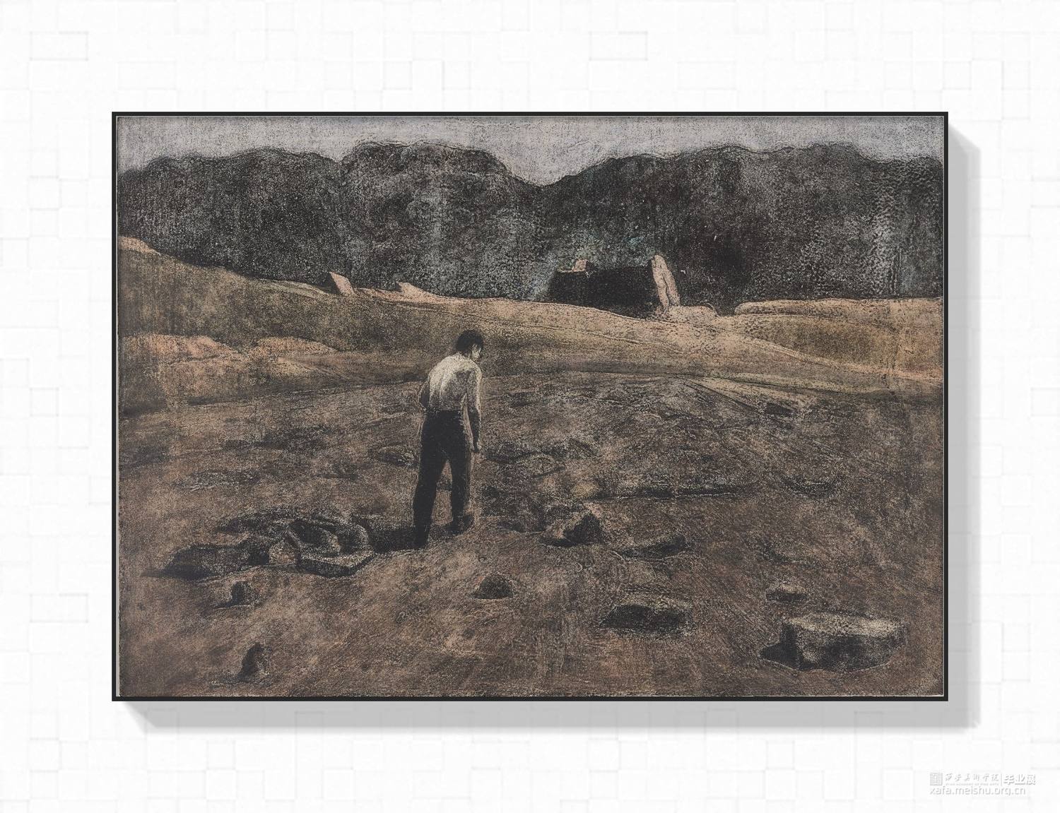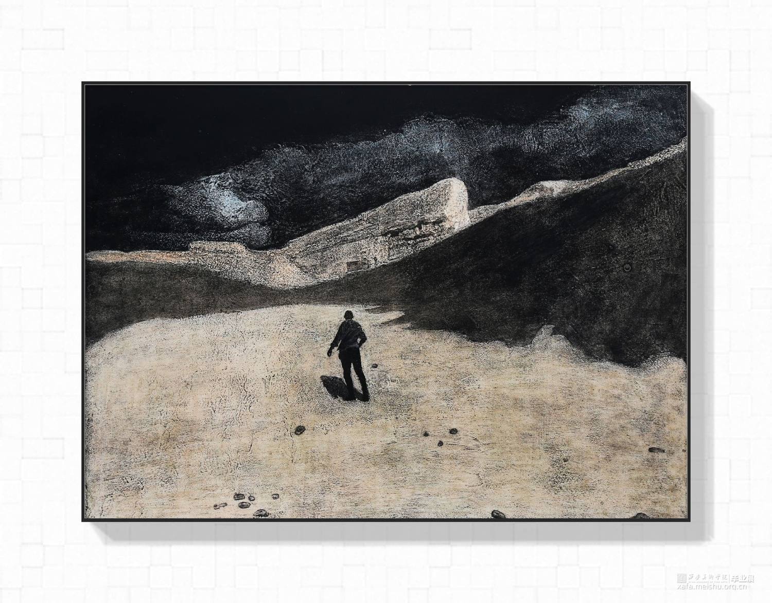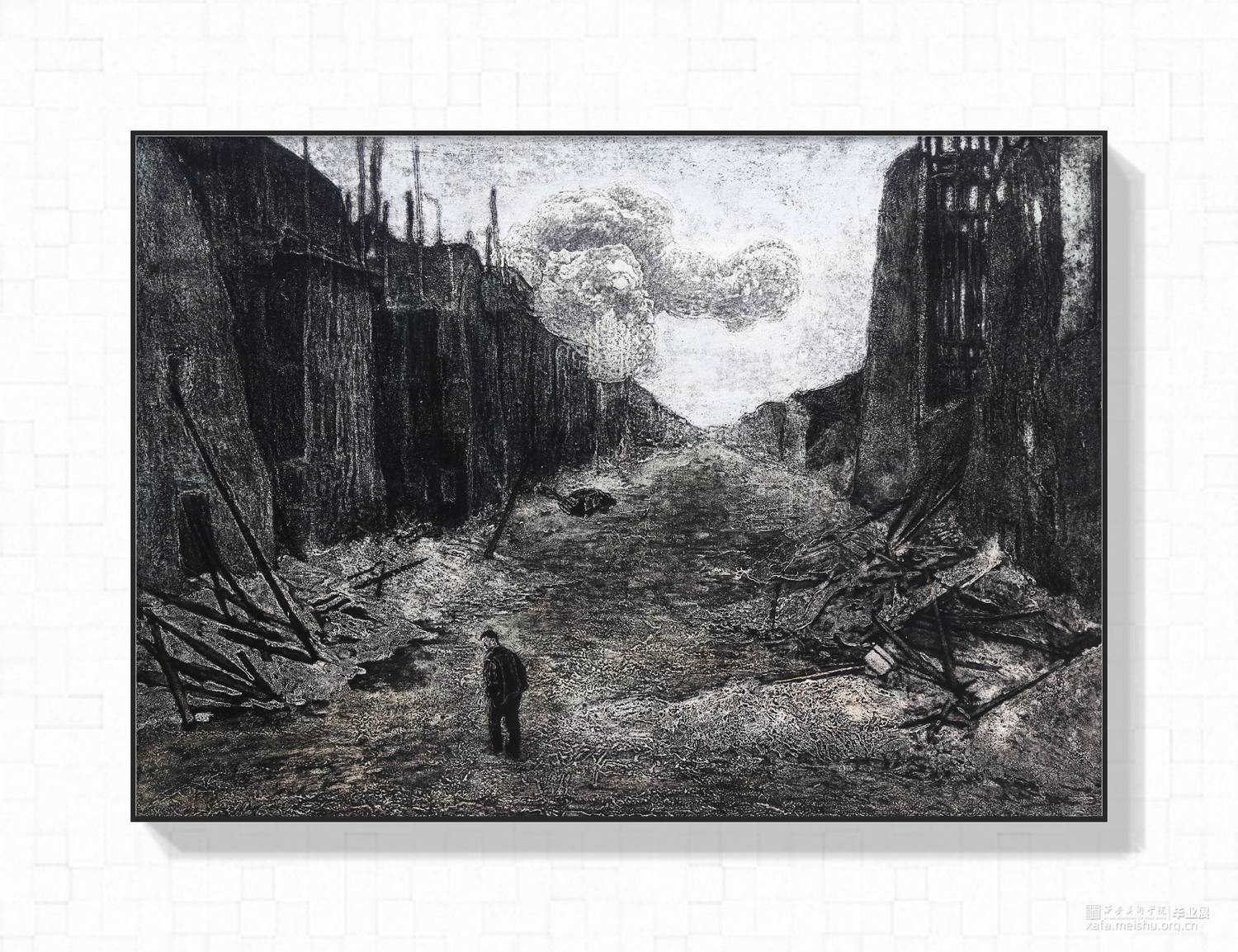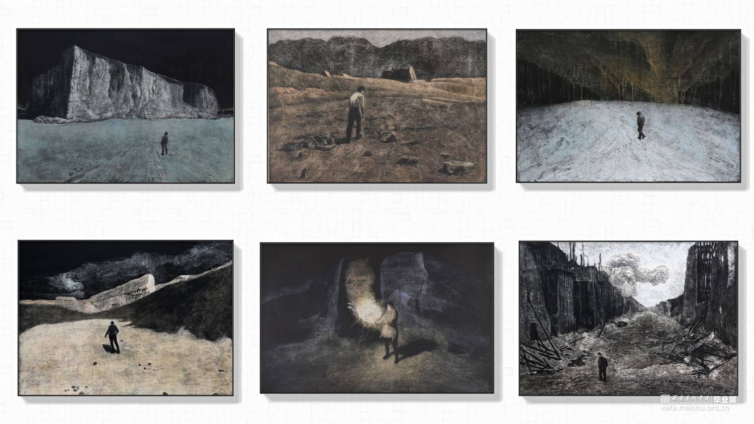 六幅作品全部用综合材料版画胶砂技法制作而成,画面内容由人与环境有情绪的搭建完成.环境的选择是北方的荒漠,废墟以及一些极寒之地,我很熟悉北方的环境,画面当中的人物需要与环境发生关系相互影响.他们的造型动作都是要符合所处的环境增强画面氛围感.在制版过程中稿子有选择地进行过稿,用胶液绘画的过程中用笔调胶都运用了类似画水彩的方法,并且我会靠自己的记忆去完善画面达到我自己在环境当中的感受,最终的画面不但会有绘画性而且现实拉开了一定的距离,看起来荒谬又和谐,陌生又熟悉。作品充满了个人情绪宣泄,有对北方的喜爱,也有个人当下的迷茫孤独。