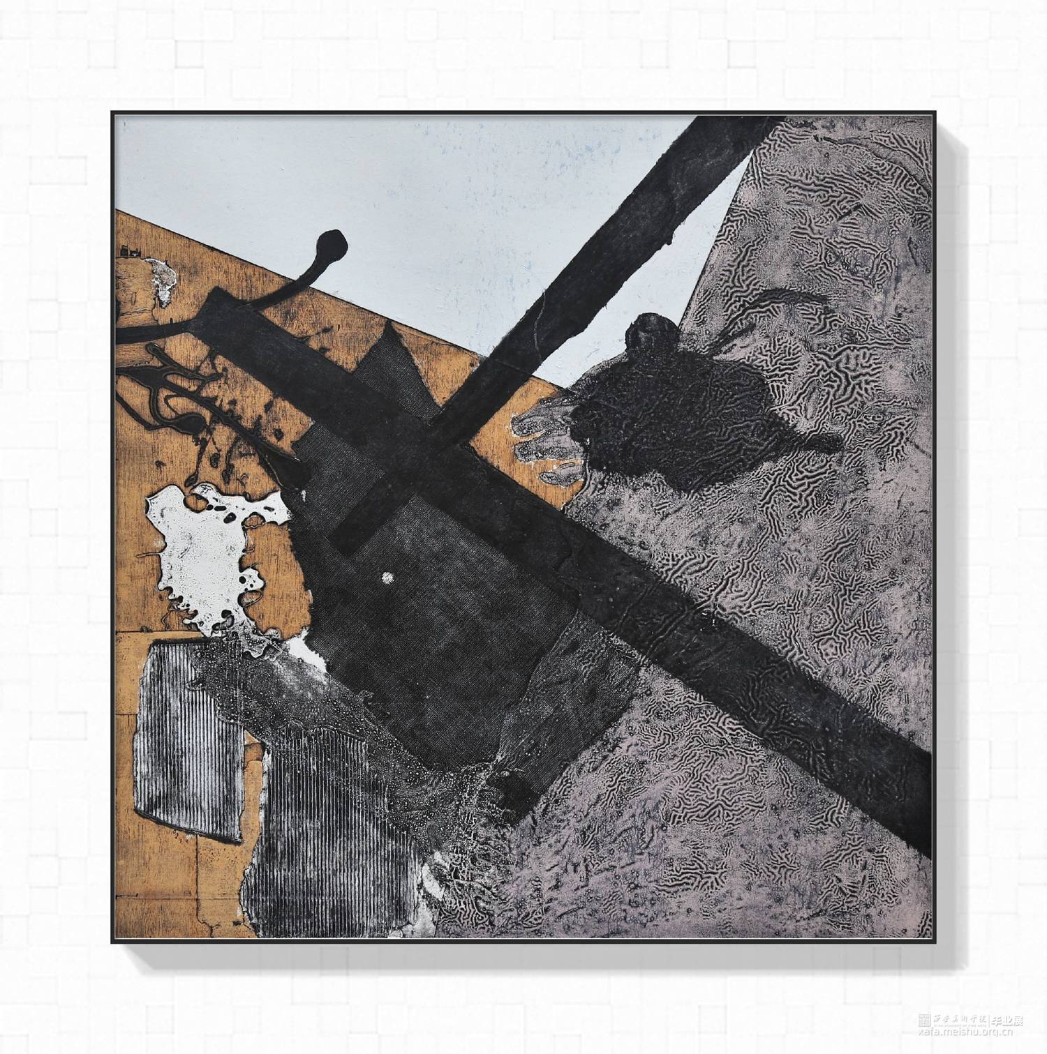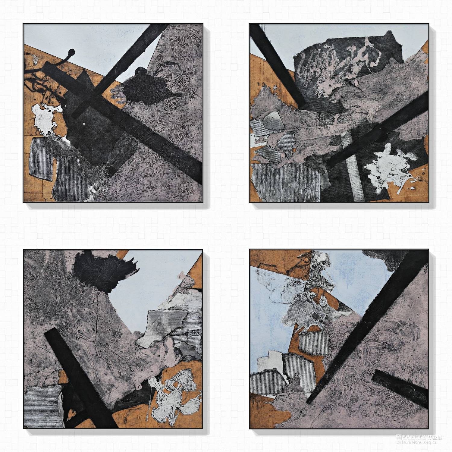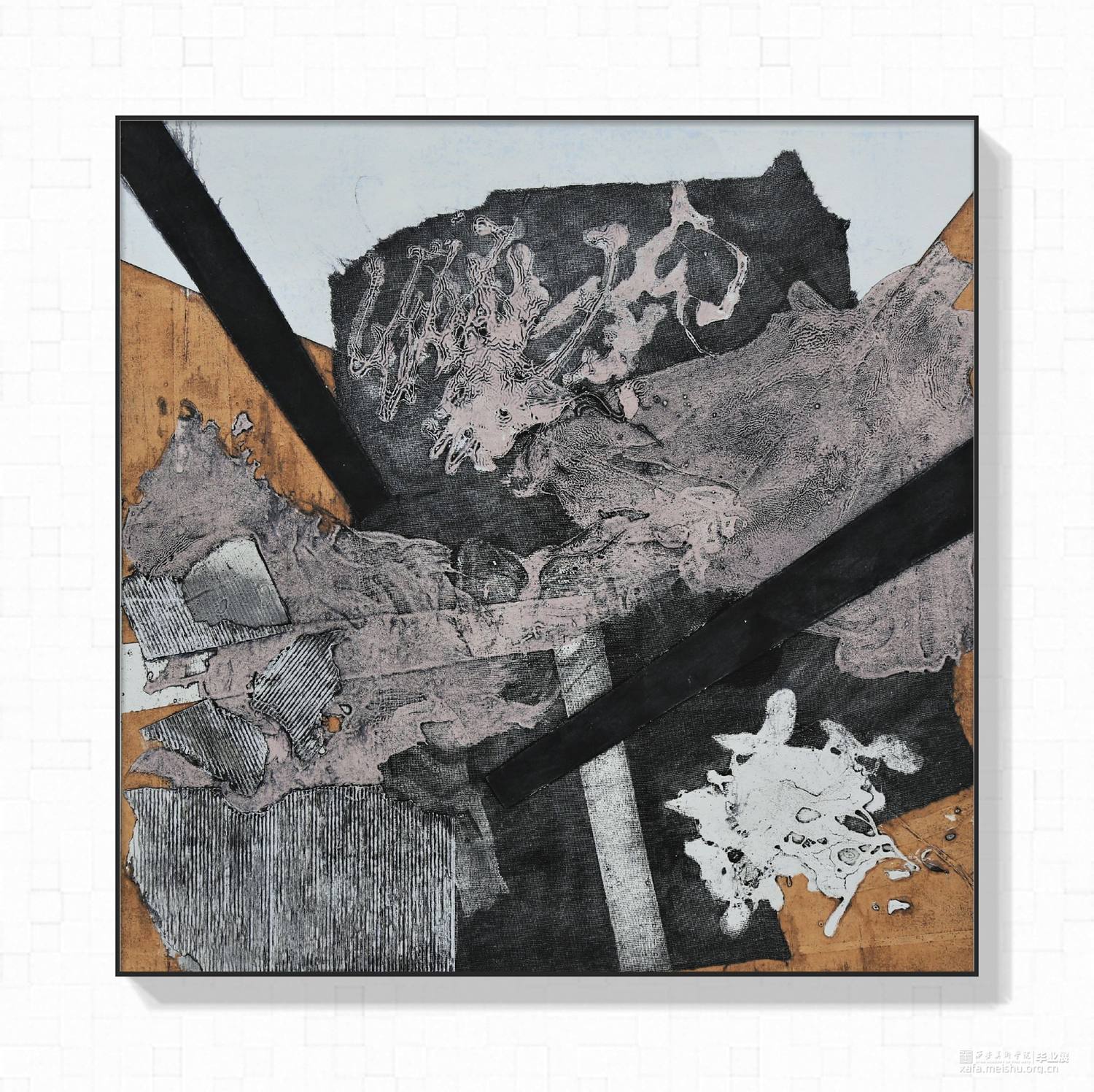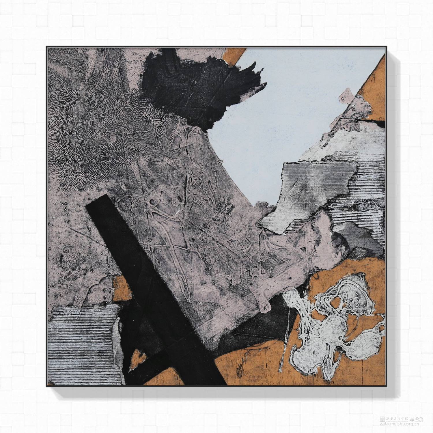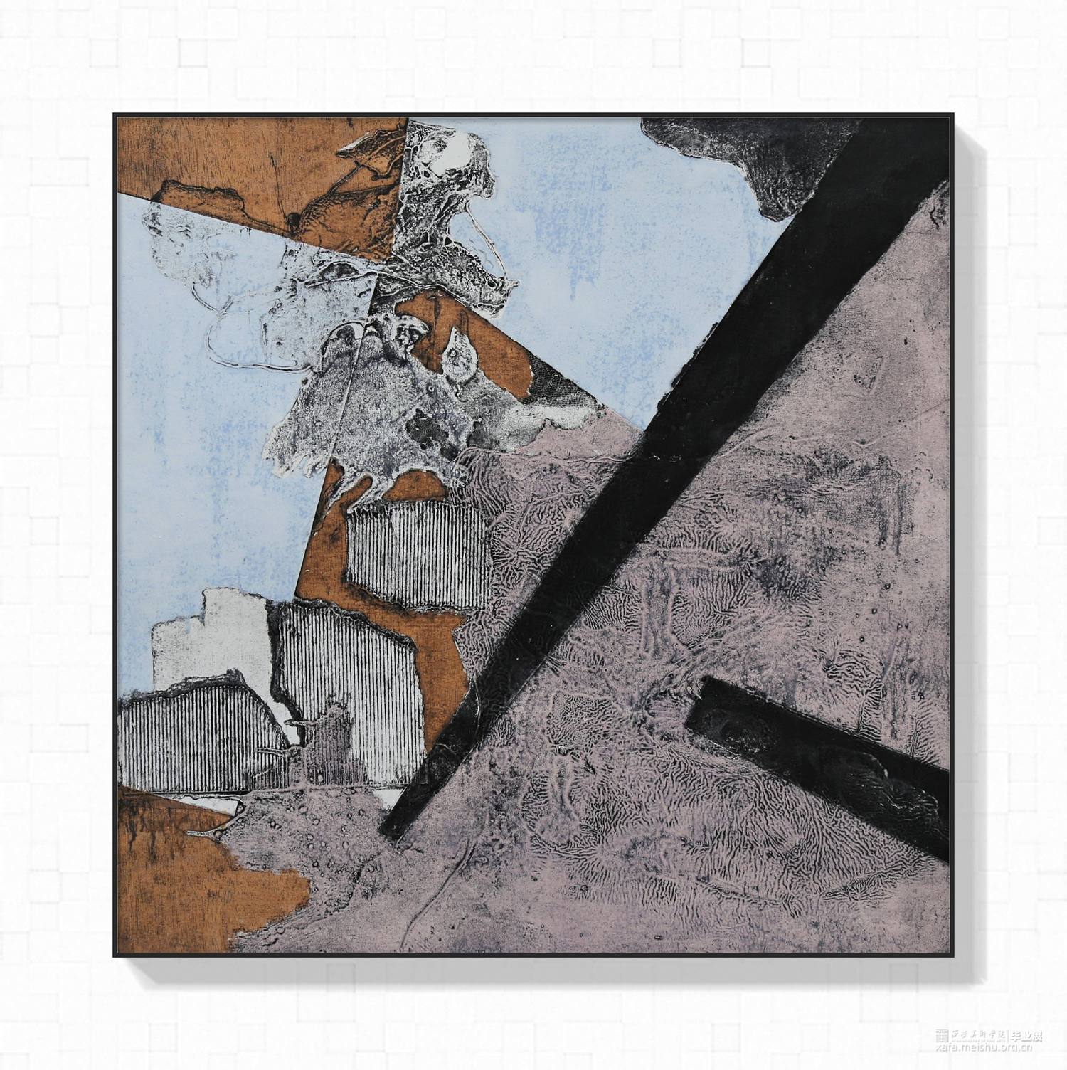 用材料拼贴来表达未知多变的题材思想,减少人为刻意的观念,不需要固定题材,抛弃实物基础,使用材料痕迹引导观赏者的思路,也许并未出水而思海,单纯运用痕迹来处理未固定的题材,未知与随机性的构图,多变的构图形式能让同一种肌理与材料赋予不一样的意义,哪怕是寻找一张照片的构图,也能重组旋转拼接让观看者发现不一样的东西,构图与角度的随机让作品也出现丰富的随机意义。