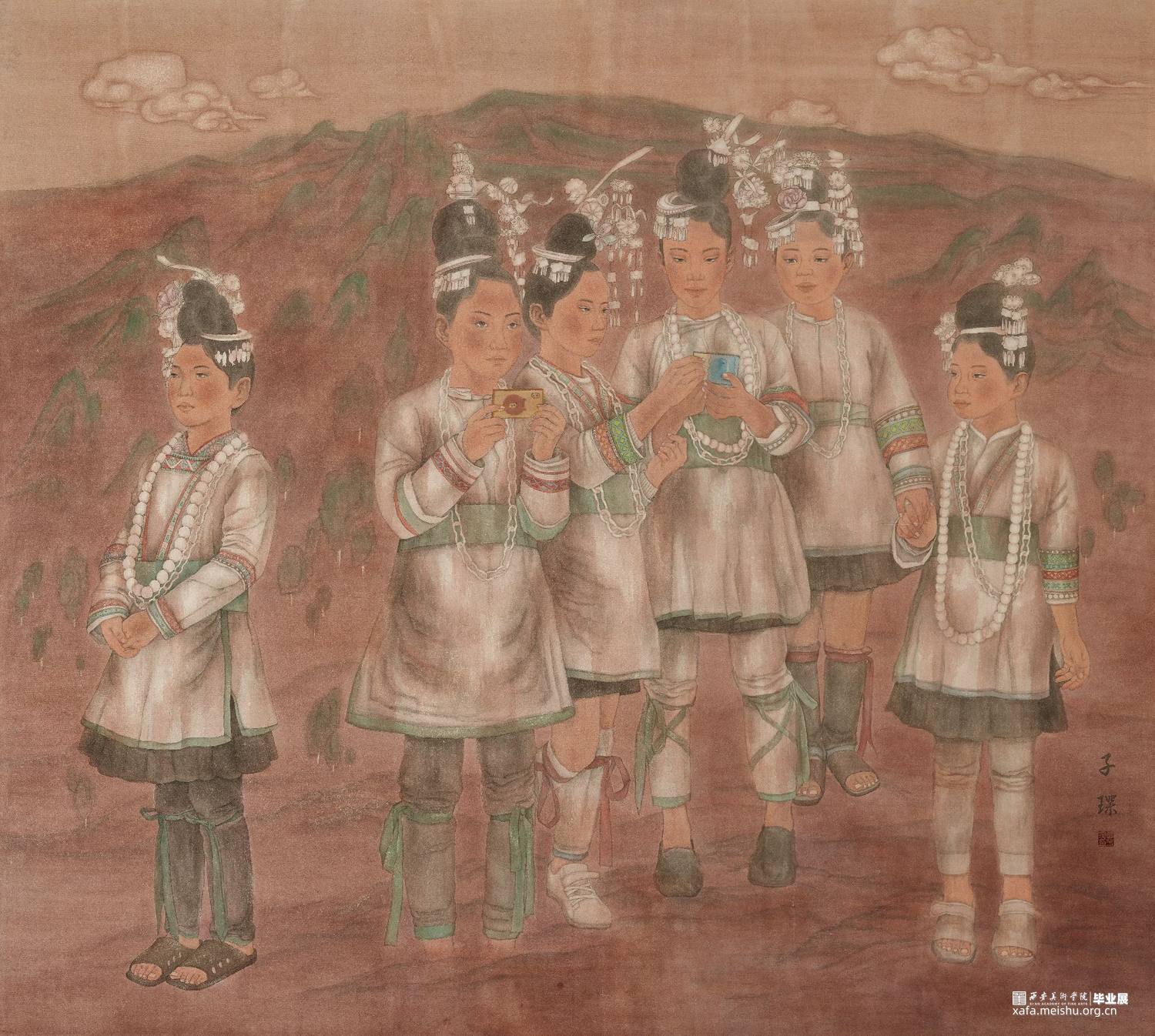 现在回想起来我依旧记忆犹新,恍如昨日。于是在去年的年末,我的毕业创作题材也在几经辗转后落足于侗族古寨这里。之前我考虑过在汉中考察时当地集市的热闹景象;考虑过苗族斗牛的激烈瞬间;甚至考虑过在假期独自前往西藏,记录下那里朝圣的人群......但遗憾的是,这些想法有的因为当下疫情缘故,有的不符合我创作的初衷理念而因此舍弃,为什么选择侗族孩子作为我创作的题材,其一,他们生活的古寨距离我们的“水泥森林”较为遥远,贴近自然充满神秘。其二,在考察期间,与他们的交往中,我被孩子们的纯真与活泼所深深的打动。其三,具体作品的内容是当时表演结束后大家走出鼓楼纷纷合影留念时侗族孩子看着手机里一张张照片时有说有笑的一个瞬间,侗族孩子加上手里的手机,这是当今同时存在的两种不同世界的碰撞,孩子代表人们憧憬的淳朴自然,手机则是这个飞速发展的当今时代的一个缩影。艺术需要矛与盾的相互碰撞,只有碰撞才能引发人的思考。