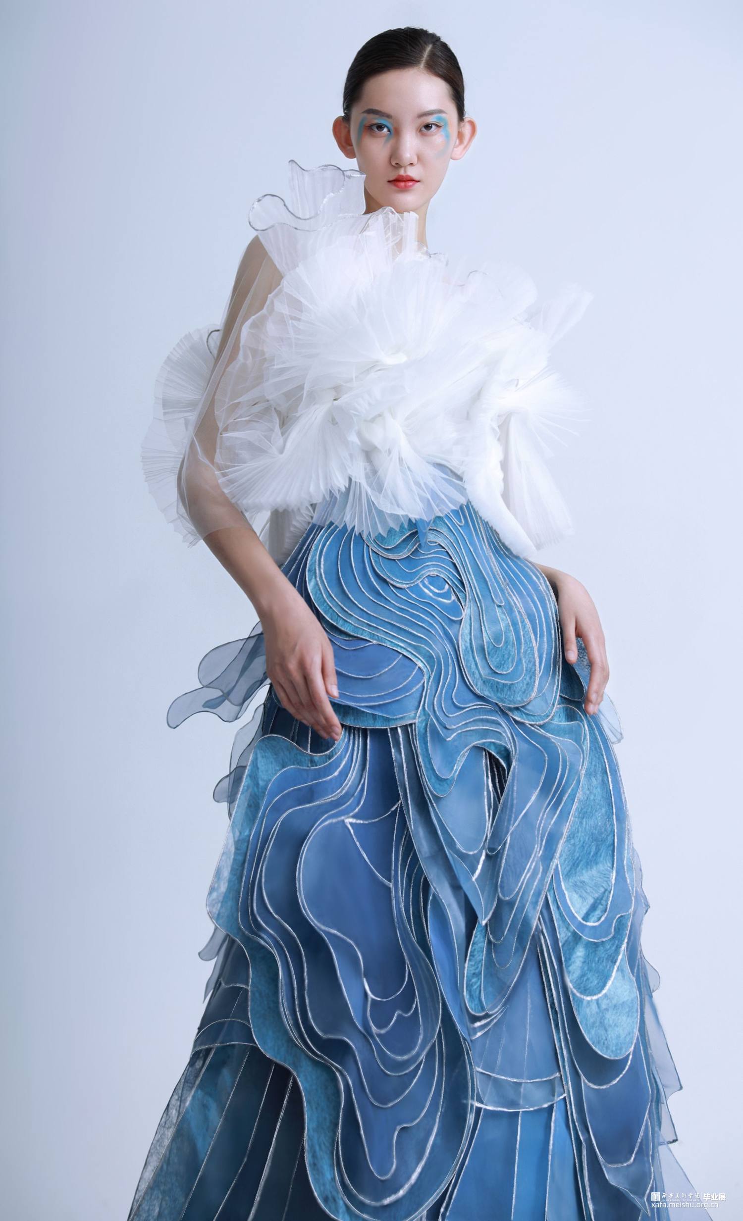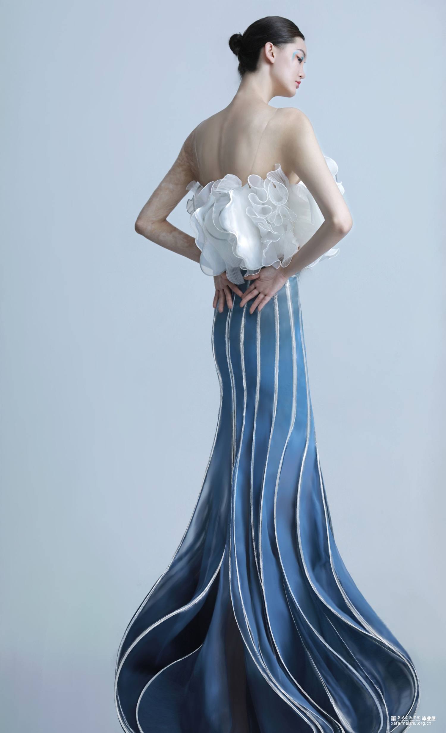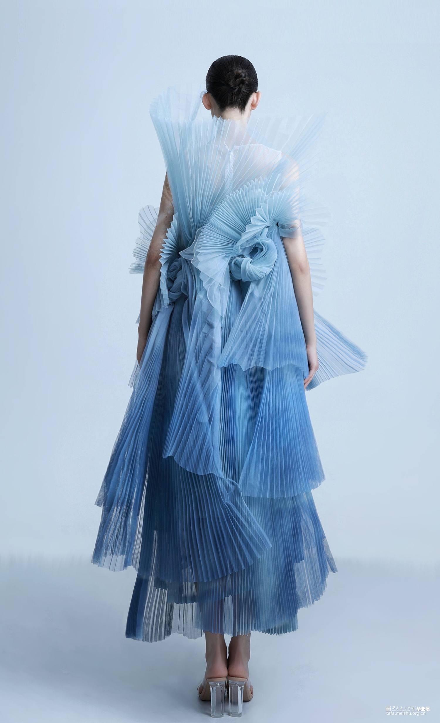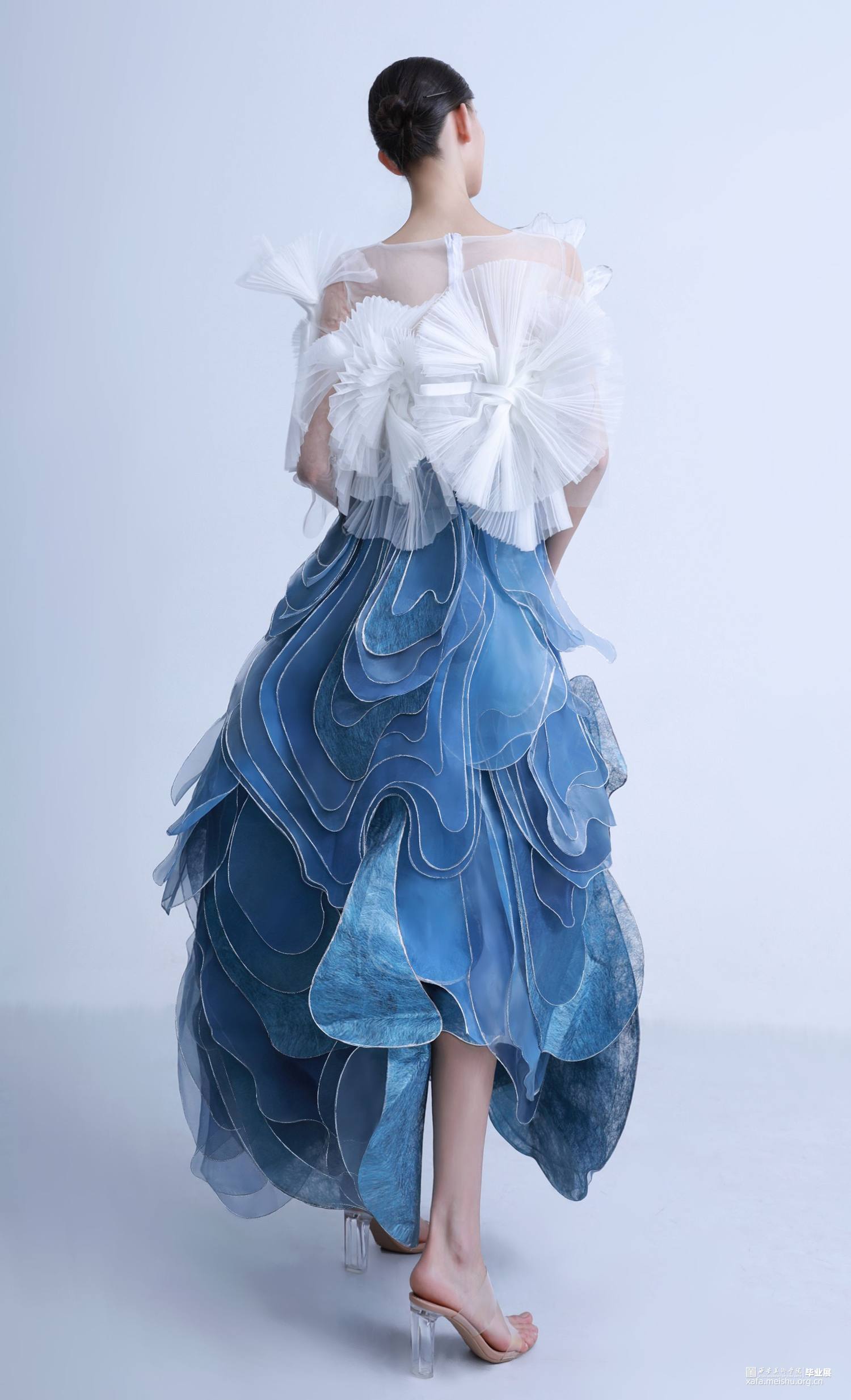 作品多用褶皱与半透明纱面,打造流线型简约廓形,将唐代诗词中的审美意象融合于设计当中,给人以新鲜的视觉感受。面料主体采用富有中国韵味的纱绡与丝绸结合,其飘逸柔软的质感与挺阔褶皱打造的立体廓形成对比;色彩选取银白色与蓝色色系渐变搭配,营造清冷的氛围感,打造人与自然和谐共存的生态伦理精神。面料、廓形、色彩及后期面料再造部分均是对唐代诗词中的部分元素进行解构、提取后与现代礼服结合运用的综合体现,使其适合于现代礼服造型,传达出传统与时尚相互冲撞、融合的设计理念,给人以极具包容性的自然视角,体现人与自然的和谐关系及身心和谐的生命超越精神。