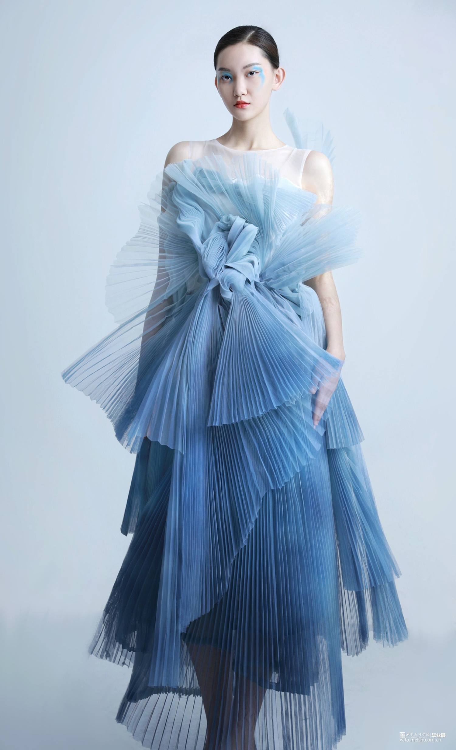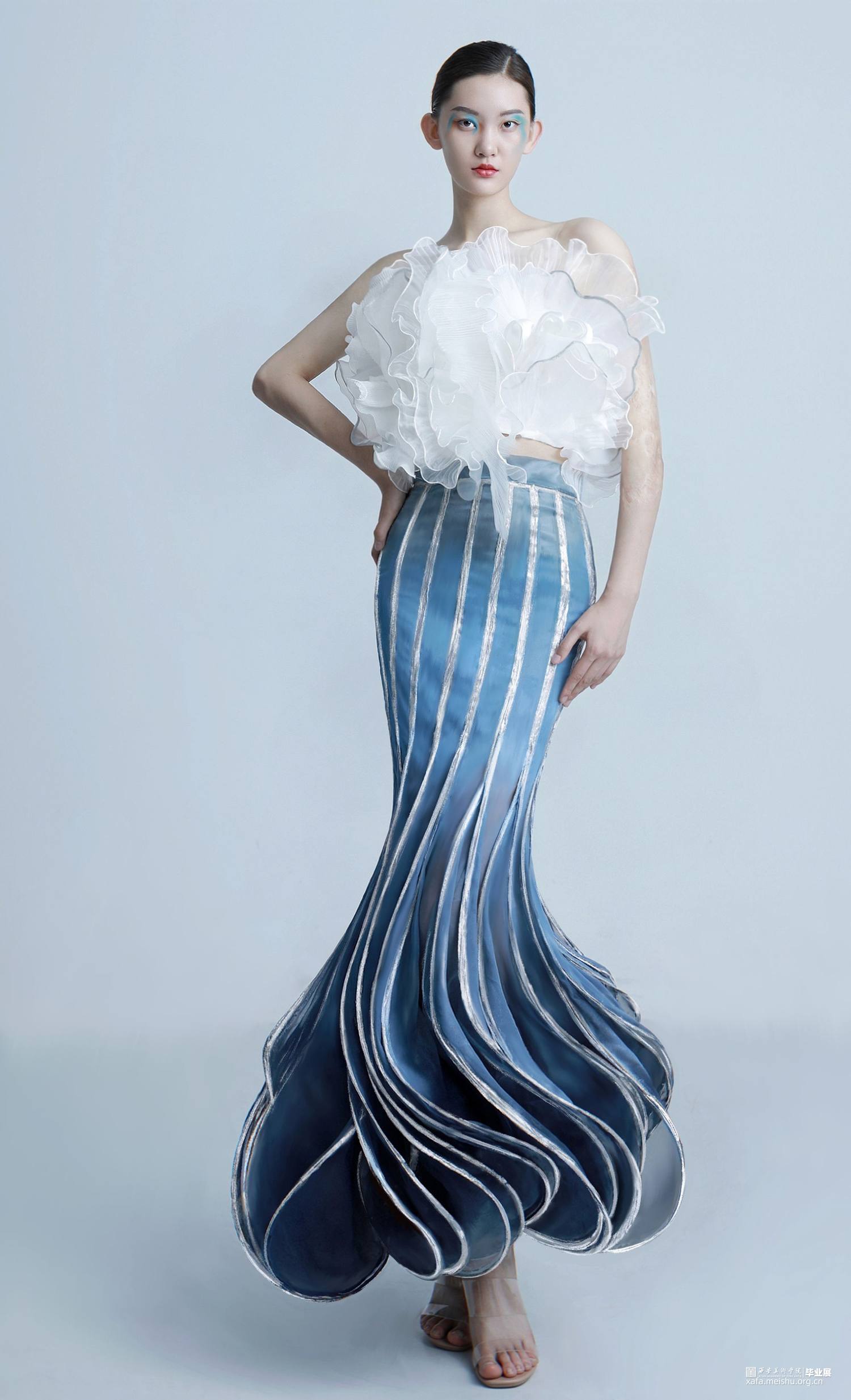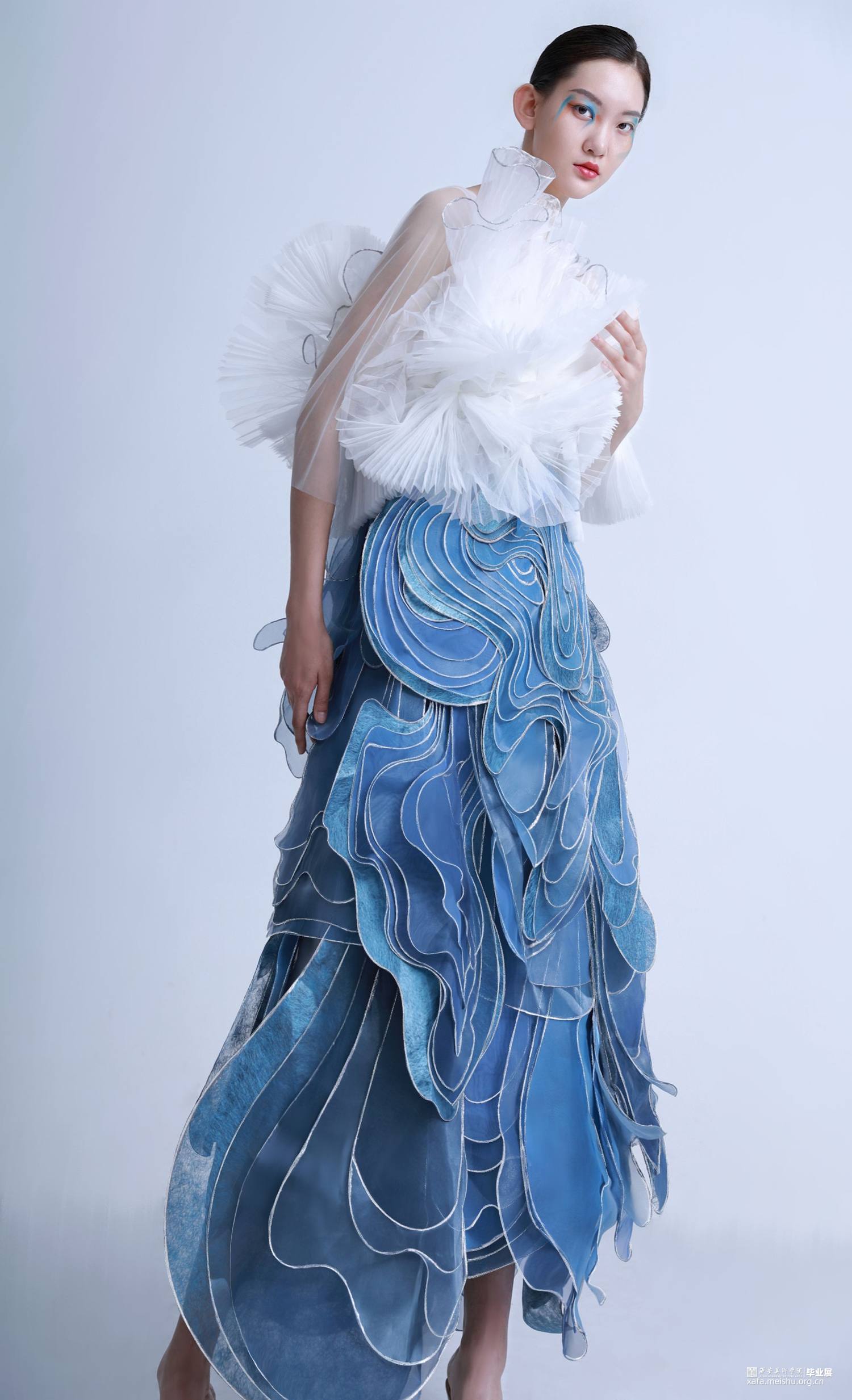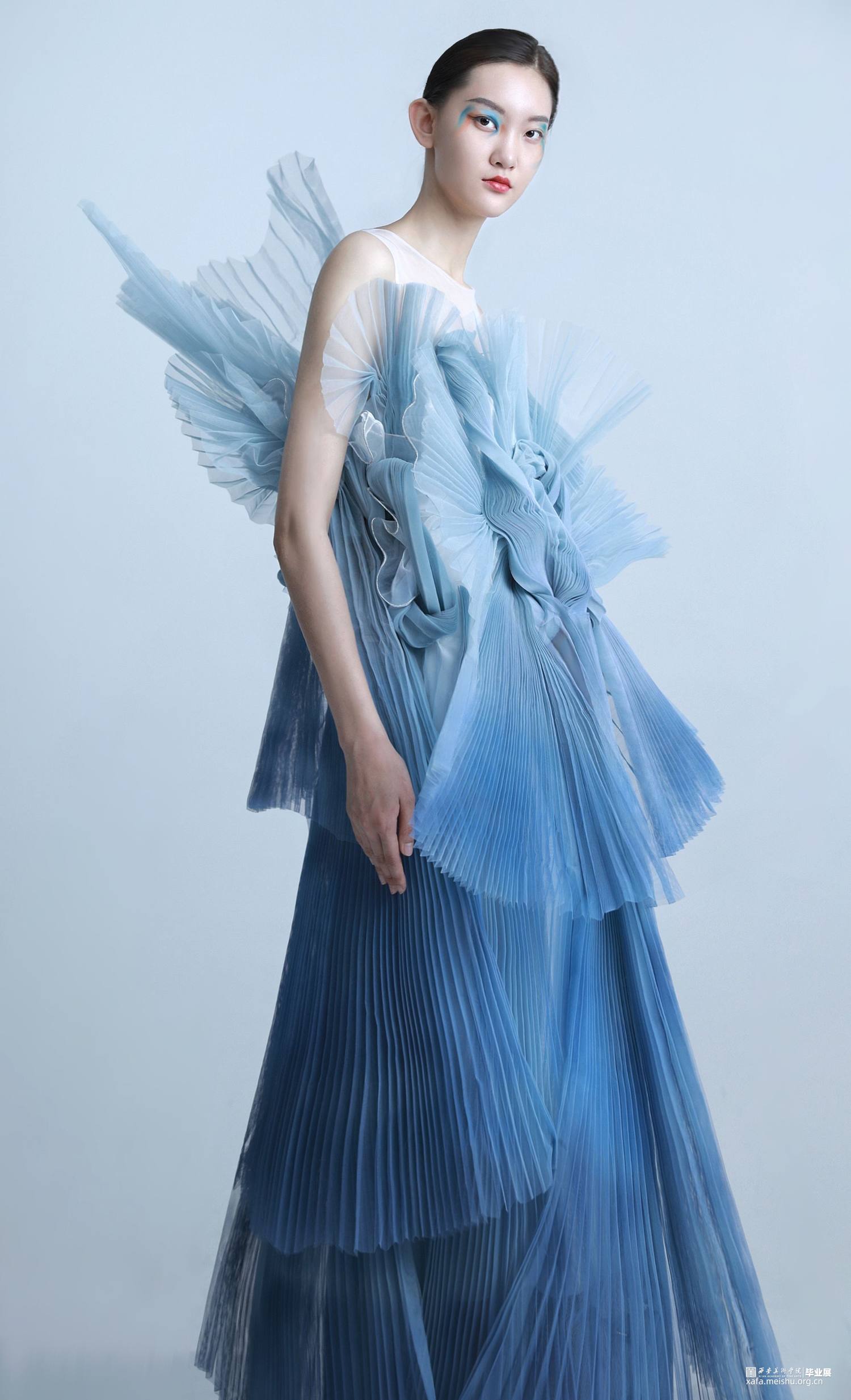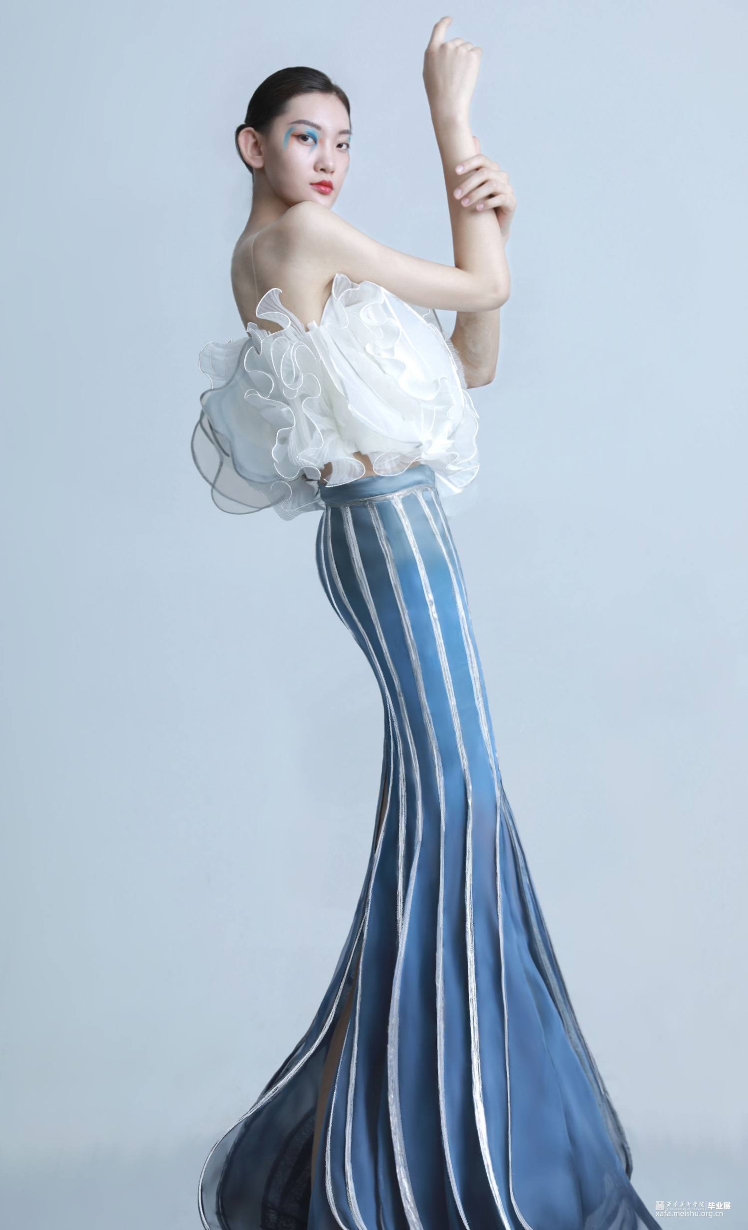 作品多用褶皱与半透明纱面,打造流线型简约廓形,将唐代诗词中的审美意象融合于设计当中,给人以新鲜的视觉感受。面料主体采用富有中国韵味的纱绡与丝绸结合,其飘逸柔软的质感与挺阔褶皱打造的立体廓形成对比;色彩选取银白色与蓝色色系渐变搭配,营造清冷的氛围感,打造人与自然和谐共存的生态伦理精神。面料、廓形、色彩及后期面料再造部分均是对唐代诗词中的部分元素进行解构、提取后与现代礼服结合运用的综合体现,使其适合于现代礼服造型,传达出传统与时尚相互冲撞、融合的设计理念,给人以极具包容性的自然视角,体现人与自然的和谐关系及身心和谐的生命超越精神。