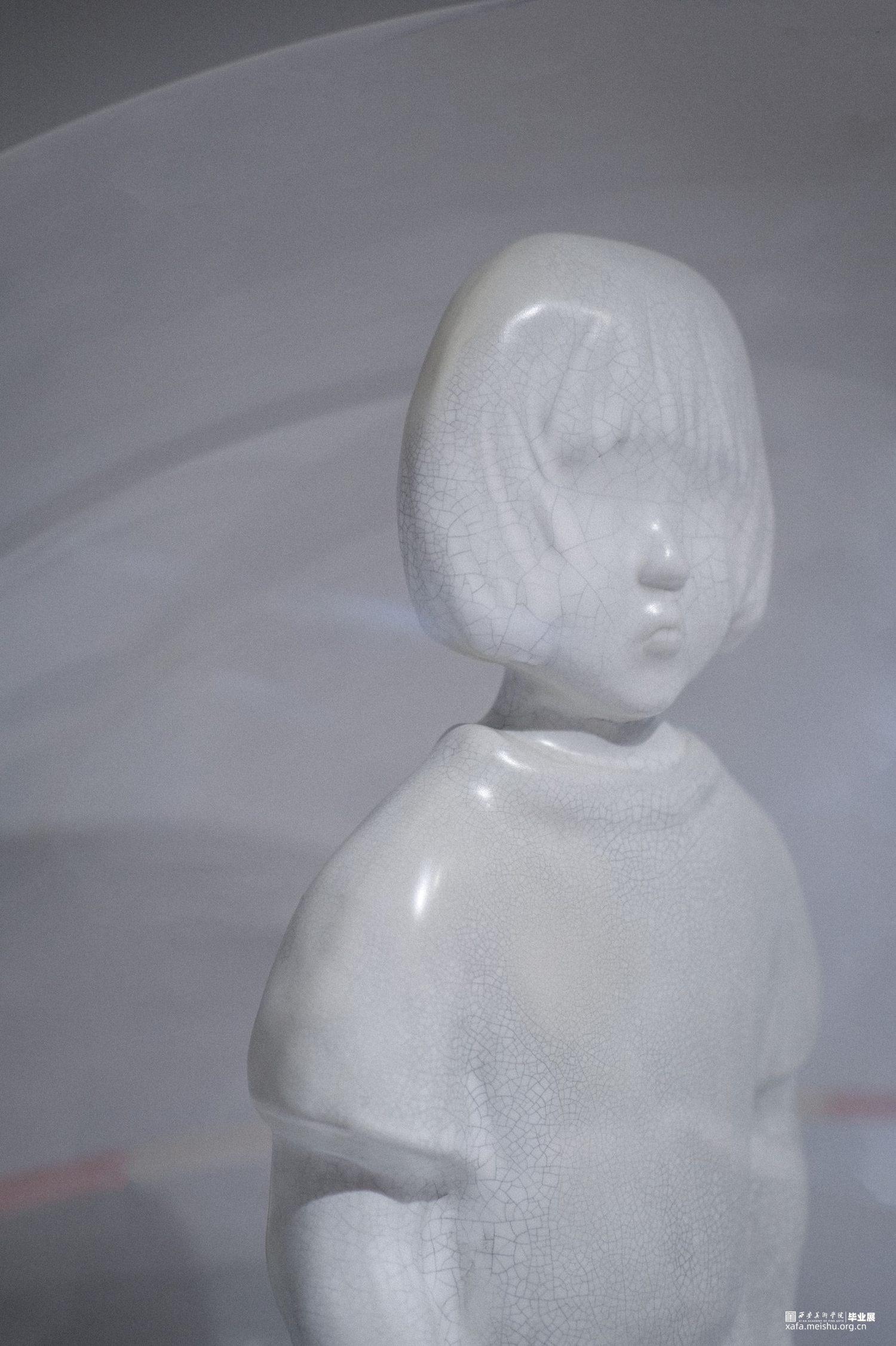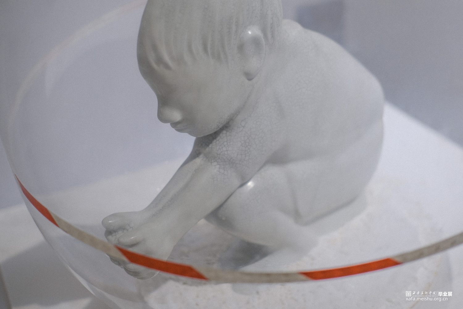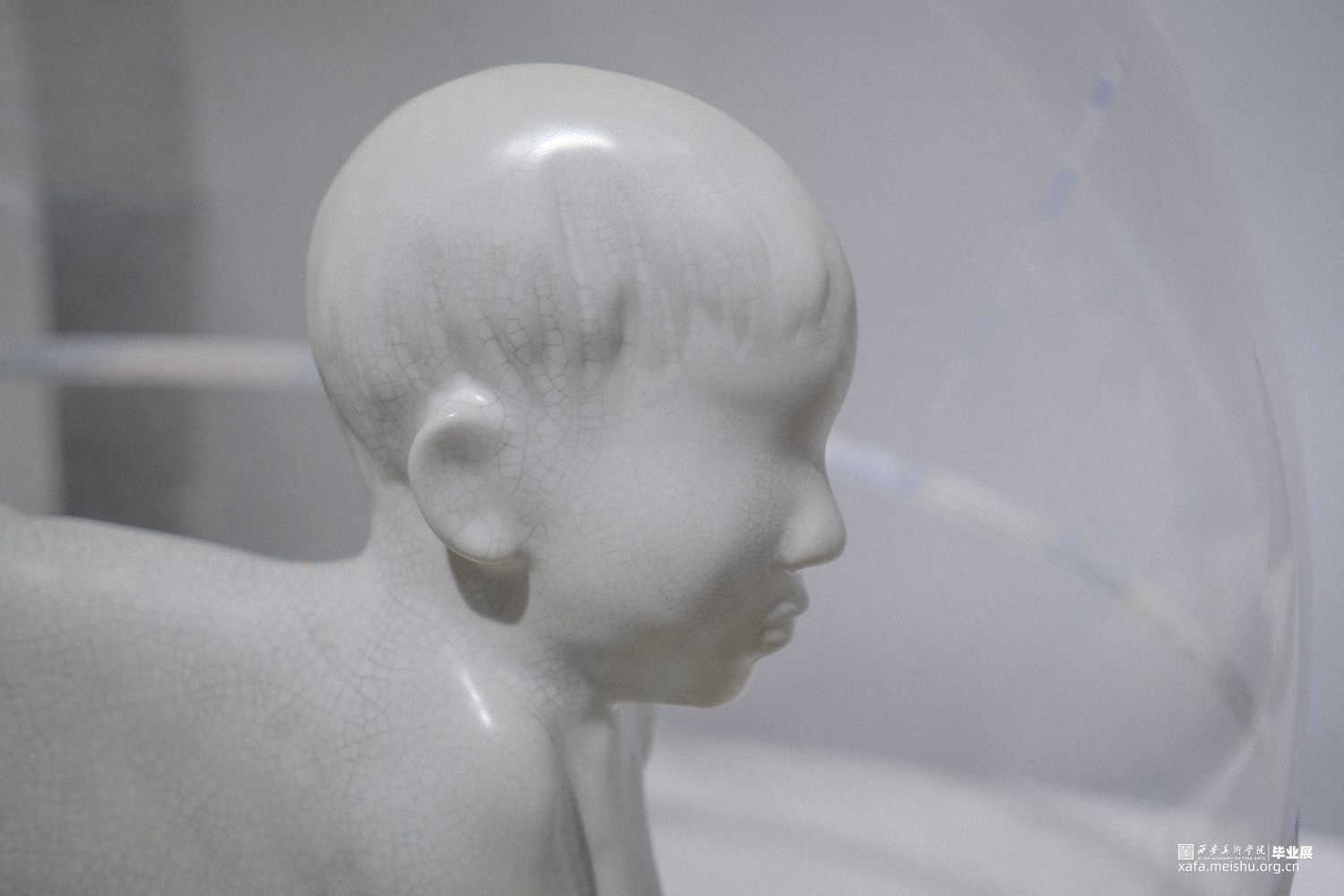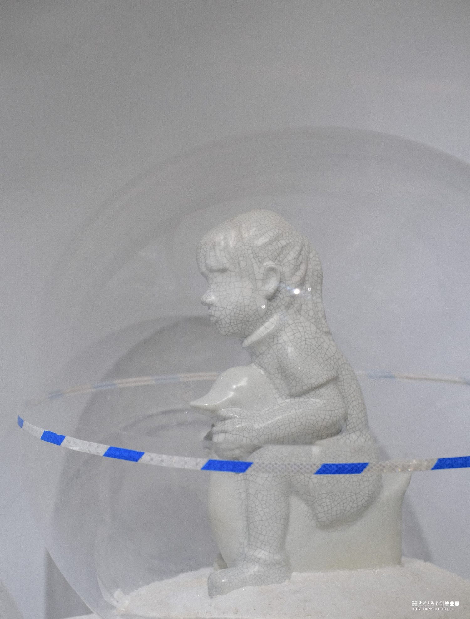作品以关注社会弱势群体——脆骨症儿童为创作灵感出发点,陶瓷材料更能契合该群体的“脆弱”与“坚强”。陶瓷与表面的裂纹釉,具有坚硬与脆弱的表征,而其外面的亚克力罩则是一种自我保护或社会警示的象征。作品整体以白色为基调,造型简洁萌动,釉色丰富自然。