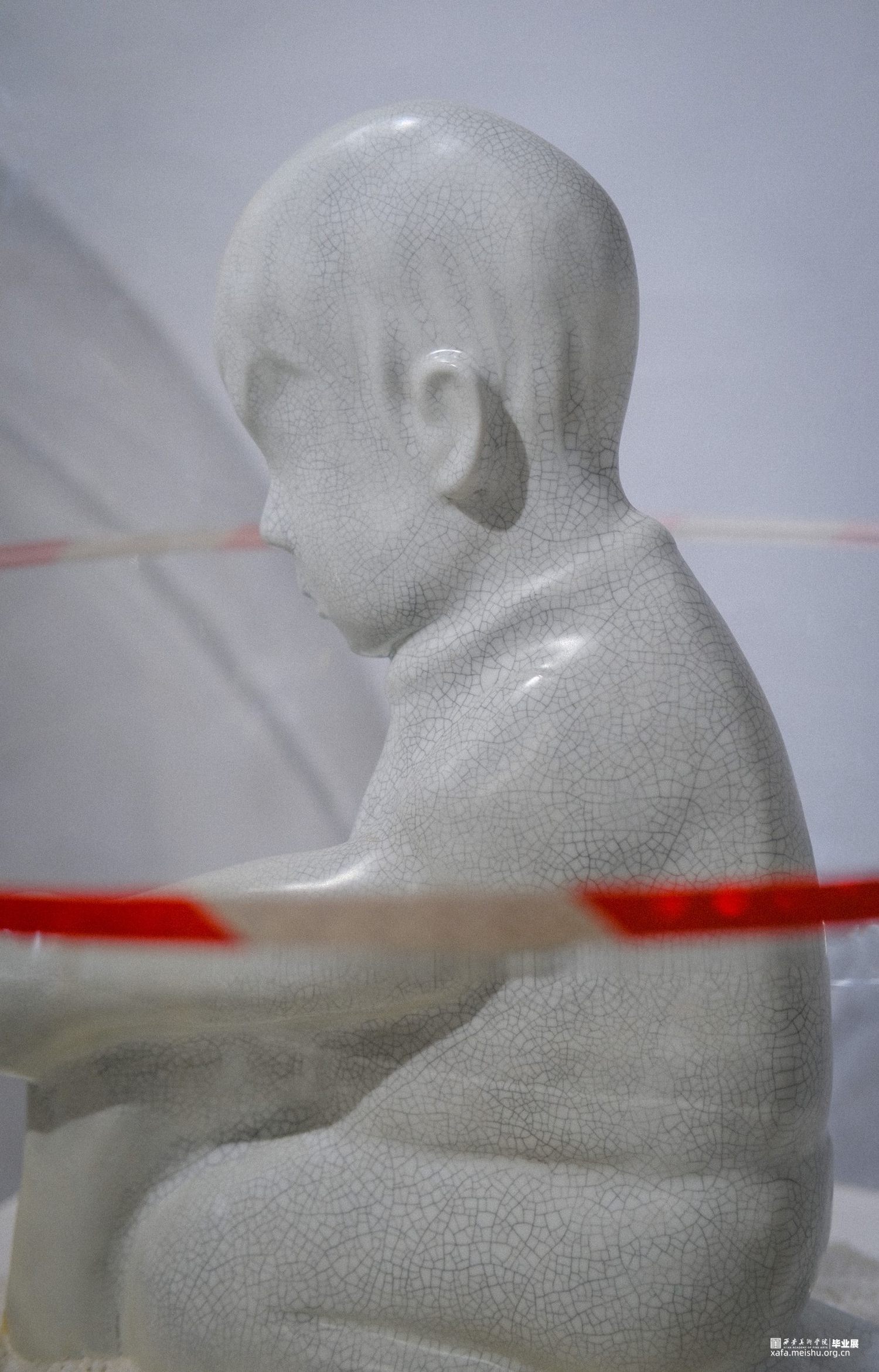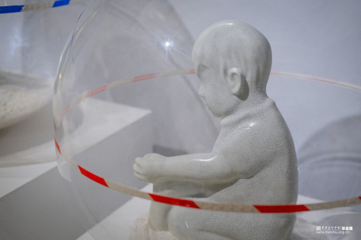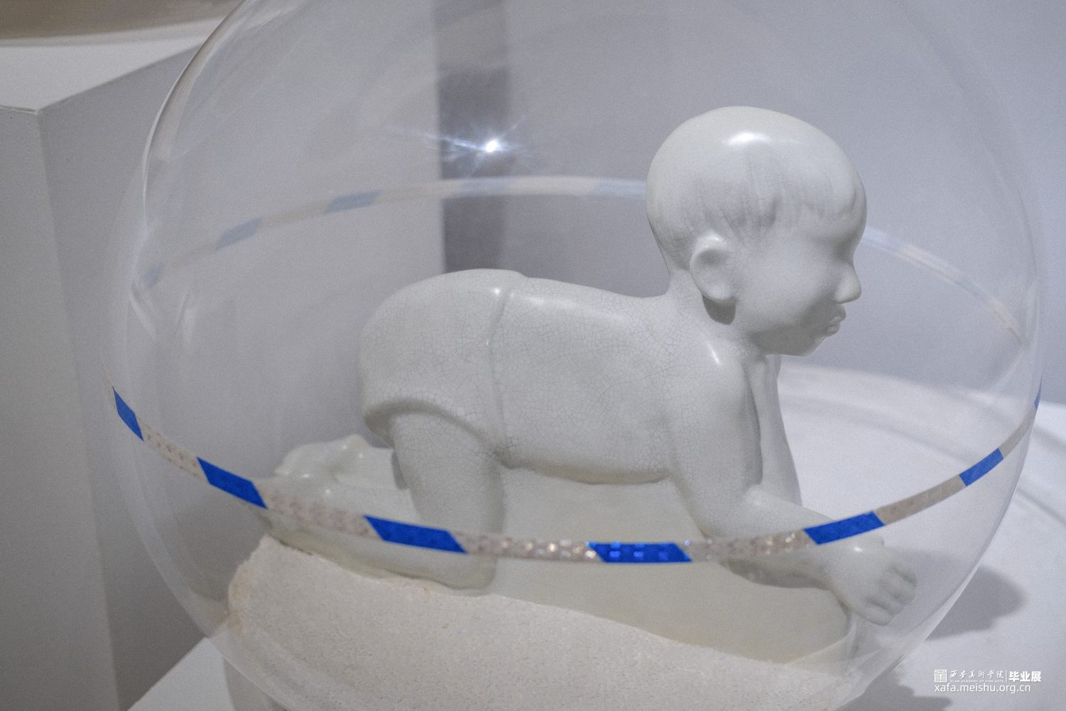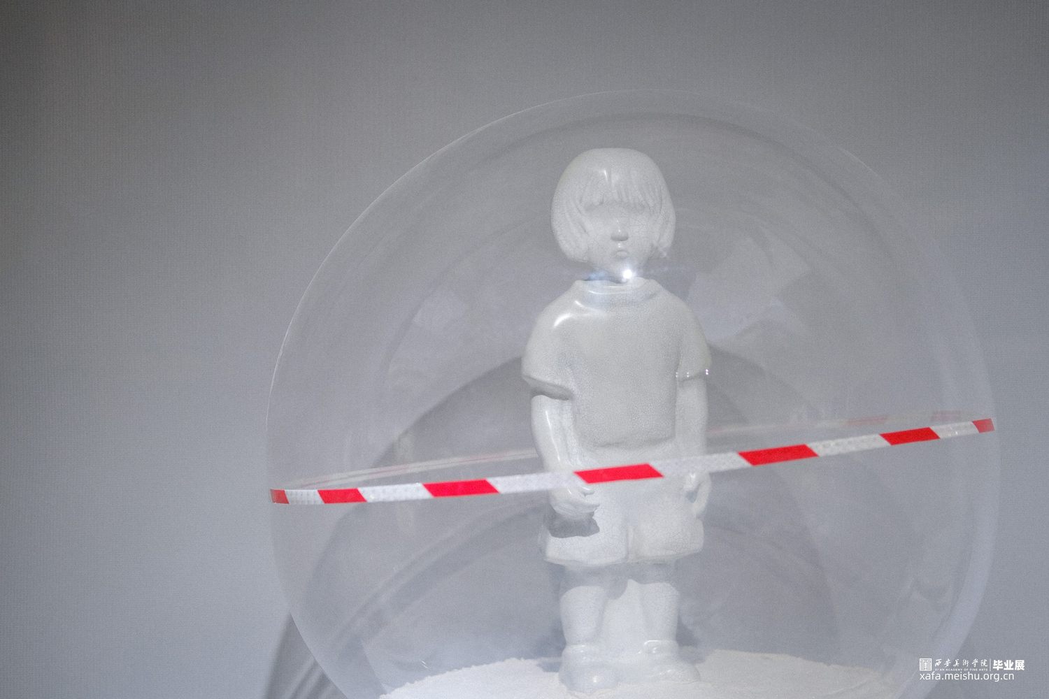 作品以关注社会弱势群体——脆骨症儿童为创作灵感出发点,陶瓷材料更能契合该群体的“脆弱”与“坚强”。陶瓷与表面的裂纹釉,具有坚硬与脆弱的表征,而其外面的亚克力罩则是一种自我保护或社会警示的象征。作品整体以白色为基调,造型简洁萌动,釉色丰富自然。