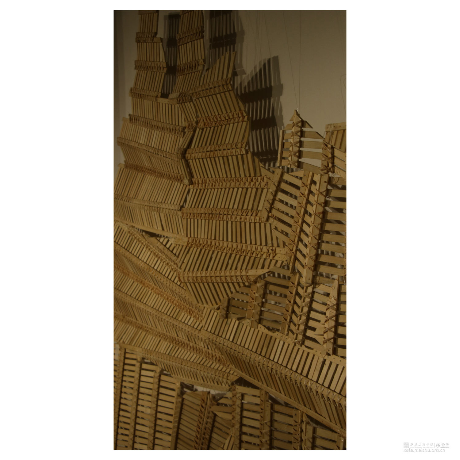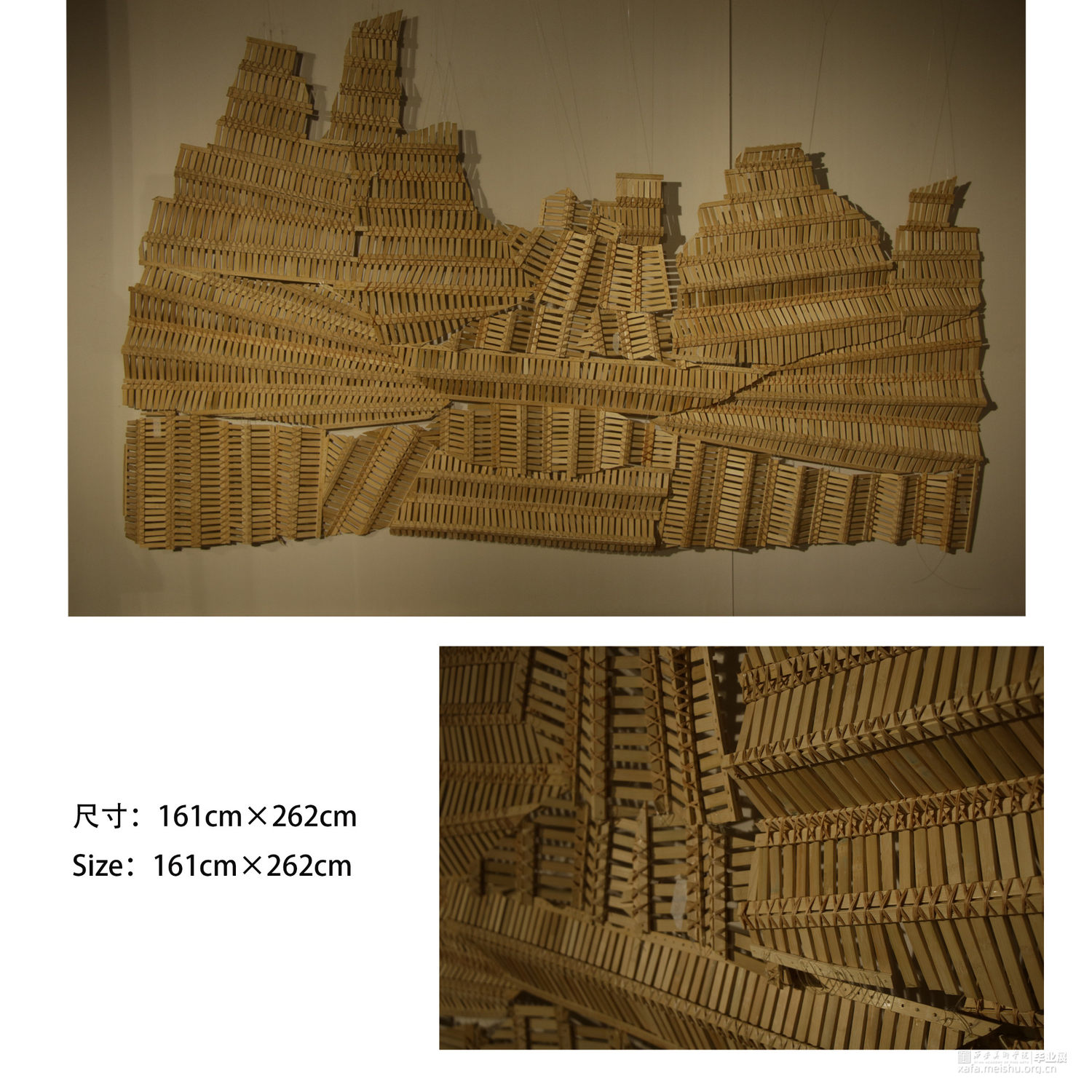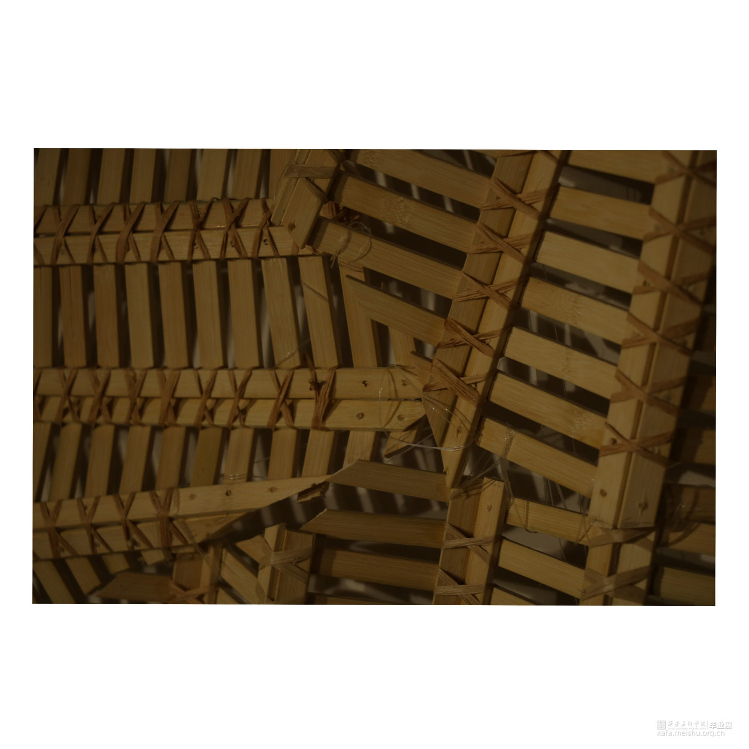 作品采用竹子、竹棒和拉菲草线编织结合。展现了超有层次感的火焰山大片,在光影投射的影响下,窑洞形态构成了彩色的波浪,而竹子的天然色泽又与这种波浪相类似,竹节窑洞不仅具有“海上扁舟”的抽象,更通过不同的光影效果,展现了洪荒世界放飞和壮观的意象。这些深浅不同、样貌各异的“窑洞波浪”在富于变幻的同时更加生动迷人。