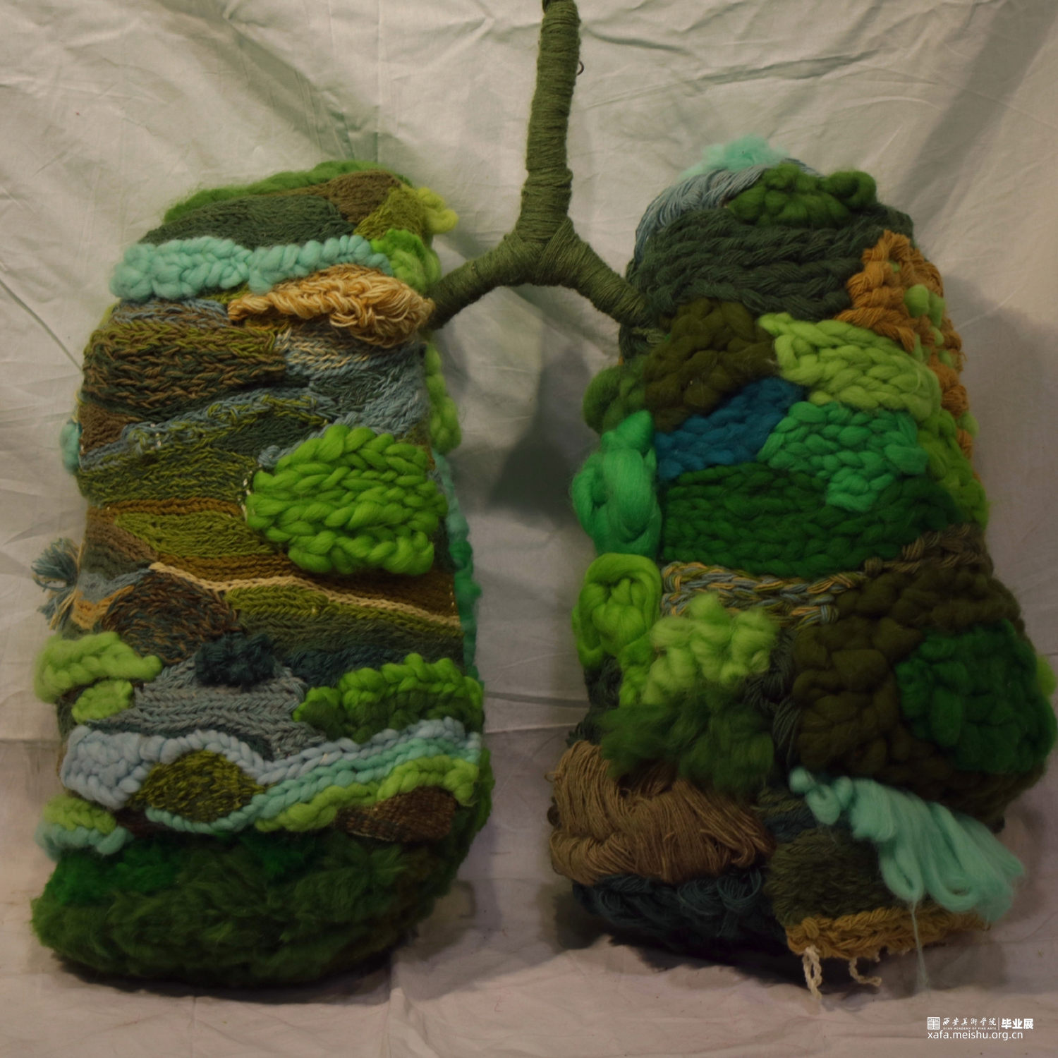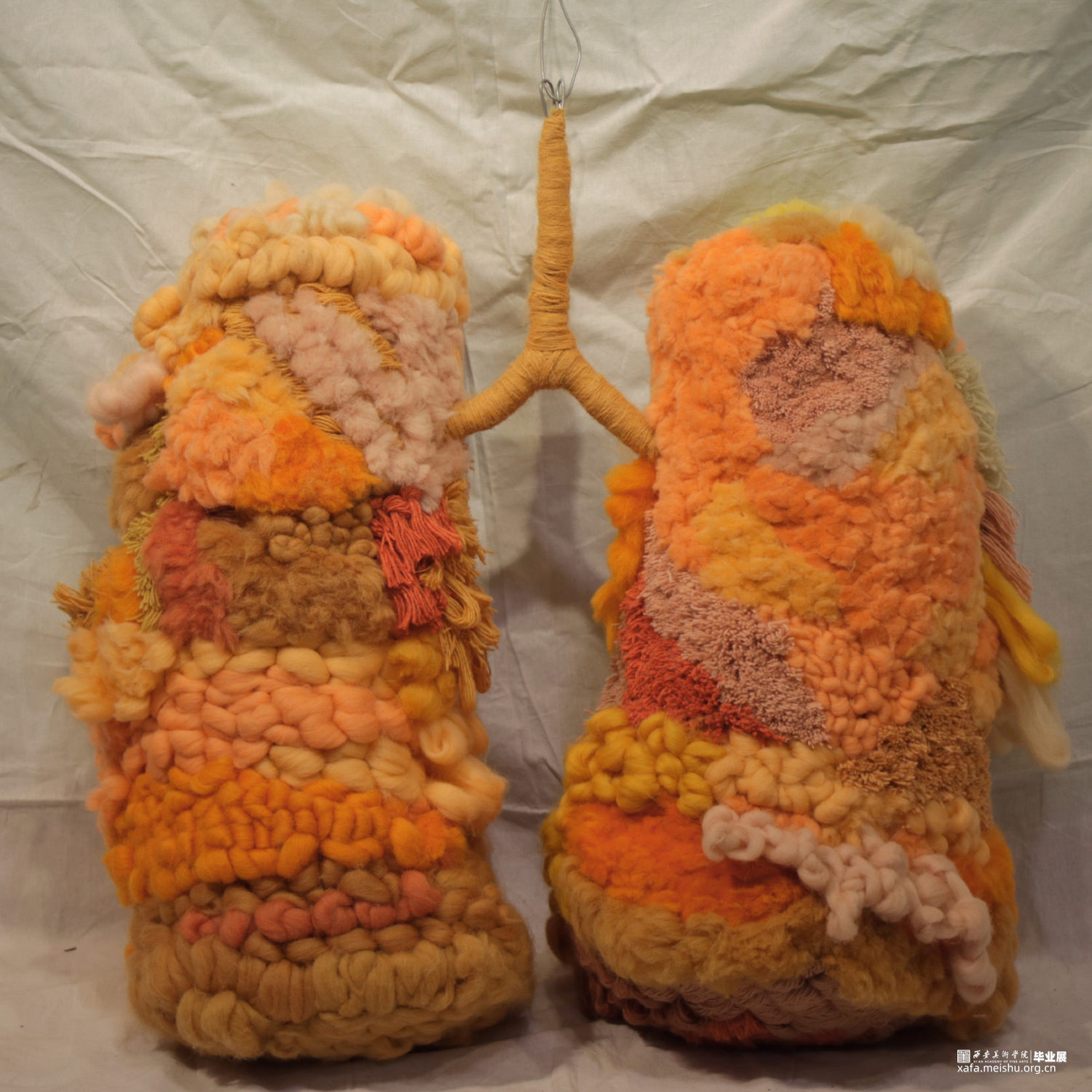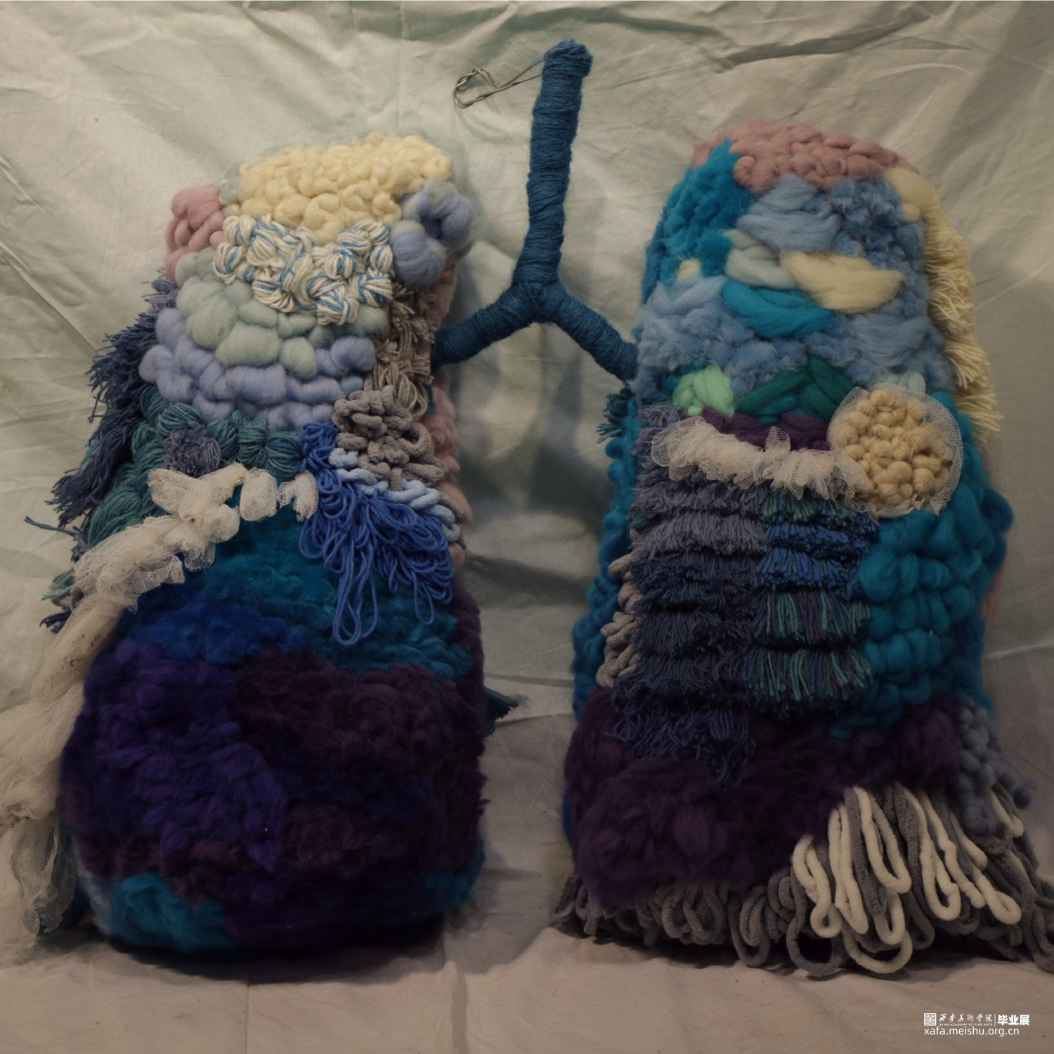 《呼吸》作品属于纤维艺术,运用羊毛线和羊毛毡进行设计制作,灵感来自疫情之下,肺成为全球的焦点,病毒在全世界蔓延,全世界人民必须携起手团结起来,共同战胜病毒,让呼吸在四季的生活里,去迎接更美好的明天,远离疫情,幸福安康。