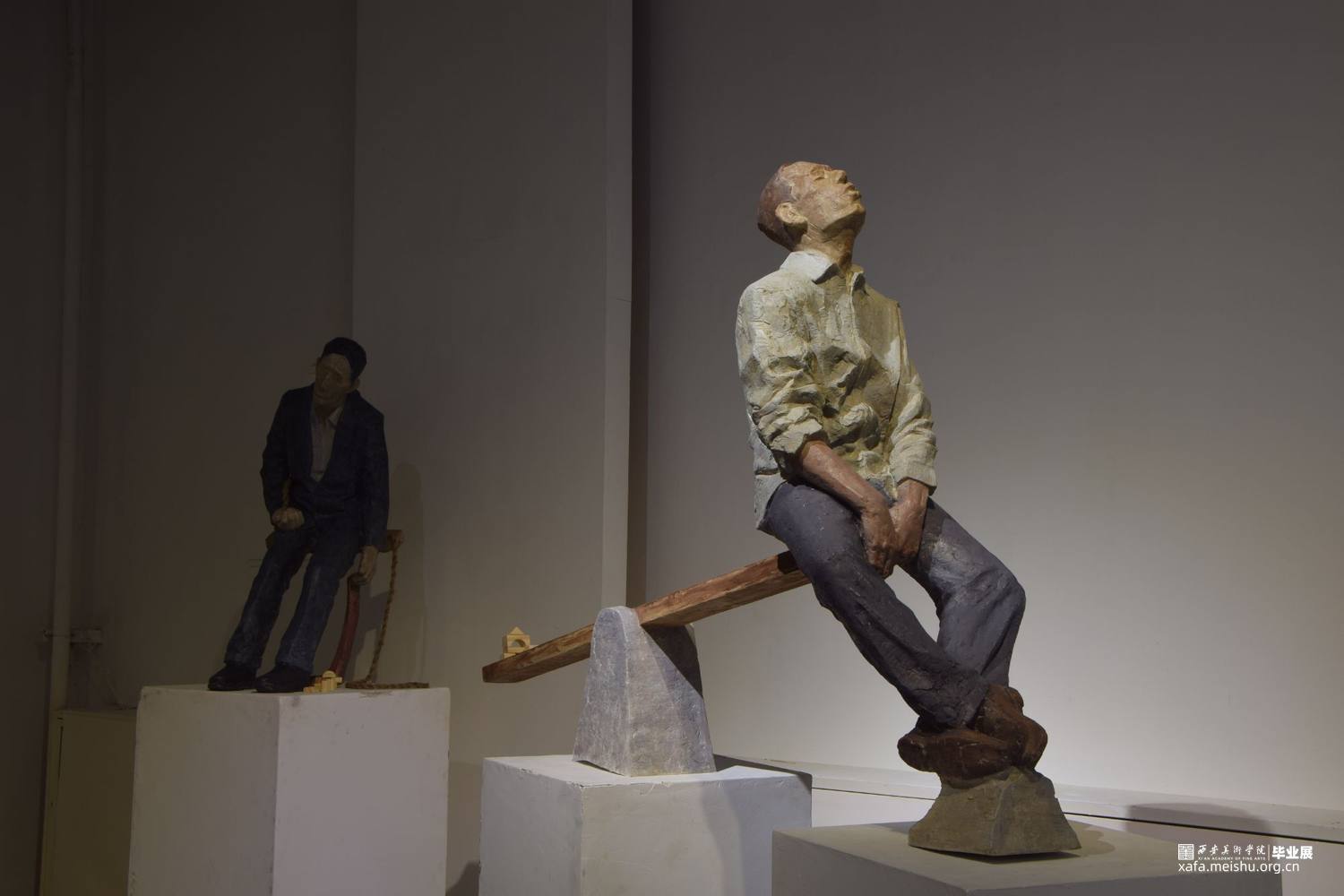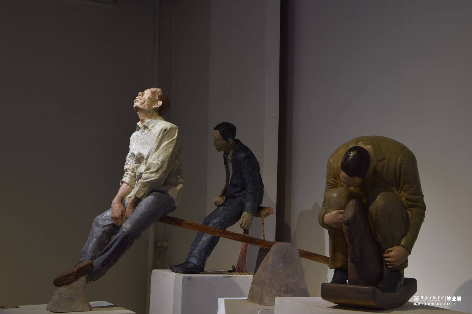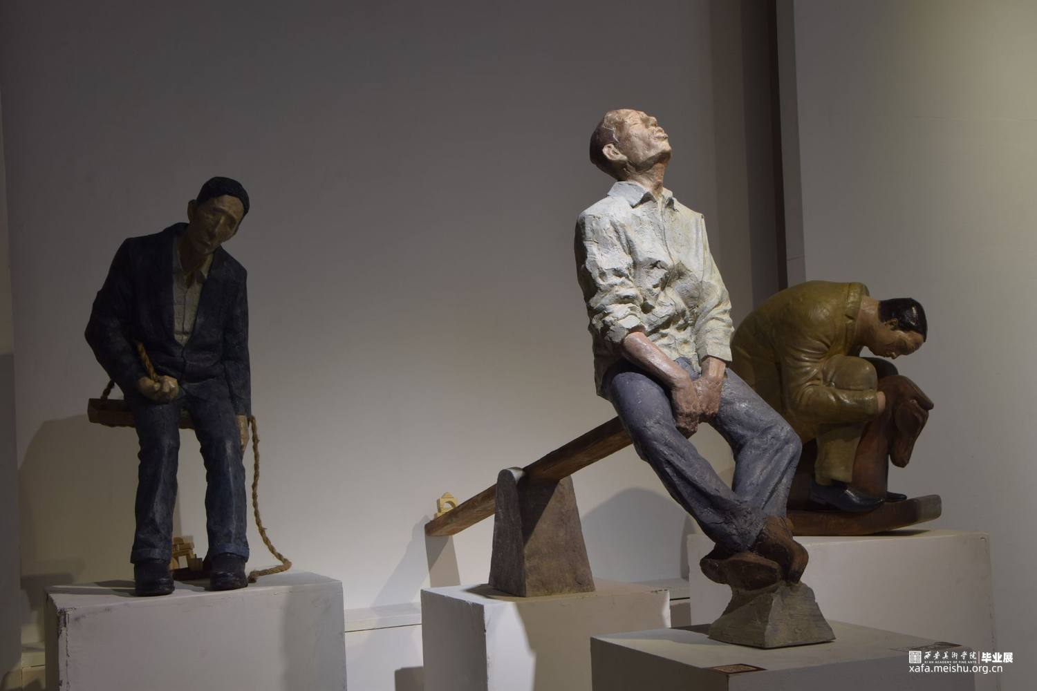 《休息比赛》系列共三件作品,第一件表现的是坐在秋千上的蓝色西装中年男性,手中勉强提着红色领带;第二件表现的是在跷跷板上被翘起的一端上休息着的青年上班族,不知被何物翘起;第三件表现的是坐在摇摇木马上的肥胖的棕色西装男,他庞大的身躯坐在小小的木马上短暂歇息。