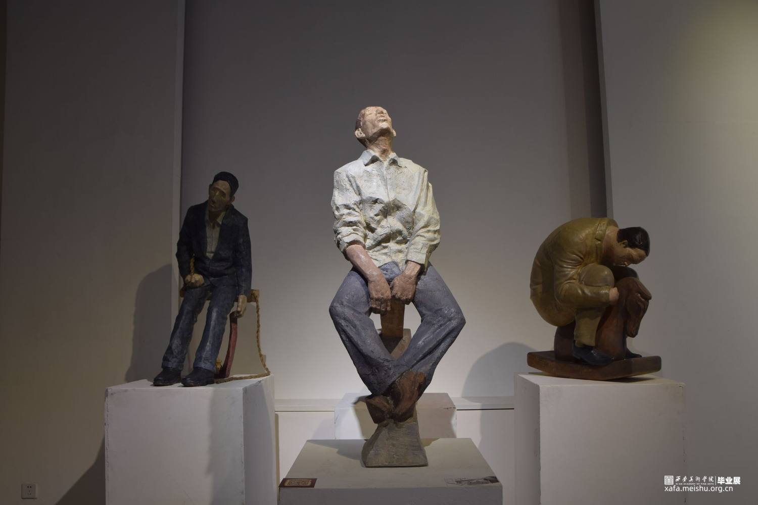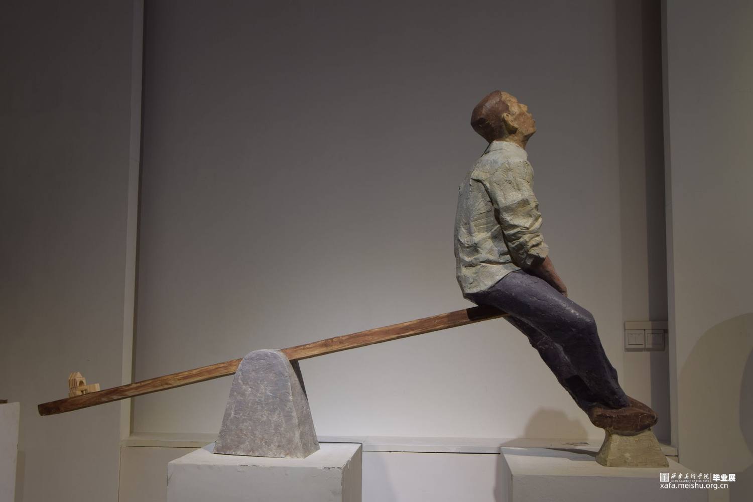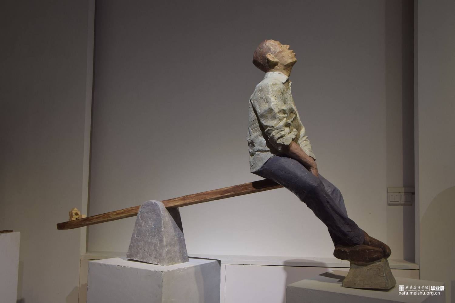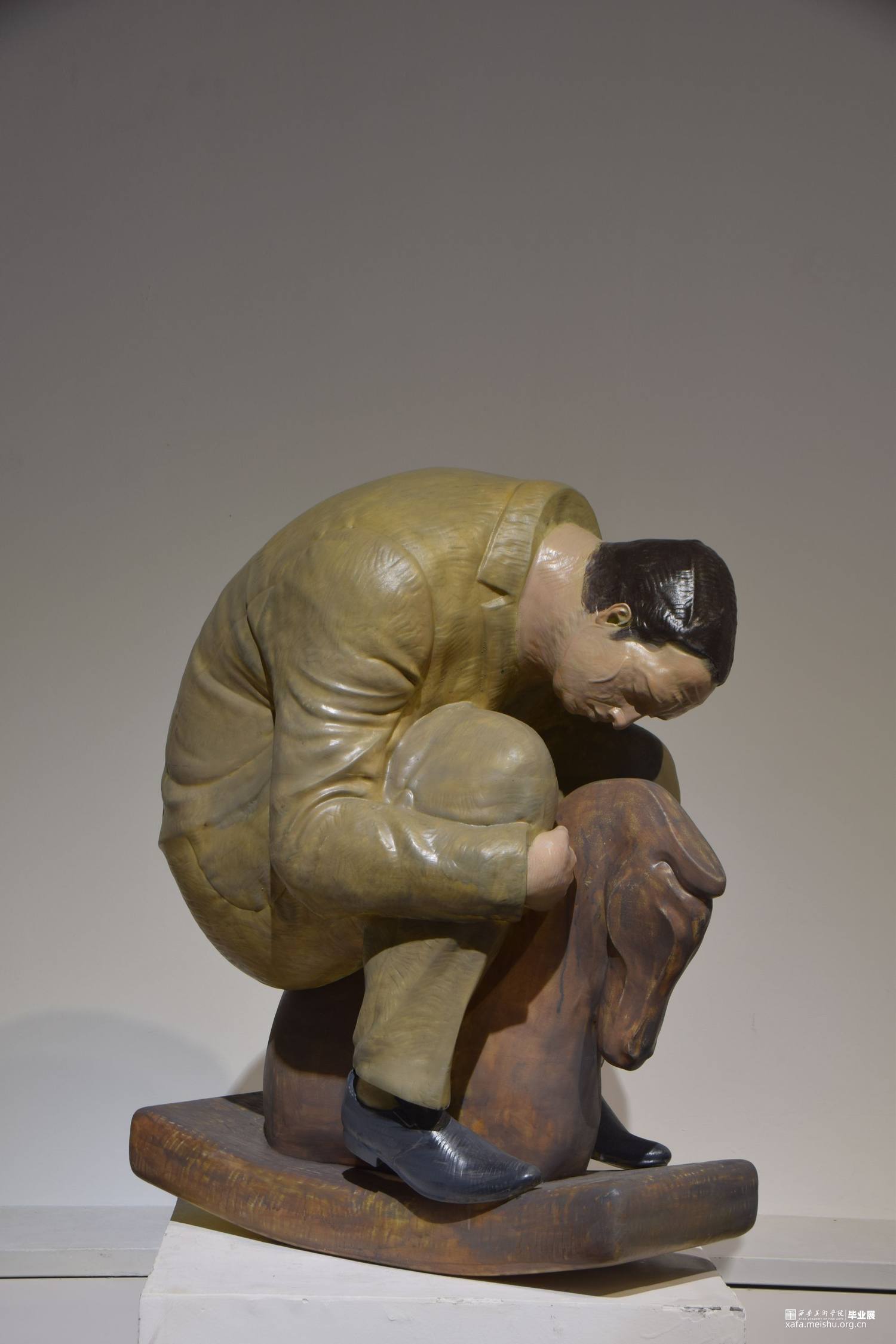 《休息比赛》系列共三件作品,第一件表现的是坐在秋千上的蓝色西装中年男性,手中勉强提着红色领带;第二件表现的是在跷跷板上被翘起的一端上休息着的青年上班族,不知被何物翘起;第三件表现的是坐在摇摇木马上的肥胖的棕色西装男,他庞大的身躯坐在小小的木马上短暂歇息。
