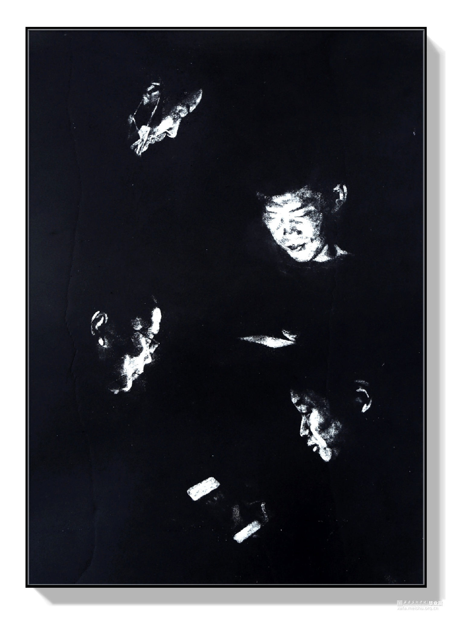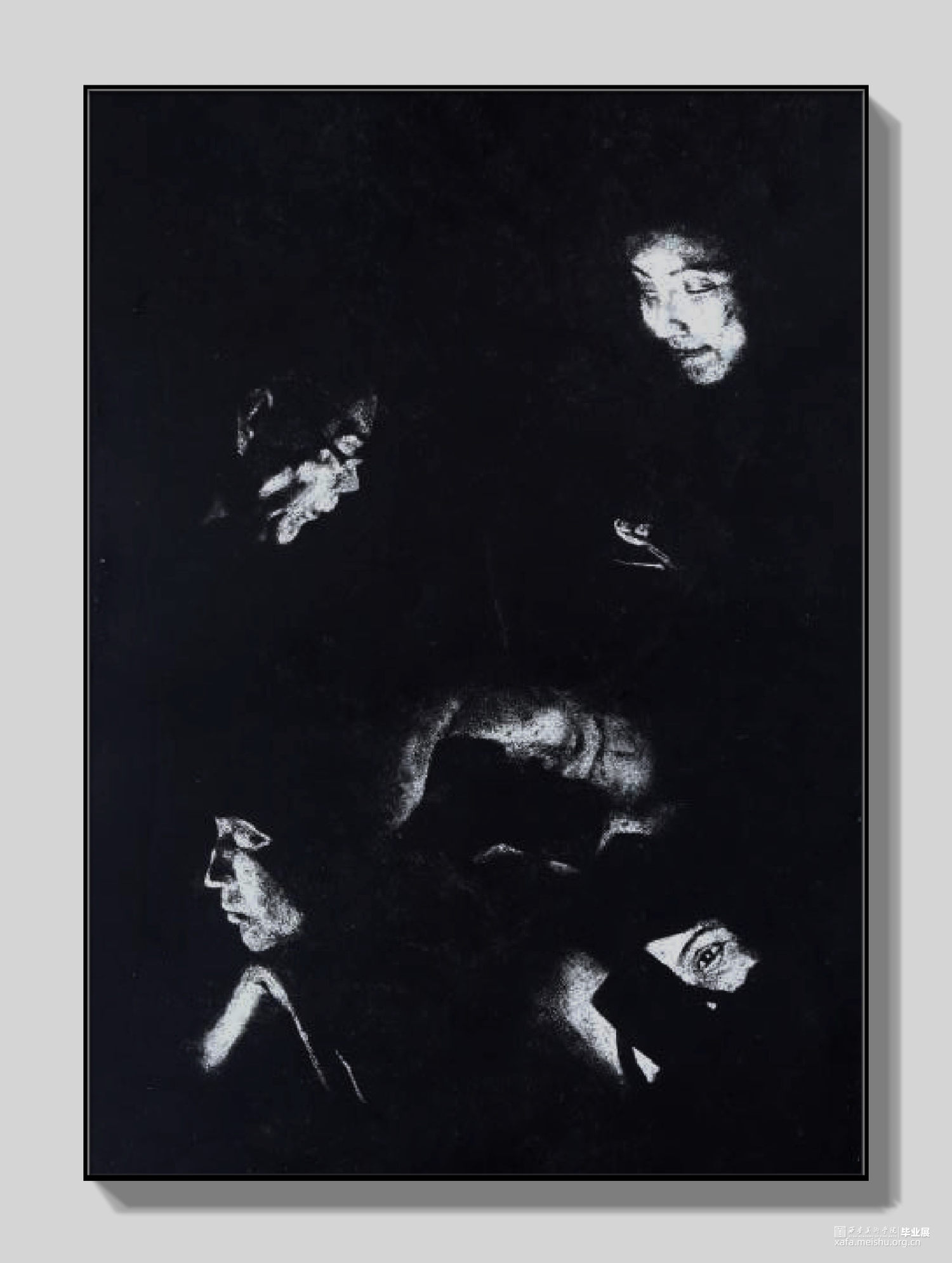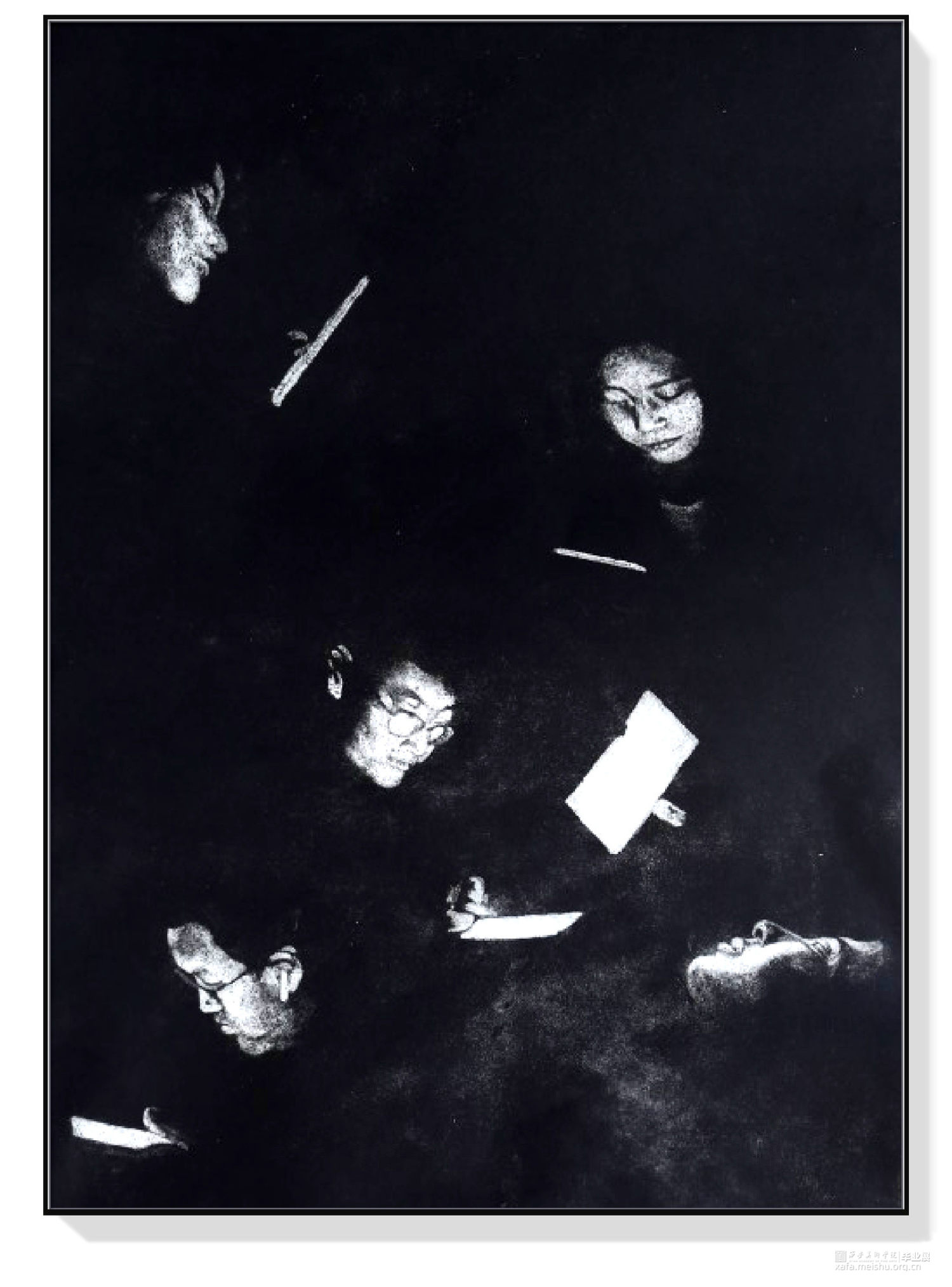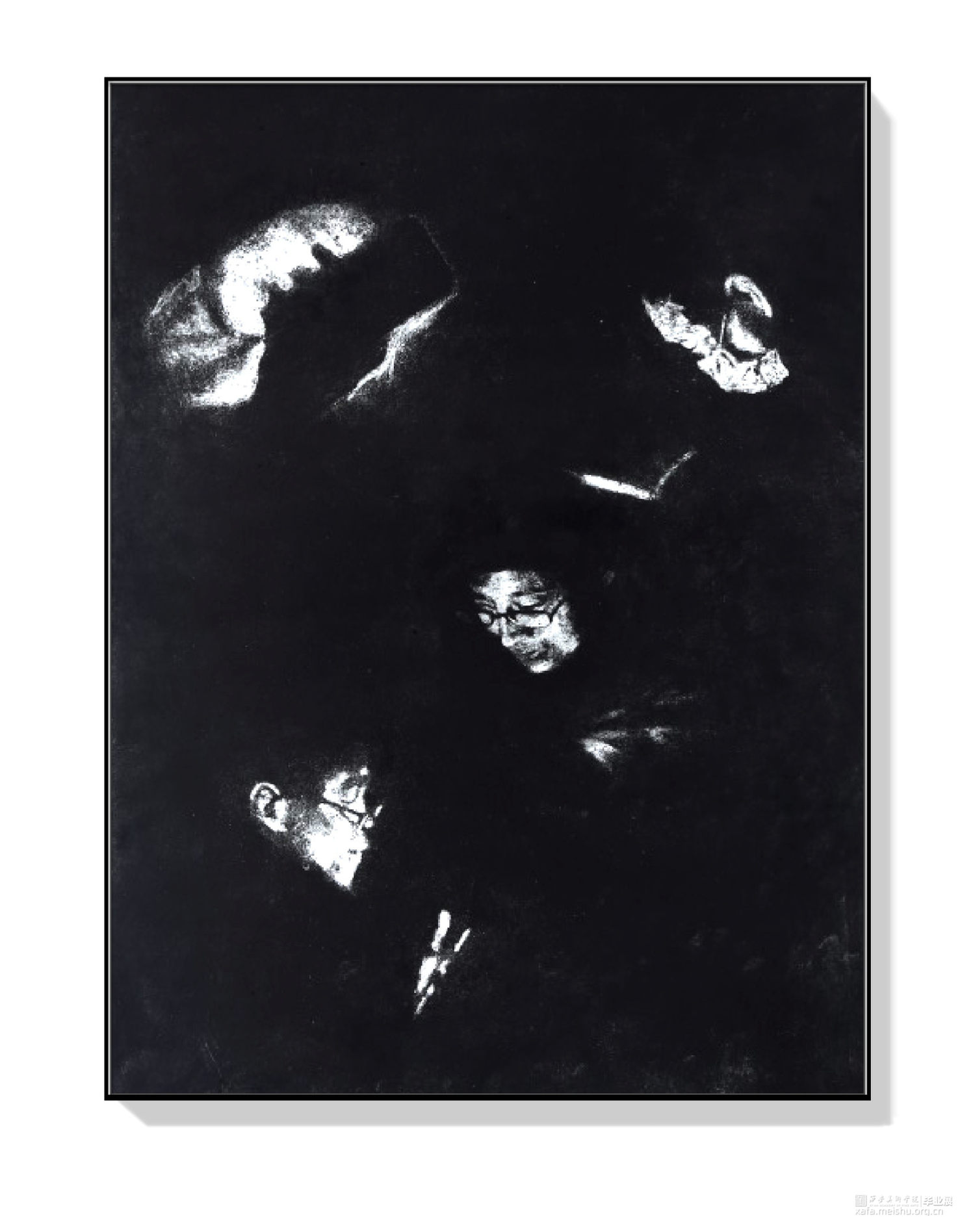 我之所以用综合版画创作正是它可以完美表现当今人们思想上,情感上的密室,我们每一个人都像一个孤岛,唯一的精神支柱就是手里的手机,唯一光线就是来自那一块块心里的孤岛,努力与外界保持联系,而忽律人与人之间最本质的情感,黑白的画面正是我所想体现的当下人与人的沟通现状。