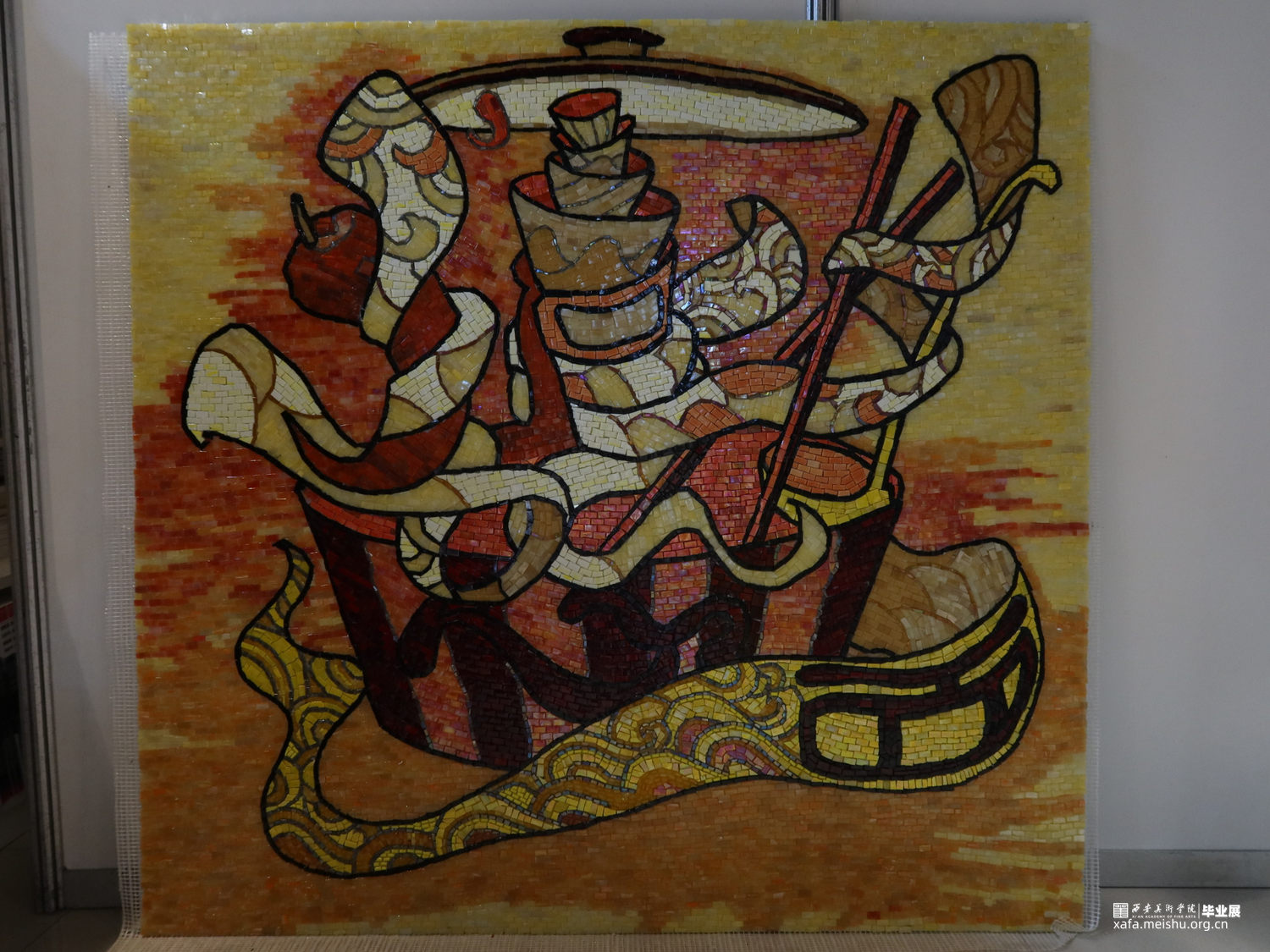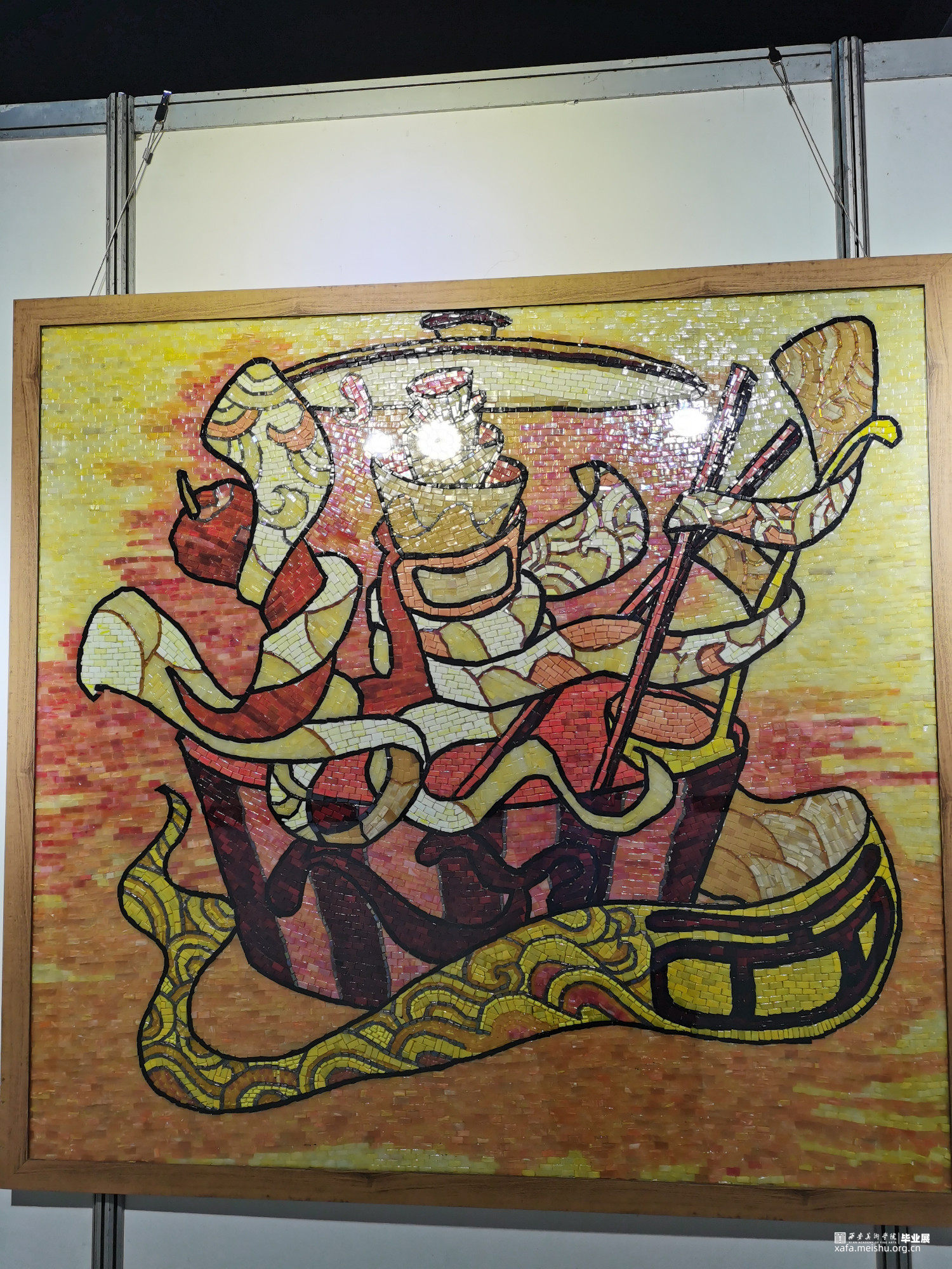 作品通过西方马赛克镶嵌艺术表现形式和中国民间文字相结合,在传统文化基础上注入创新艺术的灵魂,作品材料通过筛选与食材相符合的暖色系马赛克材料,拼贴组成115cmX110cm规格的大型艺术作品,旨在通过利用西方特色的文化来展现中国民间文化的博大精深,弘扬中国文化自信与道德底蕴。